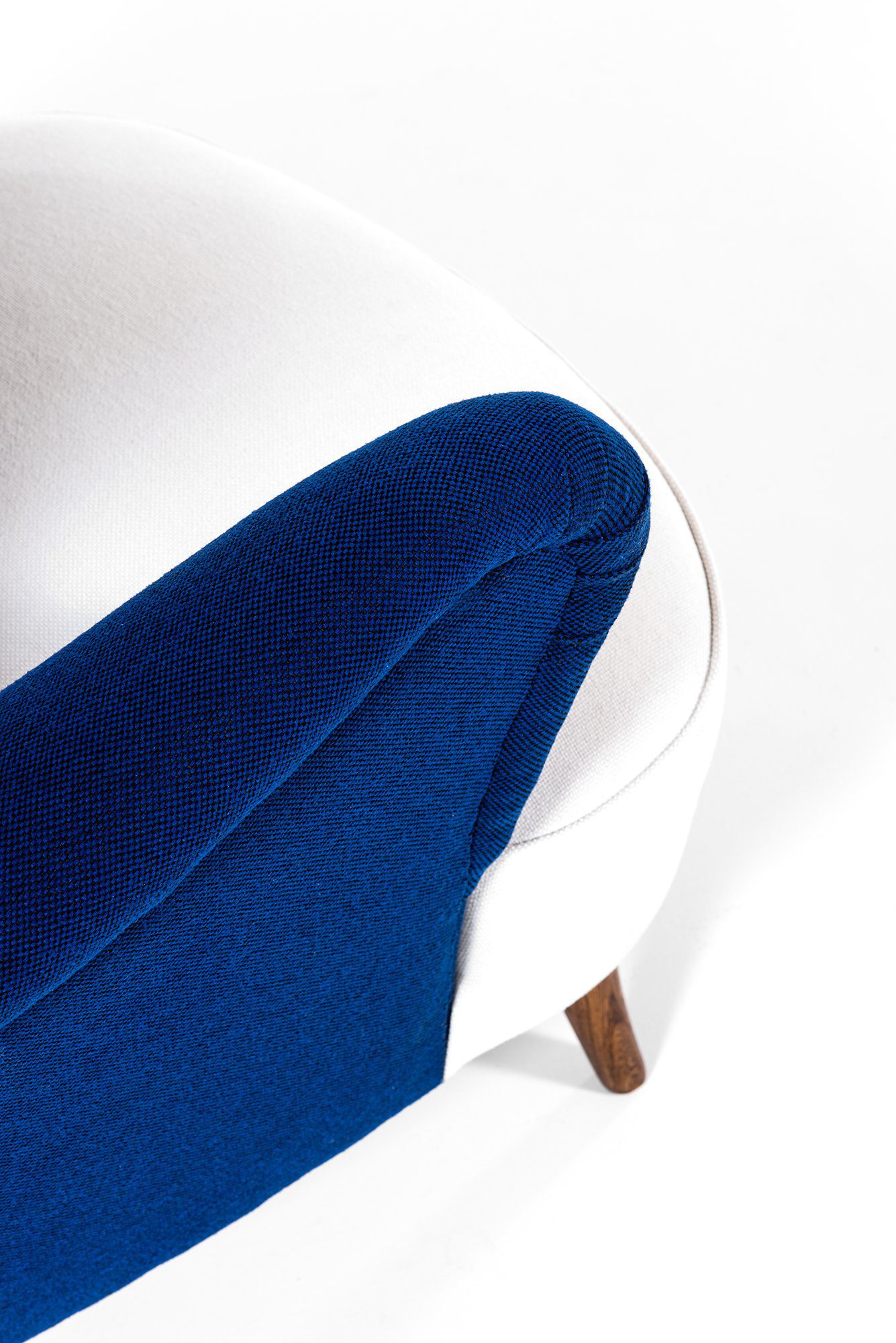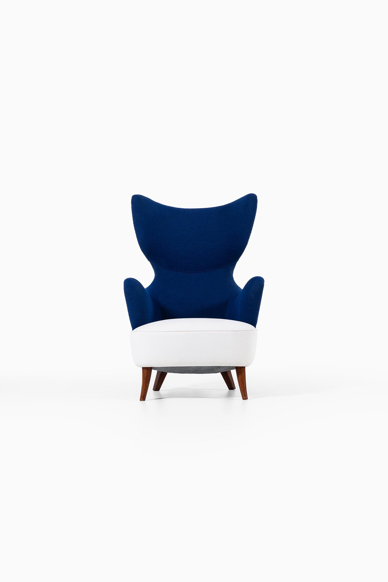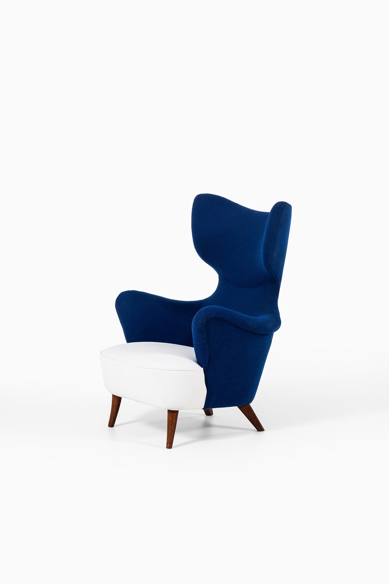 The upholstery has been newly redone in a deep blue wool fabric, contrasted by a white upholstered seat cushion. The fabric surface is uniform and tightly upholstered, following the complex contours of the chair with precision. The legs are executed in solid wood, finished in a warm brown tone, and slightly splayed to provide both stability and a light visual stance. The combination of textile upholstery and solid wood structure reflects the period’s focus on comfort, durability, and material clarity.