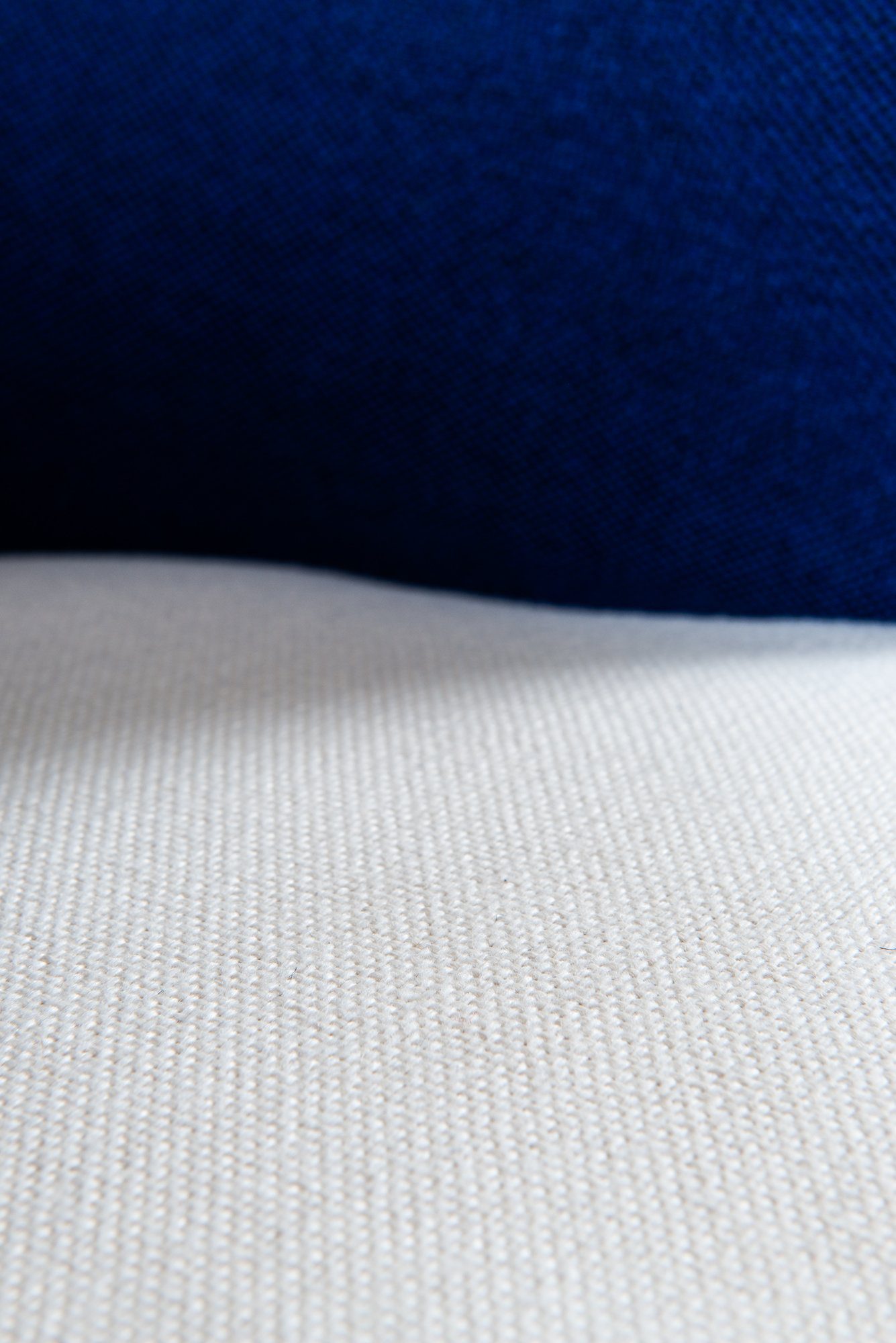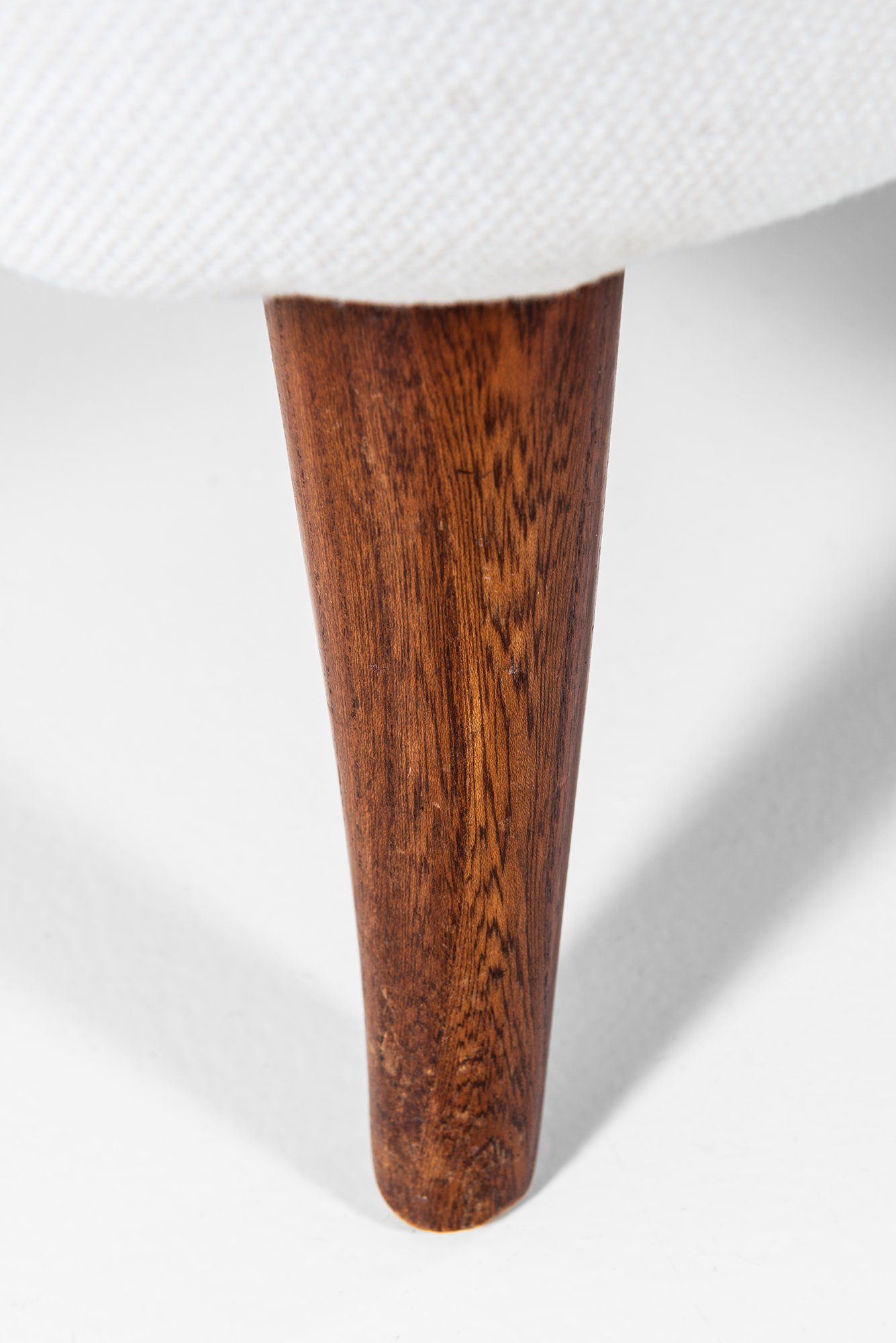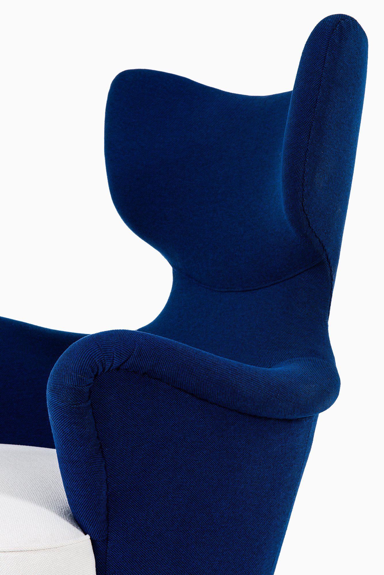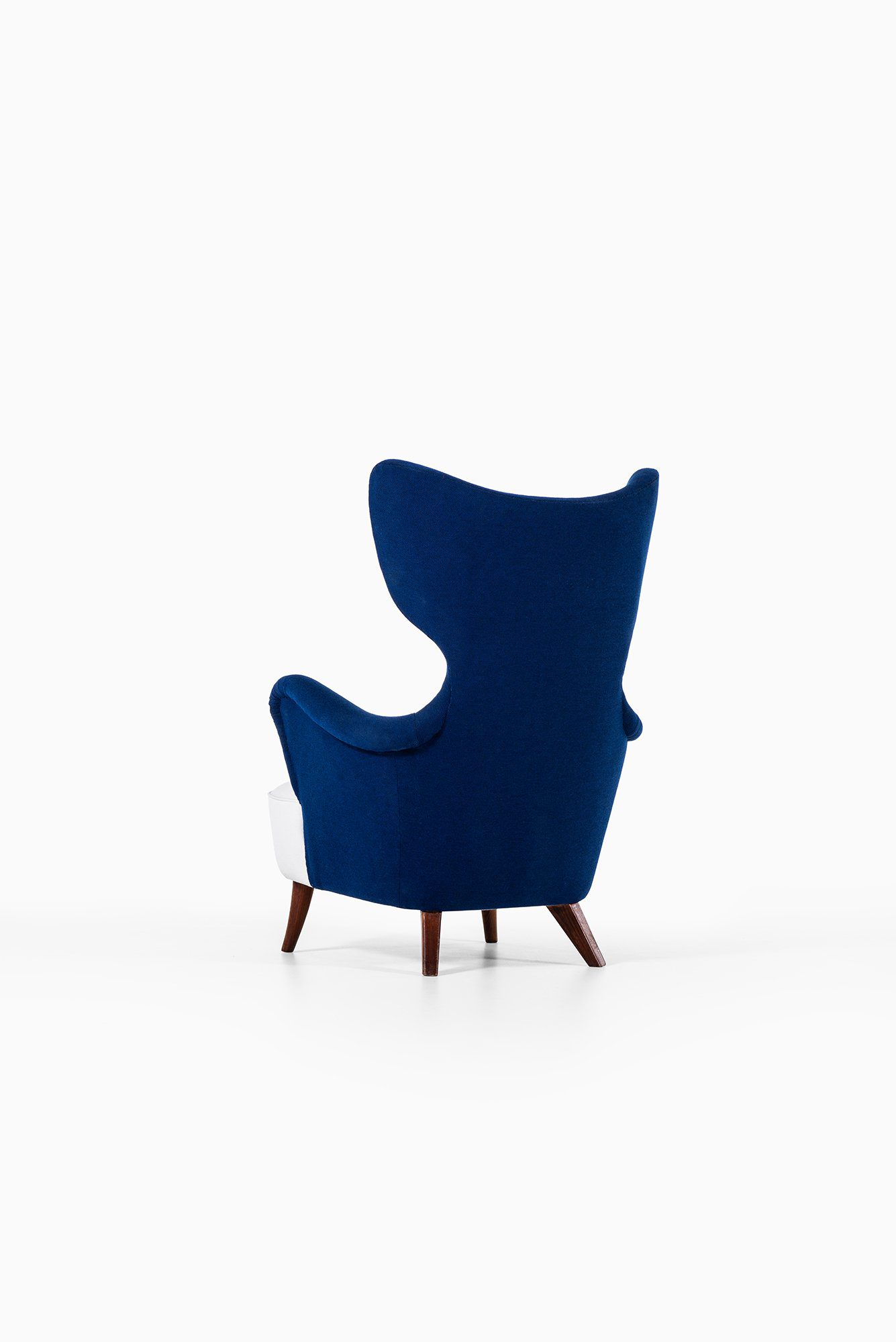 The upholstery has been newly redone in a deep blue wool fabric, contrasted by a white upholstered seat cushion. The fabric surface is uniform and tightly upholstered, following the complex contours of the chair with precision. The legs are executed in solid wood, finished in a warm brown tone, and slightly splayed to provide both stability and a light visual stance. The combination of textile upholstery and solid wood structure reflects the period’s focus on comfort, durability, and material clarity.