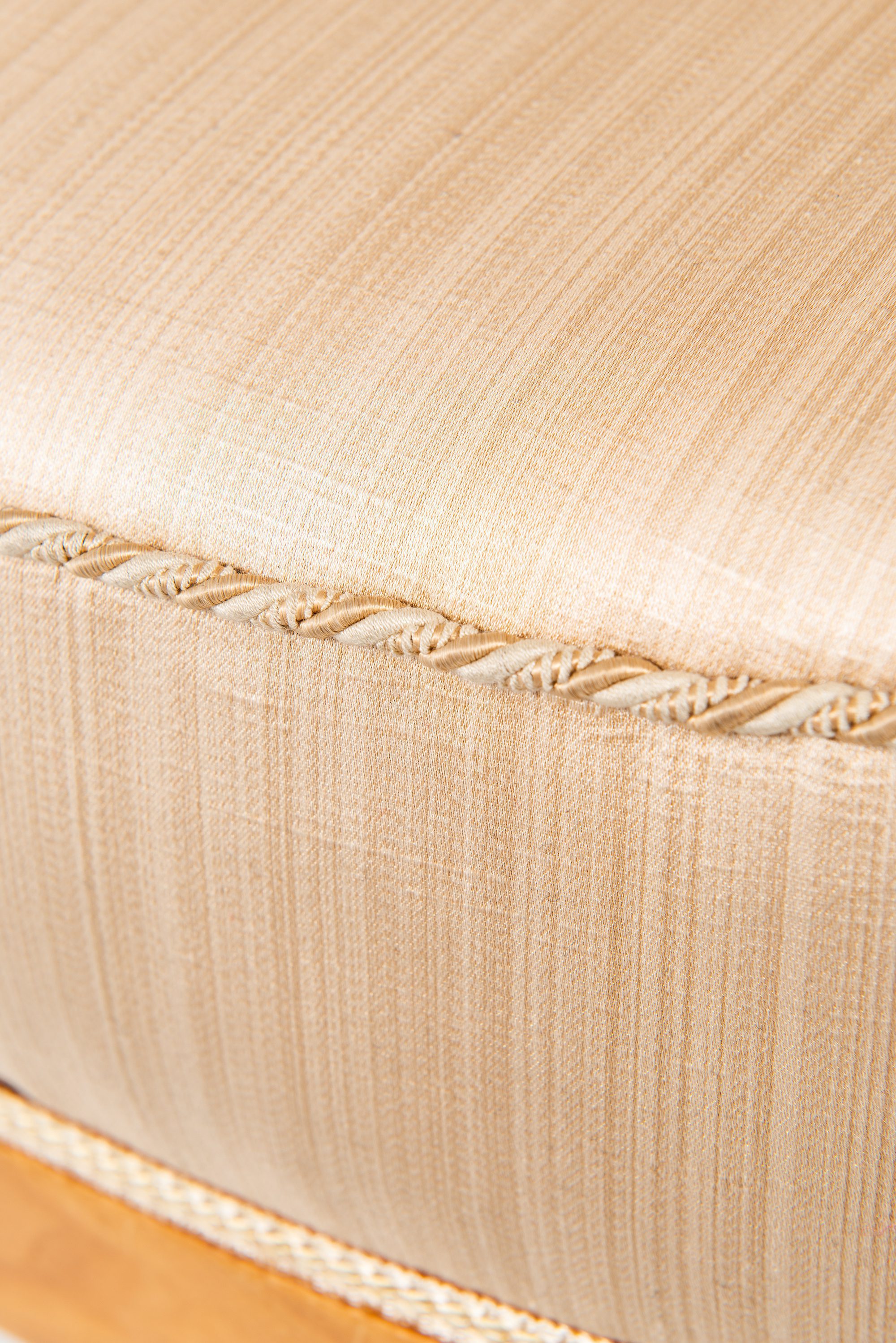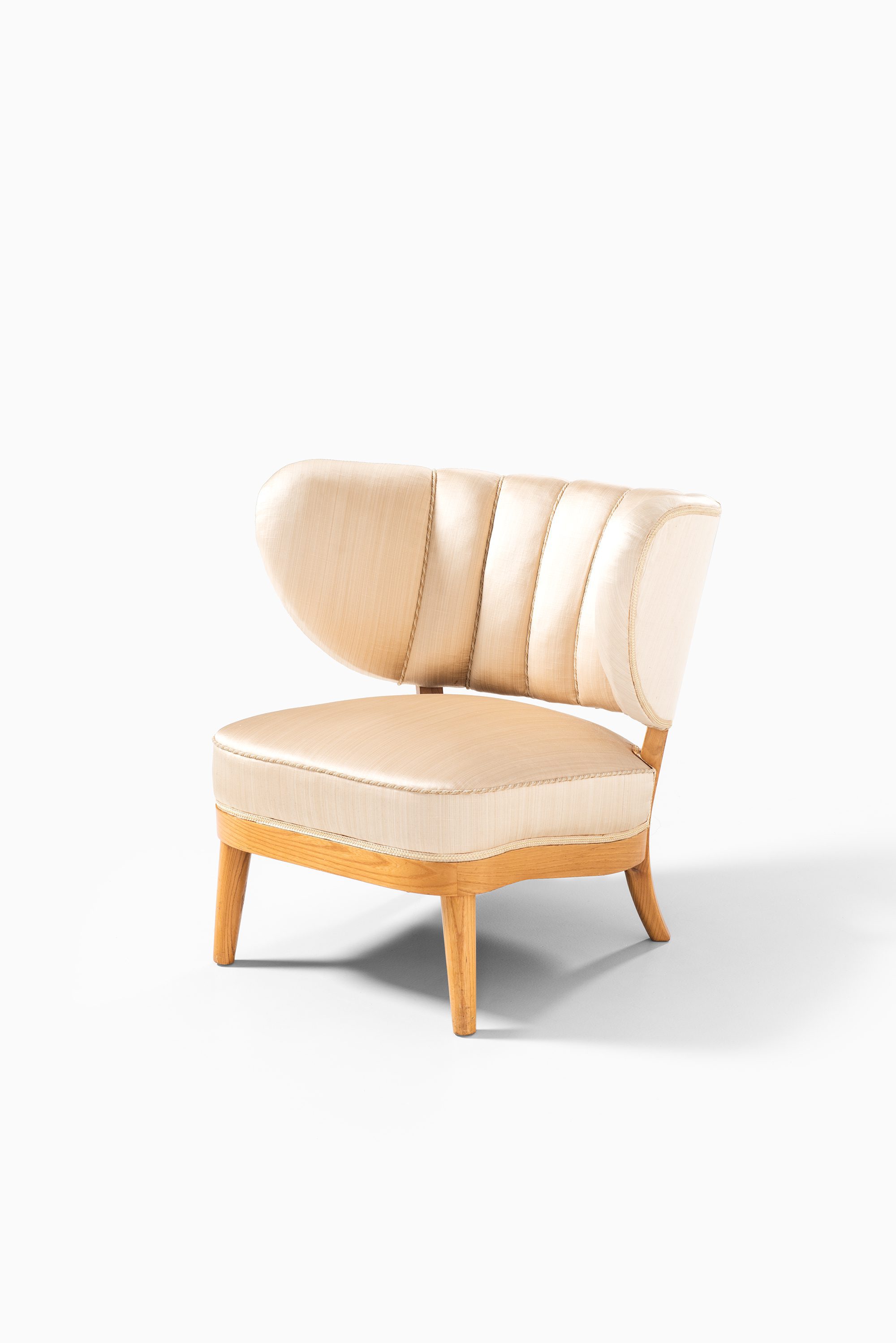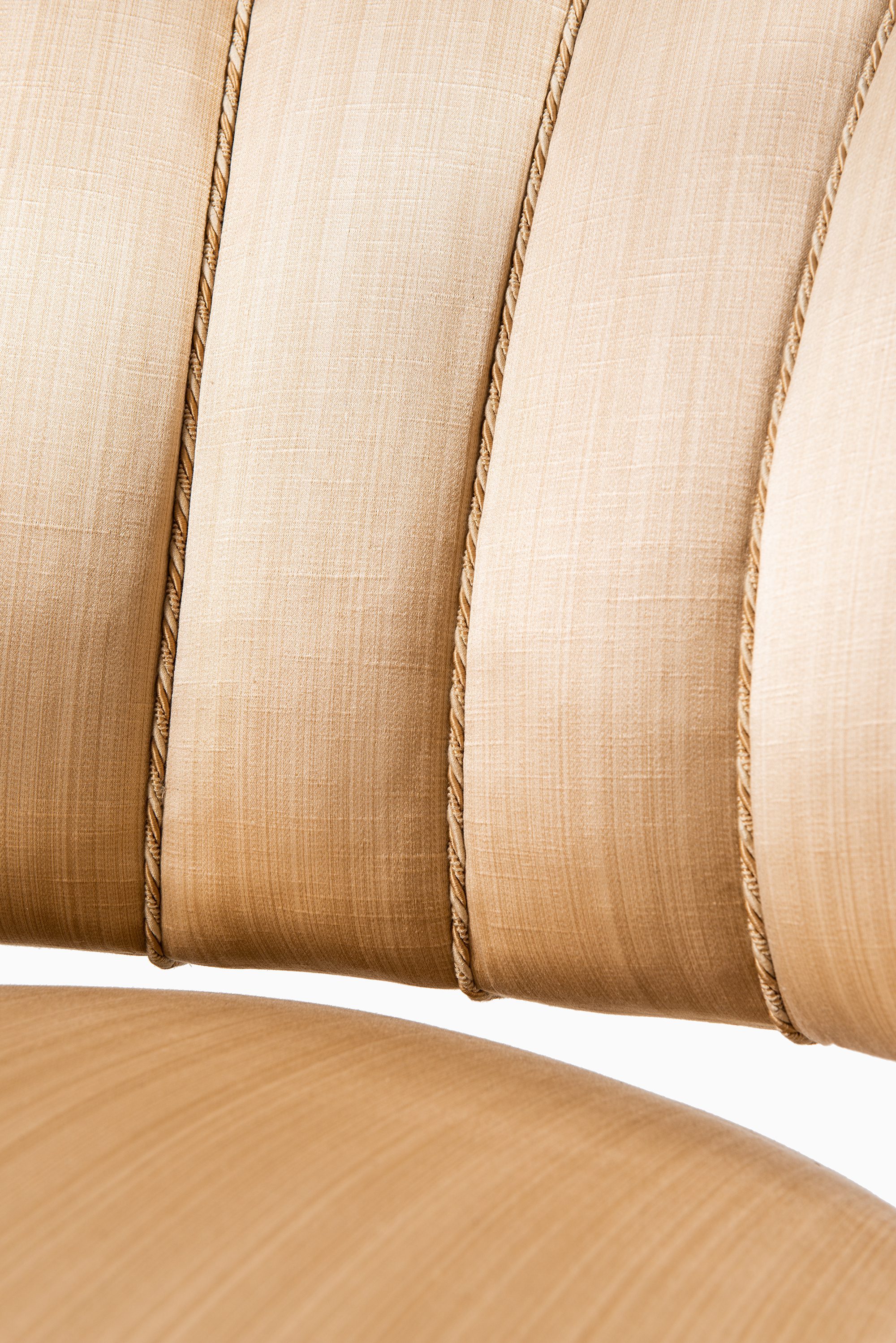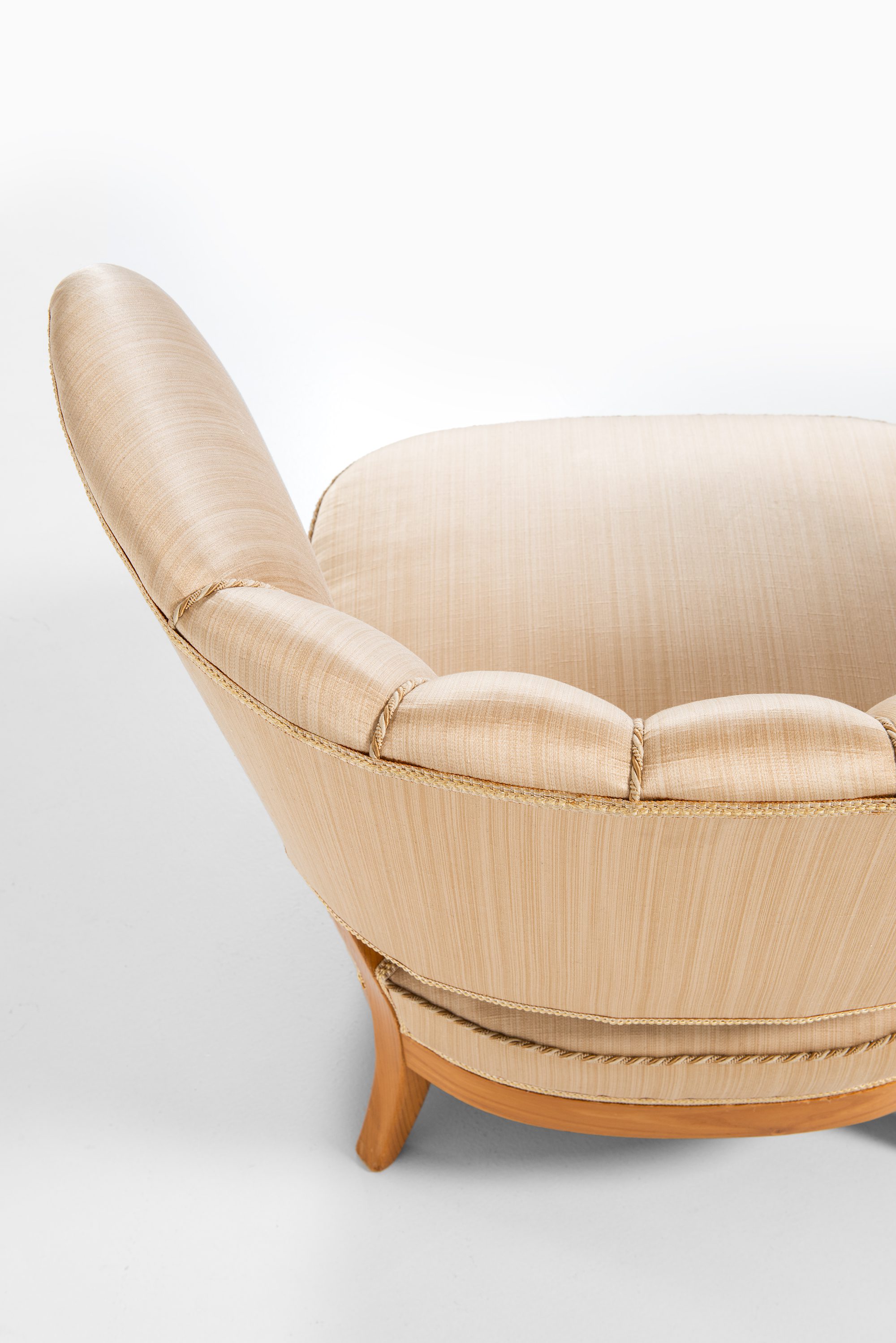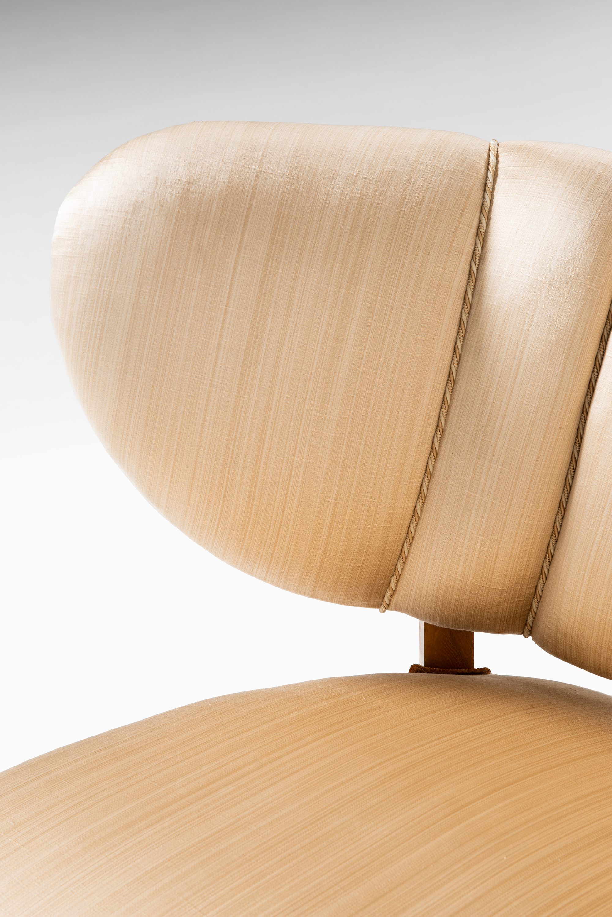 The chairs are crafted in ash with their original silk fabric upholstery still preserved. The light golden-beige tone of the silk is paired with the warm honey hue of the ash frame, creating a harmonious and elegant appearance. The upholstery is vertically channeled along the backrest, emphasizing the rounded, wing-like form that envelops the sitter. The chairs rest on short, slightly splayed legs that give them stability while keeping the proportions low and inviting. Their silhouette is characterized by soft, organic curves that express Schulz’s ability to merge comfort with sculptural form.