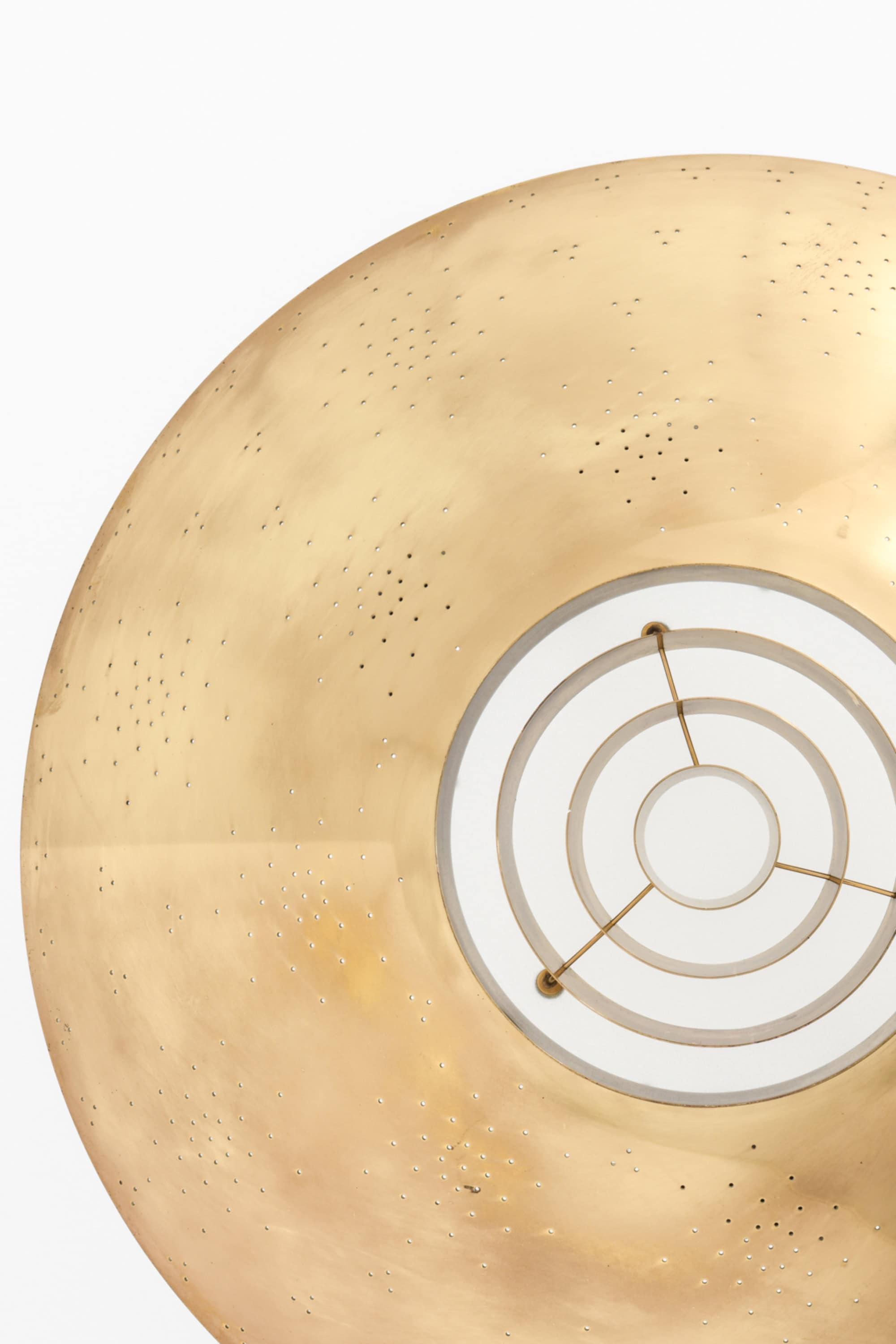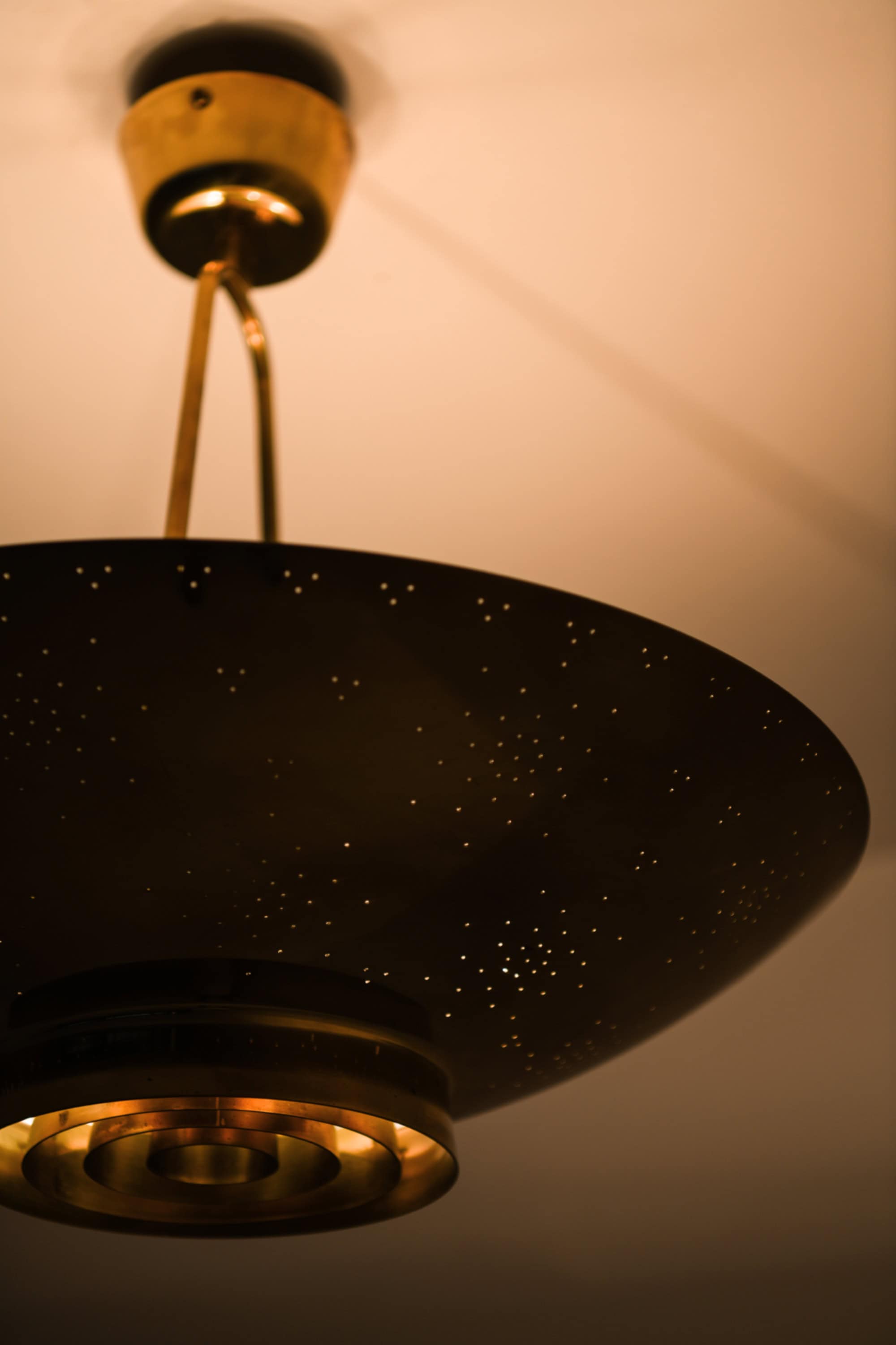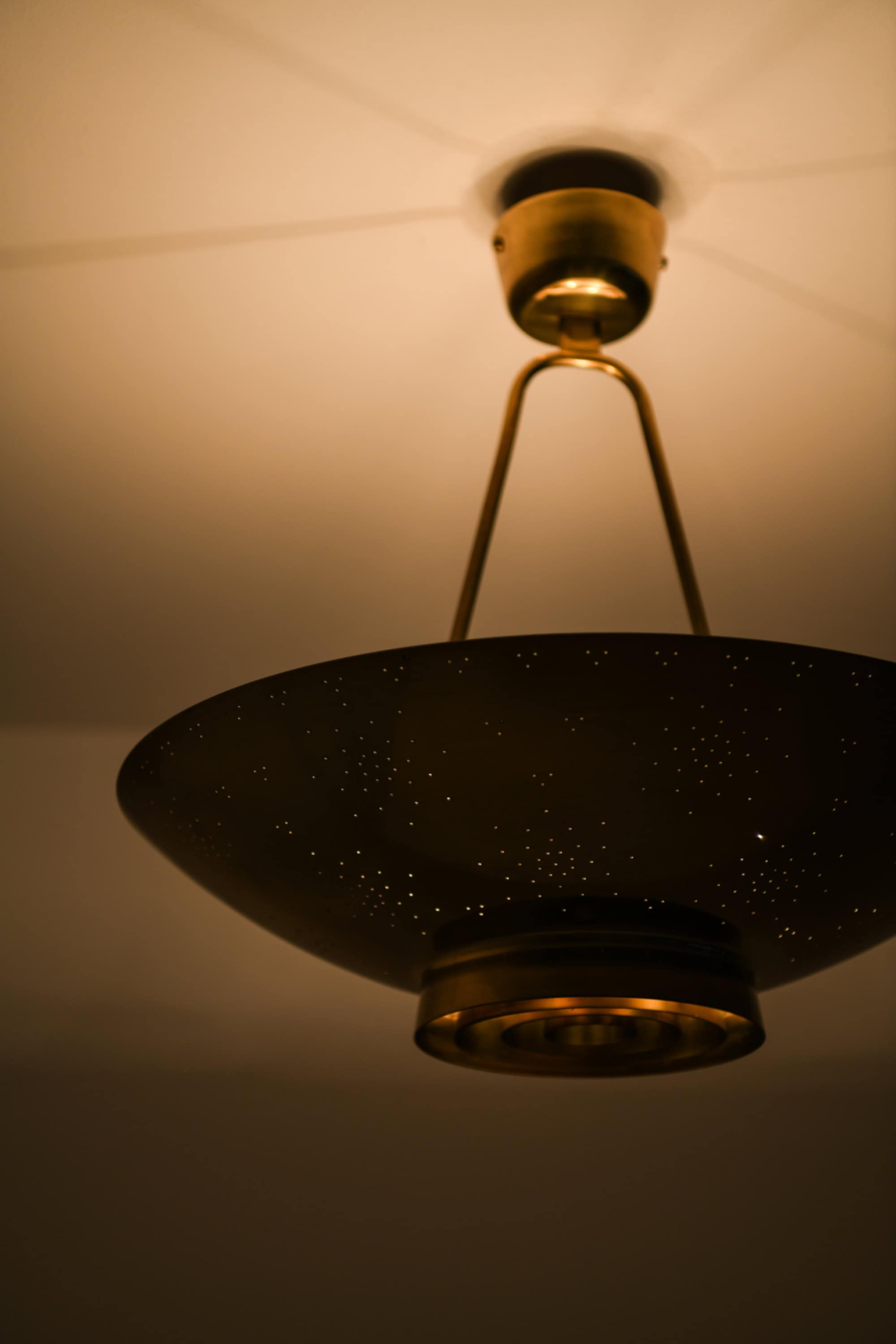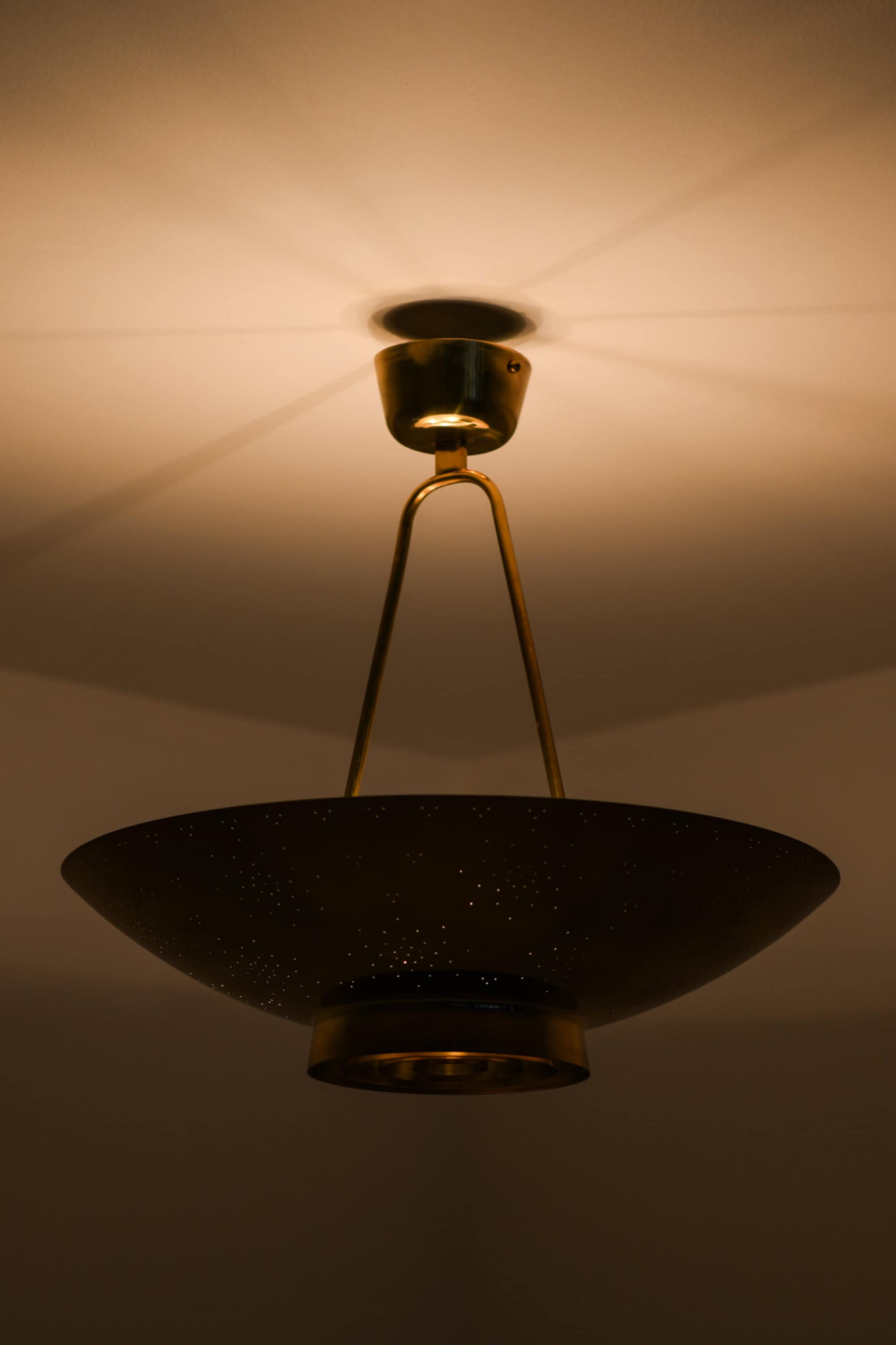 The lamp is made entirely of brass with a perforated conical shade and a glass diffuser beneath. The surface is carefully hand-pierced with a constellation of small holes, allowing light to filter through in a soft, atmospheric pattern that recalls a starry sky. The lower section features concentric brass rings that conceal the bulb and diffuse the light downward, while the open upper surface reflects illumination onto the ceiling. When lit, the perforations produce a delicate play of light and shadow, one of Tynell’s most characteristic design elements. The lamp is suspended by a Y-shaped brass rod connected to a rounded ceiling cup, maintaining both visual balance and a sense of lightness.