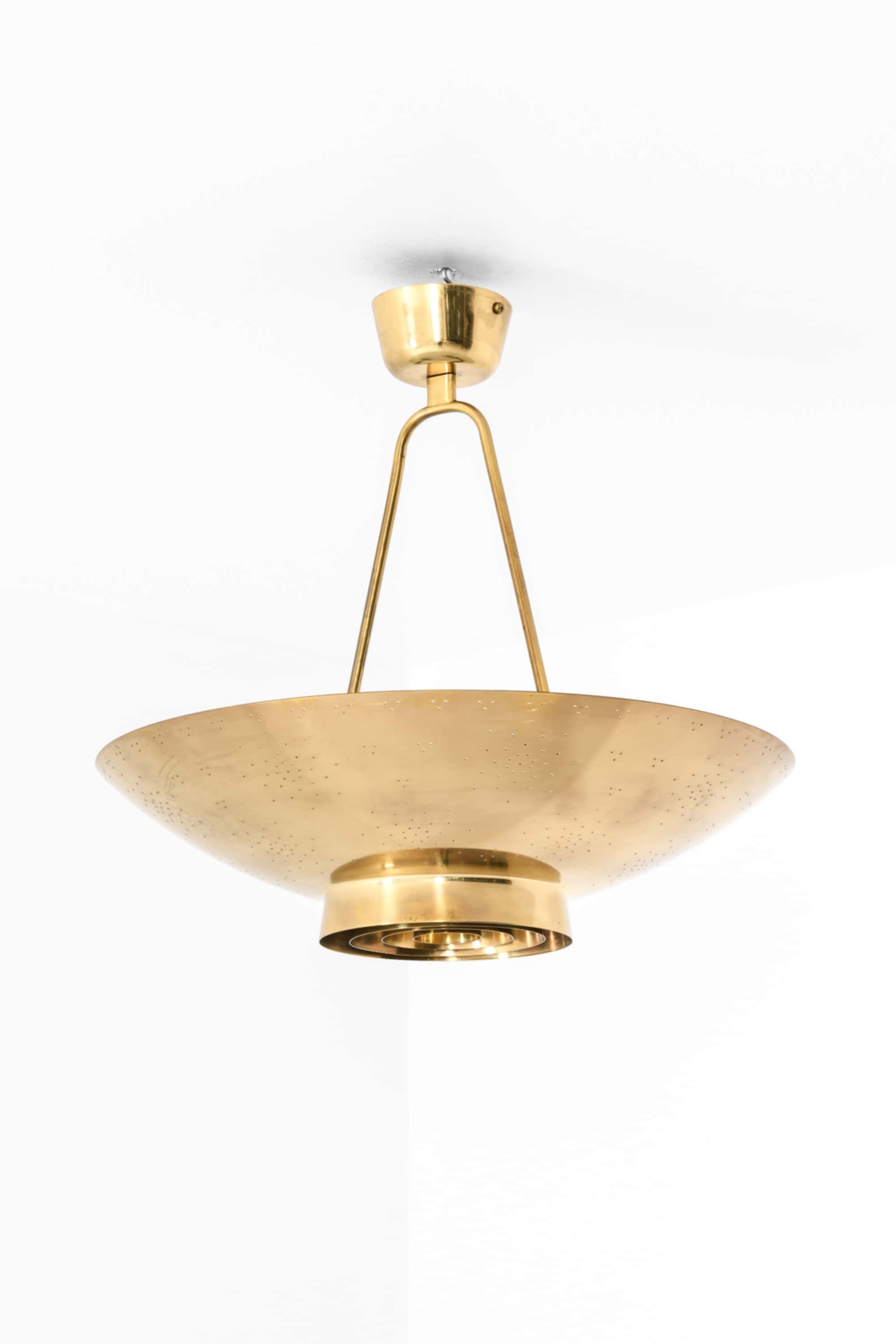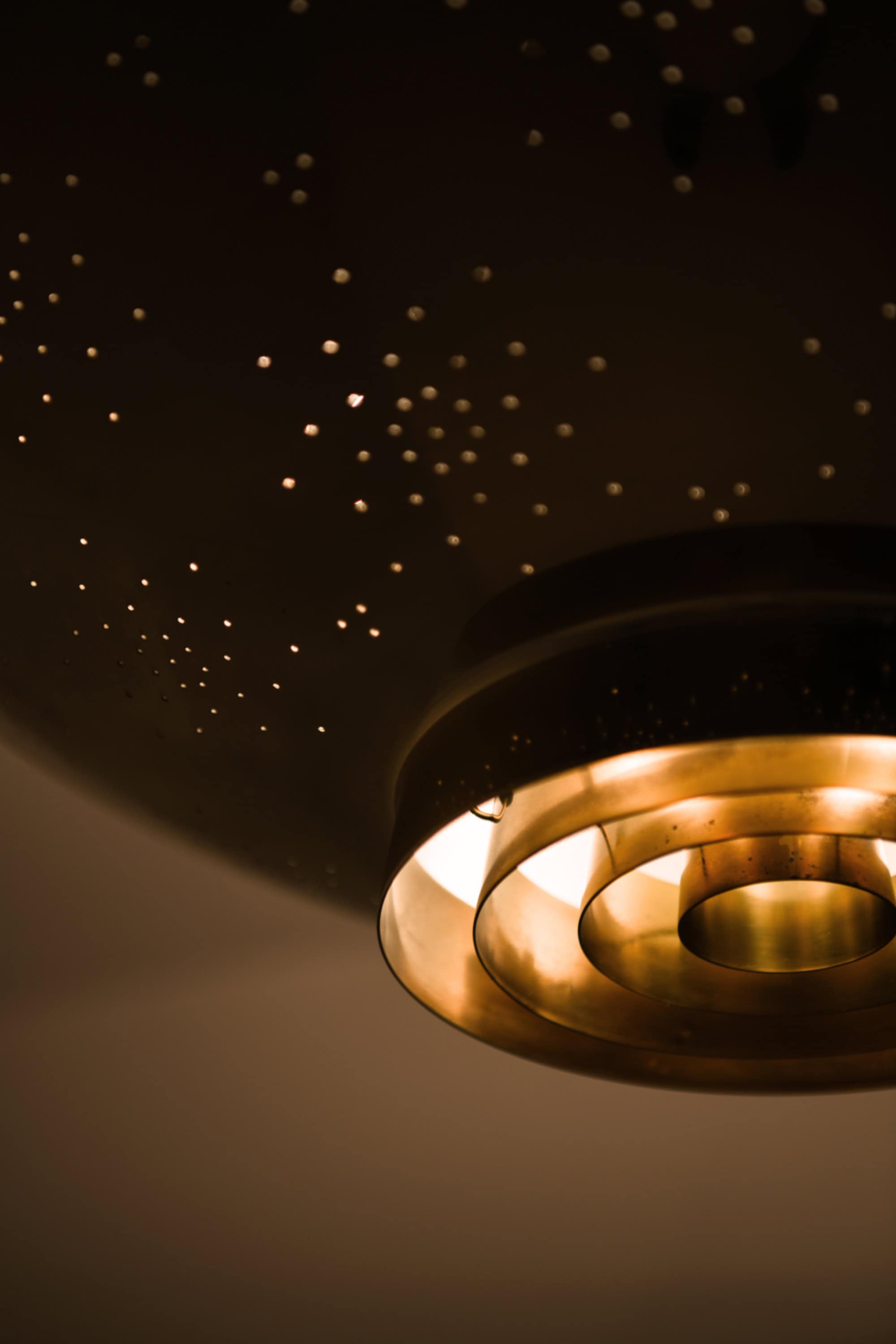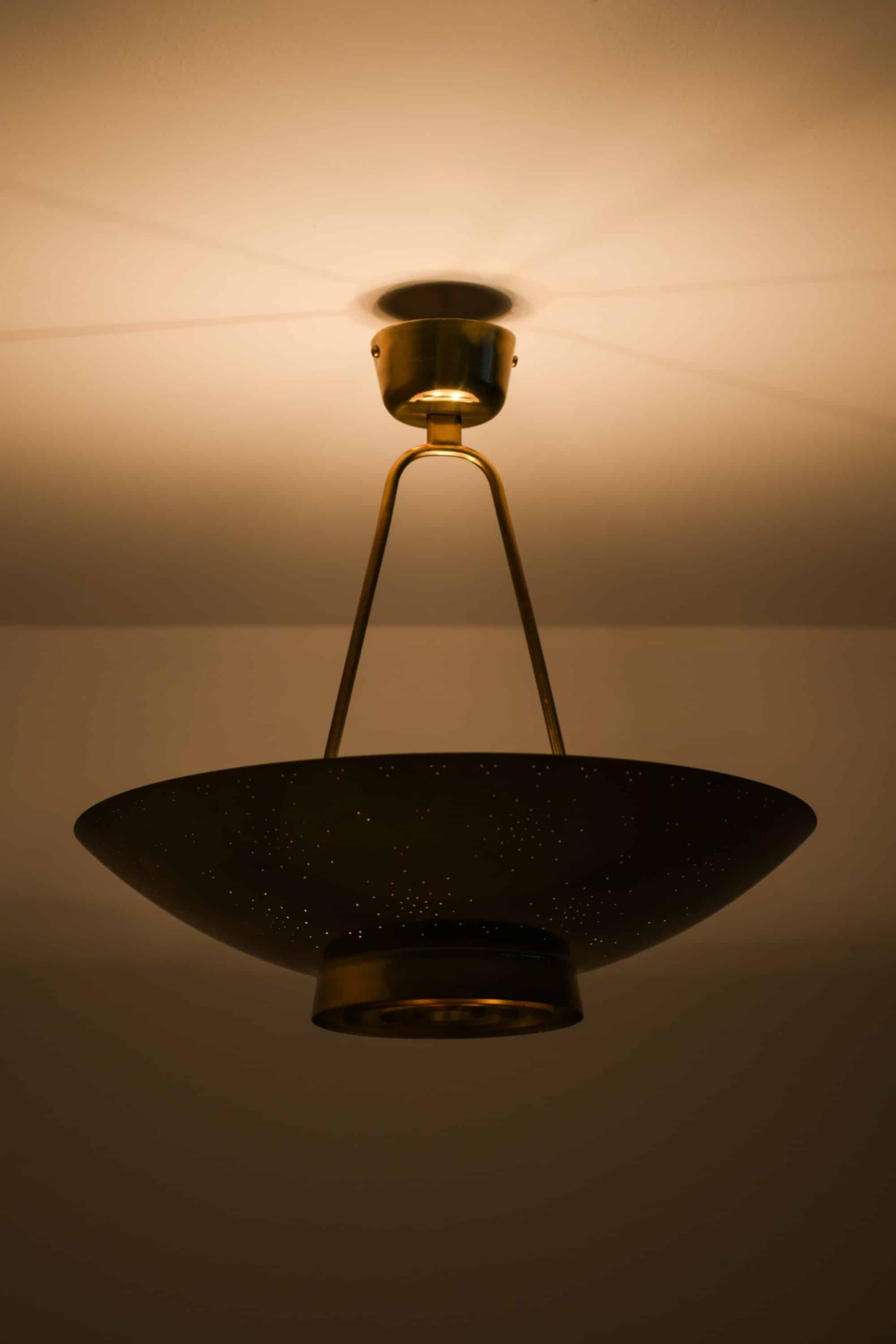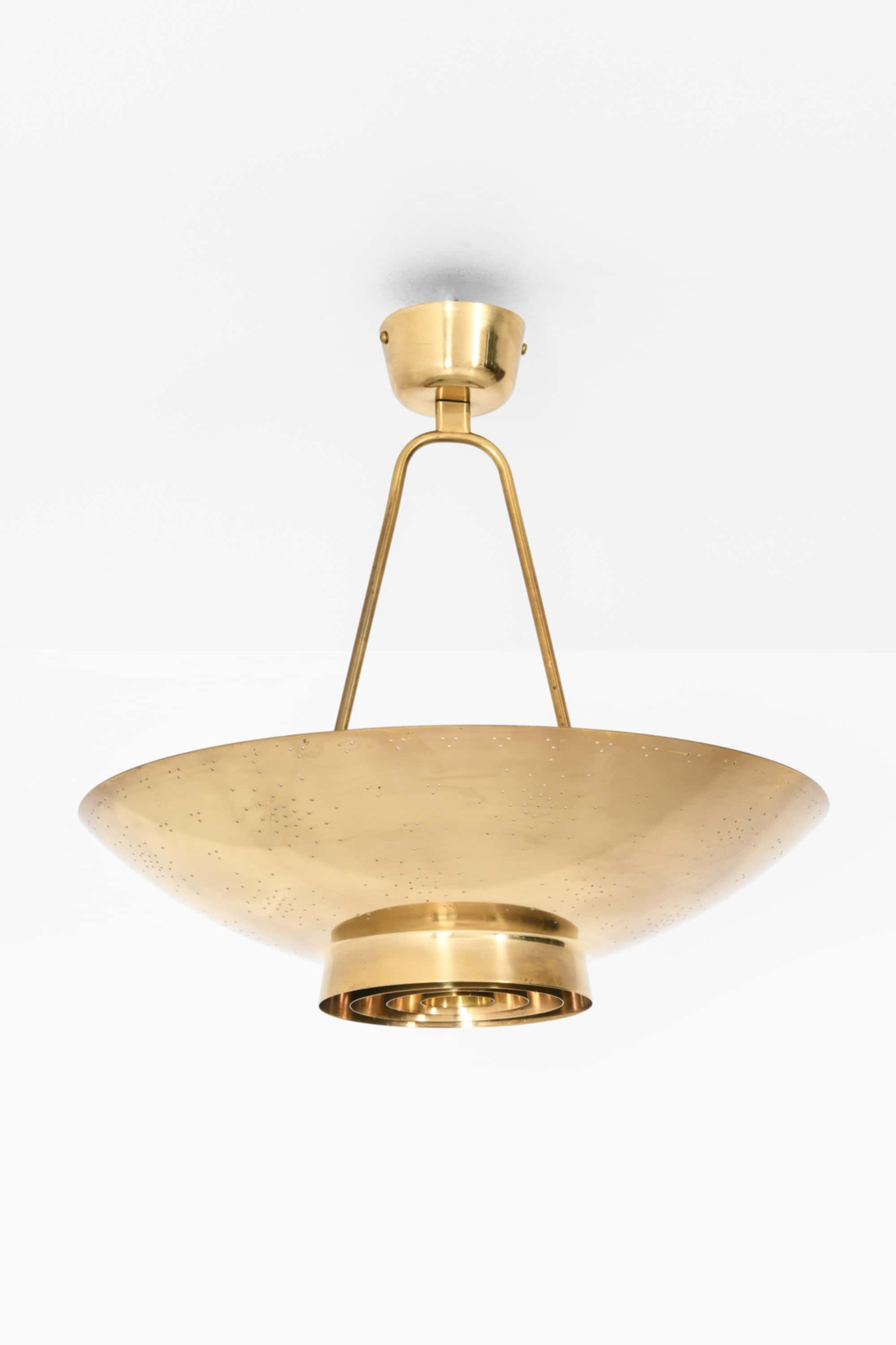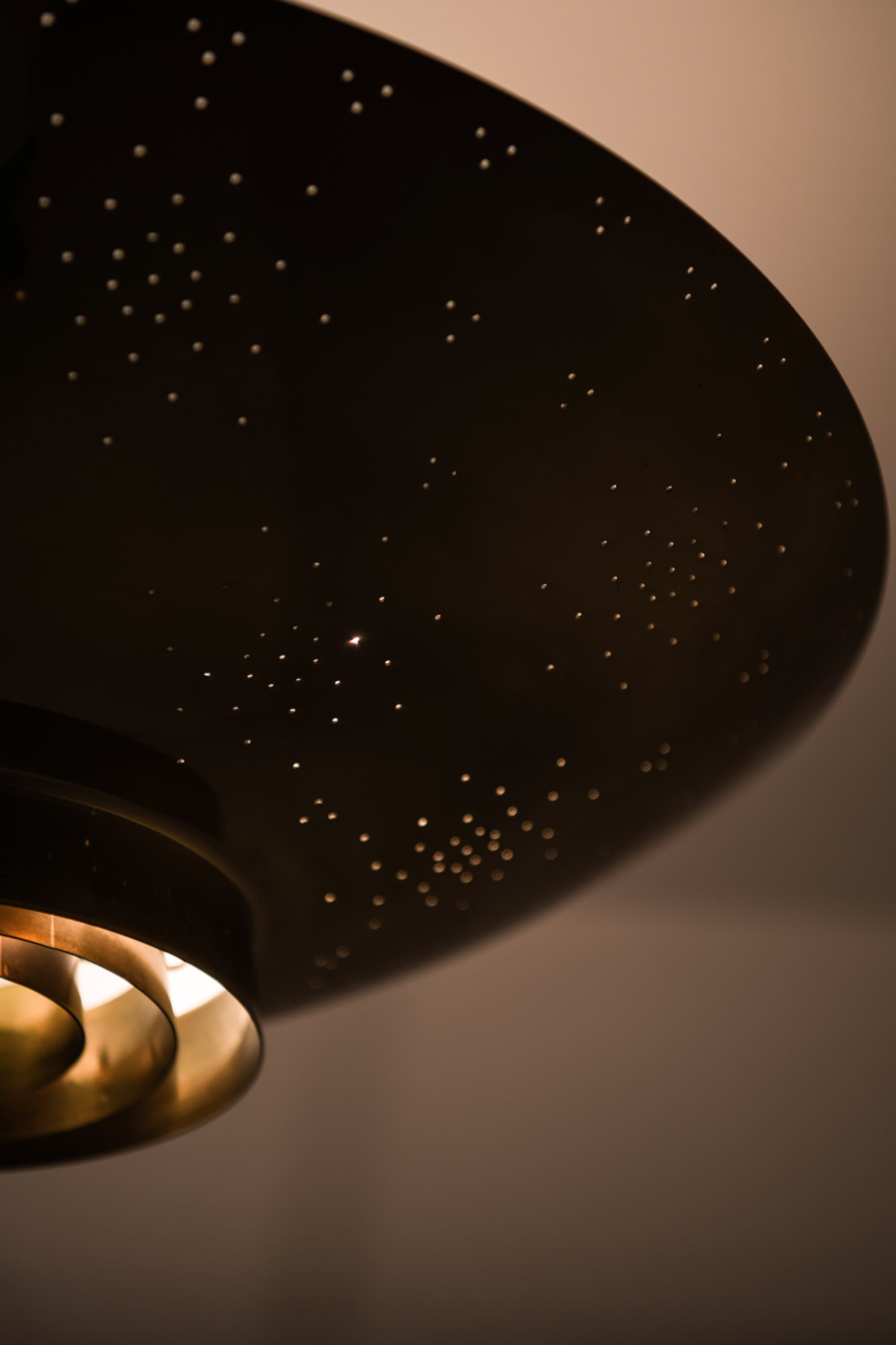 The lamp is made entirely of brass with a perforated conical shade and a glass diffuser beneath. The surface is carefully hand-pierced with a constellation of small holes, allowing light to filter through in a soft, atmospheric pattern that recalls a starry sky. The lower section features concentric brass rings that conceal the bulb and diffuse the light downward, while the open upper surface reflects illumination onto the ceiling. When lit, the perforations produce a delicate play of light and shadow, one of Tynell’s most characteristic design elements. The lamp is suspended by a Y-shaped brass rod connected to a rounded ceiling cup, maintaining both visual balance and a sense of lightness.