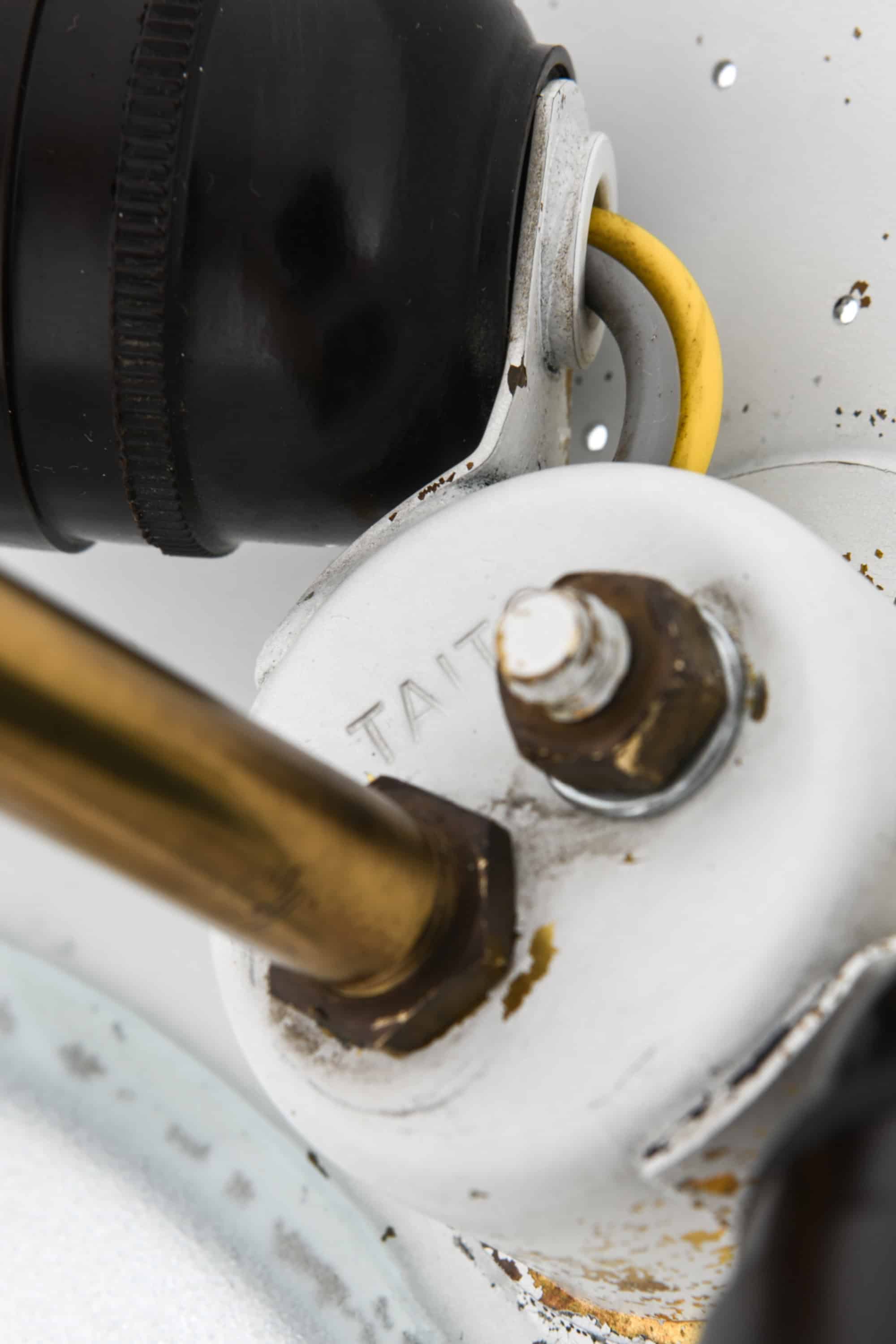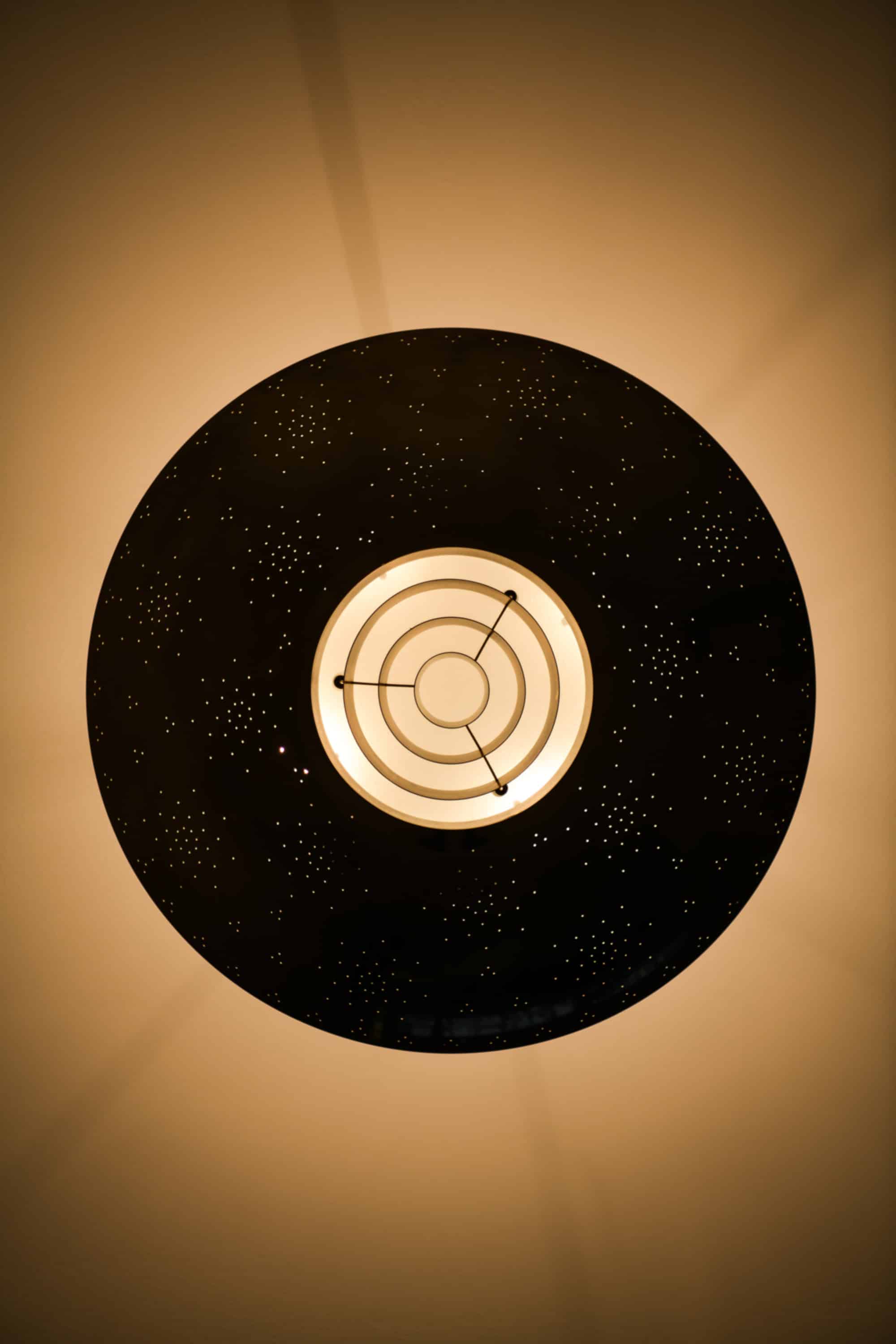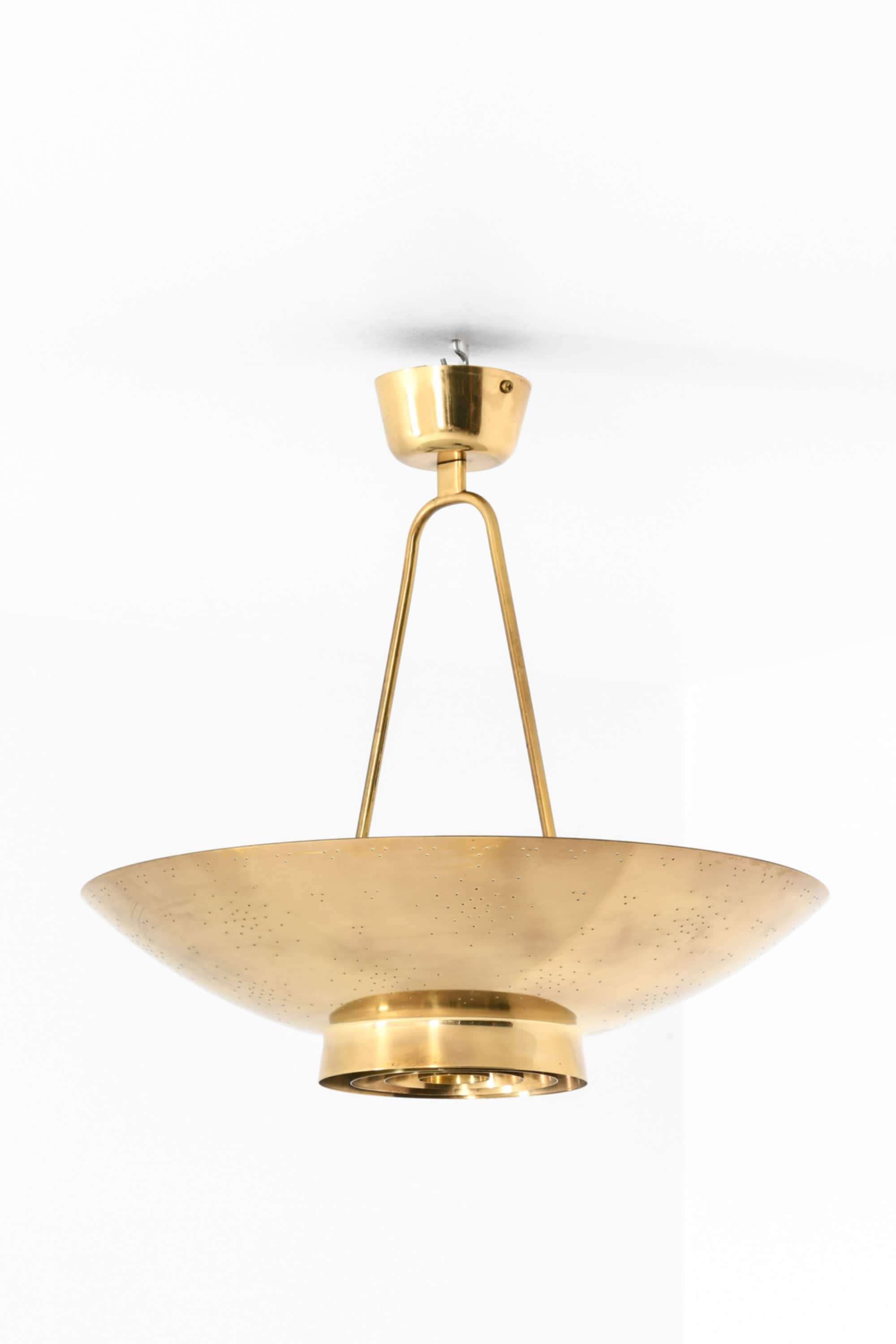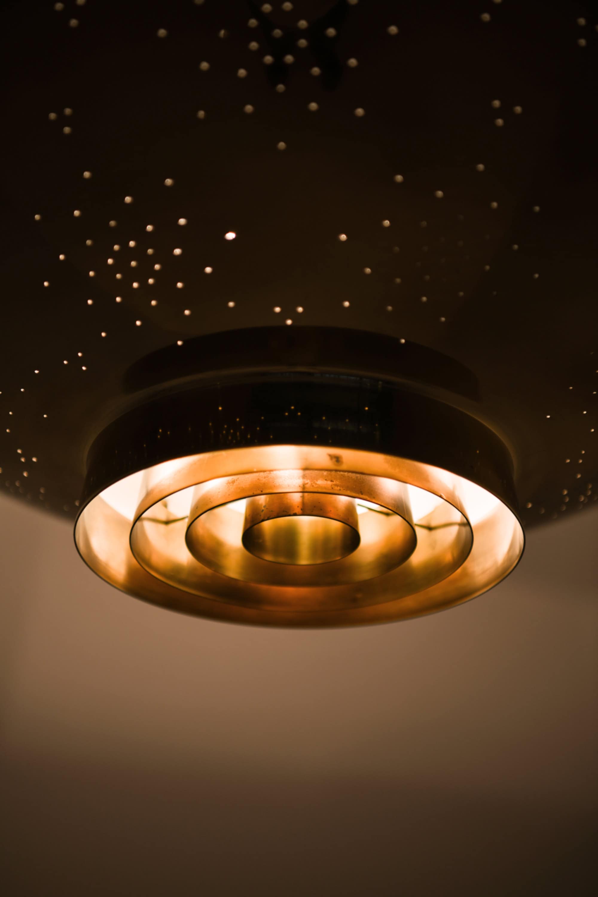 The lamp is made entirely of brass with a perforated conical shade and a glass diffuser beneath. The surface is carefully hand-pierced with a constellation of small holes, allowing light to filter through in a soft, atmospheric pattern that recalls a starry sky. The lower section features concentric brass rings that conceal the bulb and diffuse the light downward, while the open upper surface reflects illumination onto the ceiling. When lit, the perforations produce a delicate play of light and shadow, one of Tynell’s most characteristic design elements. The lamp is suspended by a Y-shaped brass rod connected to a rounded ceiling cup, maintaining both visual balance and a sense of lightness.