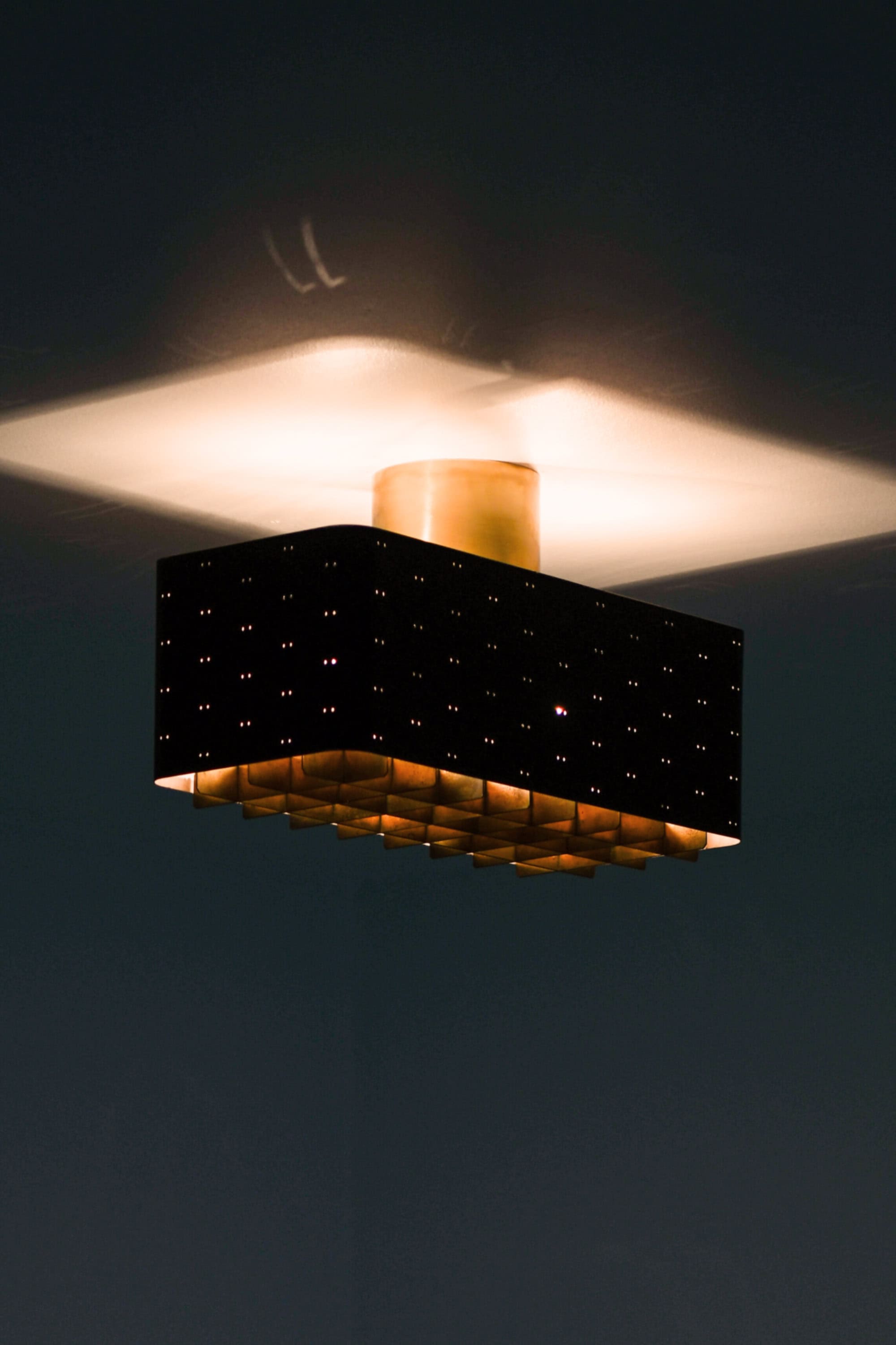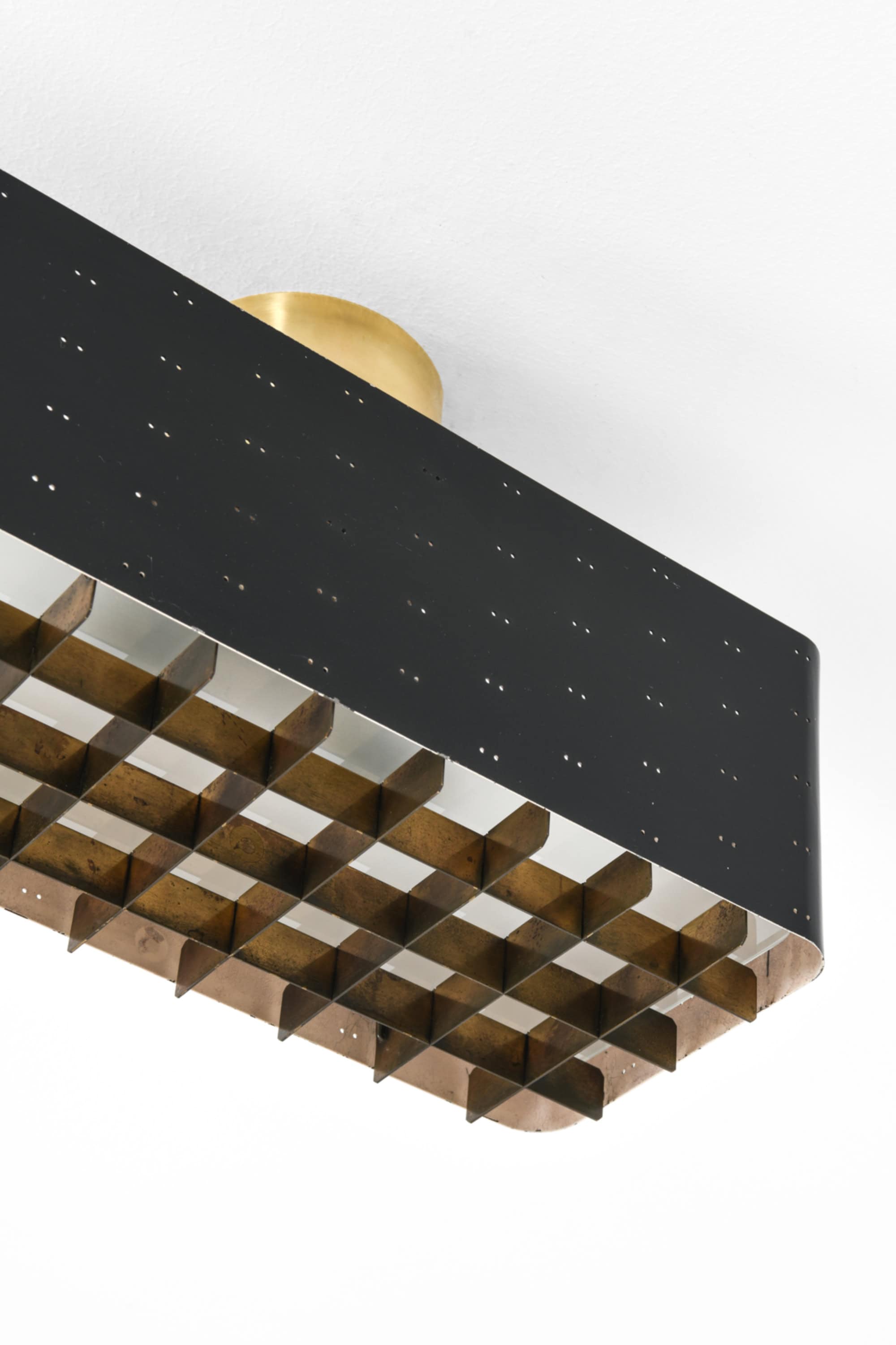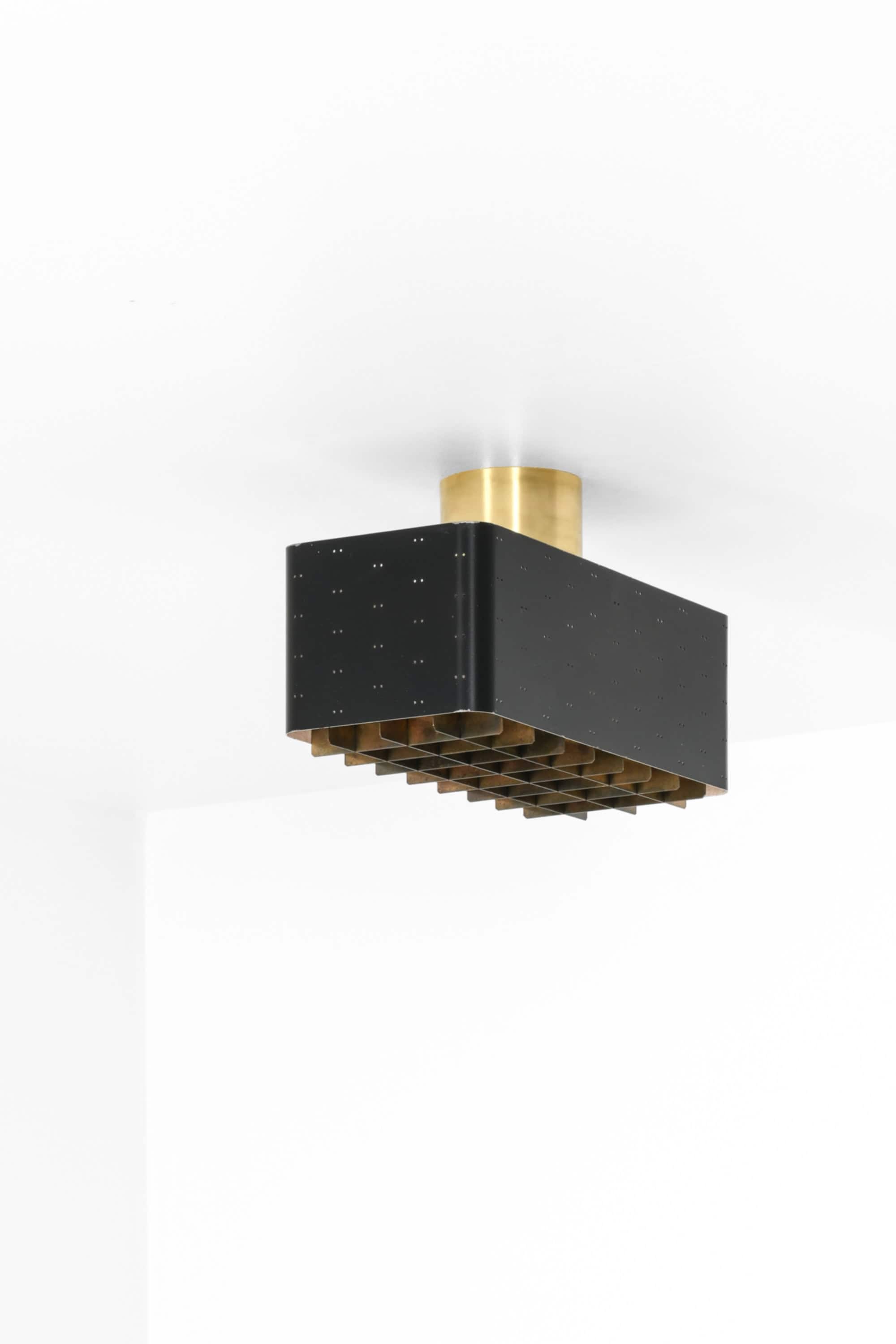This rare ceiling lamp, model 9068 often referred to as the Starry Sky, was designed by Paavo Tynell and produced by Taito Oy in Finland during the 1950s. The lamp is constructed with a black lacquered metal body combined with brass elements and a glass diffuser, creating a characteristic interplay of light and shadow. The perforated metal shade is arranged in a precise geometric grid, allowing finely scattered points of light to pass through, which is a well-known decorative and technical feature in Tynell’s work.