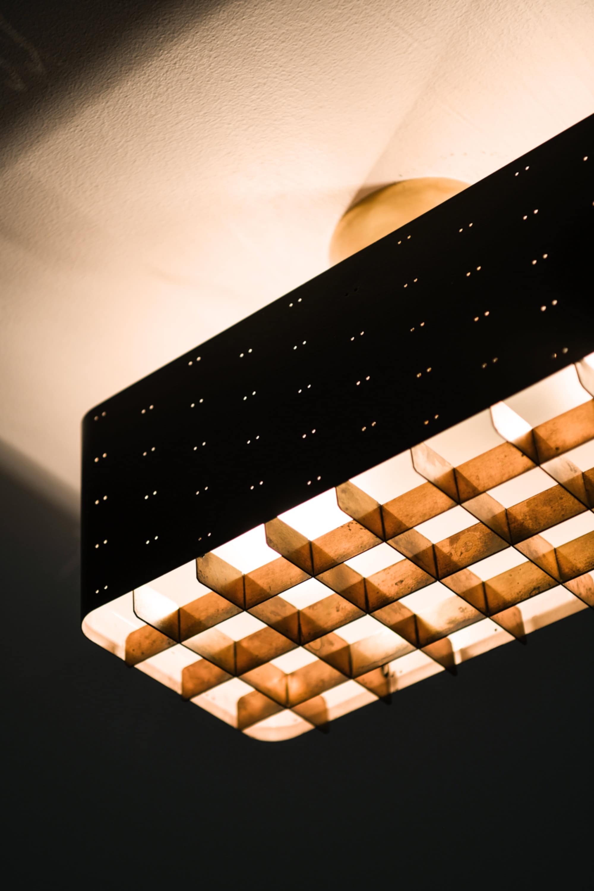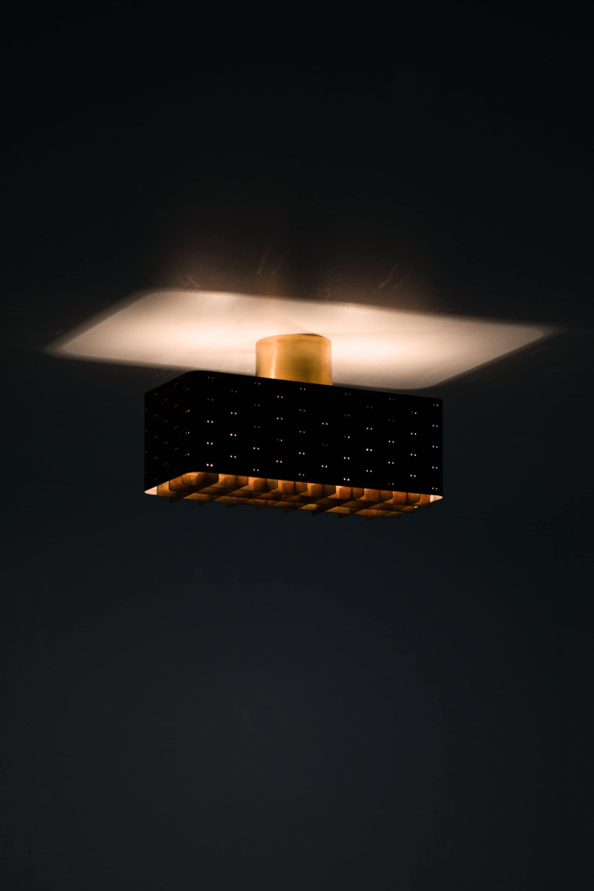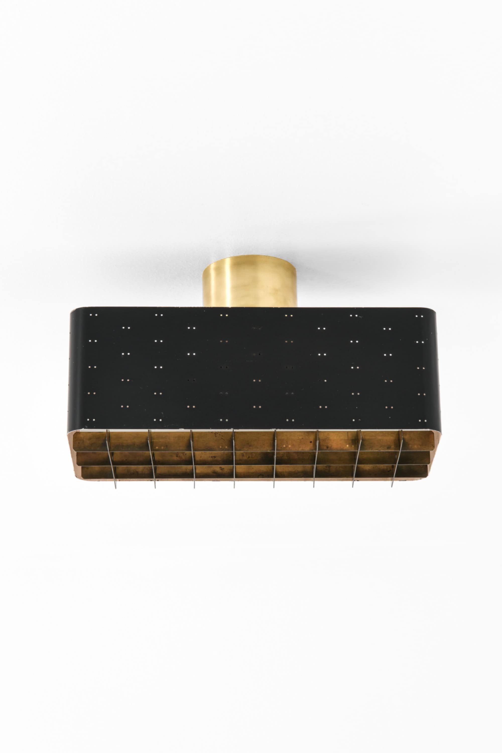 This rare ceiling lamp, model 9068 often referred to as the Starry Sky, was designed by Paavo Tynell and produced by Taito Oy in Finland during the 1950s. The lamp is constructed with a black lacquered metal body combined with brass elements and a glass diffuser, creating a characteristic interplay of light and shadow. The perforated metal shade is arranged in a precise geometric grid, allowing finely scattered points of light to pass through, which is a well-known decorative and technical feature in Tynell’s work.