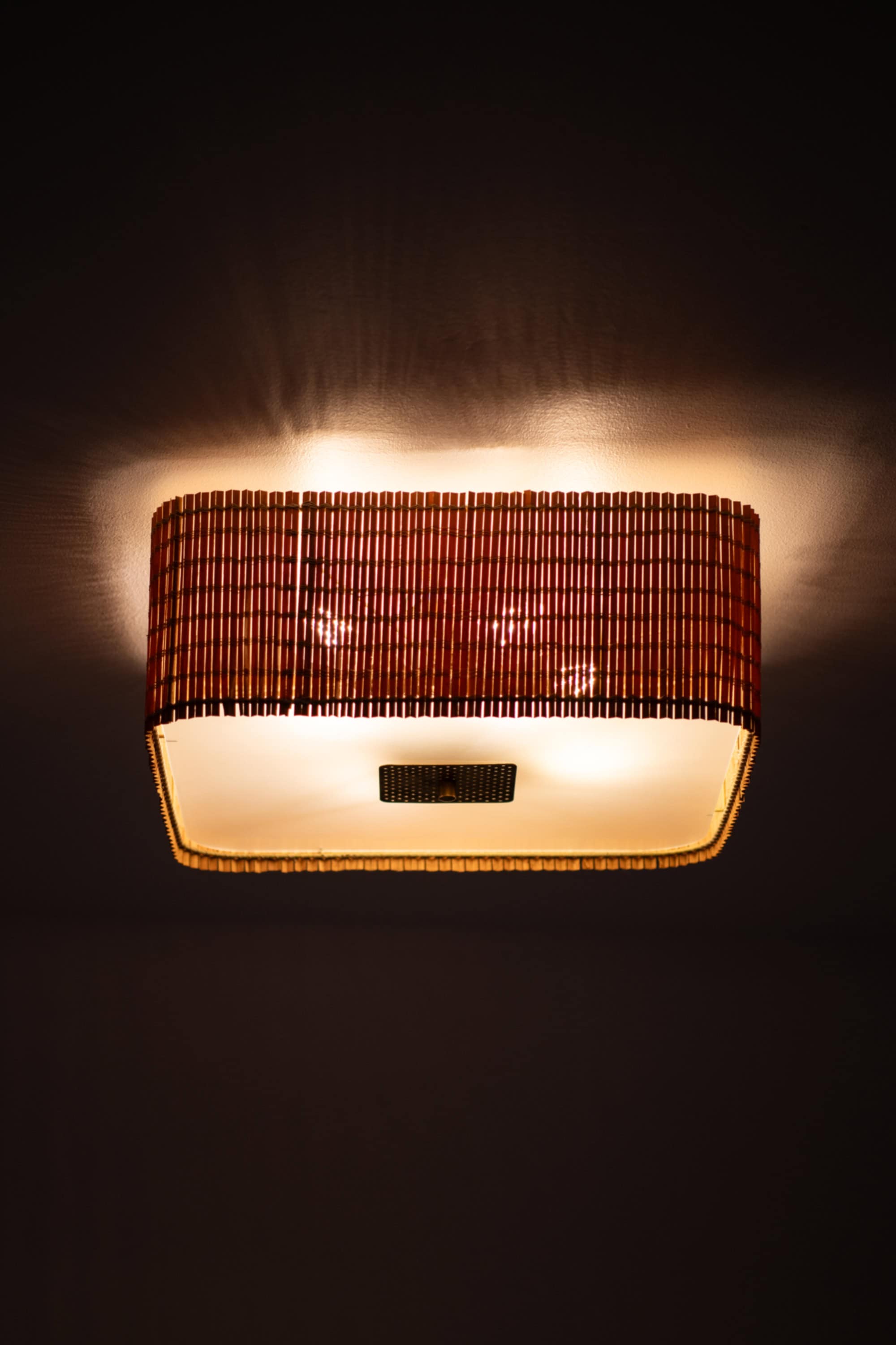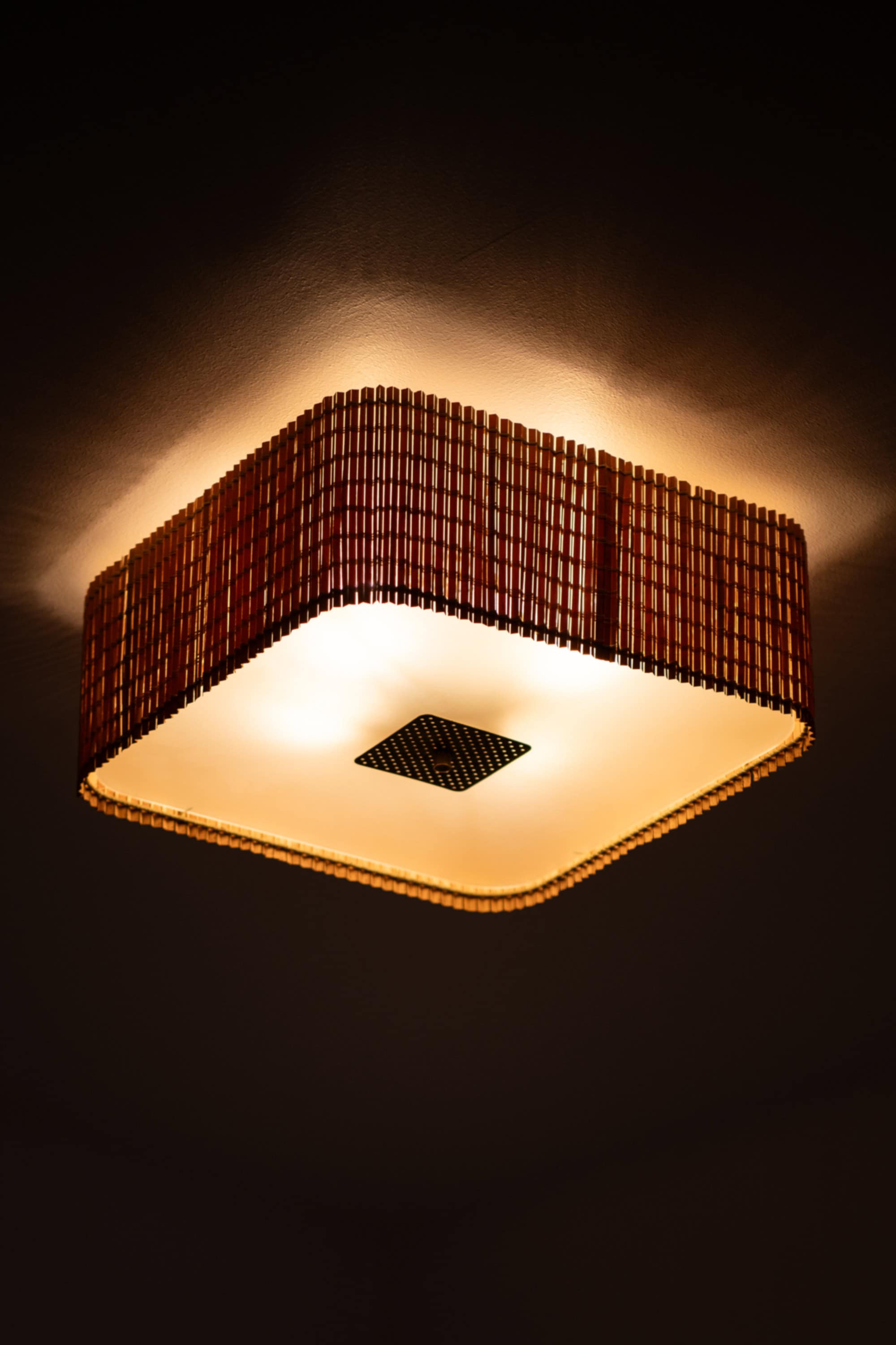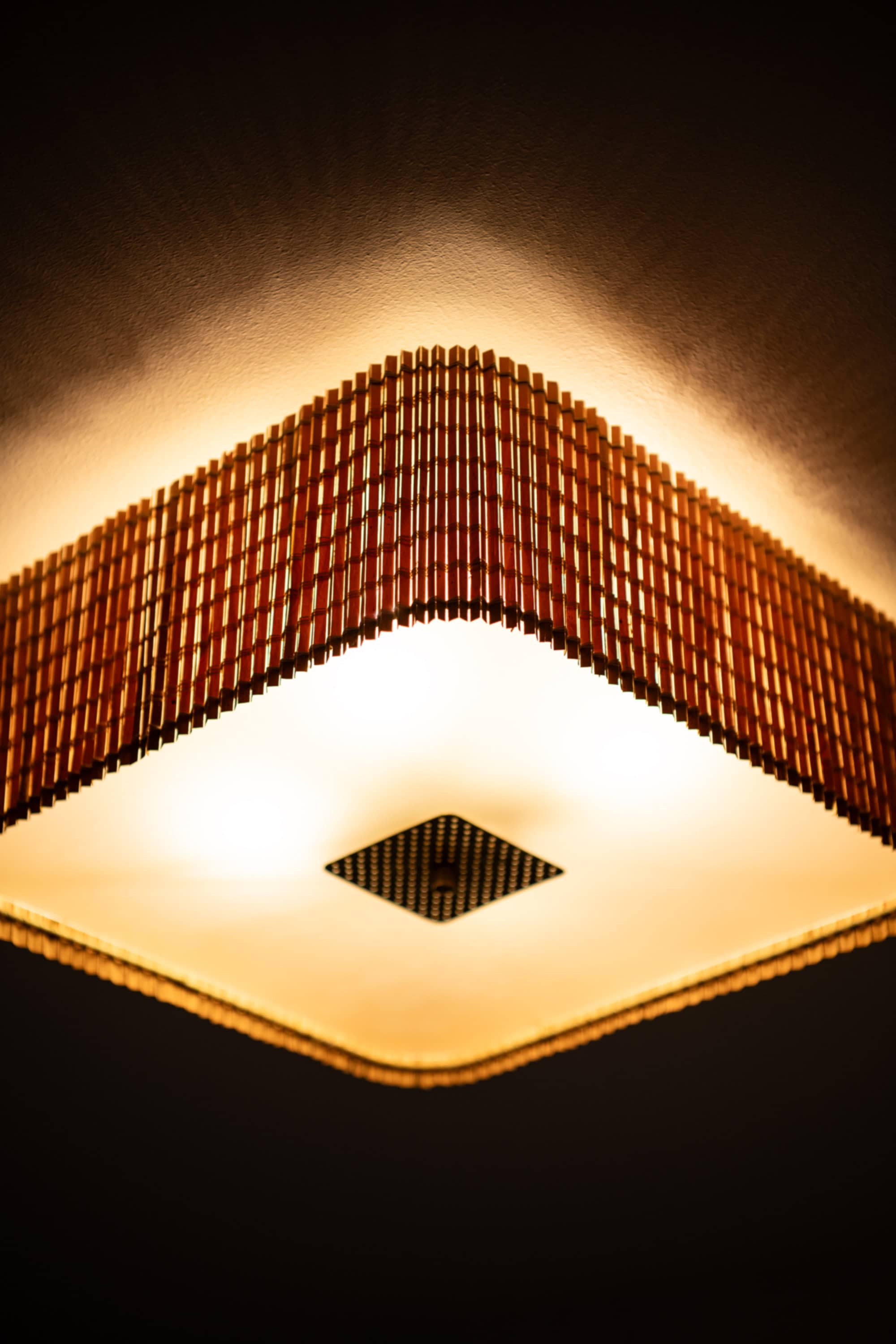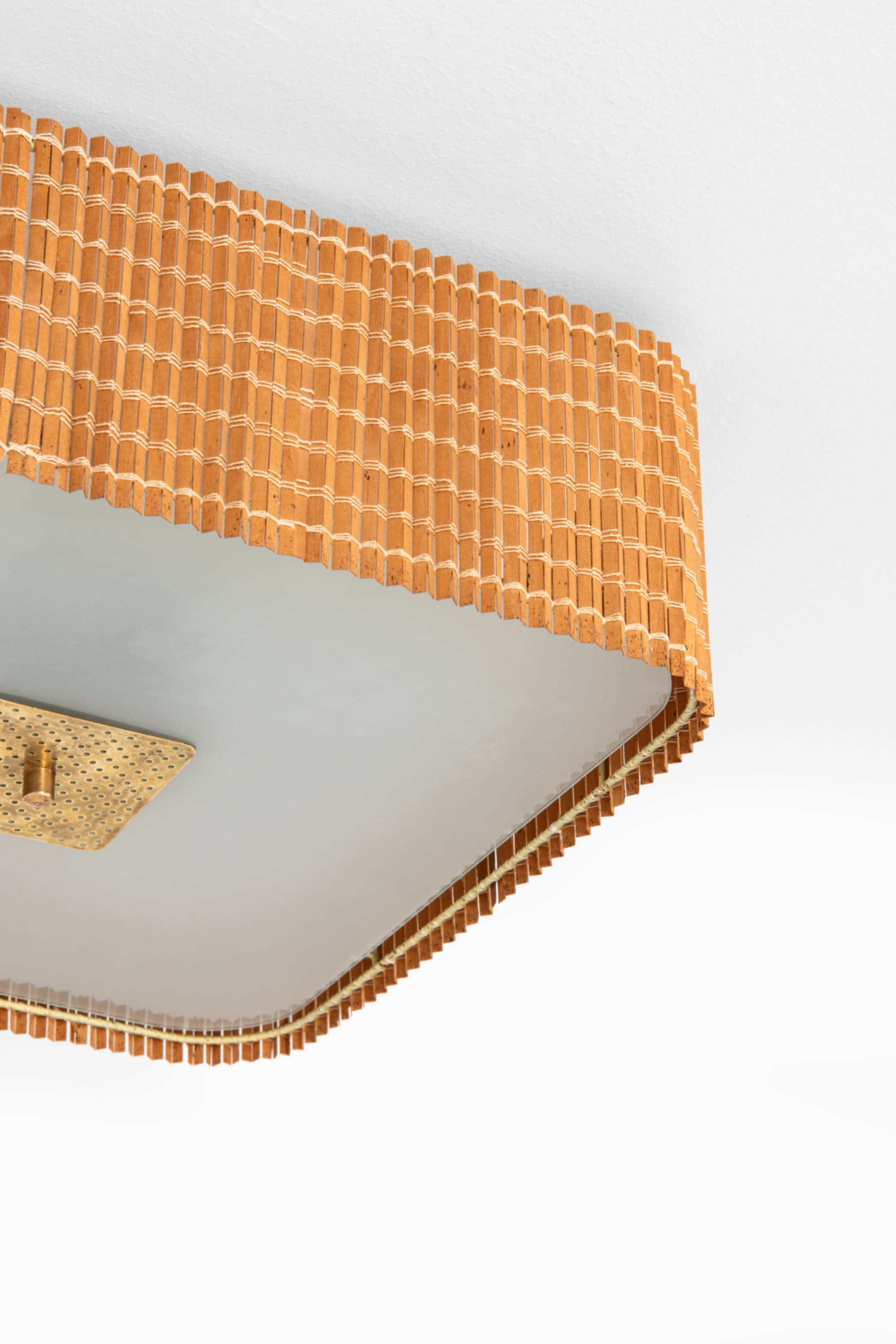 A rare ceiling lamp / flush mount designed by Paavo Tynell and produced by Idman in Finland during the 1940s. This striking model 20428 combines Tynell’s refined, architectural approach with a warm material palette, resulting in a piece that feels both sculptural and highly functional.
