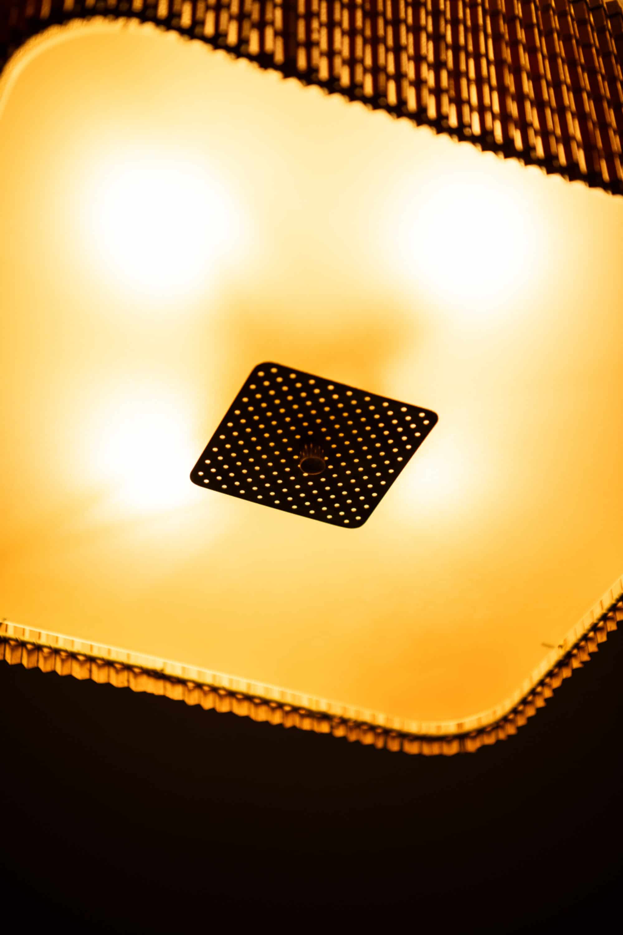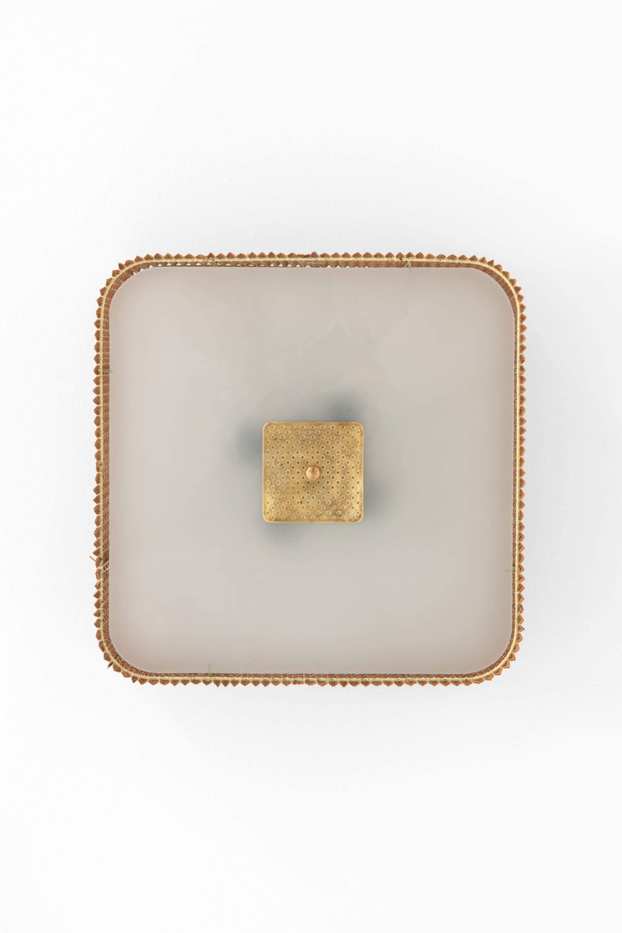 The lamp is constructed in brass with a frosted glass diffuser, framed by a distinctive wooden shade structure that gives the design its character and softens the overall expression. The square form with gently rounded corners creates a balanced, modern silhouette, while the layered construction allows the light to spread evenly and comfortably across the ceiling and surrounding space.