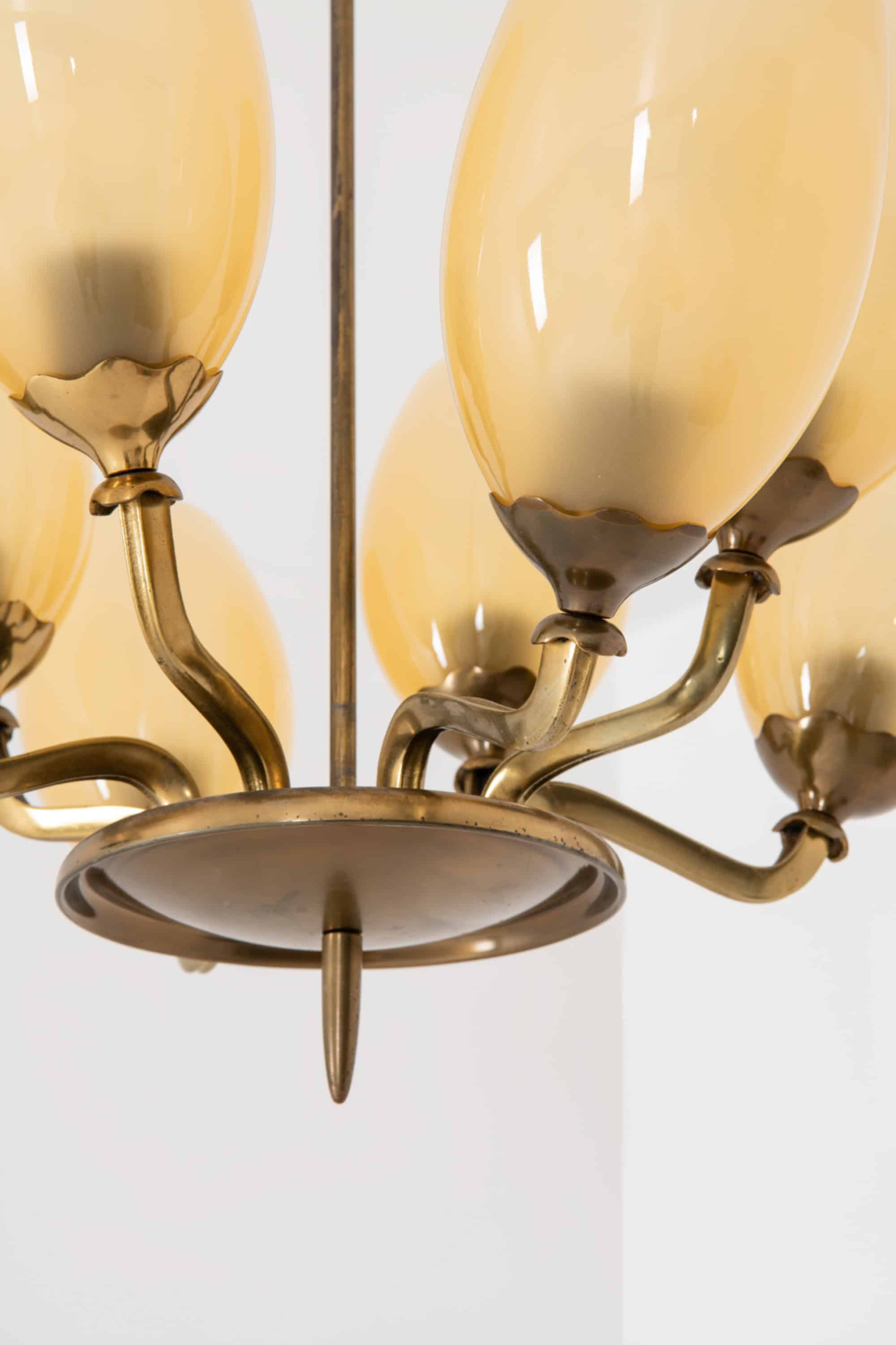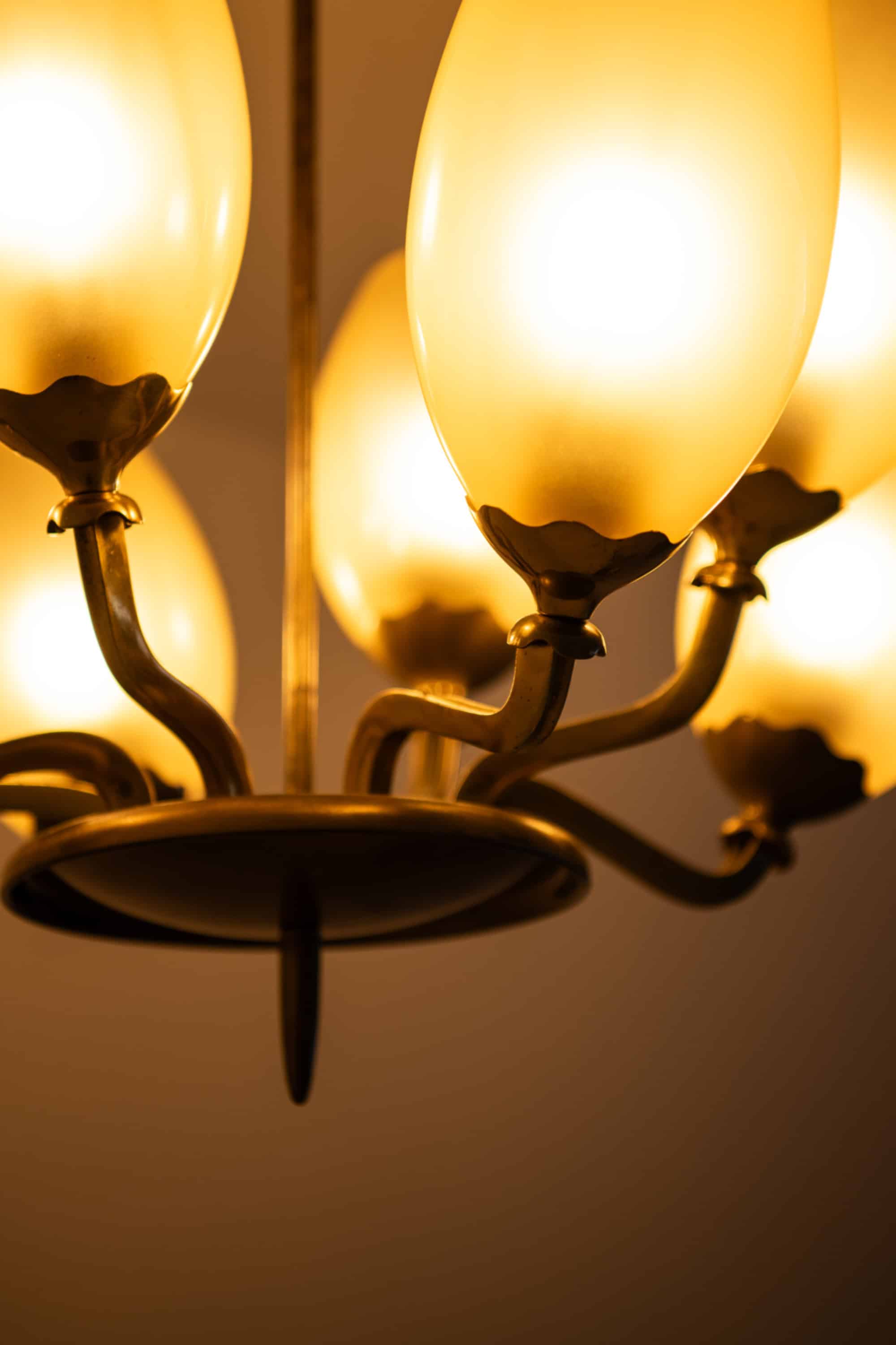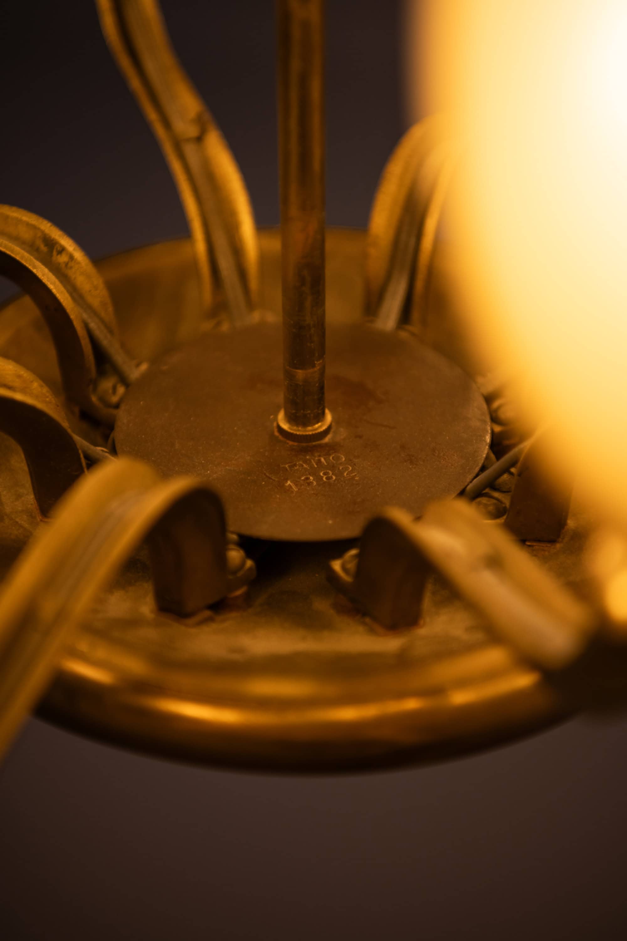 The light quality is characteristic of Tynell’s approach to illumination. The opaline glass shades diffuse the light evenly, producing a warm and soft glow that emphasizes the brass structure without glare. When lit, the lamp creates a calm ambient light suitable for dining rooms or larger living spaces, while also functioning as a sculptural centerpiece. The upward and outward orientation of the shades contributes to an even distribution of light across the ceiling and surrounding space.