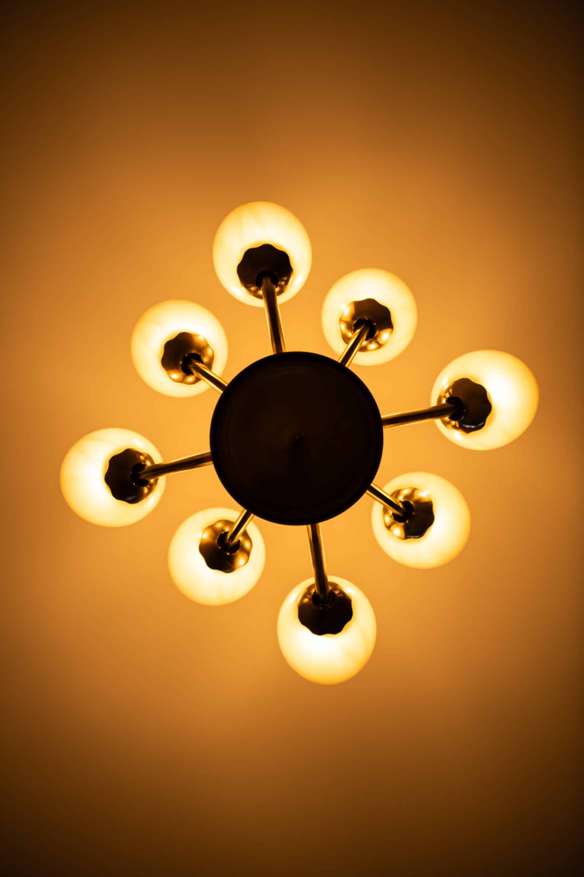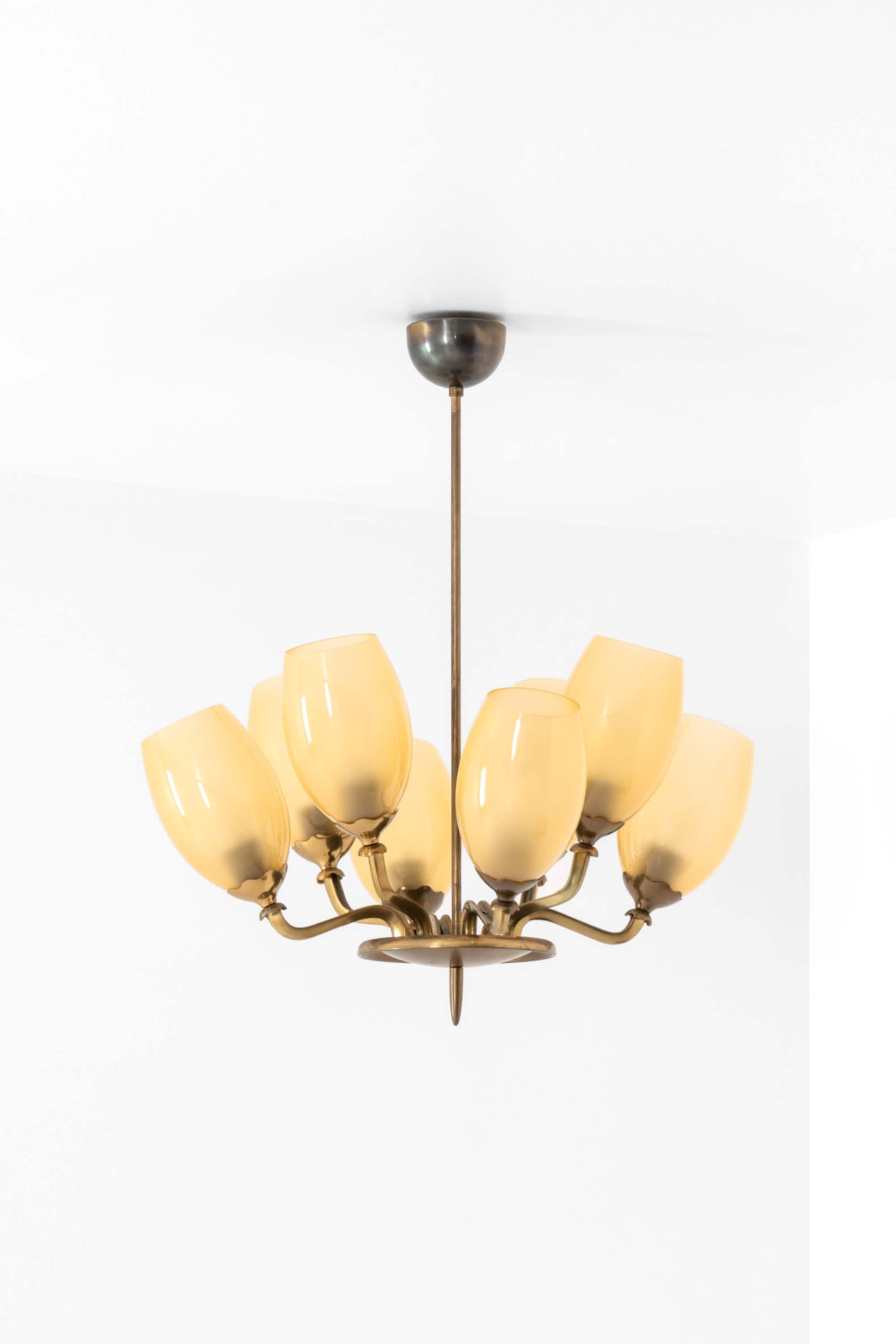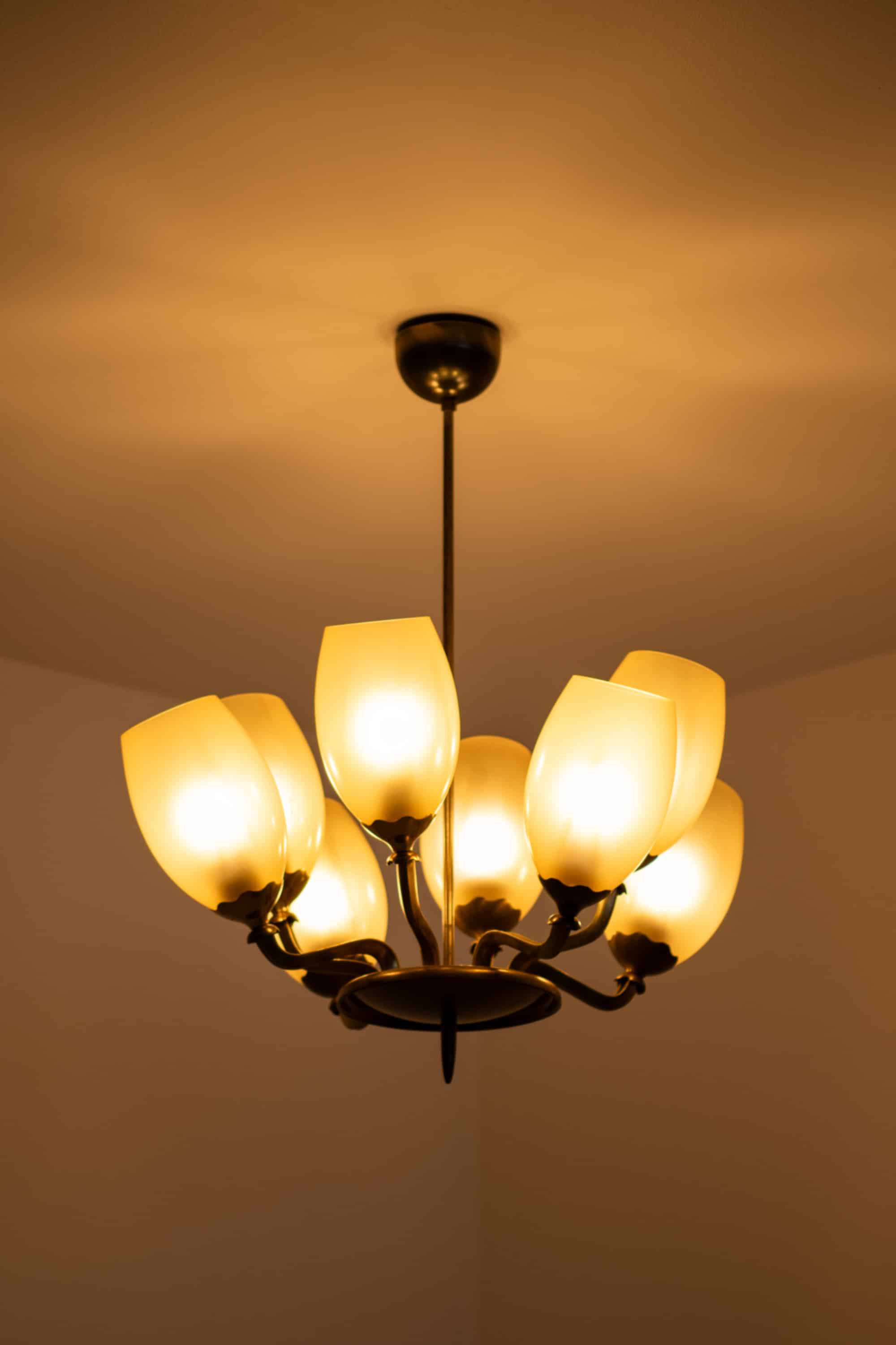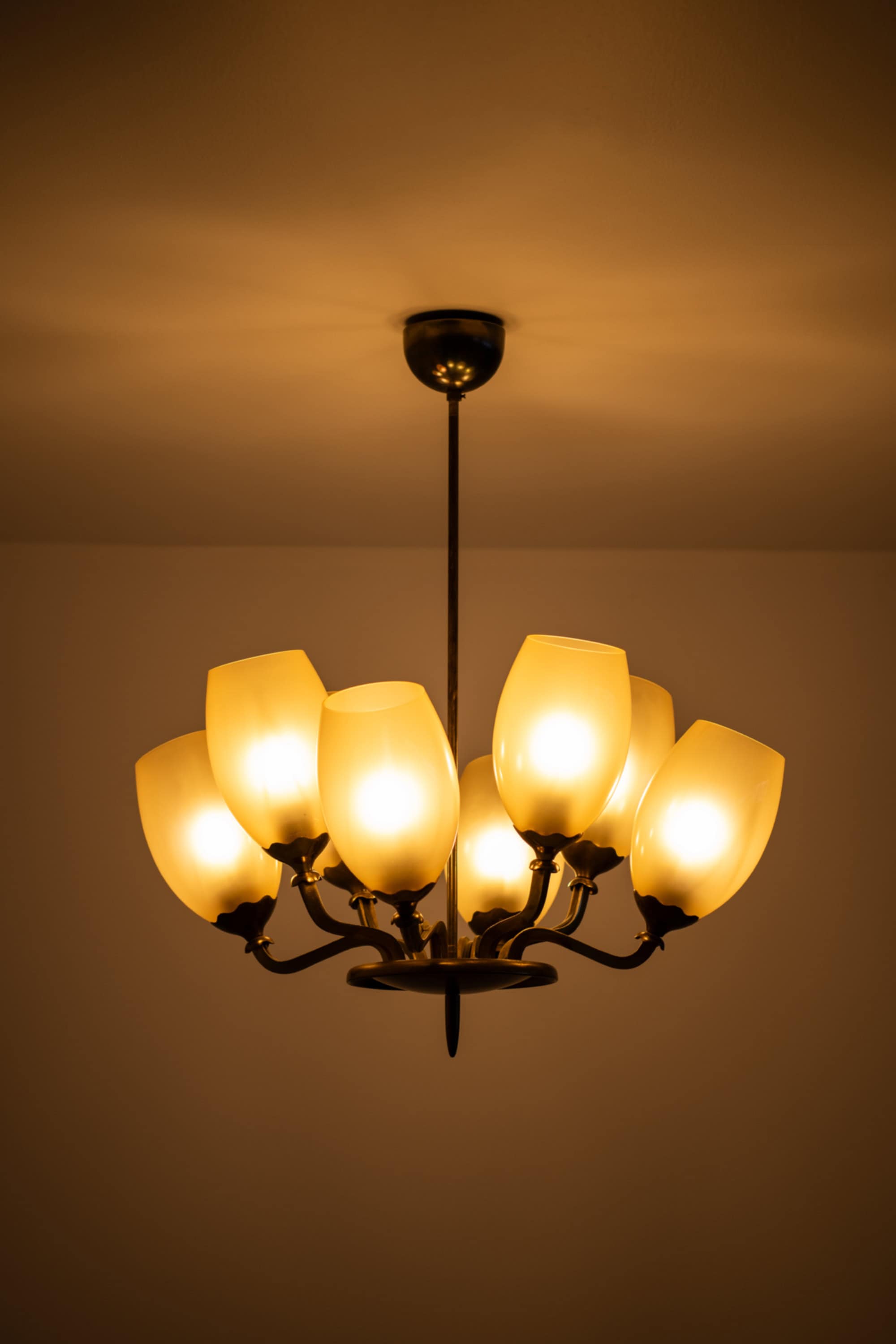 The light quality is characteristic of Tynell’s approach to illumination. The opaline glass shades diffuse the light evenly, producing a warm and soft glow that emphasizes the brass structure without glare. When lit, the lamp creates a calm ambient light suitable for dining rooms or larger living spaces, while also functioning as a sculptural centerpiece. The upward and outward orientation of the shades contributes to an even distribution of light across the ceiling and surrounding space.