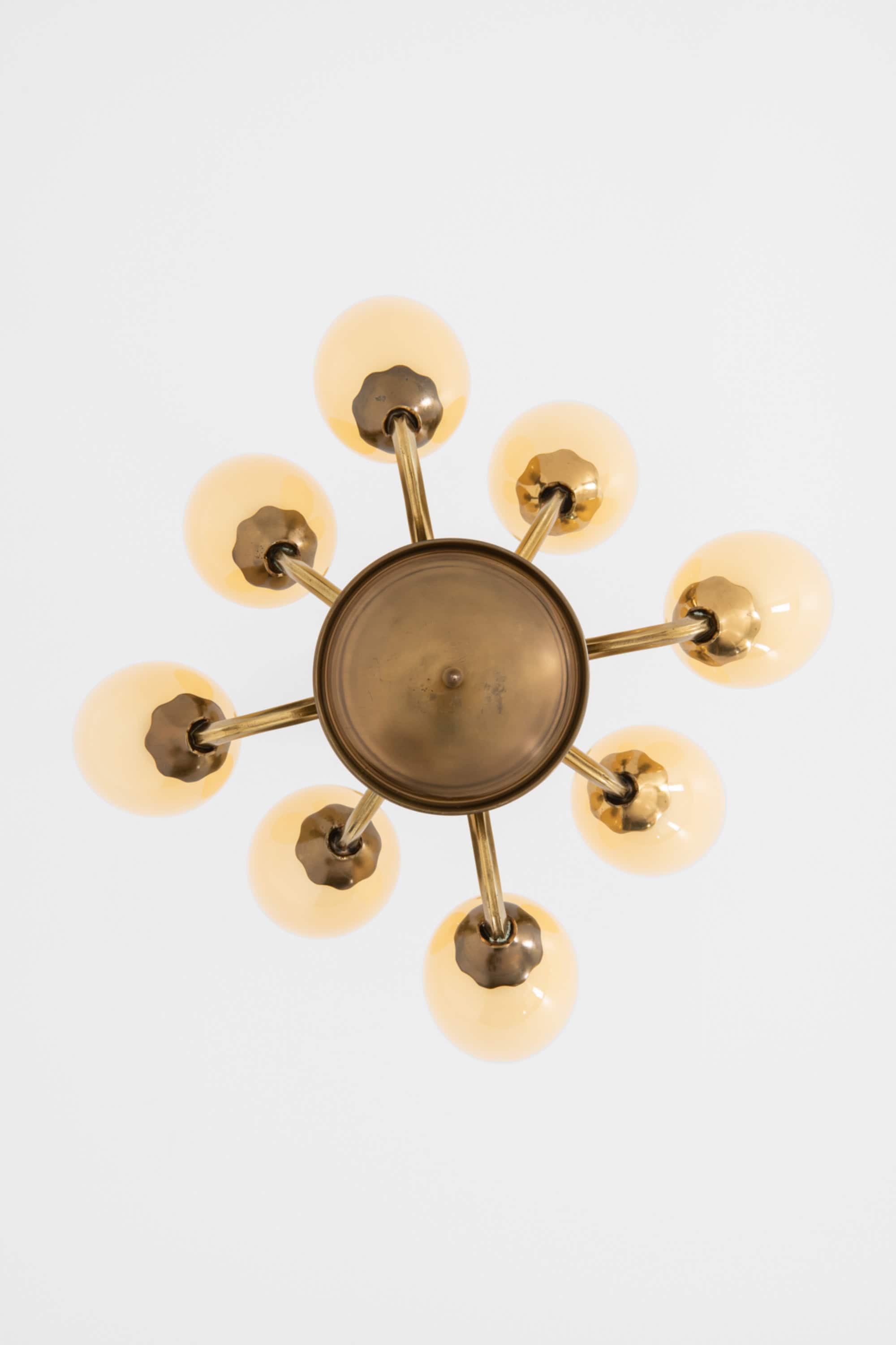 The construction is executed in patinated brass with eight curved arms radiating symmetrically from a central body. Each arm supports a softly rounded glass shade, creating a balanced circular composition when viewed from below. The brass surfaces display a warm golden tone with visible age-related patina, particularly on the central plate, arms, and ceiling canopy. The glass shades are newly produced replacements, carefully made to correspond to the shape, size, and translucency of the original shades, allowing the lamp to retain its historical character while remaining fully functional.