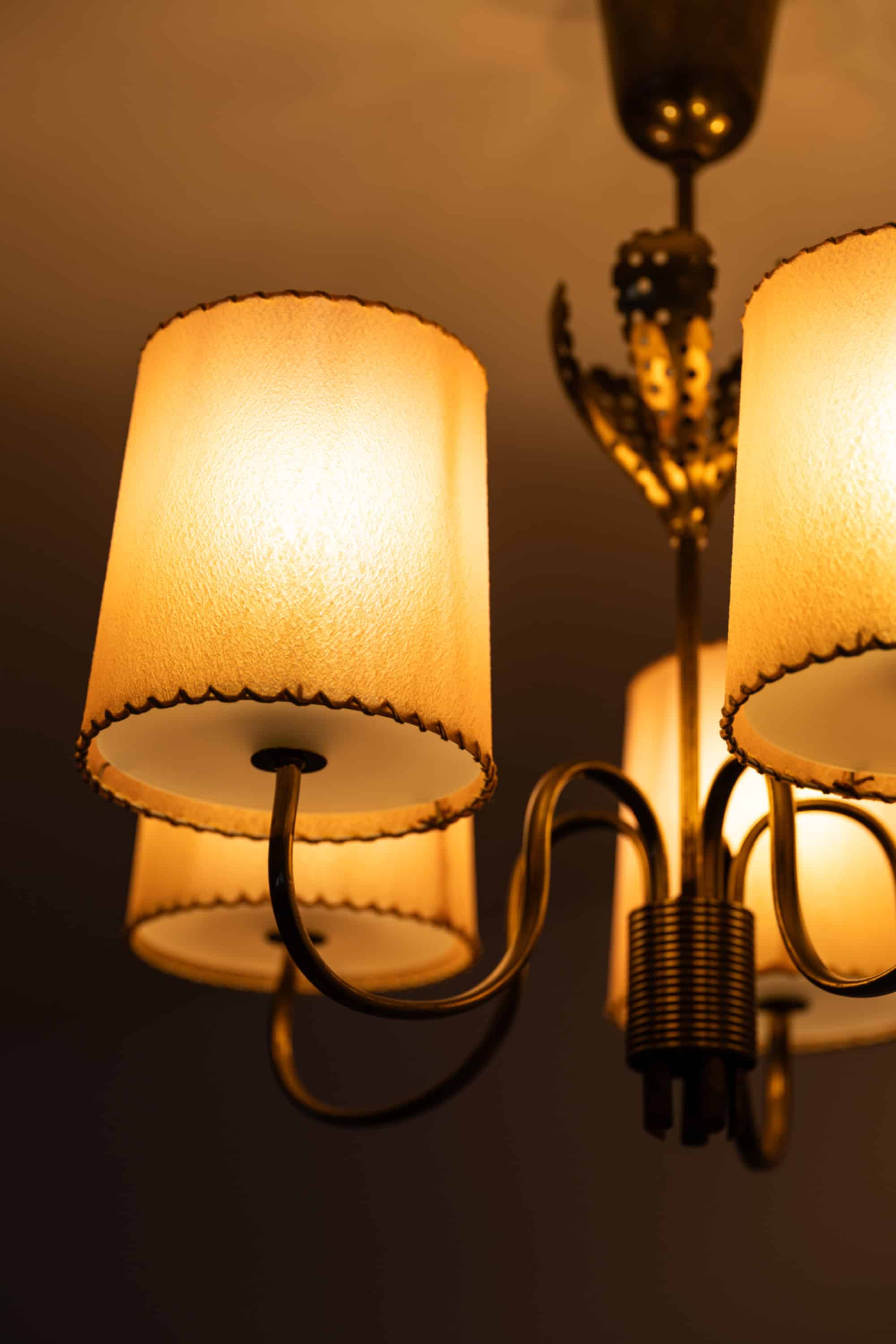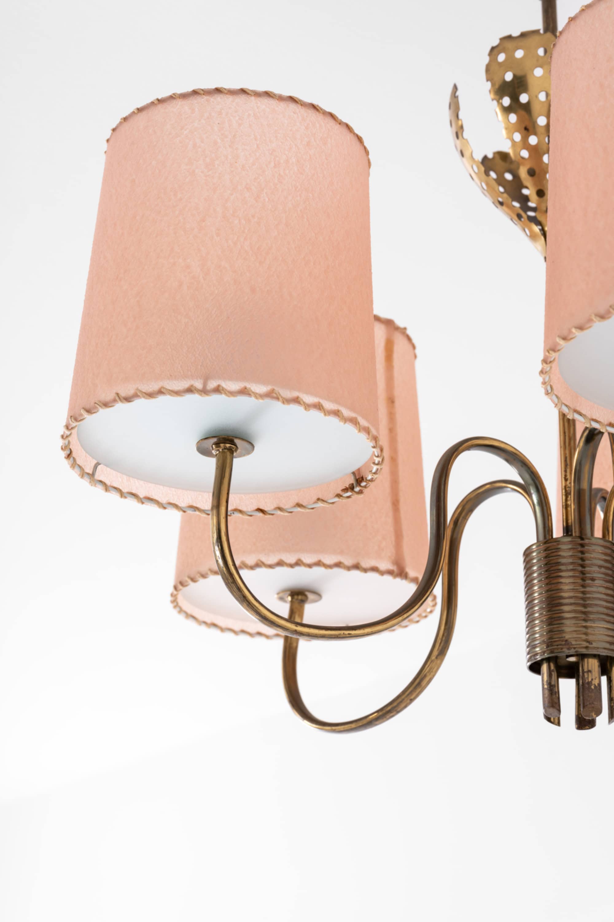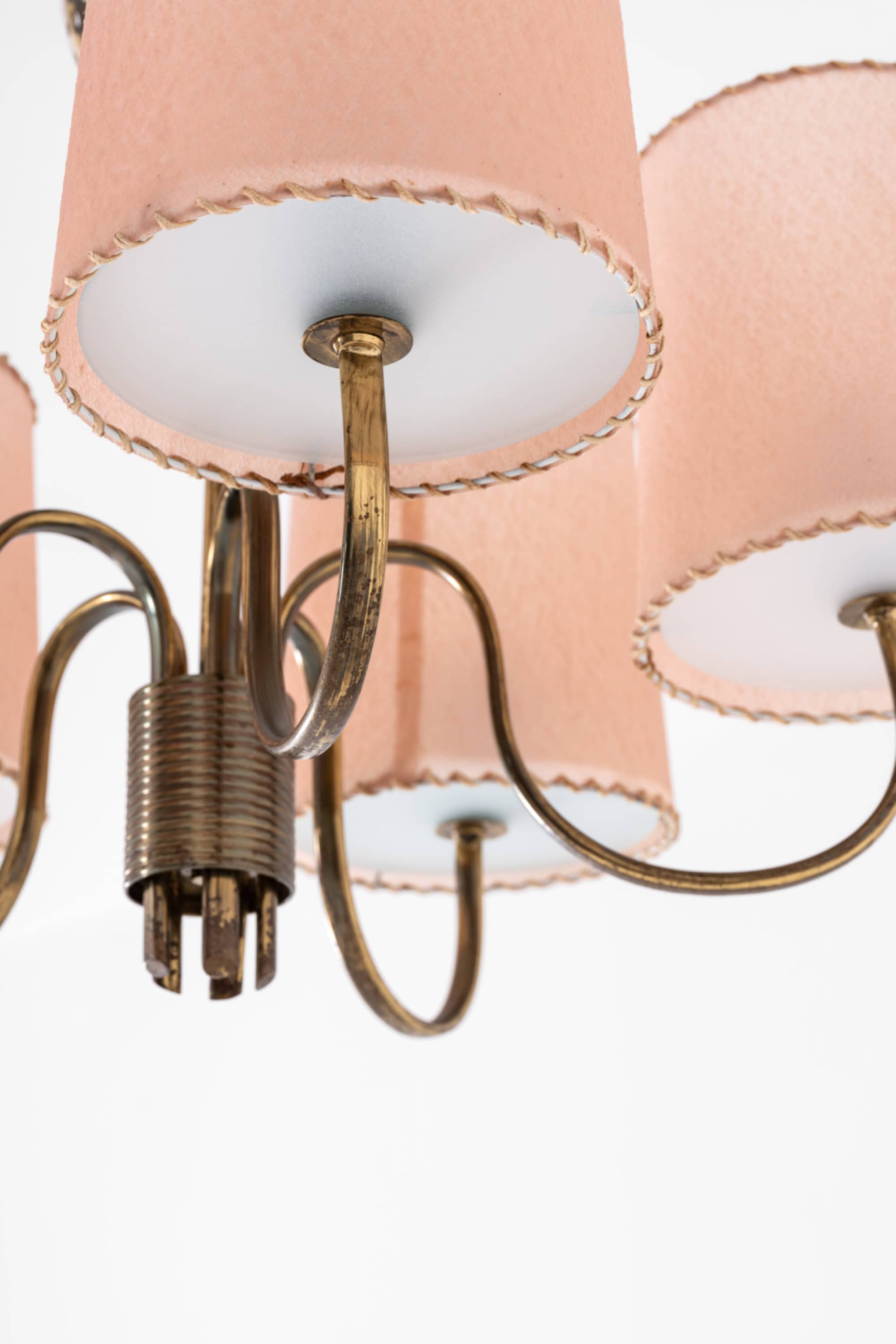 The frame is executed in brass with softly curved arms radiating outward from a central stem. Each arm supports a cylindrical shade in a warm beige-pink tone, finished with decorative stitched edging and fitted with white diffusers on the underside. The shades create a controlled downward light while simultaneously softening the overall glow, producing an even and atmospheric illumination. The brass surfaces have developed a rich patina, with tonal variation ranging from warm golden hues to darker aged areas, emphasizing the lamp’s authentic period character.