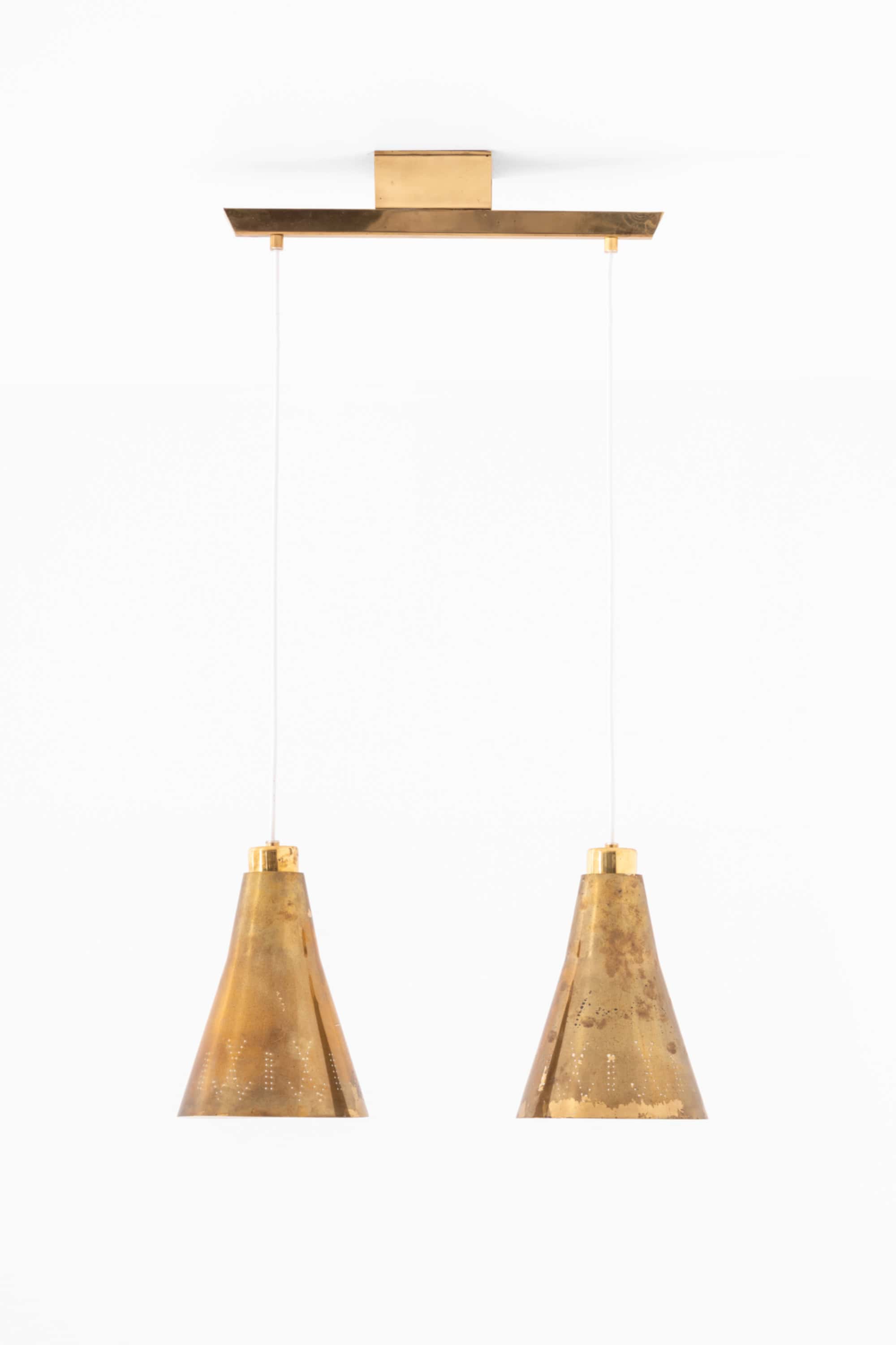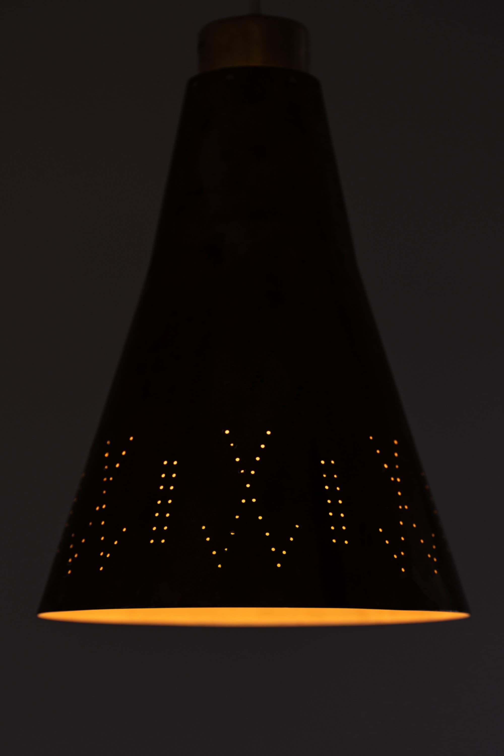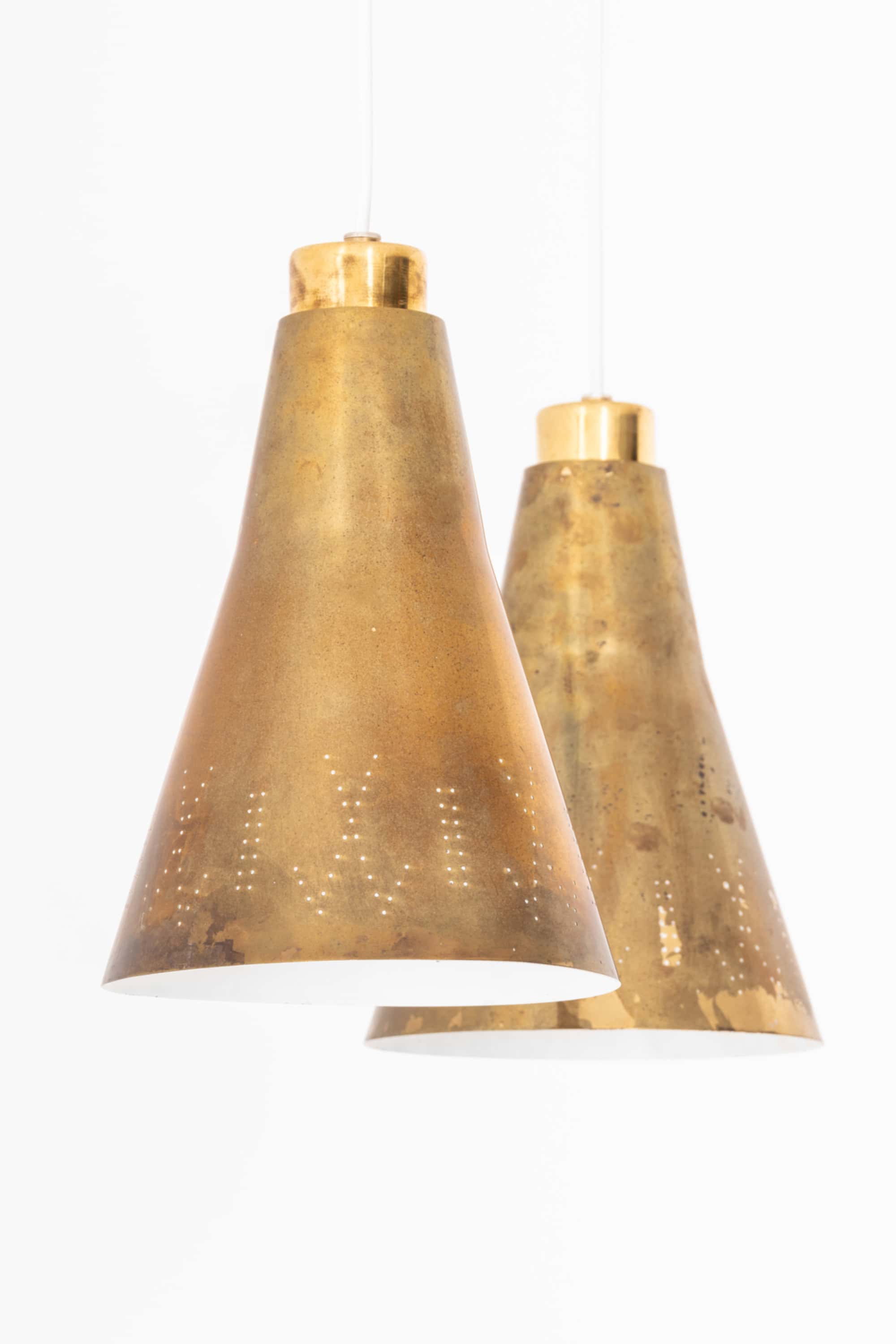 Each shade has a diameter of 19.5 cm (7.7 inches) and a height of 28 cm (11 inches), formed in a softly tapering conical shape characteristic of Tynell’s designs. The brass surfaces show subtle variations and markings, contributing to the overall patinated appearance. The lower sections of the shades are decorated with fine perforations arranged in a rhythmic pattern. When illuminated, these perforations emit small points of light, forming a decorative halo effect while the open base provides a warm, directed downward glow.