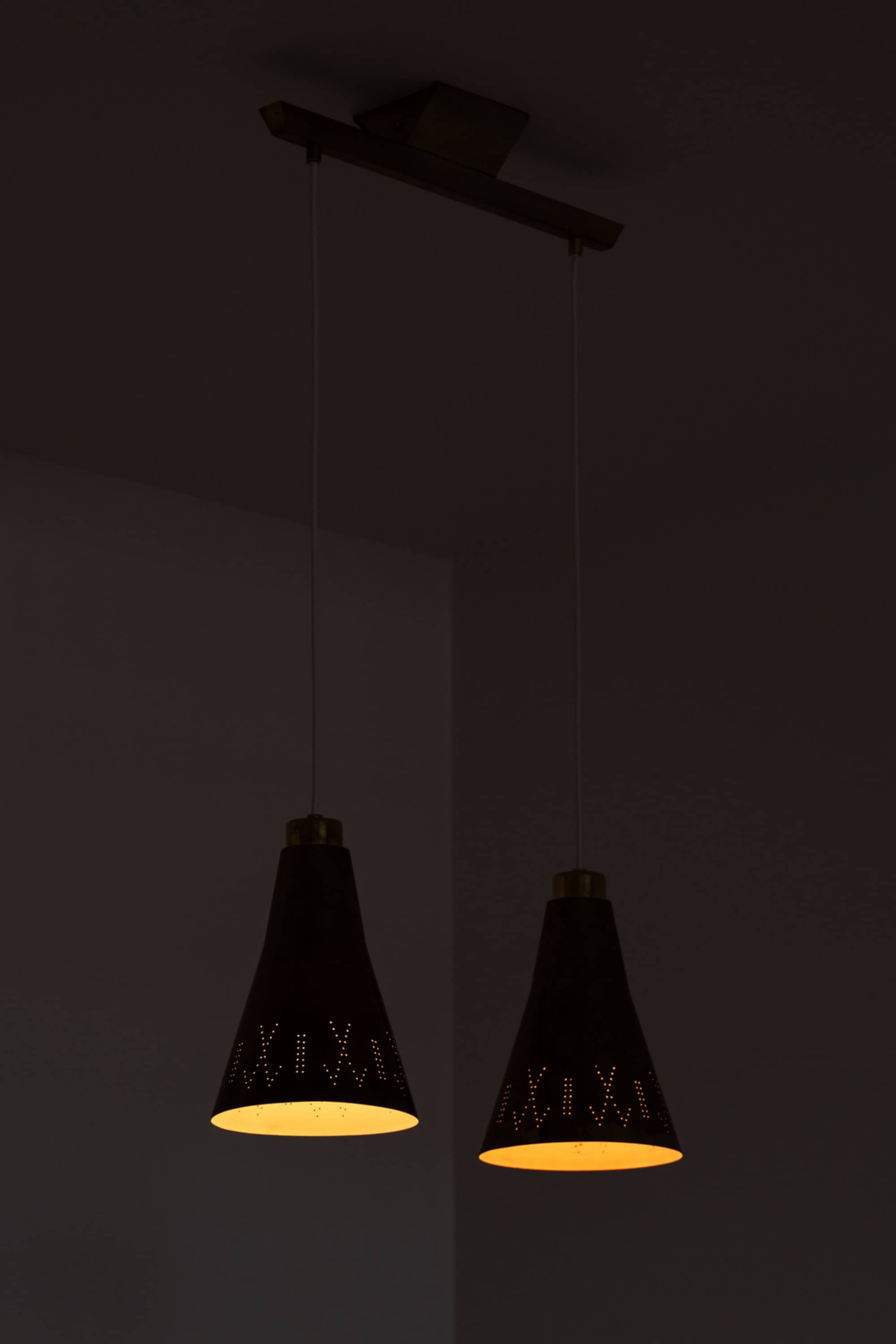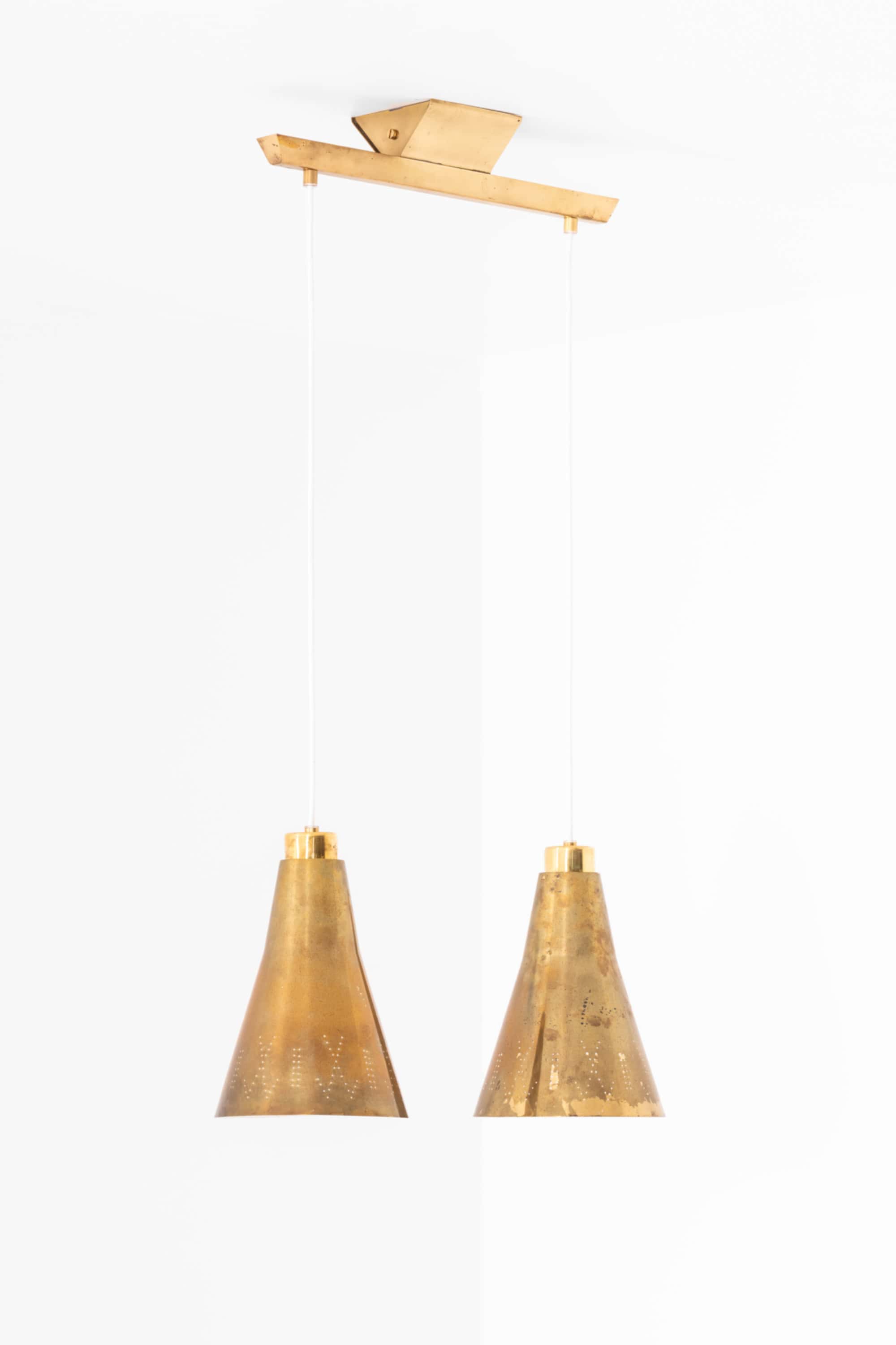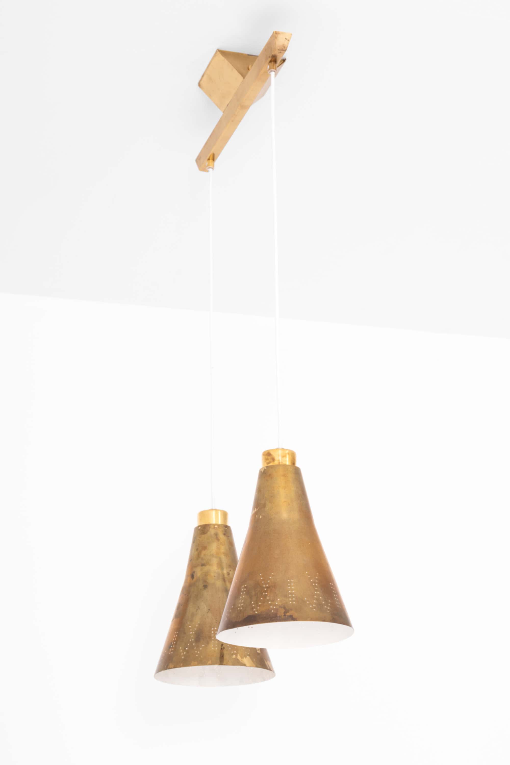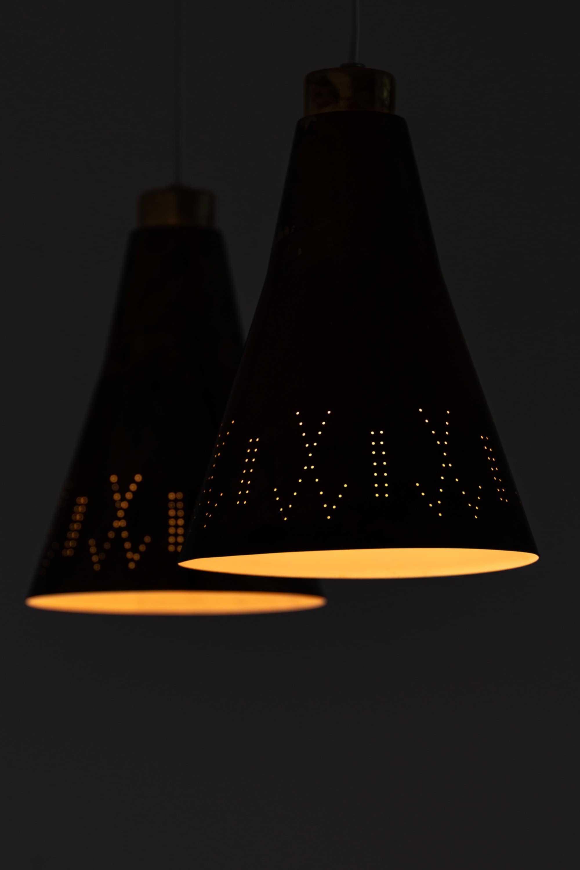 Each shade has a diameter of 19.5 cm (7.7 inches) and a height of 28 cm (11 inches), formed in a softly tapering conical shape characteristic of Tynell’s designs. The brass surfaces show subtle variations and markings, contributing to the overall patinated appearance. The lower sections of the shades are decorated with fine perforations arranged in a rhythmic pattern. When illuminated, these perforations emit small points of light, forming a decorative halo effect while the open base provides a warm, directed downward glow.