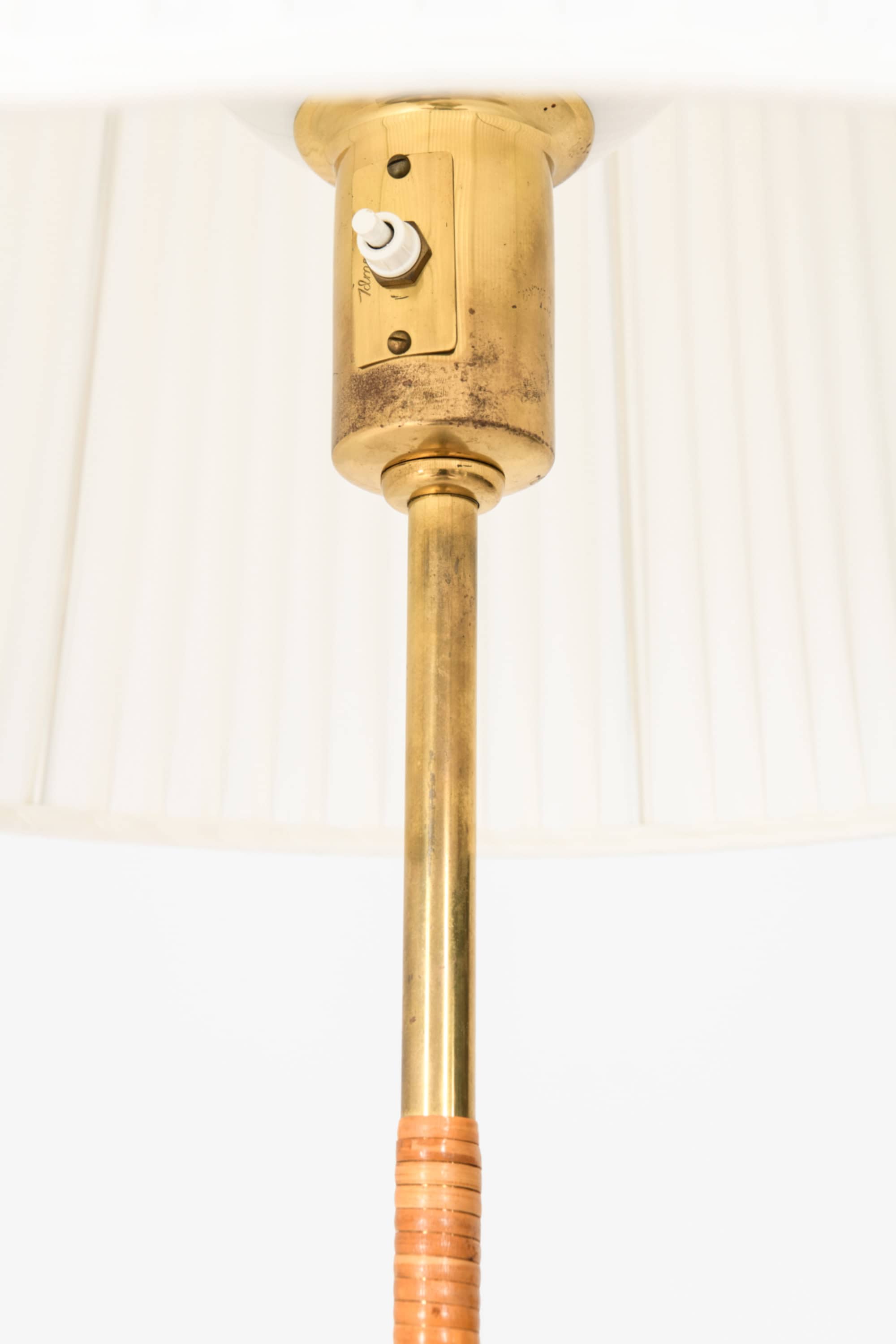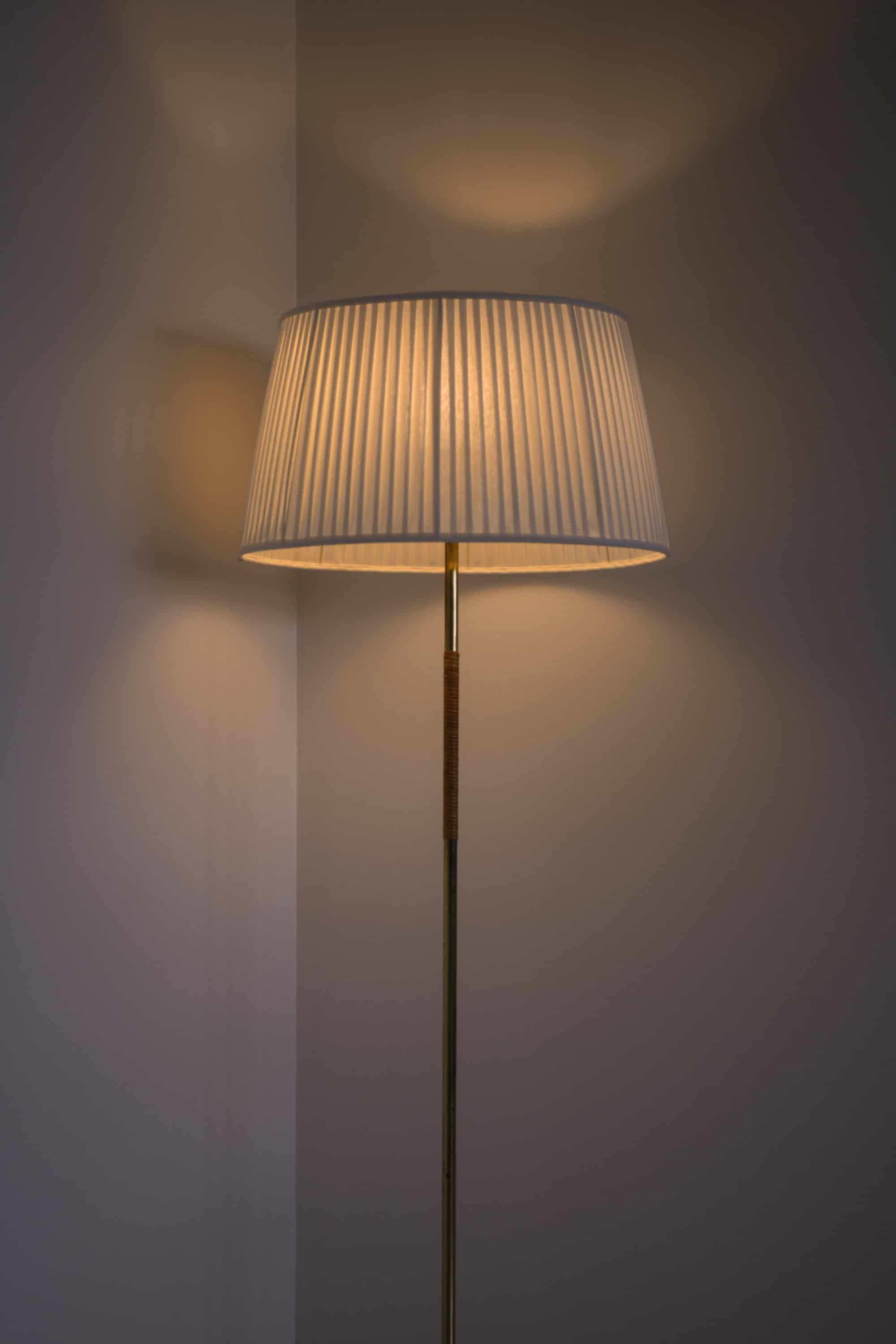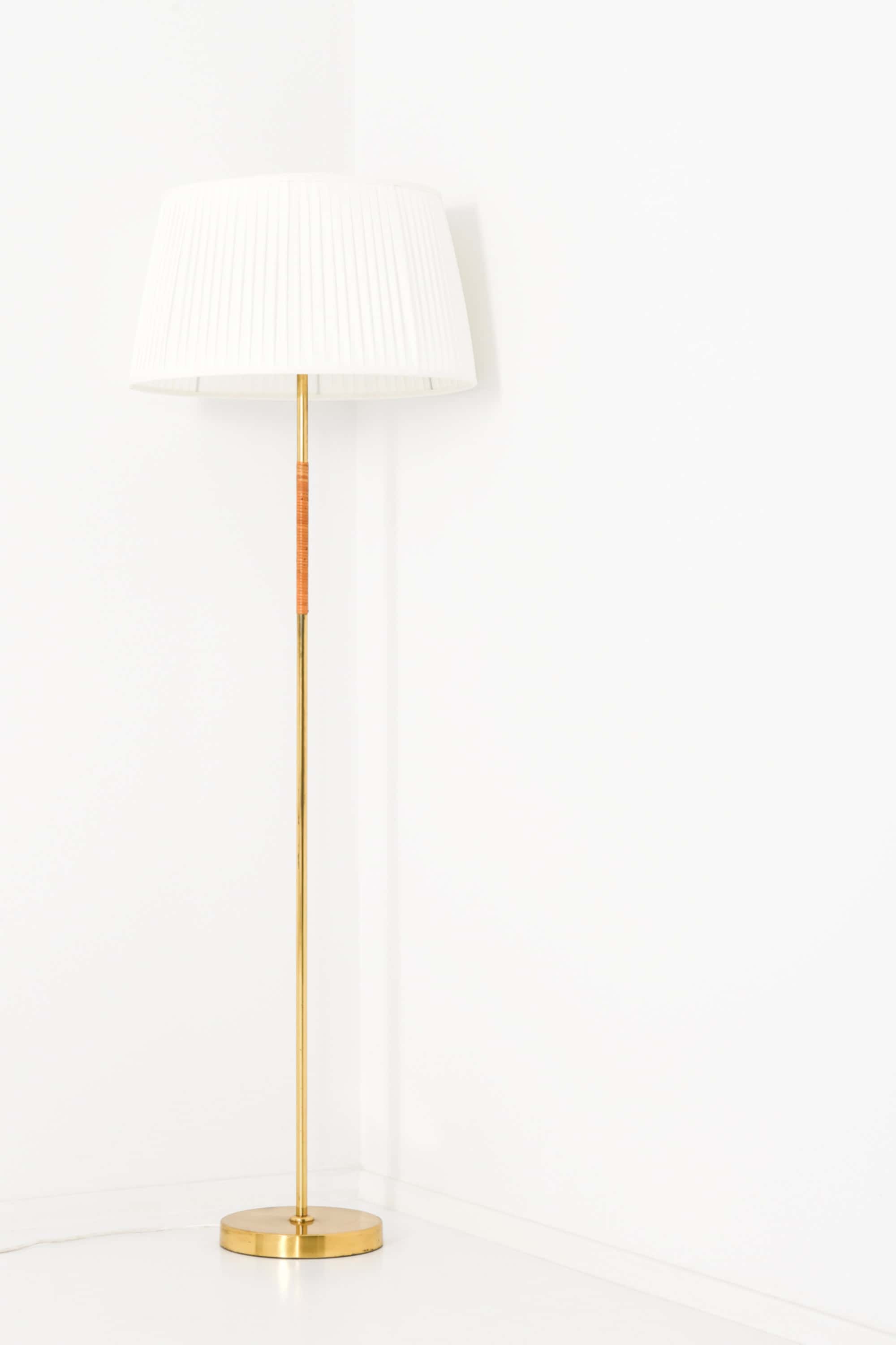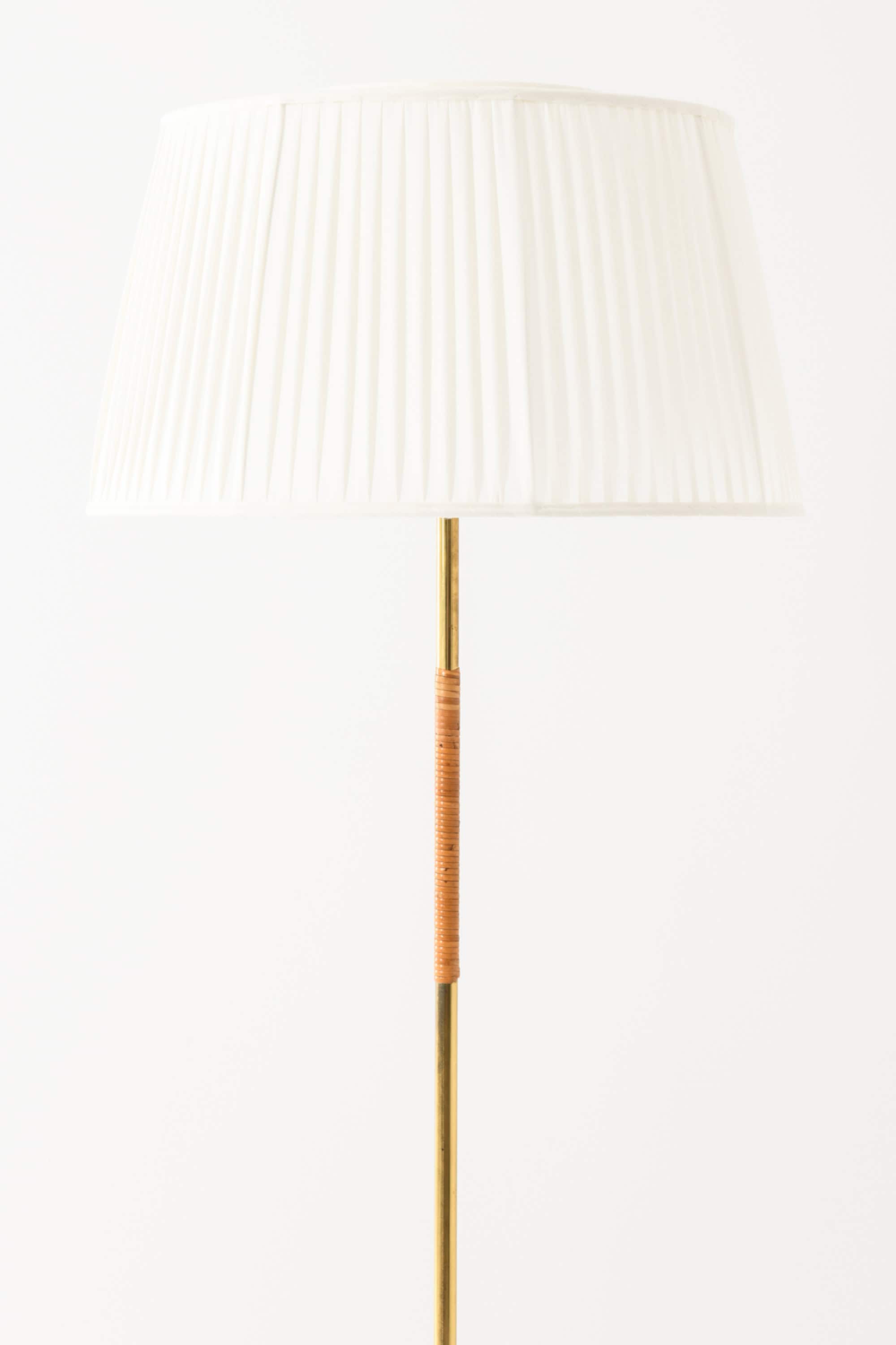 This very rare floor lamp was designed by Paavo Tynell in the 1950s and produced by Idman in Finland. The lamp is executed in brass with a circular weighted base, a slender vertical stem wrapped in cane at the midsection, an opaline glass diffuser, and a newly reupholstered pleated shade in white fabric. The combination of warm brass tones, natural cane, and soft textile creates a harmonious balance between material richness and understated elegance.