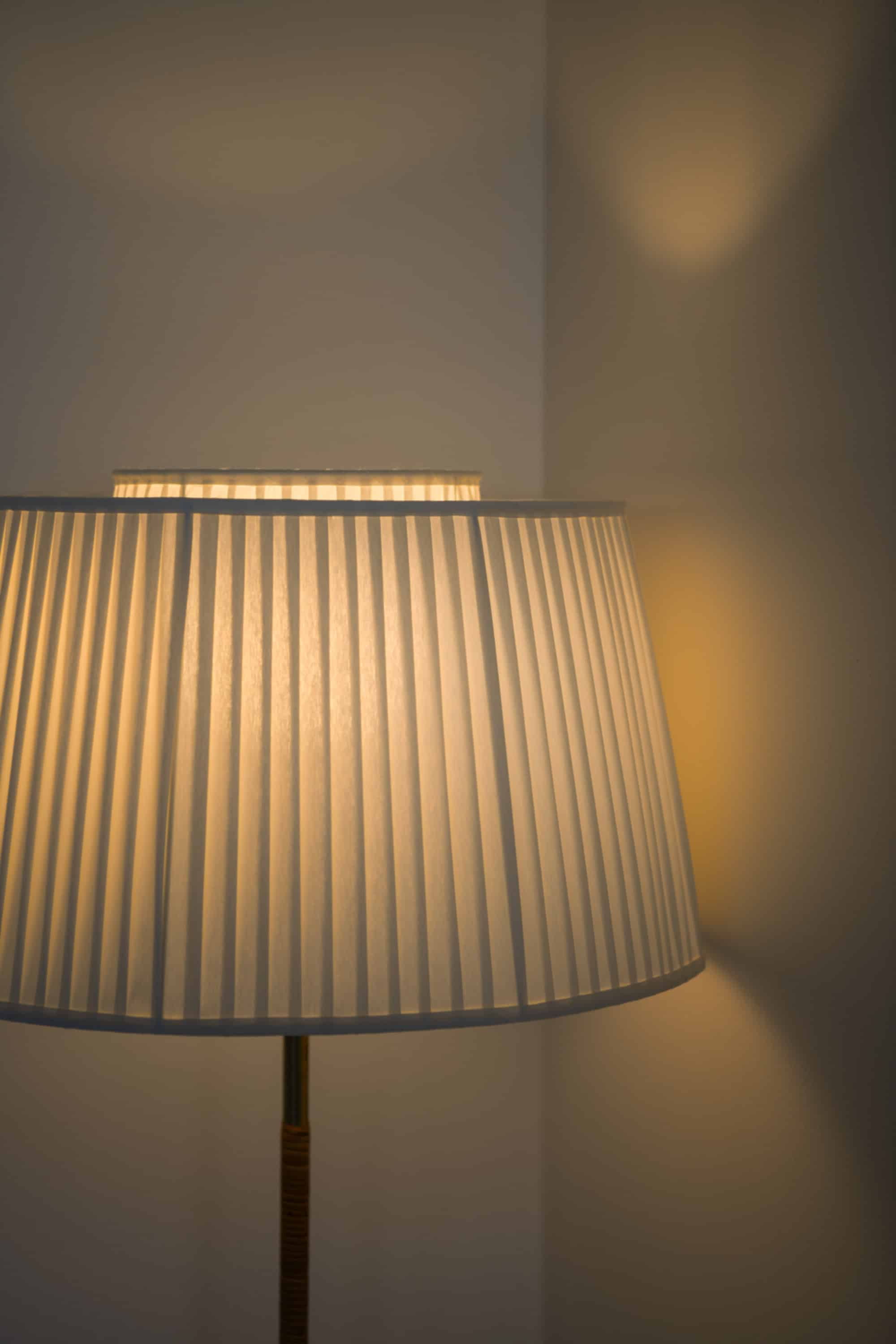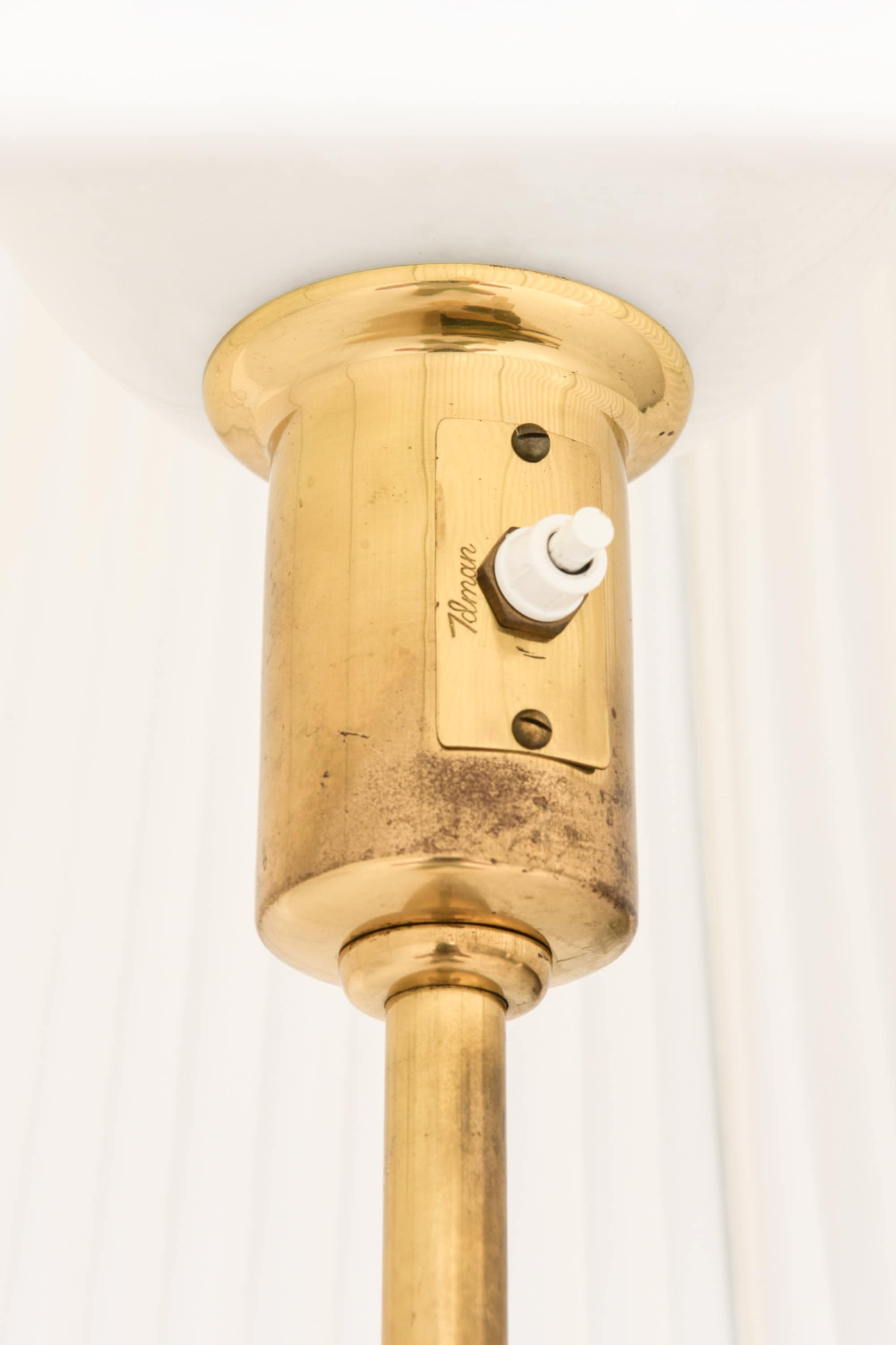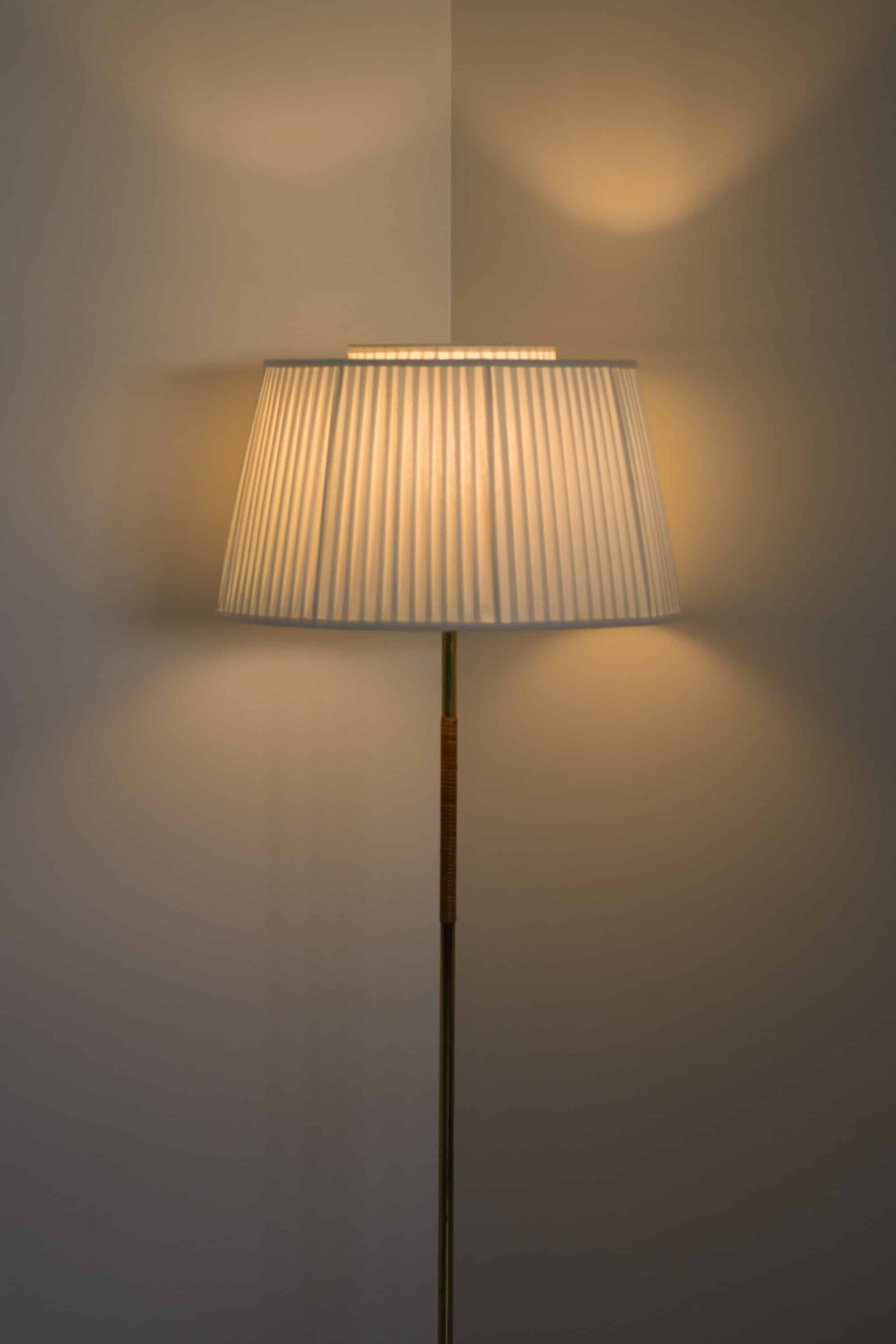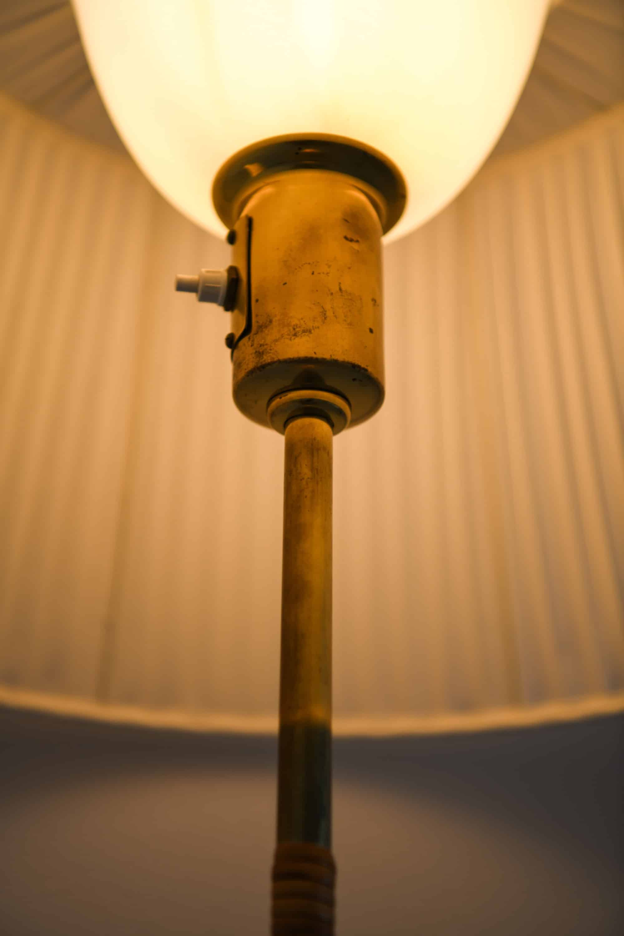 The design reflects Tynell’s distinctive approach to lighting, where functional clarity is combined with refined decorative details. The pleated shade diffuses light softly, producing a warm and atmospheric glow, while the opaline glass beneath ensures even illumination. The brass structure is finely proportioned, with the cane wrapping introducing a tactile and organic contrast to the polished metal. This interplay of natural and crafted materials is characteristic of Tynell’s work, which often sought to bring a humanizing warmth to modern interiors.
