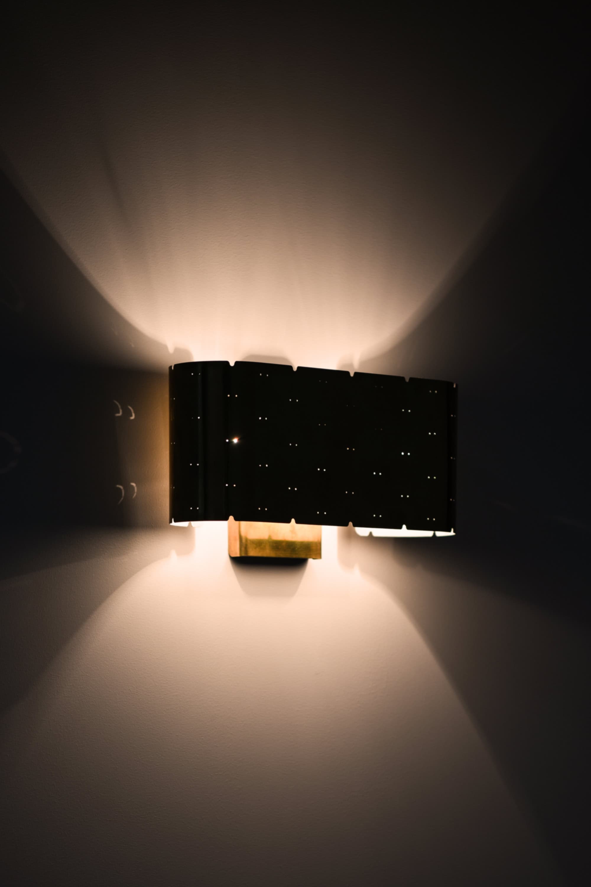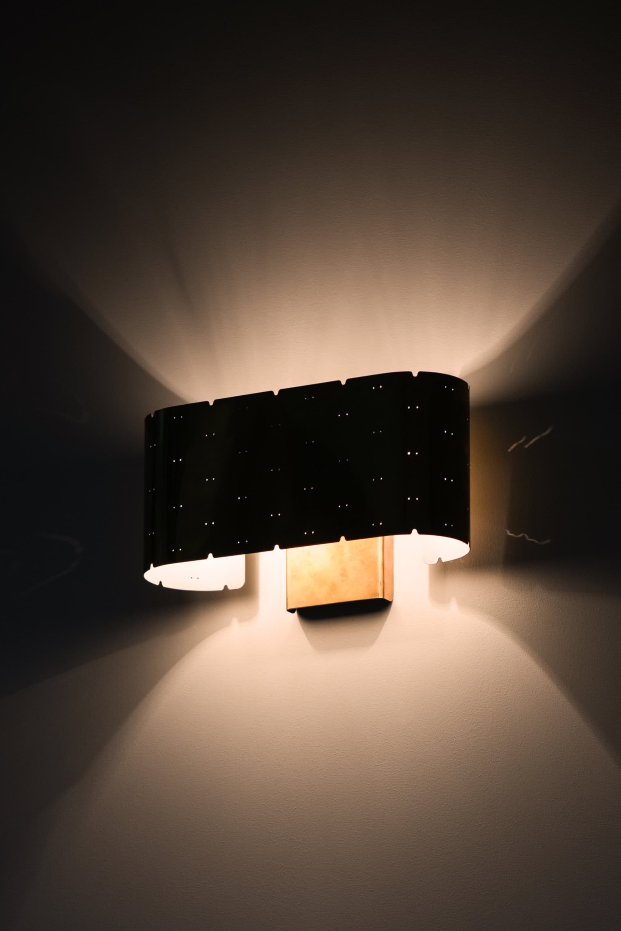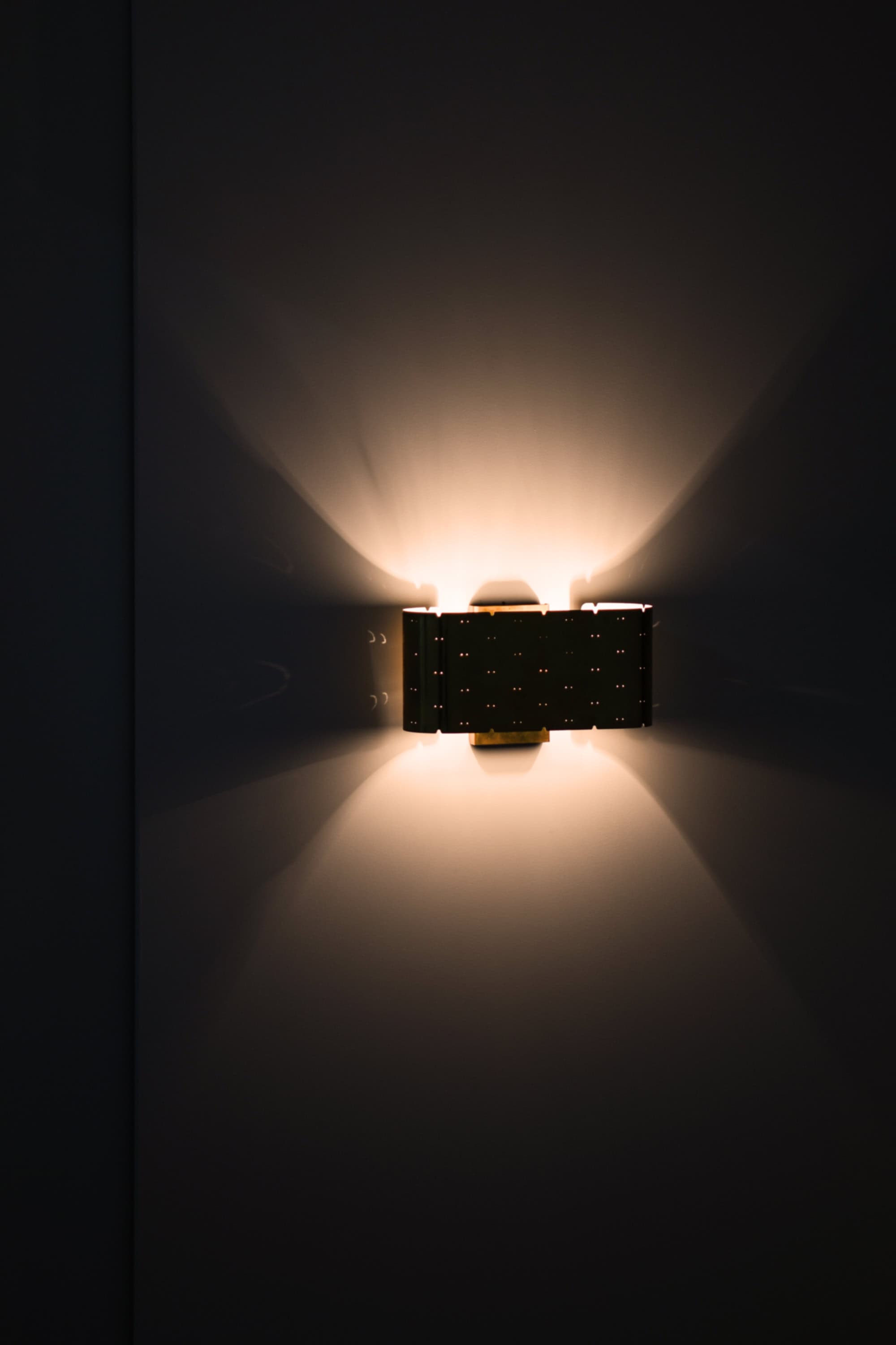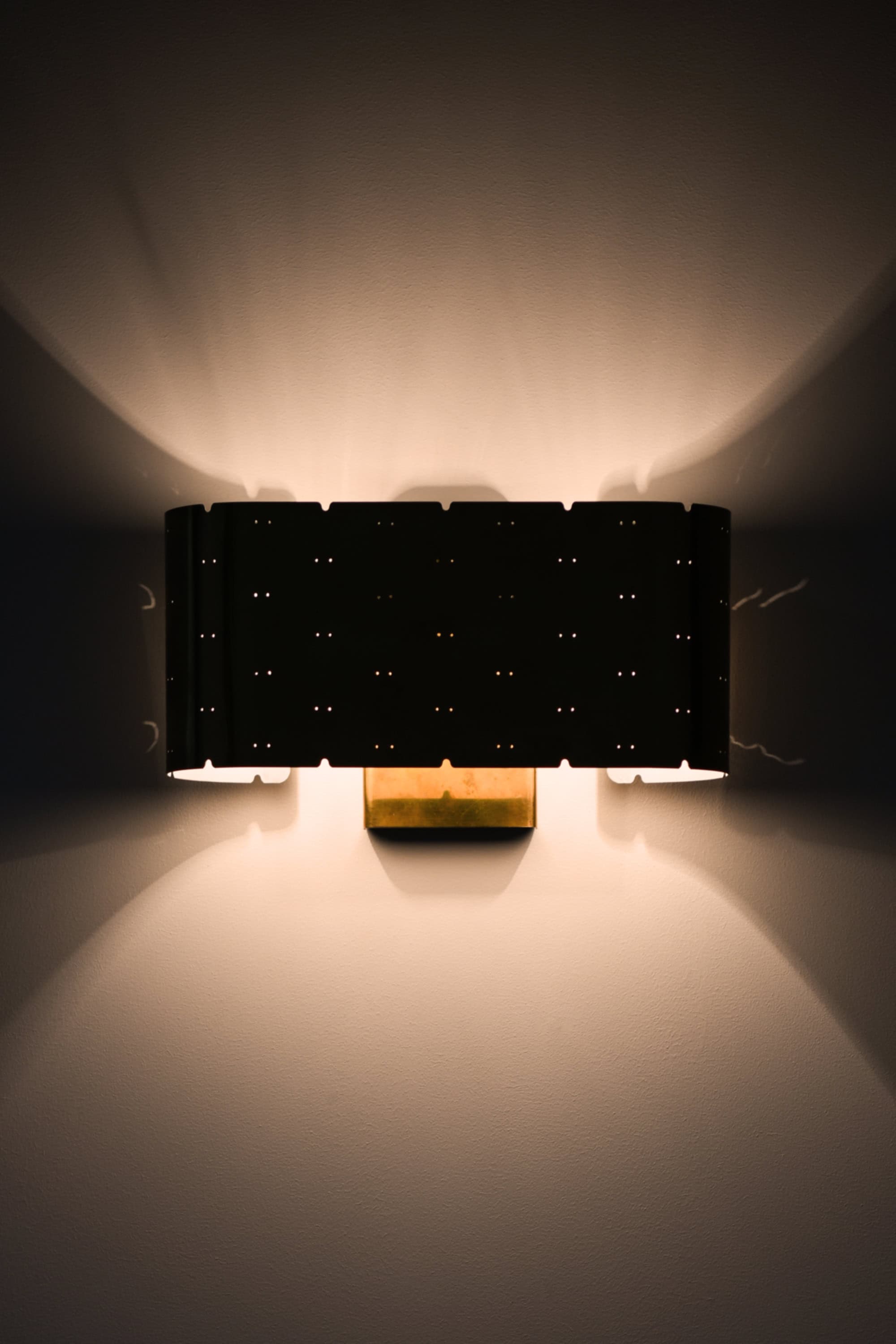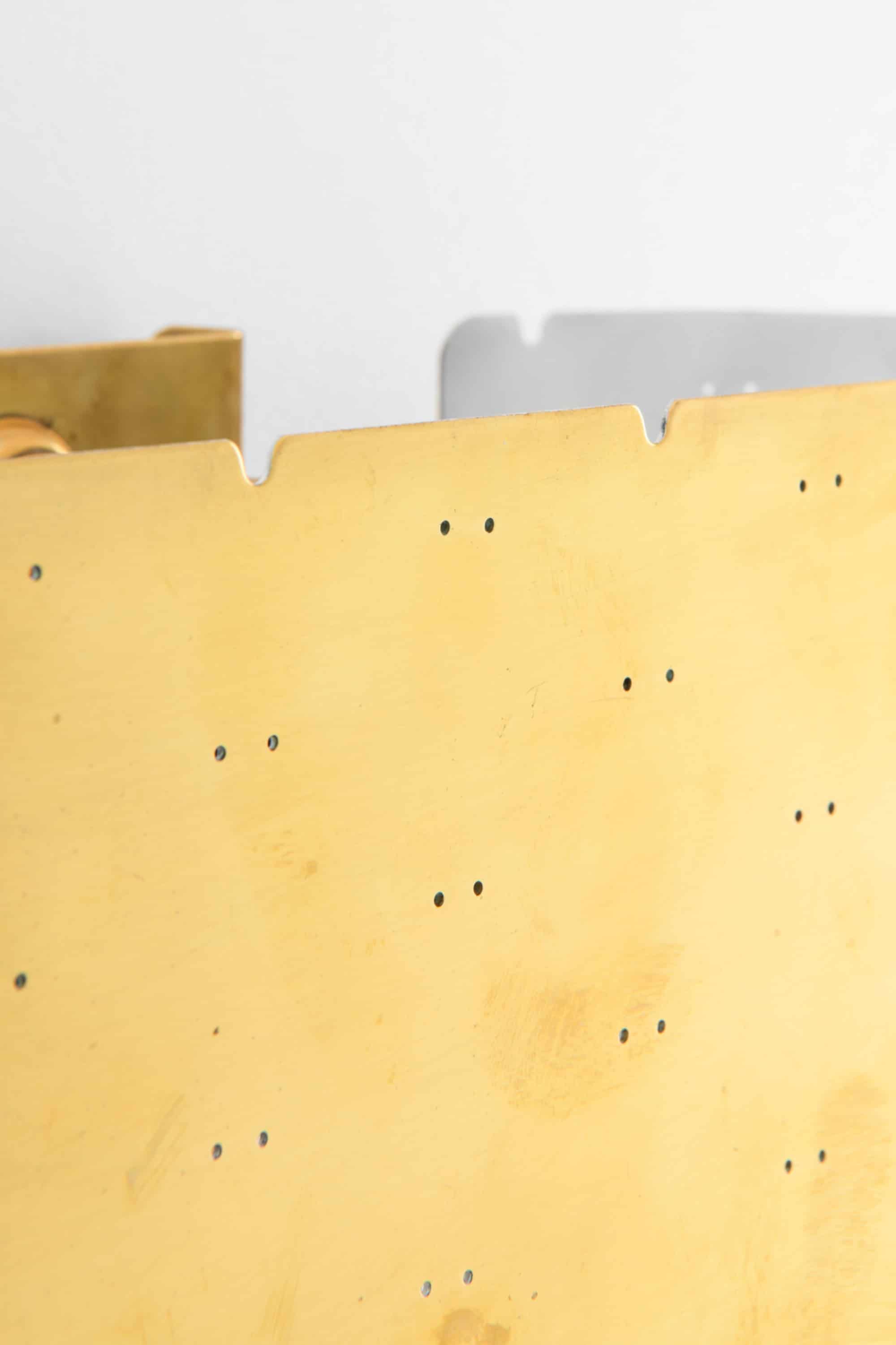 This very rare pair of wall lamps, model 9460, was designed by Paavo Tynell and produced by Idman in Finland during the 1950s. The lamps are crafted in solid brass, featuring Tynell’s signature combination of elegance and functional sophistication. The shades are formed as horizontally oriented, slightly curved brass panels with fine perforations distributed across the surface. These perforations create a delicate, star-like pattern of light when the lamps are illuminated, casting a soft, decorative glow onto the surrounding wall.