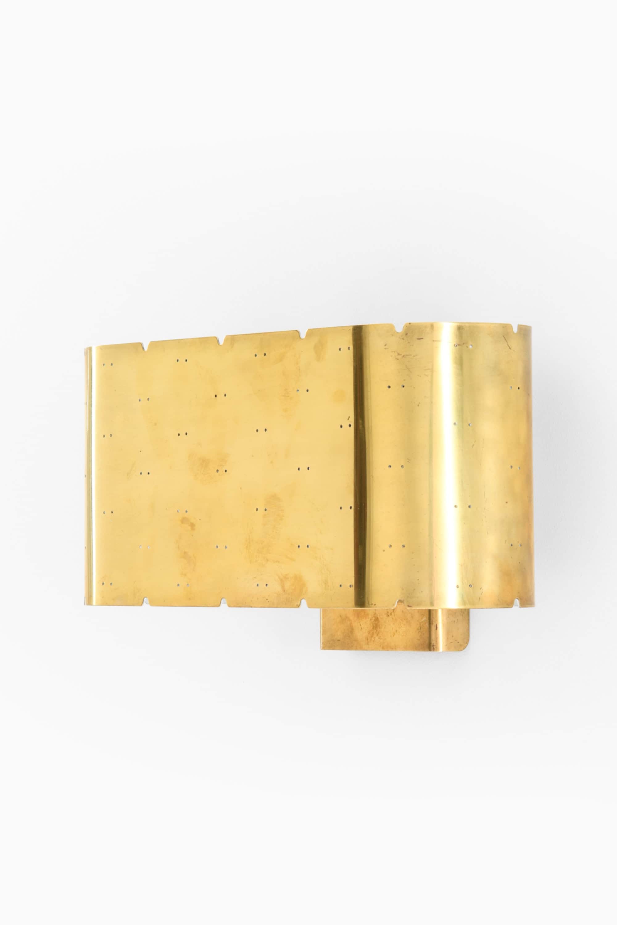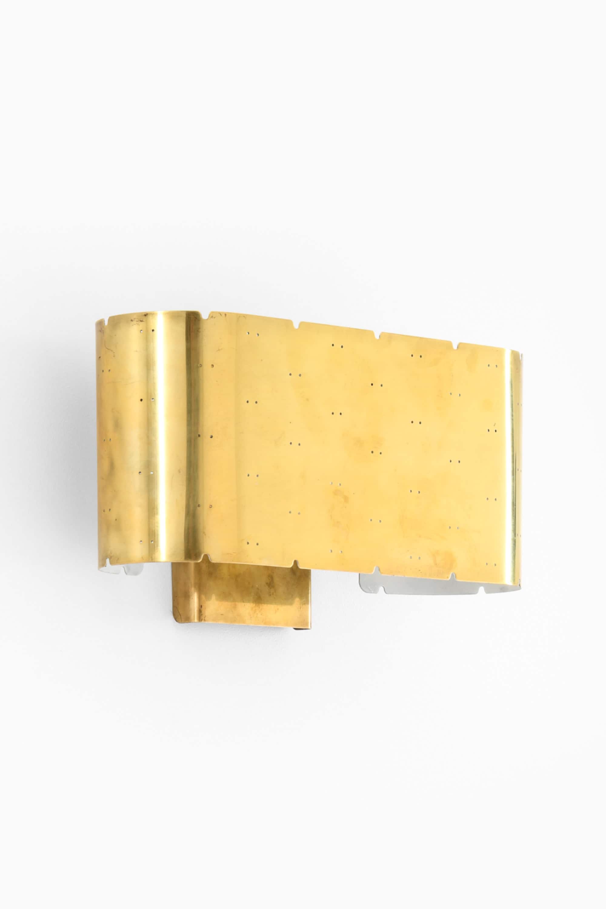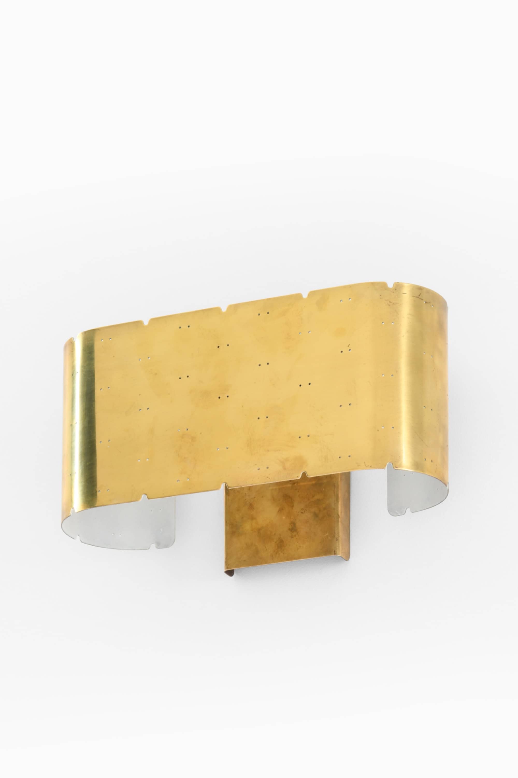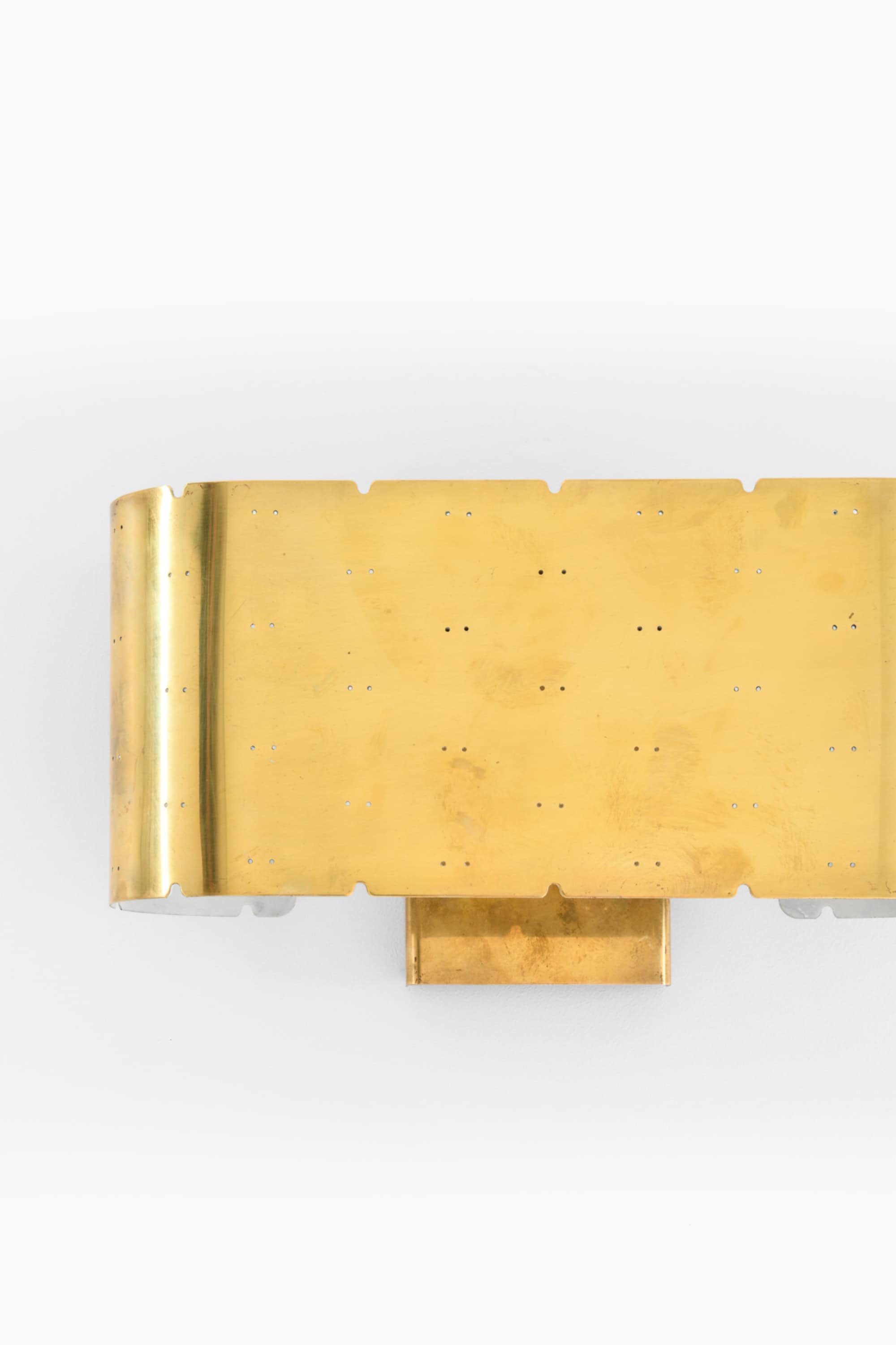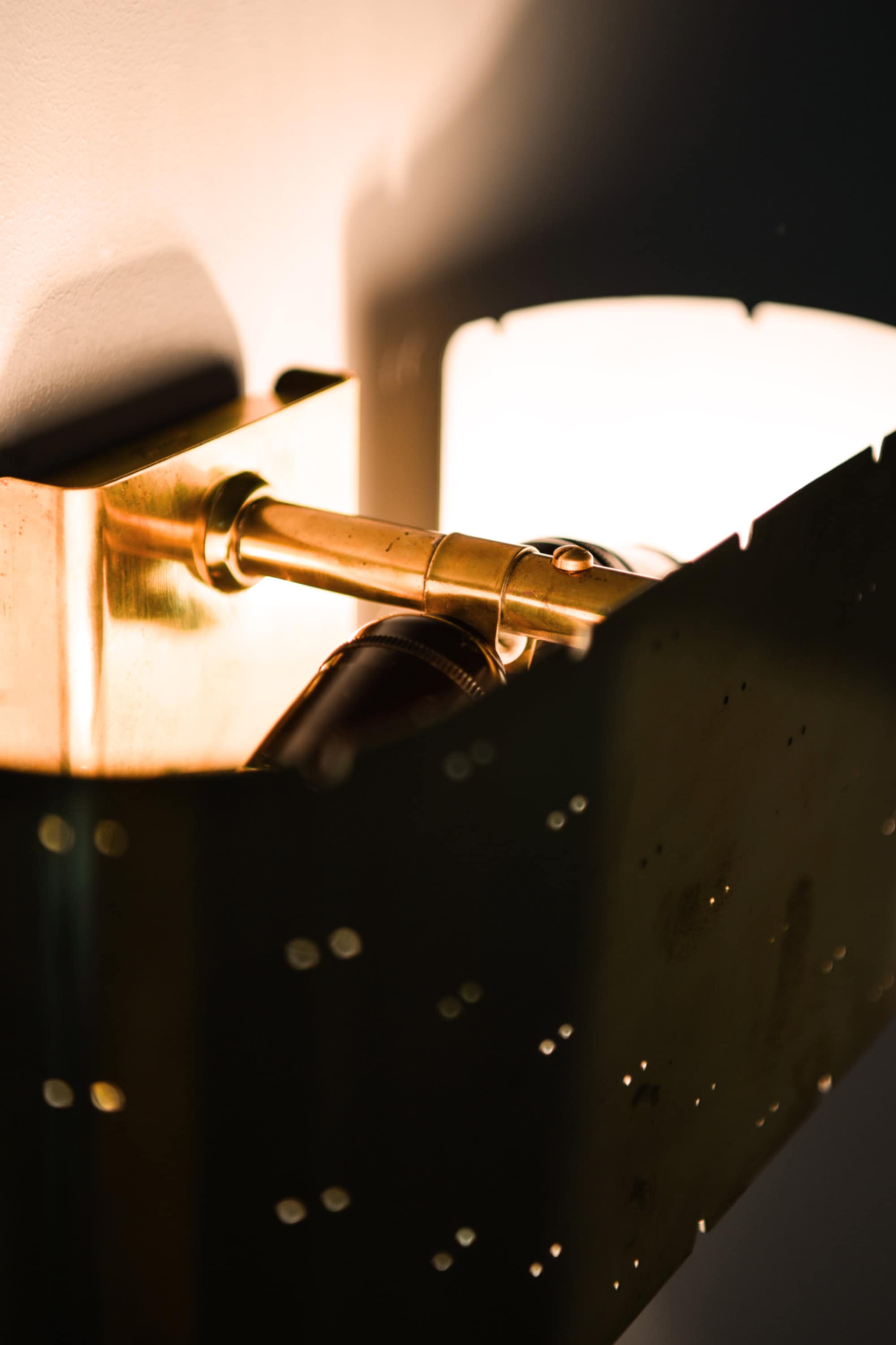This very rare pair of wall lamps, model 9460, was designed by Paavo Tynell and produced by Idman in Finland during the 1950s. The lamps are crafted in solid brass, featuring Tynell’s signature combination of elegance and functional sophistication. The shades are formed as horizontally oriented, slightly curved brass panels with fine perforations distributed across the surface. These perforations create a delicate, star-like pattern of light when the lamps are illuminated, casting a soft, decorative glow onto the surrounding wall.