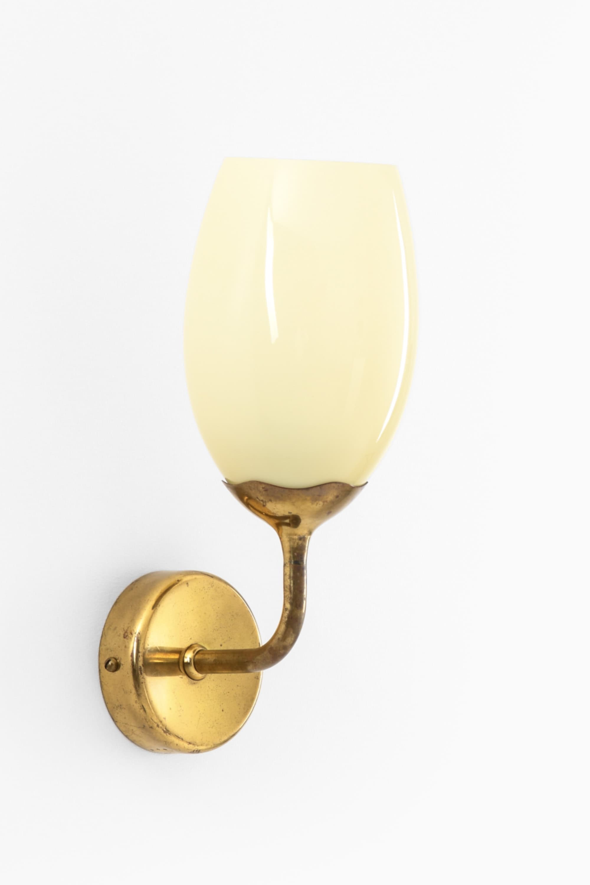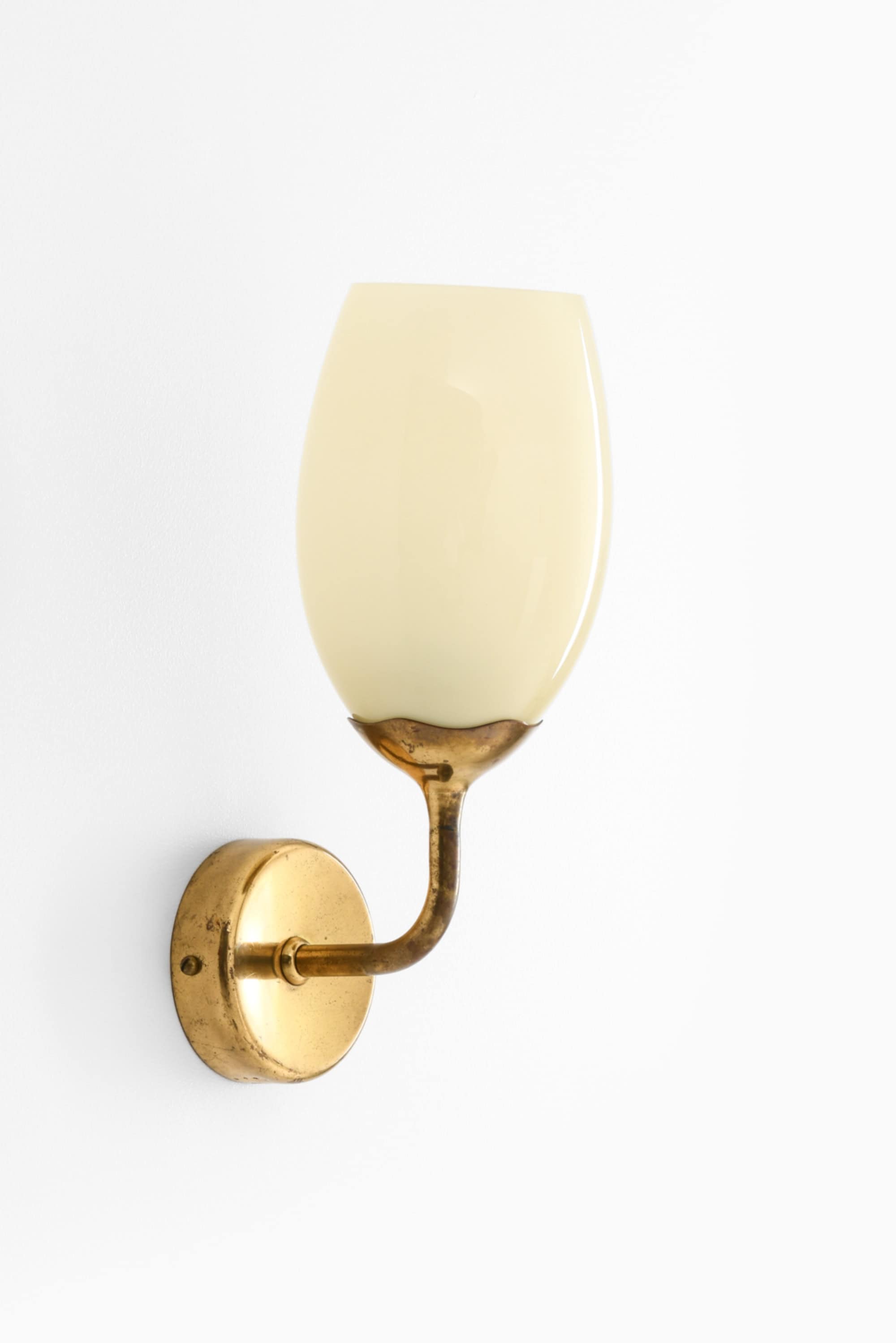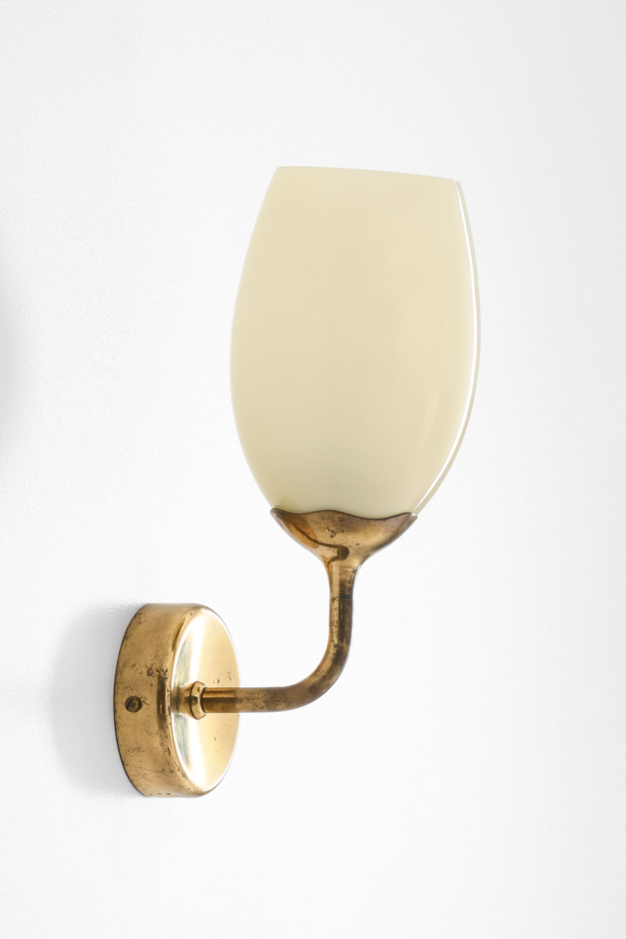 This pair of wall lamps, model 9447, was designed by Paavo Tynell and produced by Taito Oy in Finland during the 1940s. The construction combines brass and glass in a compact, refined form typical of Tynell’s early post-war lighting. The brass arm curves upward from a circular wall mount, supporting a tulip-shaped brass cup that holds the glass shade. The glass is softly opaline with a warm, cream-toned translucency, allowing a diffuse and even light when illuminated. The shade’s rounded contour contributes to a gentle silhouette that contrasts with the more structured metal elements.