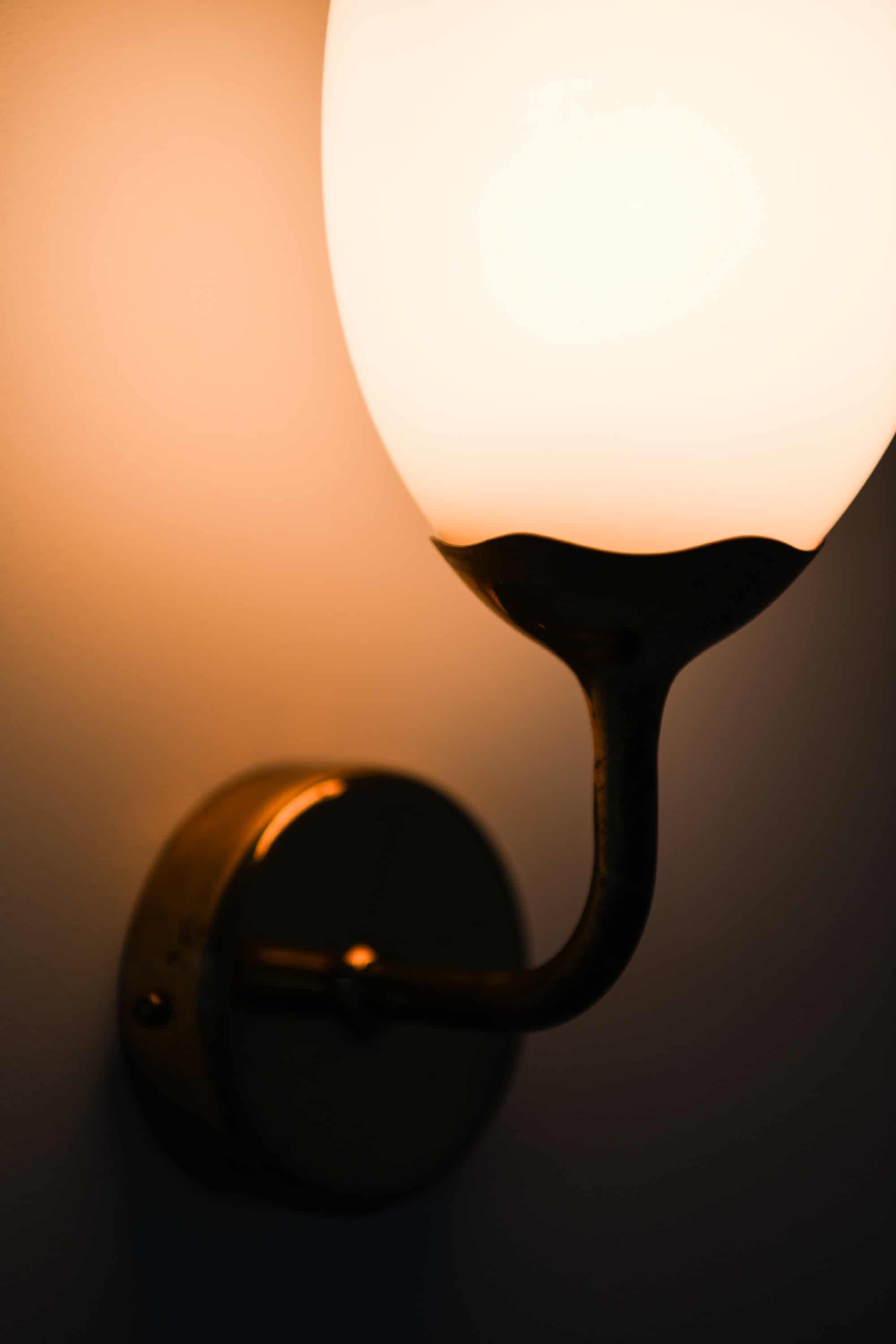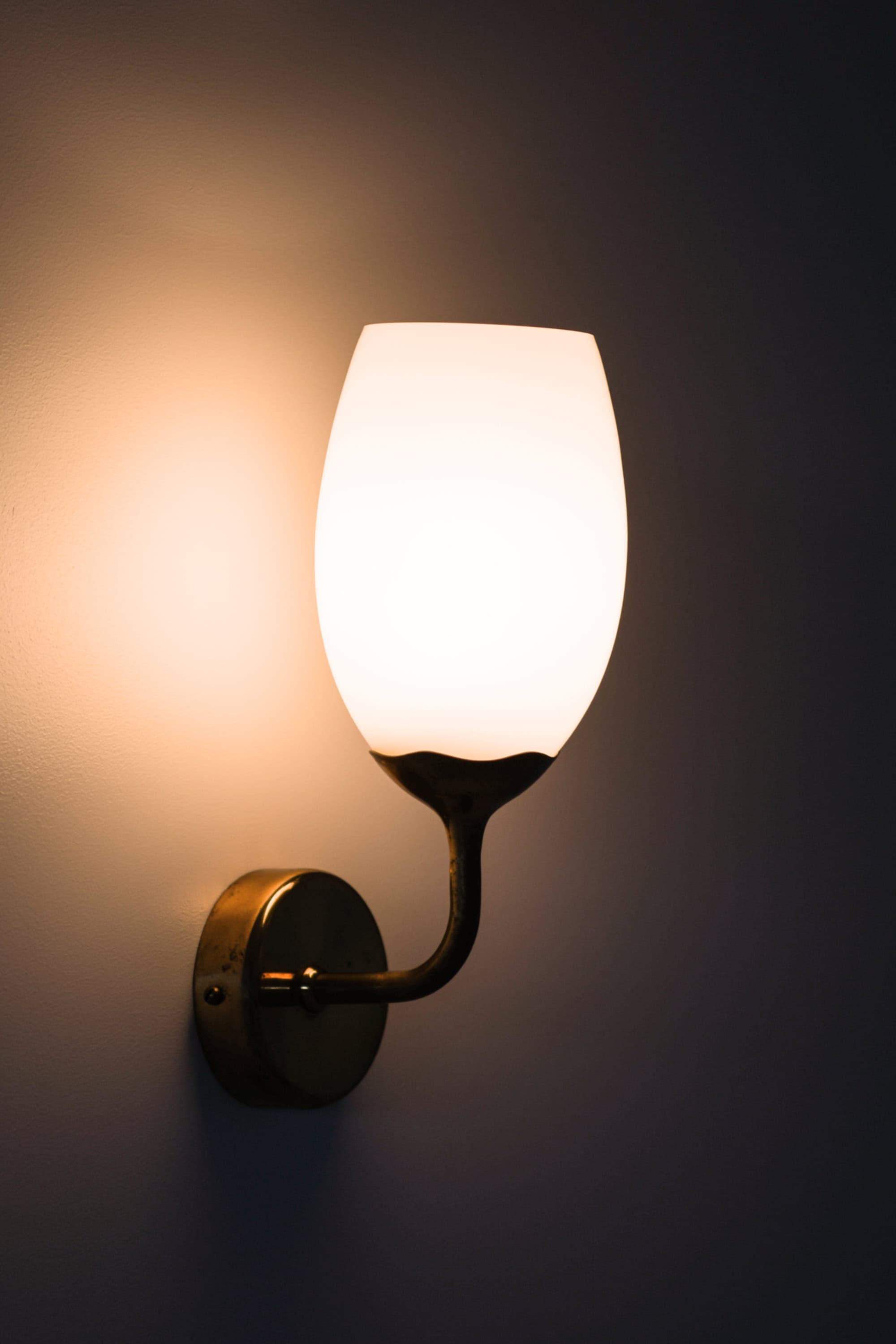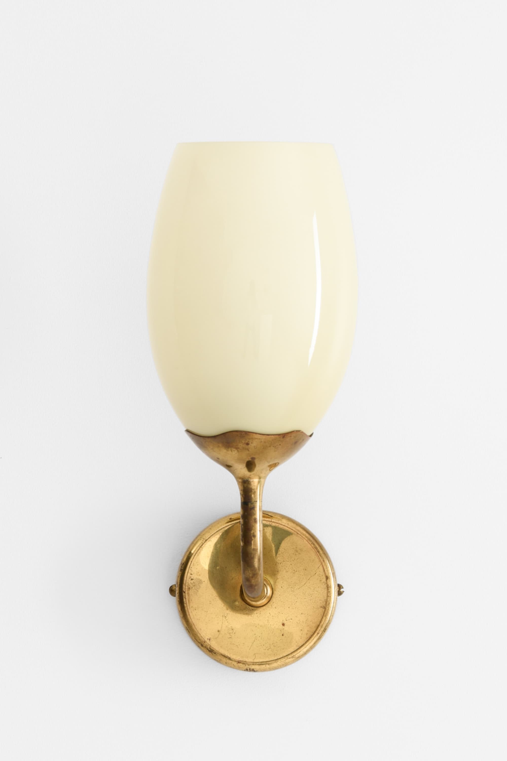 This pair of wall lamps, model 9447, was designed by Paavo Tynell and produced by Taito Oy in Finland during the 1940s. The construction combines brass and glass in a compact, refined form typical of Tynell’s early post-war lighting. The brass arm curves upward from a circular wall mount, supporting a tulip-shaped brass cup that holds the glass shade. The glass is softly opaline with a warm, cream-toned translucency, allowing a diffuse and even light when illuminated. The shade’s rounded contour contributes to a gentle silhouette that contrasts with the more structured metal elements.