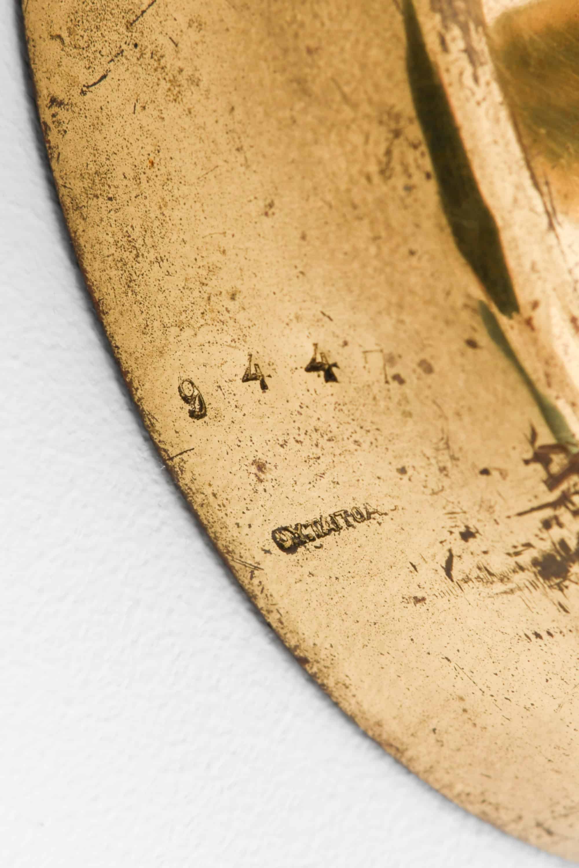 The brass components show a naturally aged surface with patina, visible in both the wall plate and the curved stem. This surface character is consistent with original 1940s production and aligns with Tynell’s use of warm metals and subtle detailing. The underside of the brass mount is stamped, marking the model number 9447 and the TAITO imprint, reflecting the manufacturer’s high-quality craftsmanship and the precision of Finnish lighting production of that period.