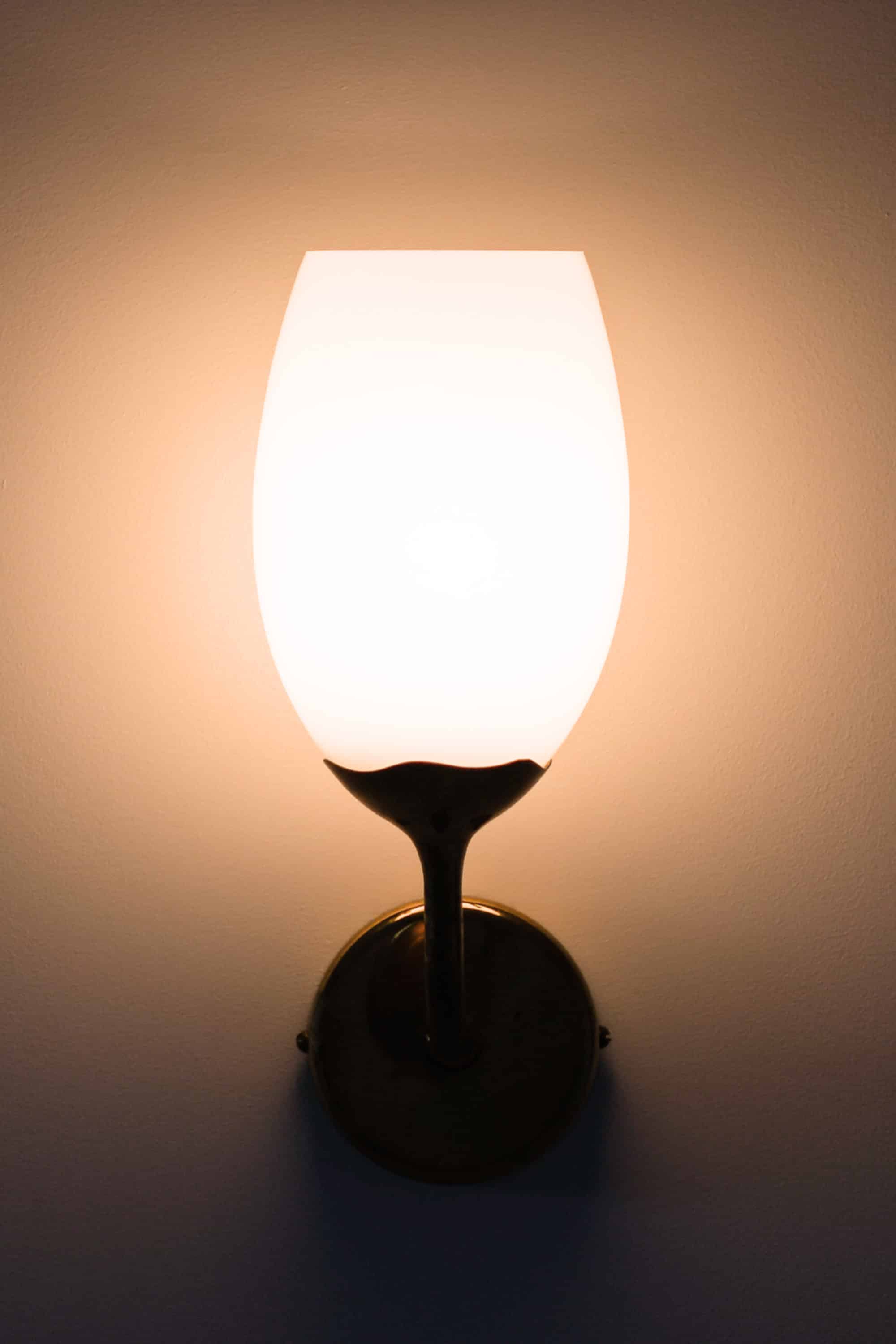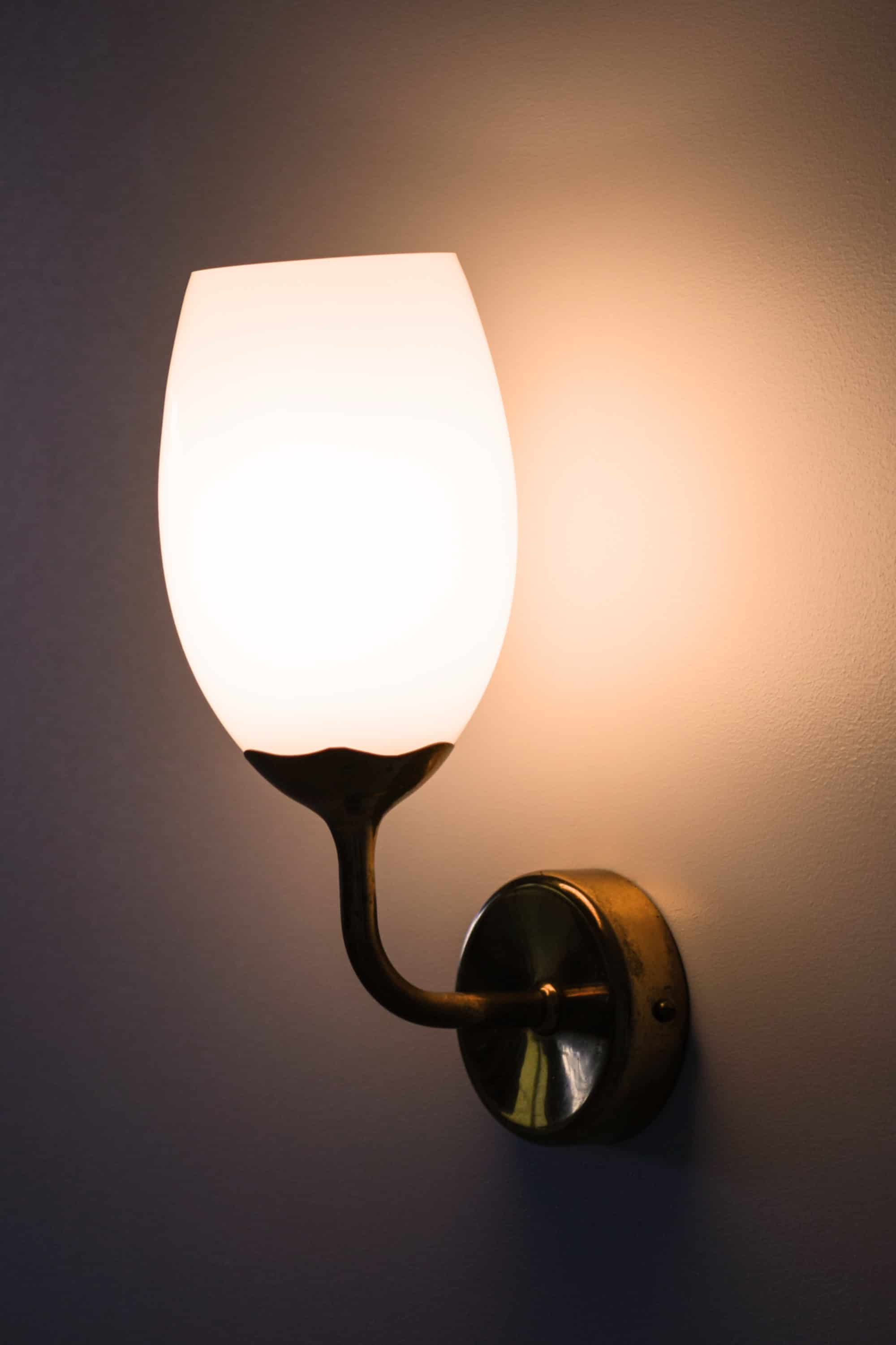 The lamps are in good vintage condition with small signs of usage. The brass surfaces show expected wear, minor marks, and patina, while the glass shades are clean and retain their original opaline finish. These signs of age are consistent with authentic mid-century fixtures and do not affect structural integrity or function.