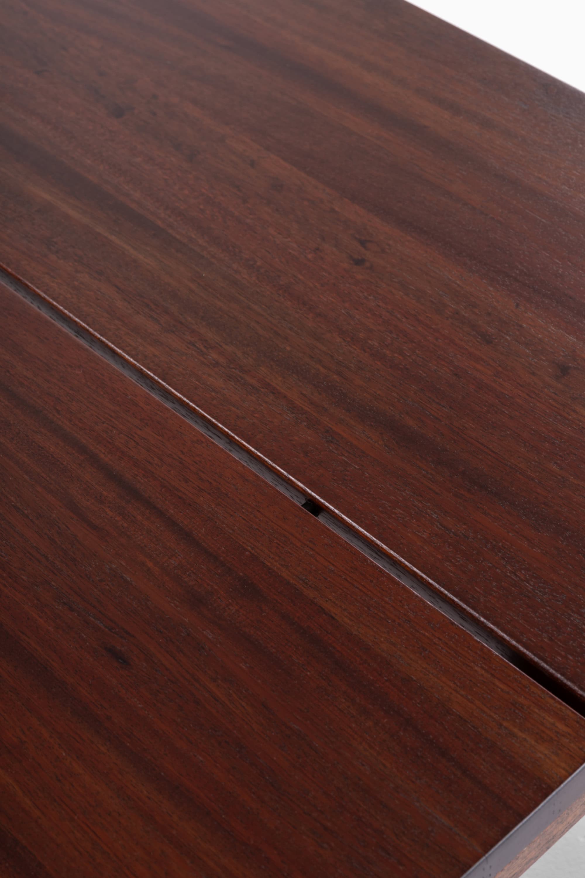 The table is constructed in solid hardwood with a deep reddish-brown tone and a dense, finely figured grain. The surface has been fully restored, revealing the natural variation of the wood with subtle darker streaks and tonal transitions across the tabletop and structural elements. The finish emphasizes the organic qualities of the material while maintaining a smooth and even surface. The color ranges from dark walnut brown to warmer reddish hues depending on the orientation of the grain and the direction of light.