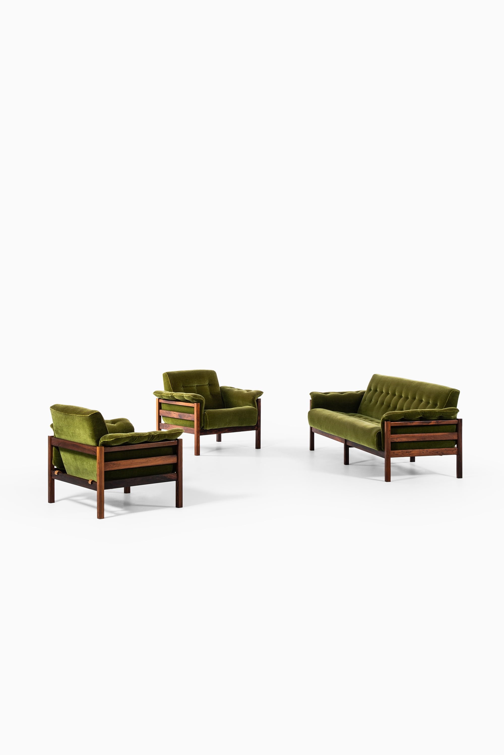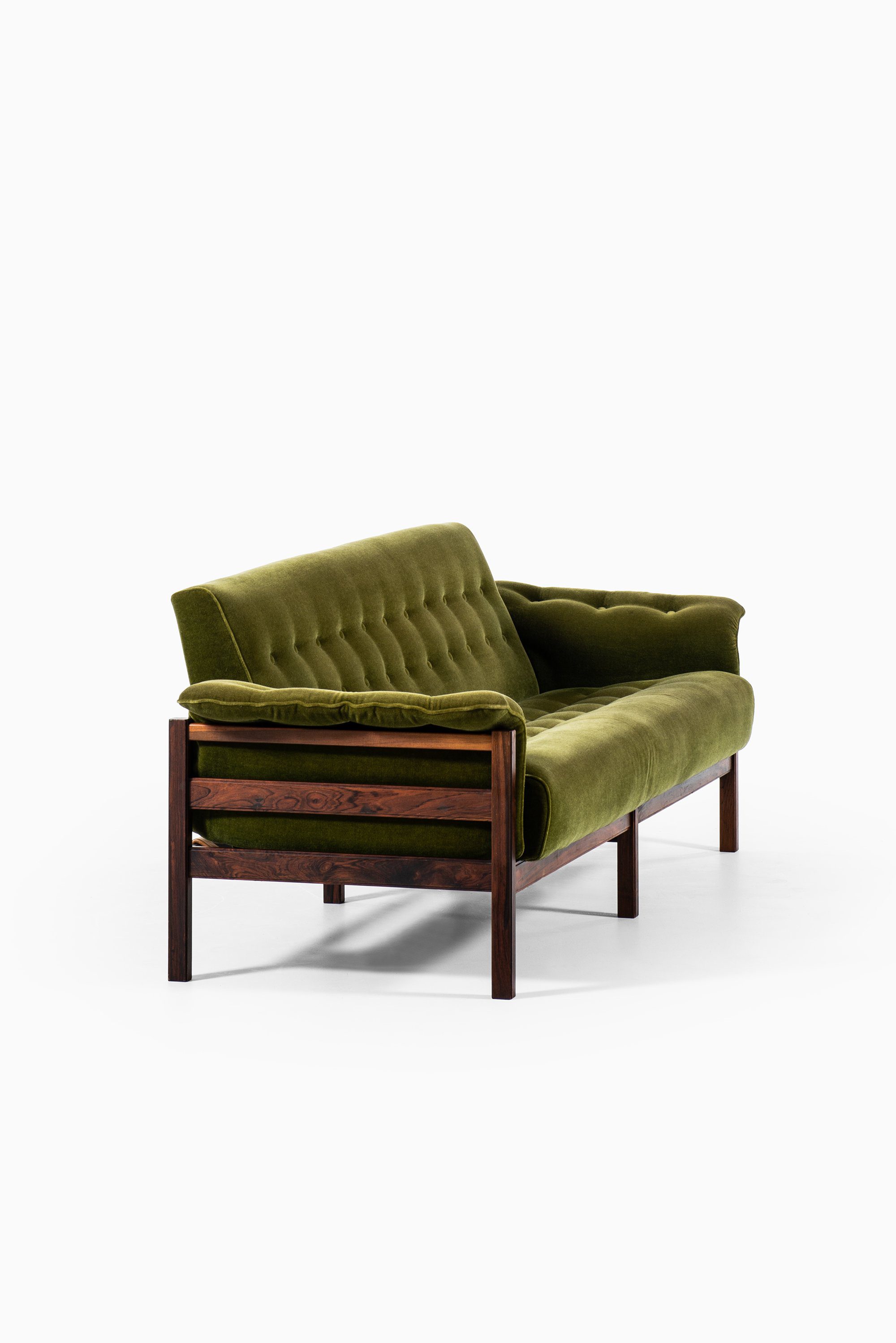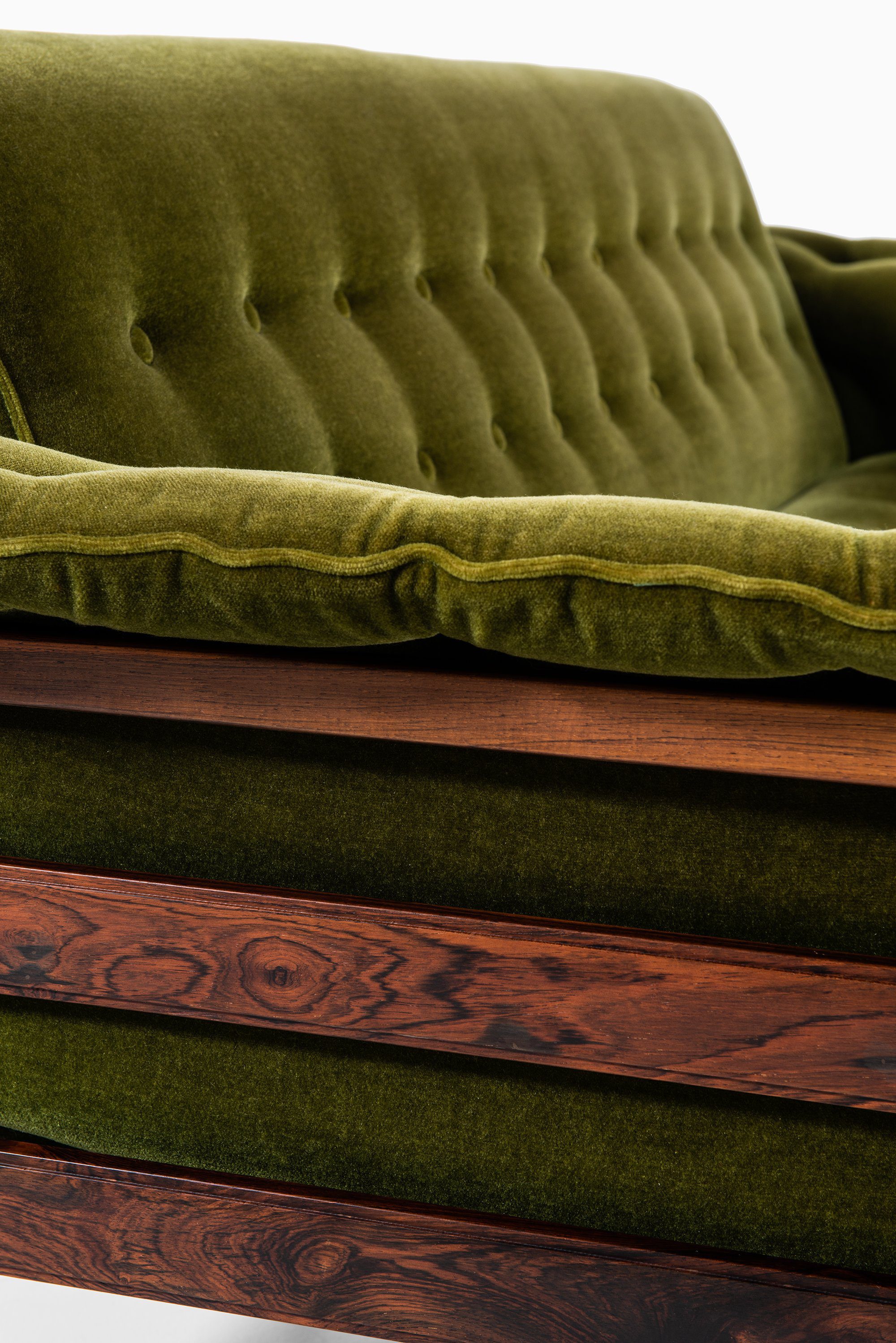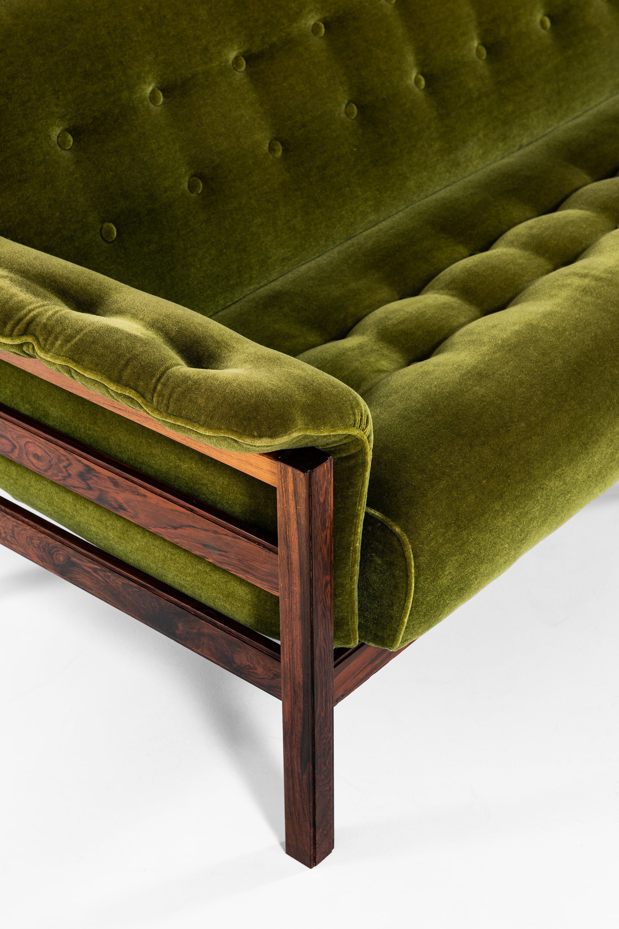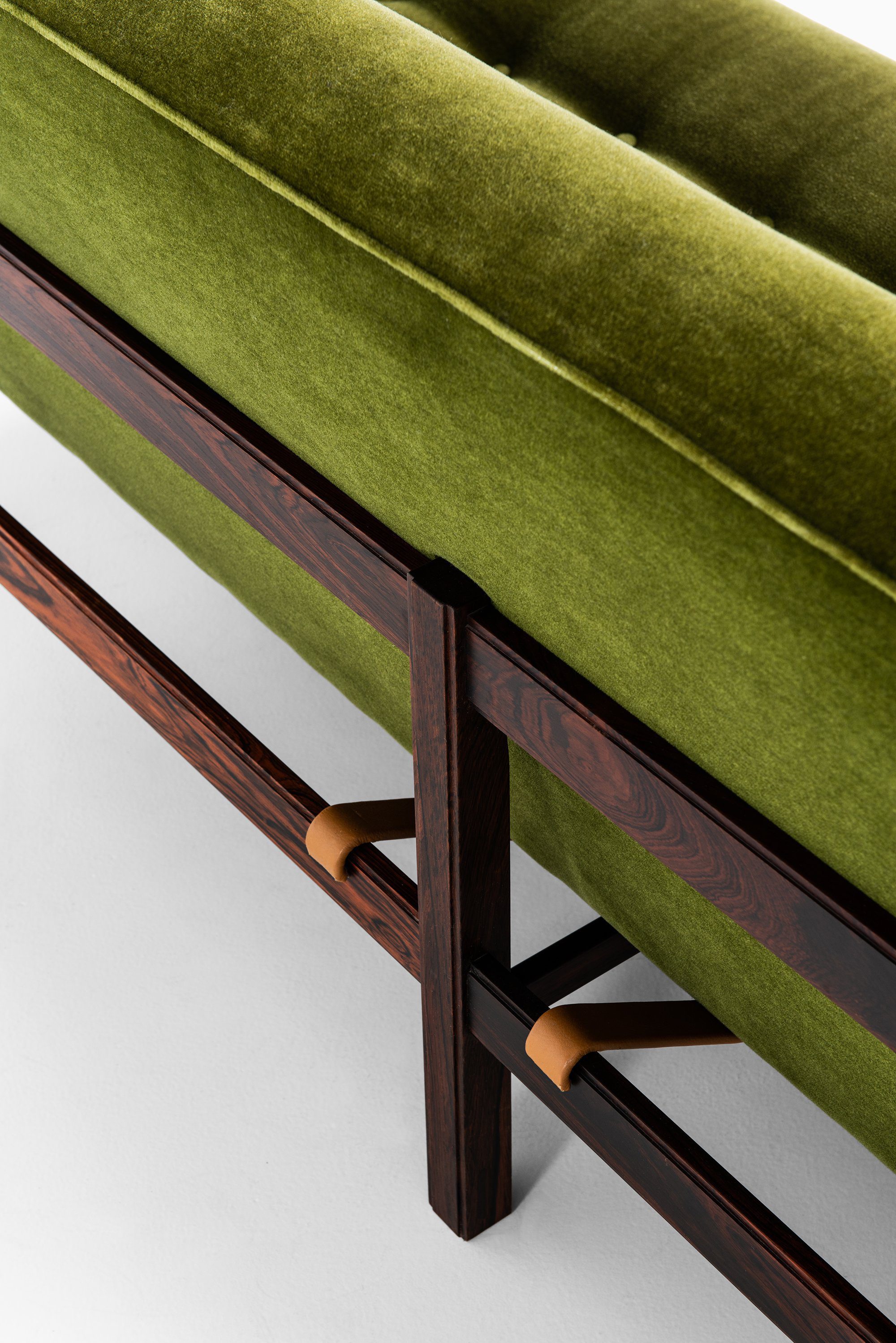 The sofa features a solid rosewood frame with a rich, deep grain that gives the piece both strength and visual warmth. The upholstery is original, covered in an elegant olive-green velvet that retains its soft texture and depth of color. The seat and back are deeply tufted, creating a structured yet inviting surface, while the rolled armrests soften the geometric silhouette. The combination of materials—rosewood, velvet, and leather detailing—reflects Lafer’s signature attention to tactile quality and visual balance.