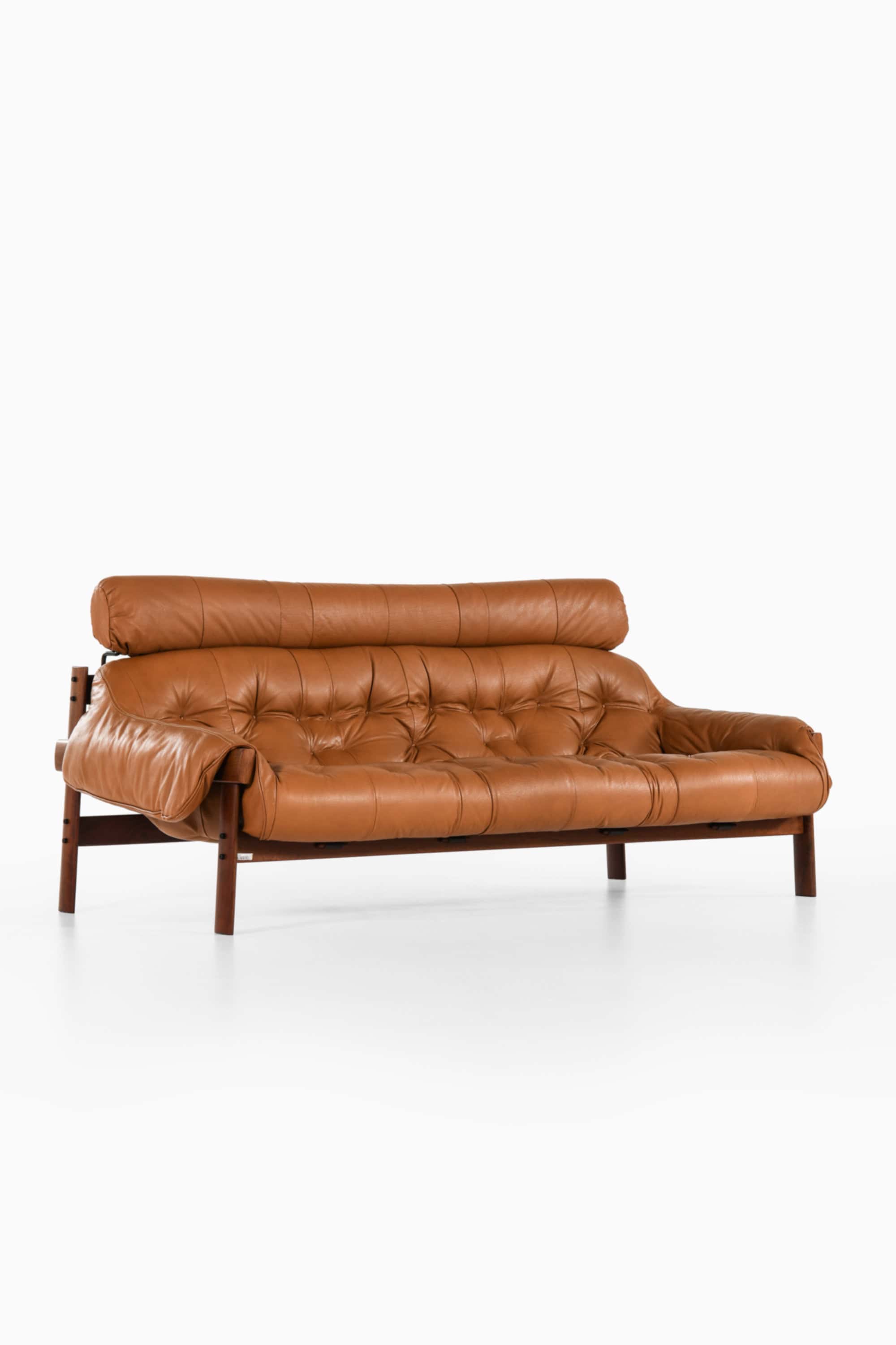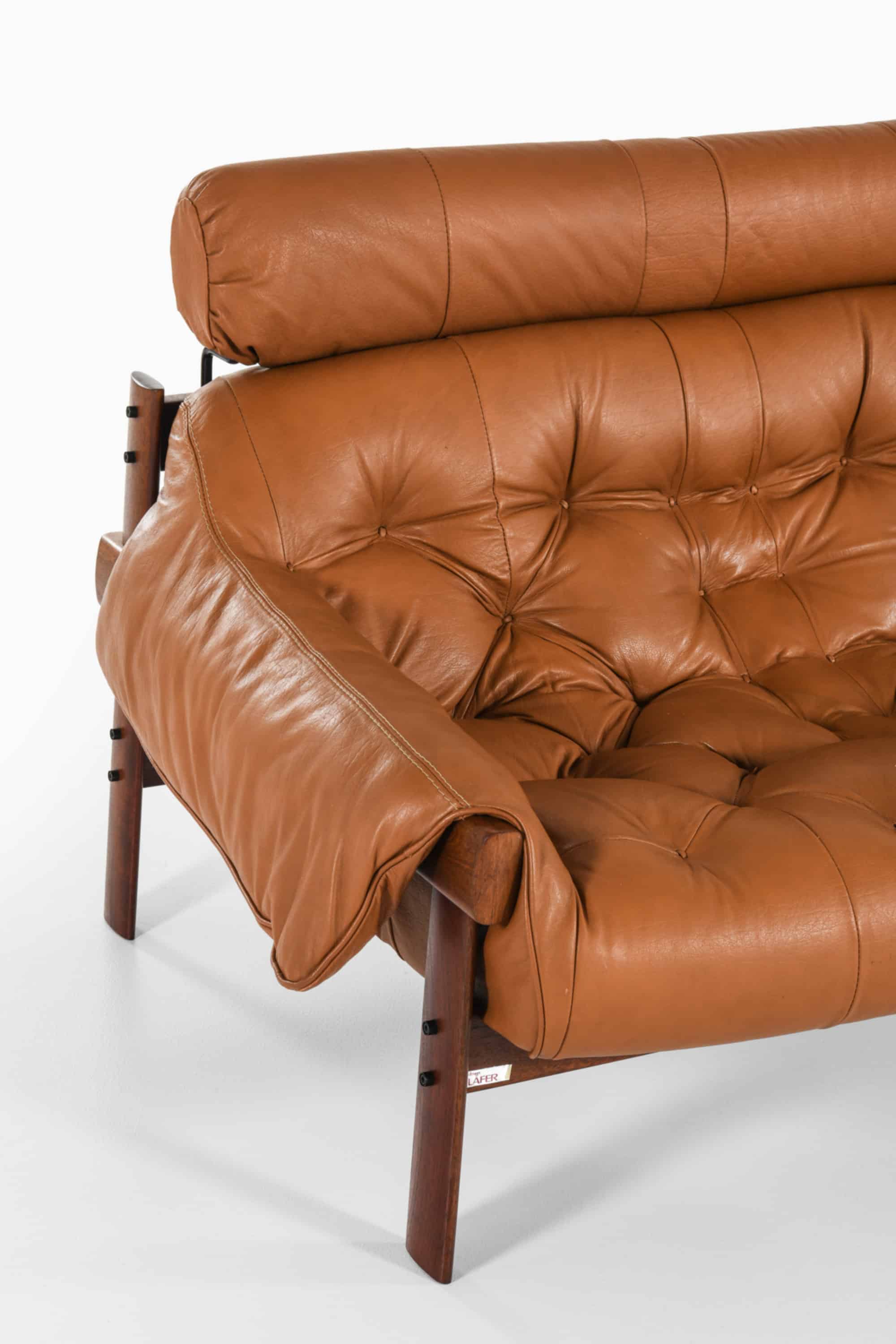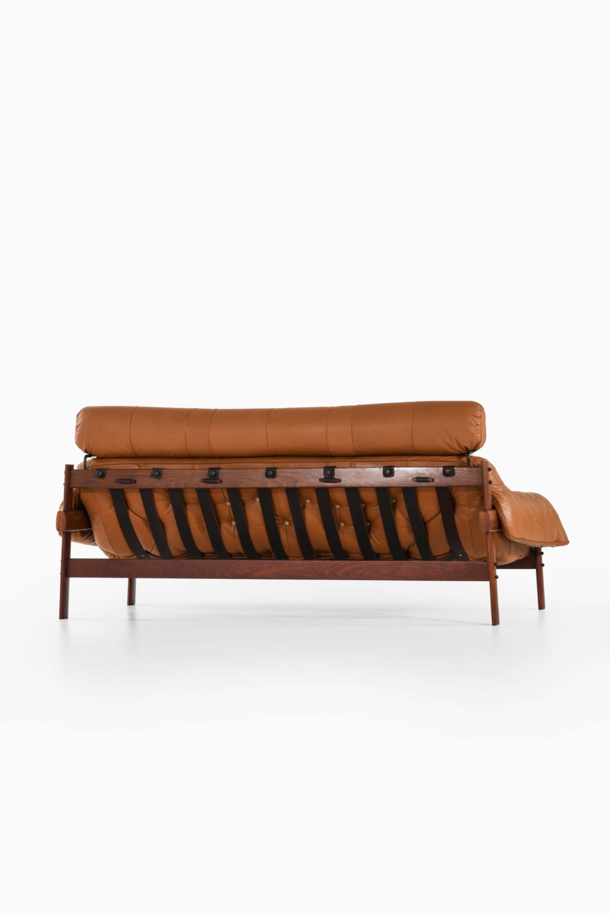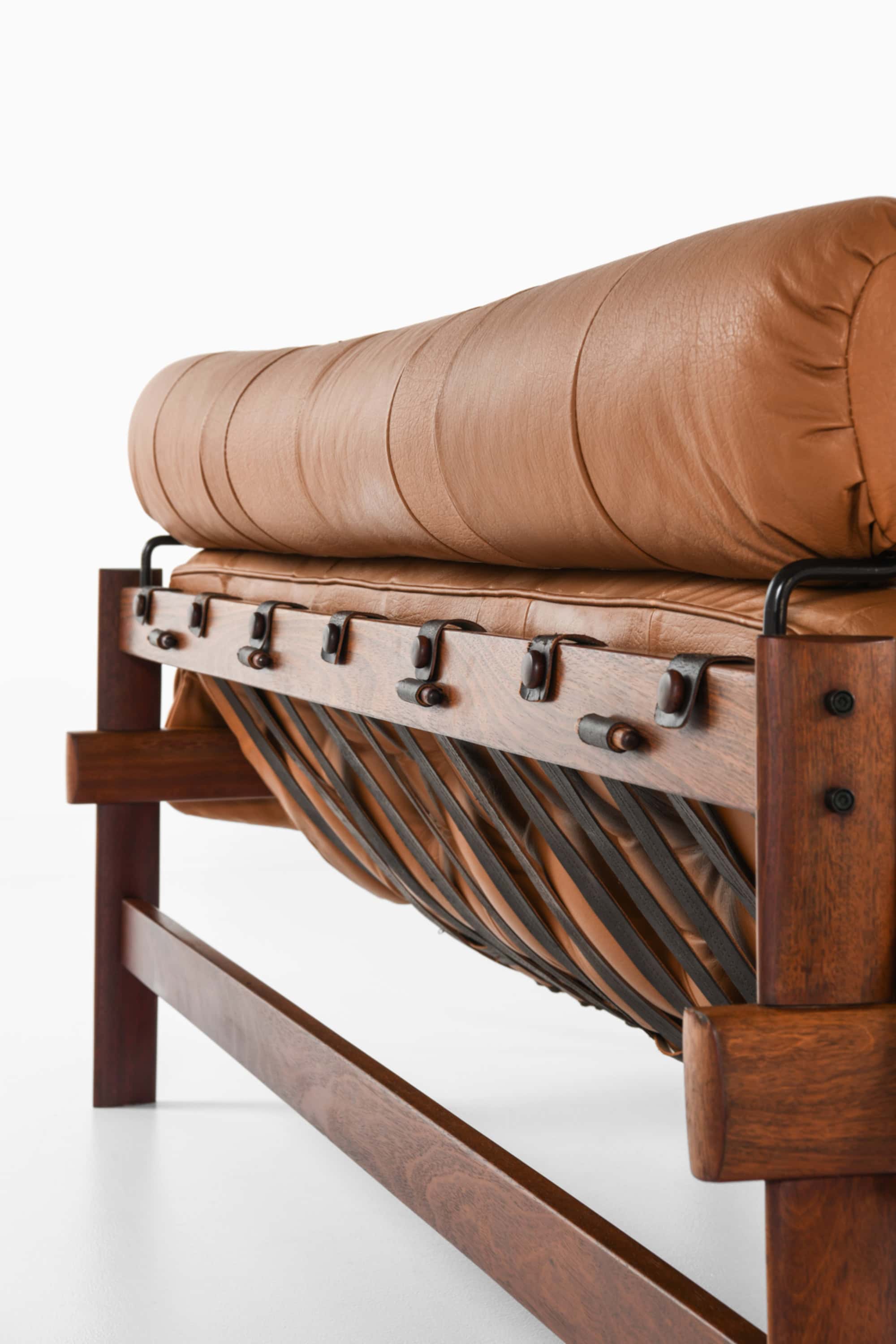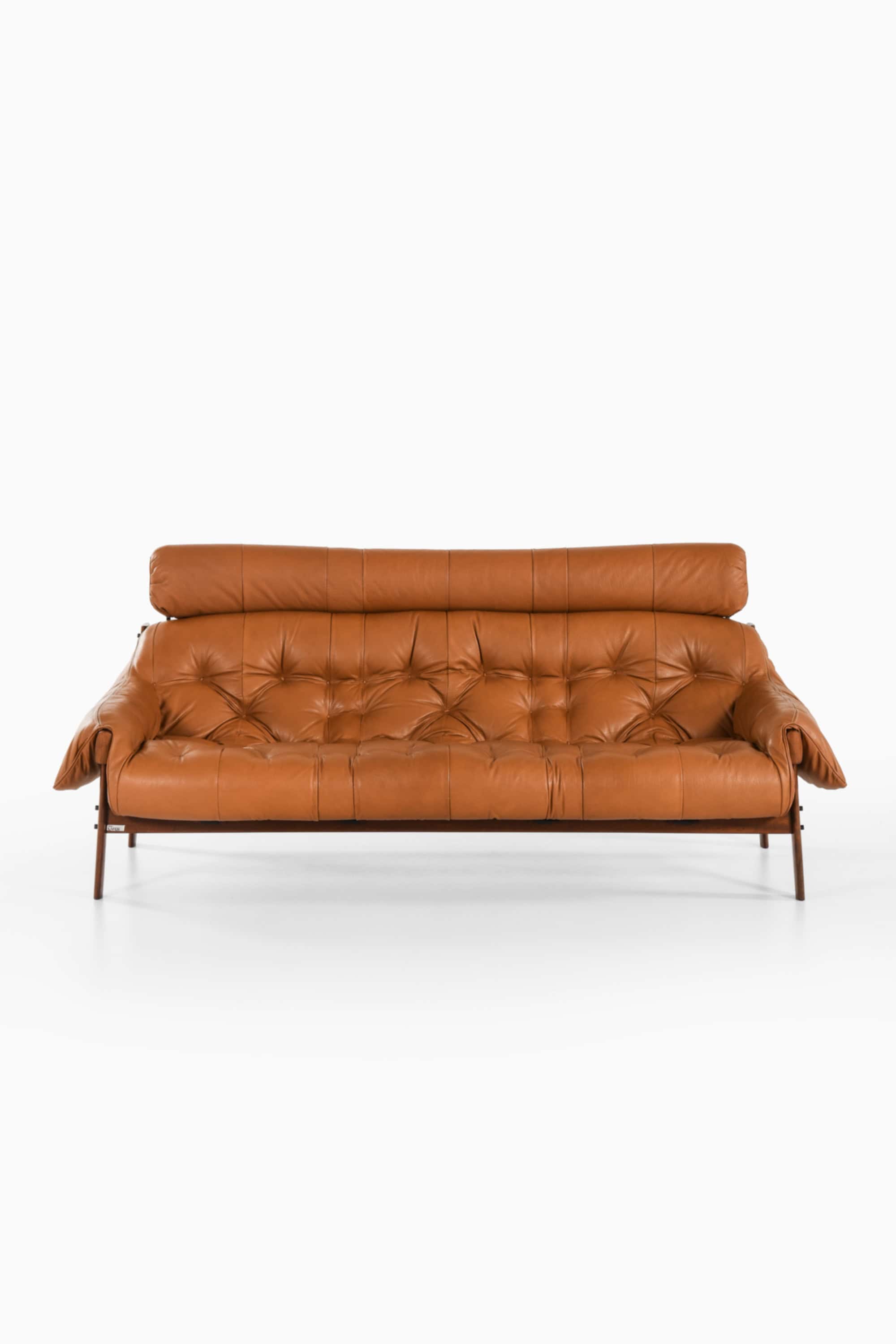 This rare sofa was designed by Percival Lafer and produced by Lafer MP in Brazil. It features a solid hardwood frame combined with original leather upholstery, which exemplifies the robust yet inviting qualities of Brazilian modern design. The structure is characterized by its exposed wooden frame and suspended leather support system, a hallmark of Lafer’s engineering approach to comfort and durability. The cushions are generously padded, tufted, and finished in natural tan leather, designed to soften with age and develop a distinctive patina.