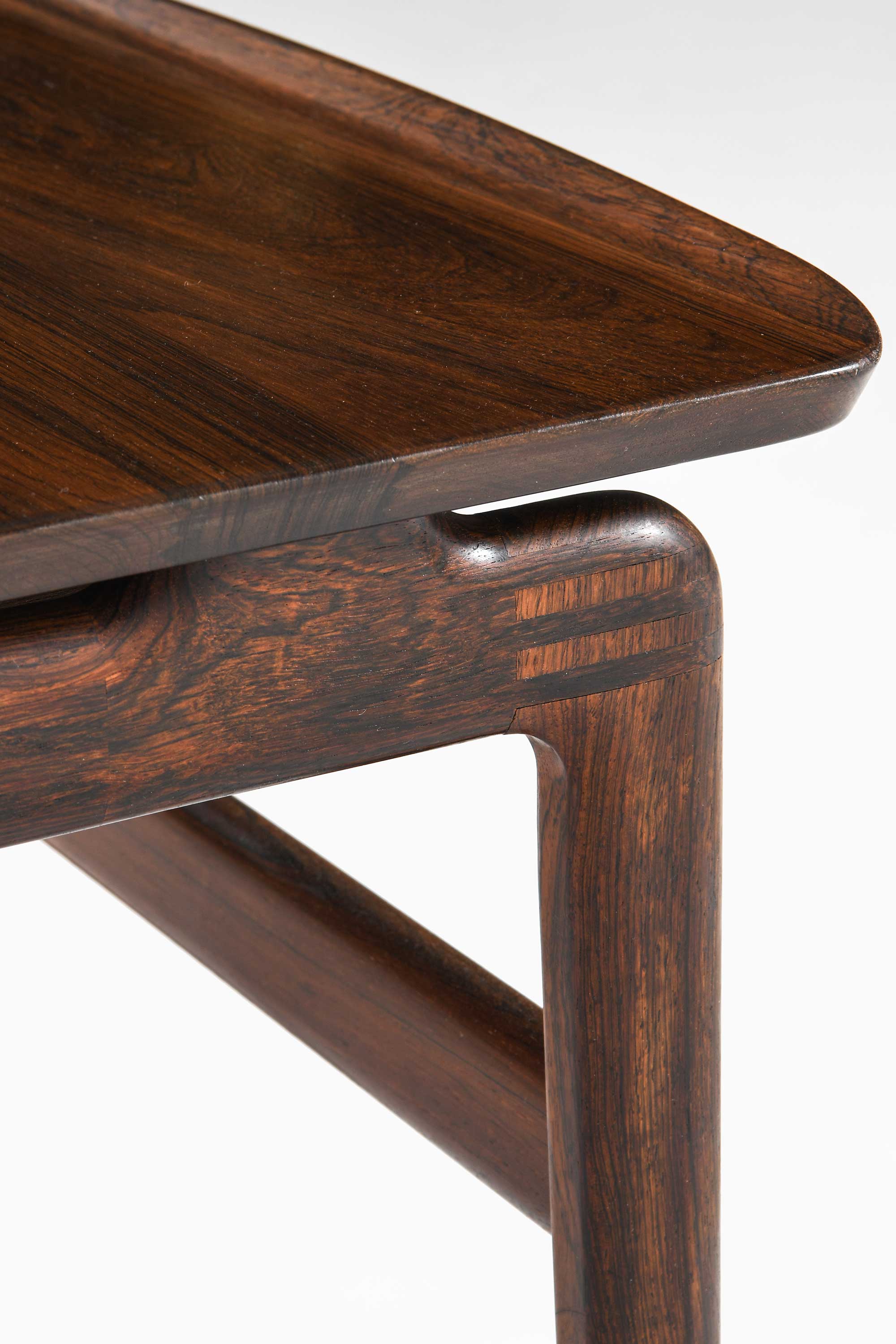 This very rare coffee table, designed in 1957 by Peter Hvidt and Orla Mølgaard-Nielsen and produced by France & Son in Denmark, exemplifies the elegance and structural clarity that defined the duo’s contribution to mid-century Danish modernism. Crafted from solid rosewood, the table is notable for its vibrant, expressive grain pattern, which varies across the surface and lends depth and movement to the otherwise restrained composition. The rosewood’s dark, lustrous tones reflect both the quality of the material and its careful preservation over time.
