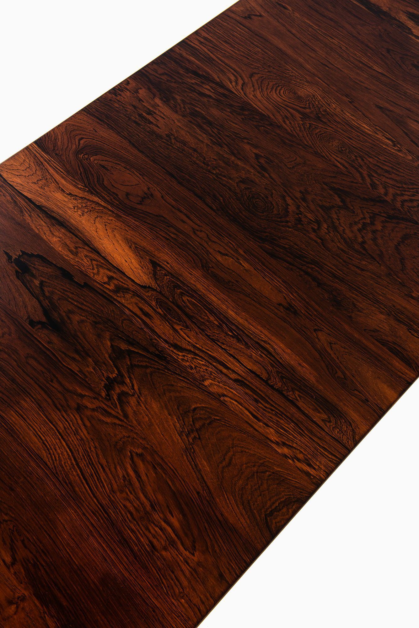 The table is executed in solid rosewood, exhibiting deep, expressive grain patterns and rich tonal variations typical of the species. The tabletop features gently curved edges and raised lips along the sides, demonstrating a sculptural precision that enhances both its tactile and visual appeal. The frame is constructed with rounded legs connected by crossbars, emphasizing the designers’ mastery of proportion and balance. The meticulous joinery, including exposed finger joints in contrasting wood, highlights the artisanal character and structural honesty of the piece.
