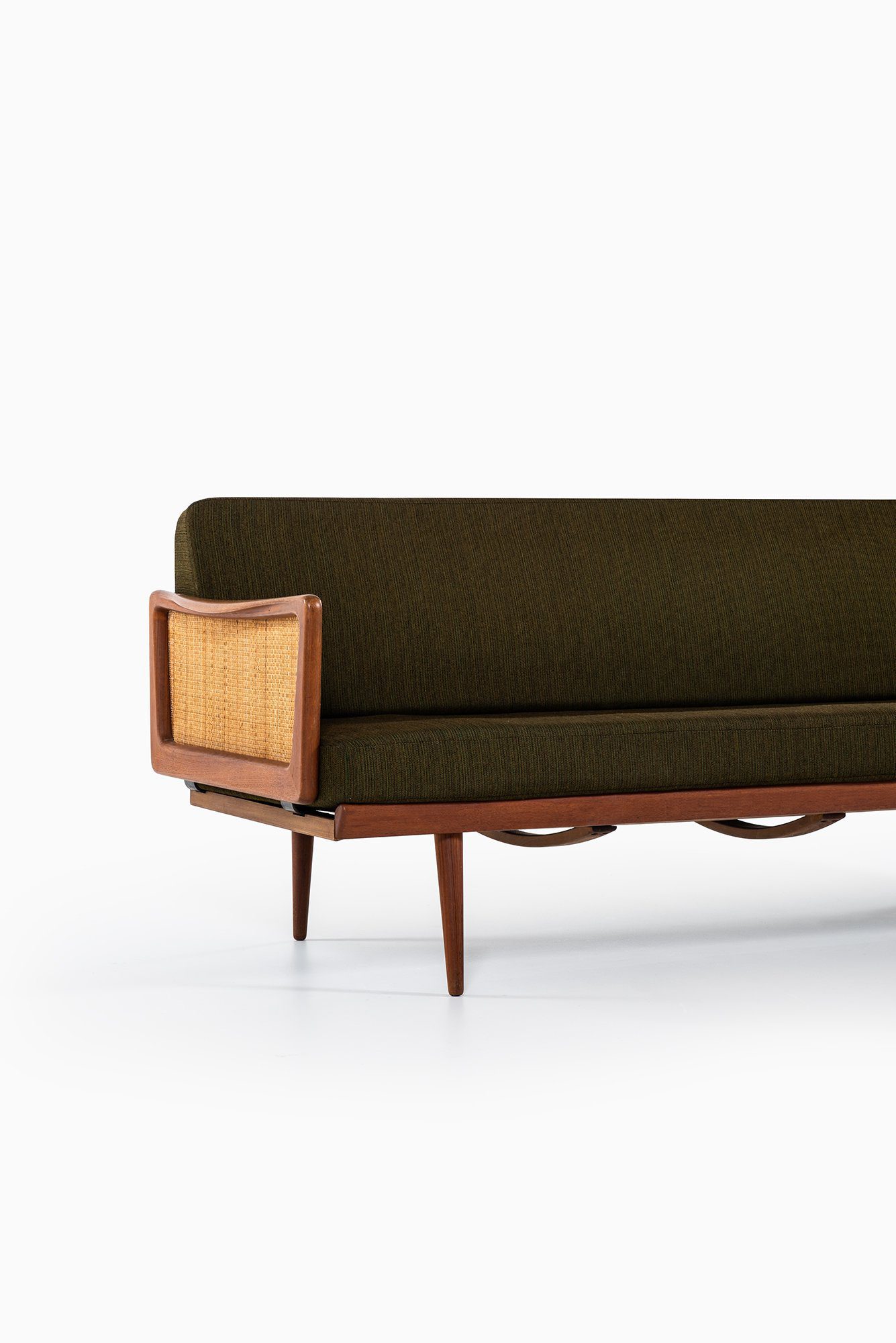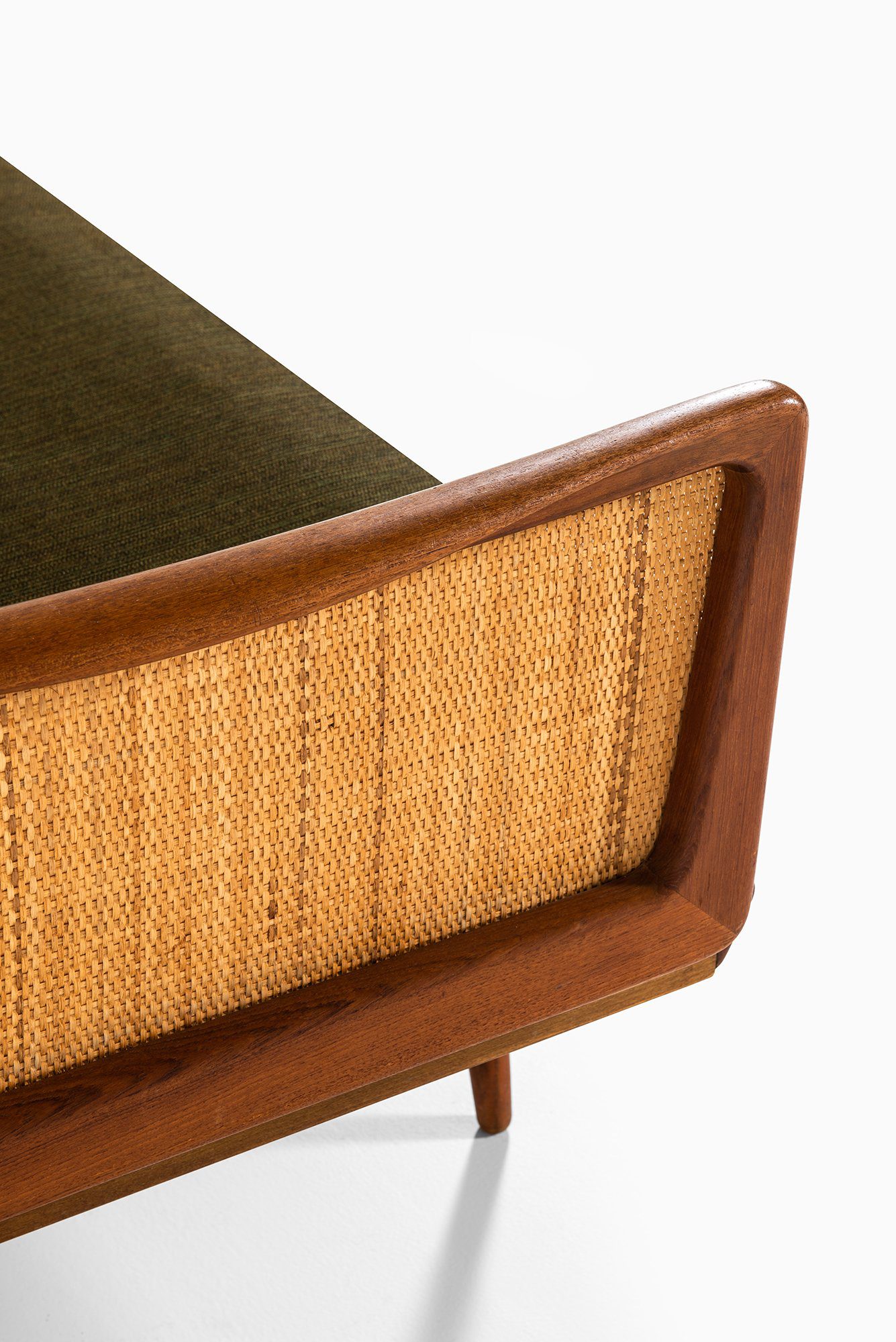 This rare Minerva daybed or sofa was designed by Peter Hvidt and Orla Mølgaard-Nielsen and produced by France & Son in Denmark during the 1950s. It exemplifies the balance between functionality, craftsmanship, and refined modern aesthetics that defined Danish mid-century furniture design. The piece combines an elegantly sculpted teak frame with woven cane panels and its original green wool upholstery, offering both visual warmth and structural precision.