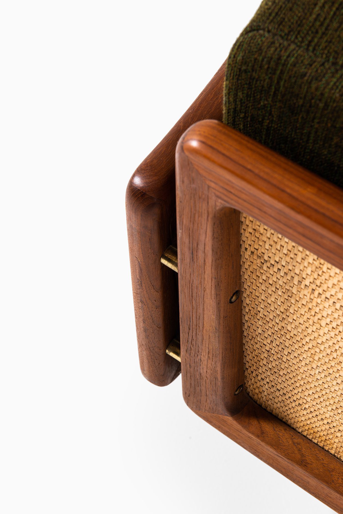 The frame is constructed in solid teak with softly rounded edges and tapered legs, demonstrating Hvidt and Mølgaard-Nielsen’s attention to organic form and joinery. The woven cane side and back panels provide a light, transparent quality that contrasts beautifully with the darker tone of the wood. Brass fittings connect the components with mechanical clarity, allowing the sofa to maintain its modular, demountable character—a hallmark of France & Son production. The cushions are upholstered in a finely textured green fabric with subtle tonal depth, original to the piece and preserved in remarkable condition.