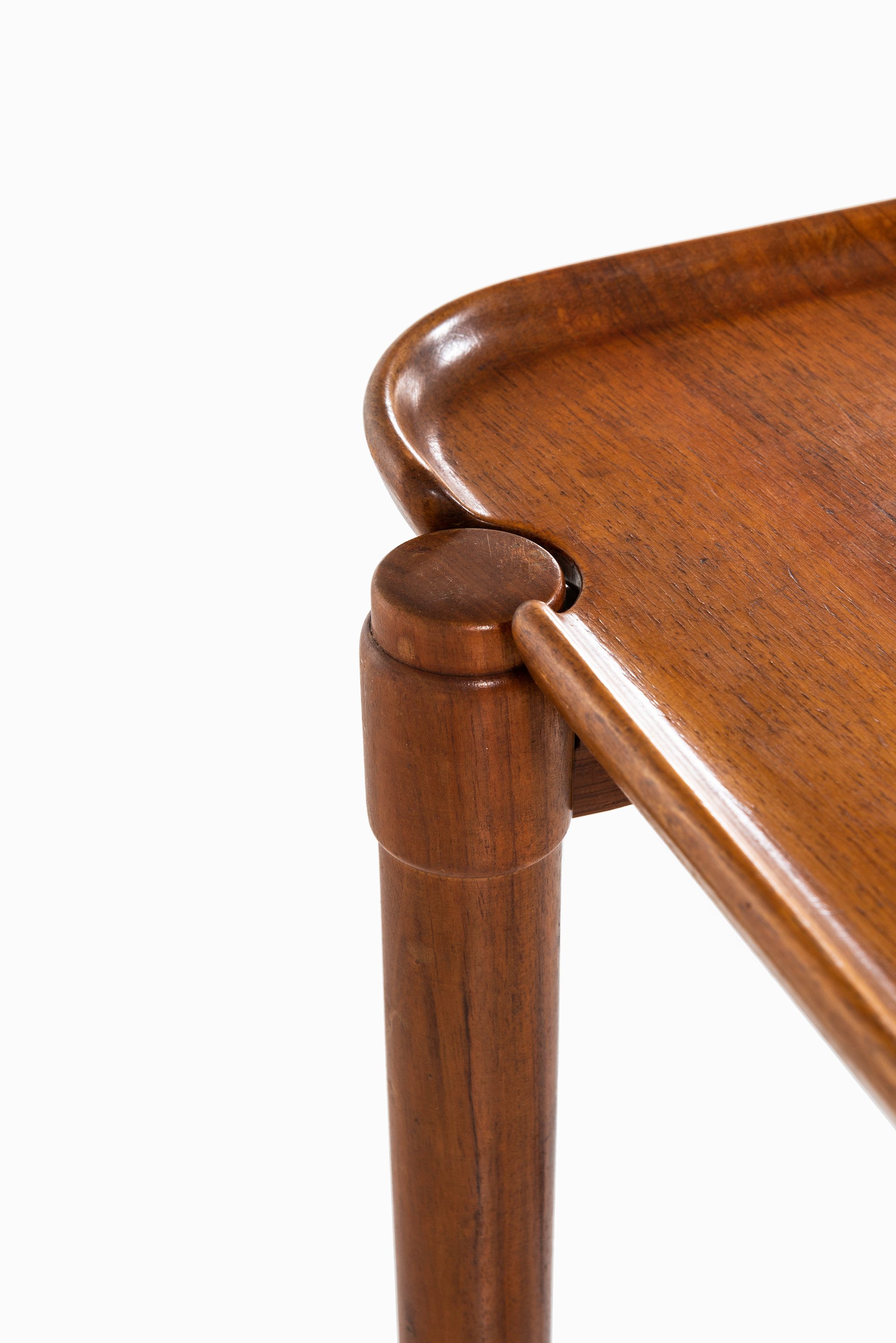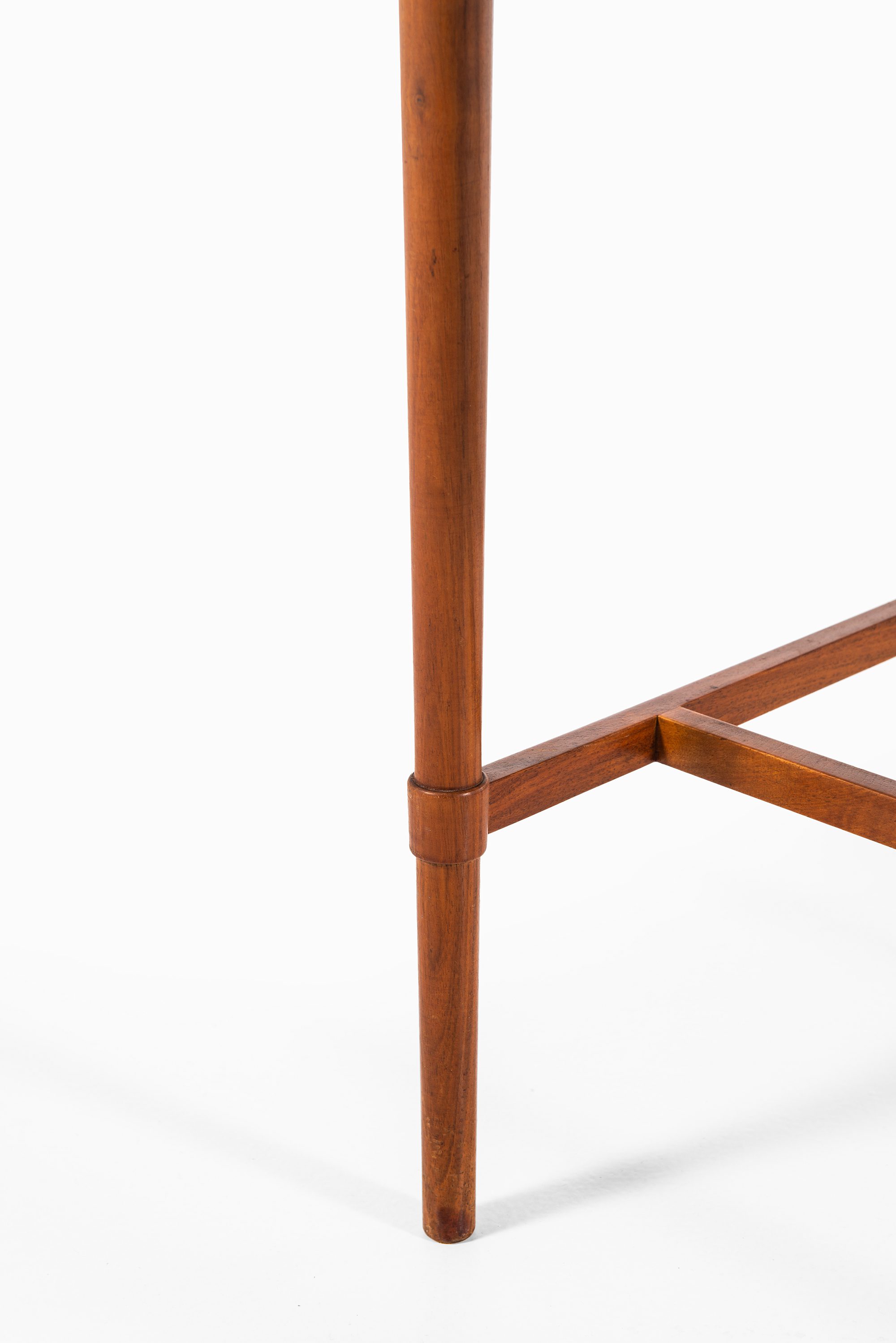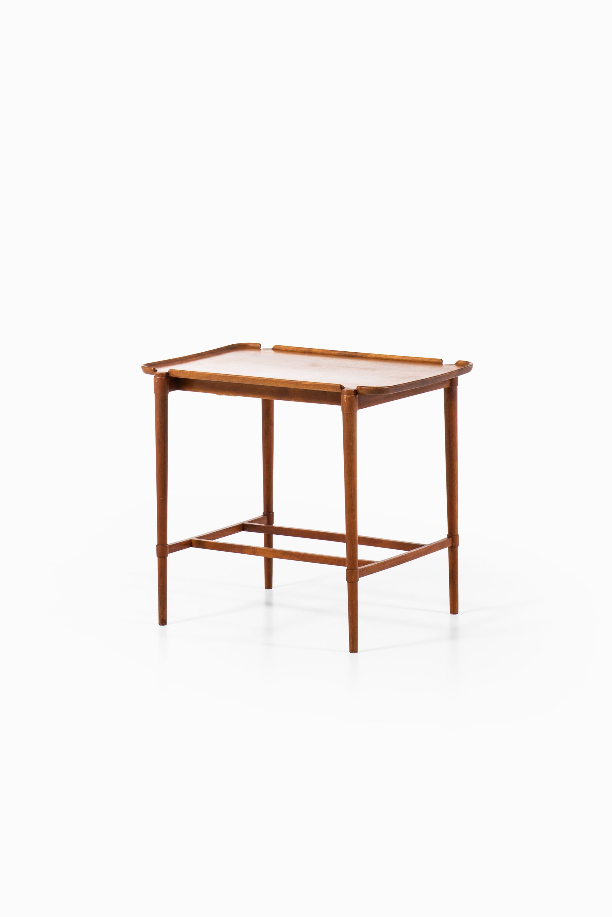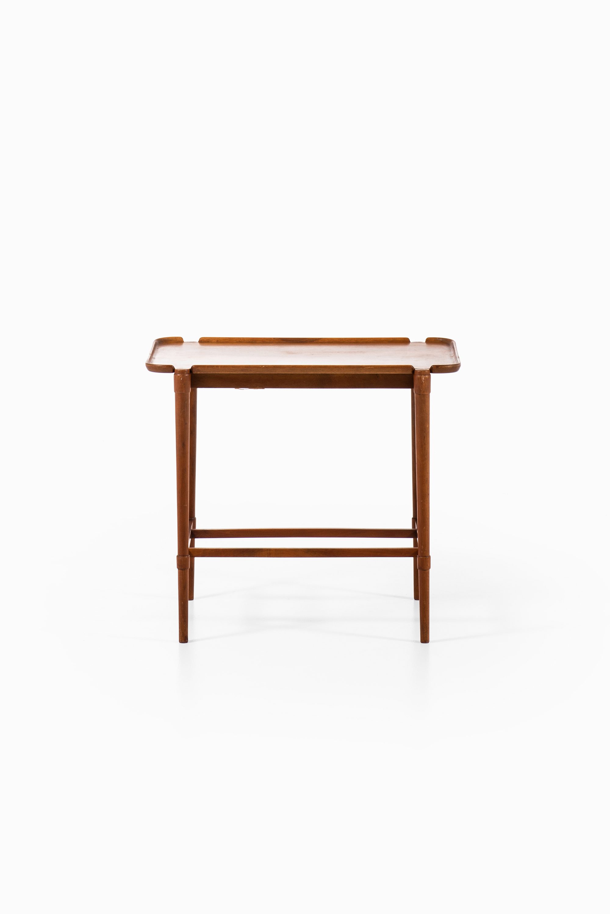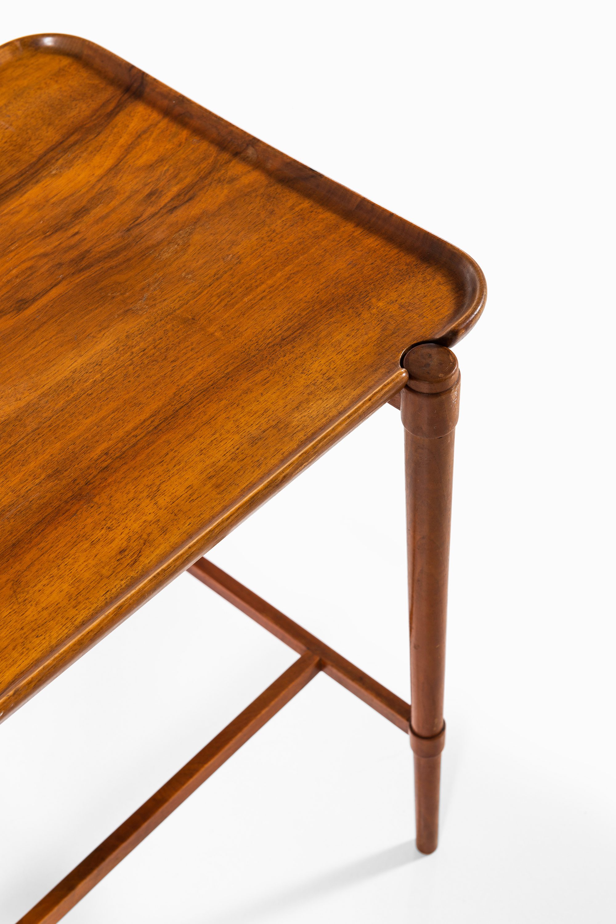 The table rests on slender, tapered legs, reinforced by horizontal stretchers, which provide stability while keeping the overall appearance light and balanced. The construction reveals Hvidt’s early exploration of functional elegance, where structural clarity is combined with subtle decorative detailing. The raised edges of the tabletop recall the function of a tray, underscoring the table’s dual role as both a serving piece and a freestanding side table.