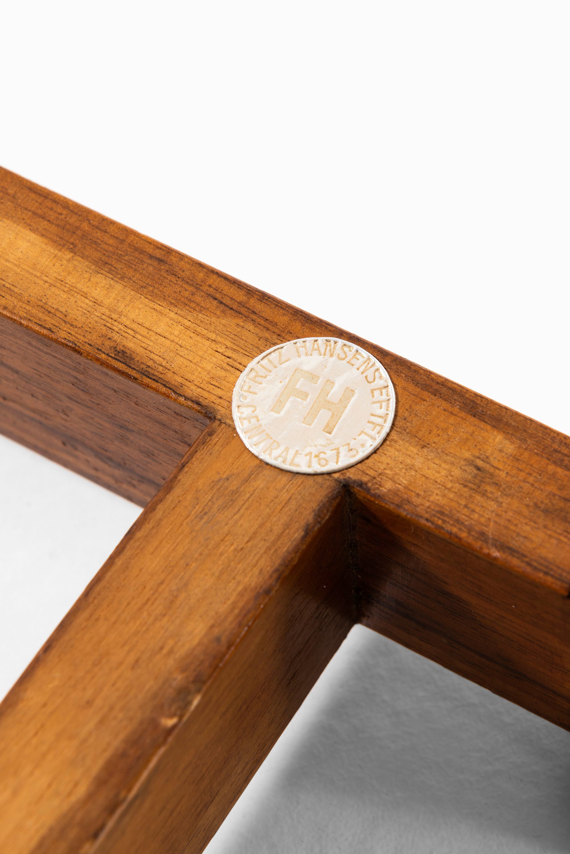 This rare side or tray table, model no. 1775, was designed by Peter Hvidt and produced by Fritz Hansen in Denmark in 1943. Executed in solid walnut, the table displays a warm, even tone with a fine grain that emphasizes the quality of the wood. The design features a rectangular top with softly raised edges, carefully rounded corners, and circular cut-outs at each corner where the legs meet the surface, a detail that demonstrates both precision craftsmanship and an interest in refined joinery.