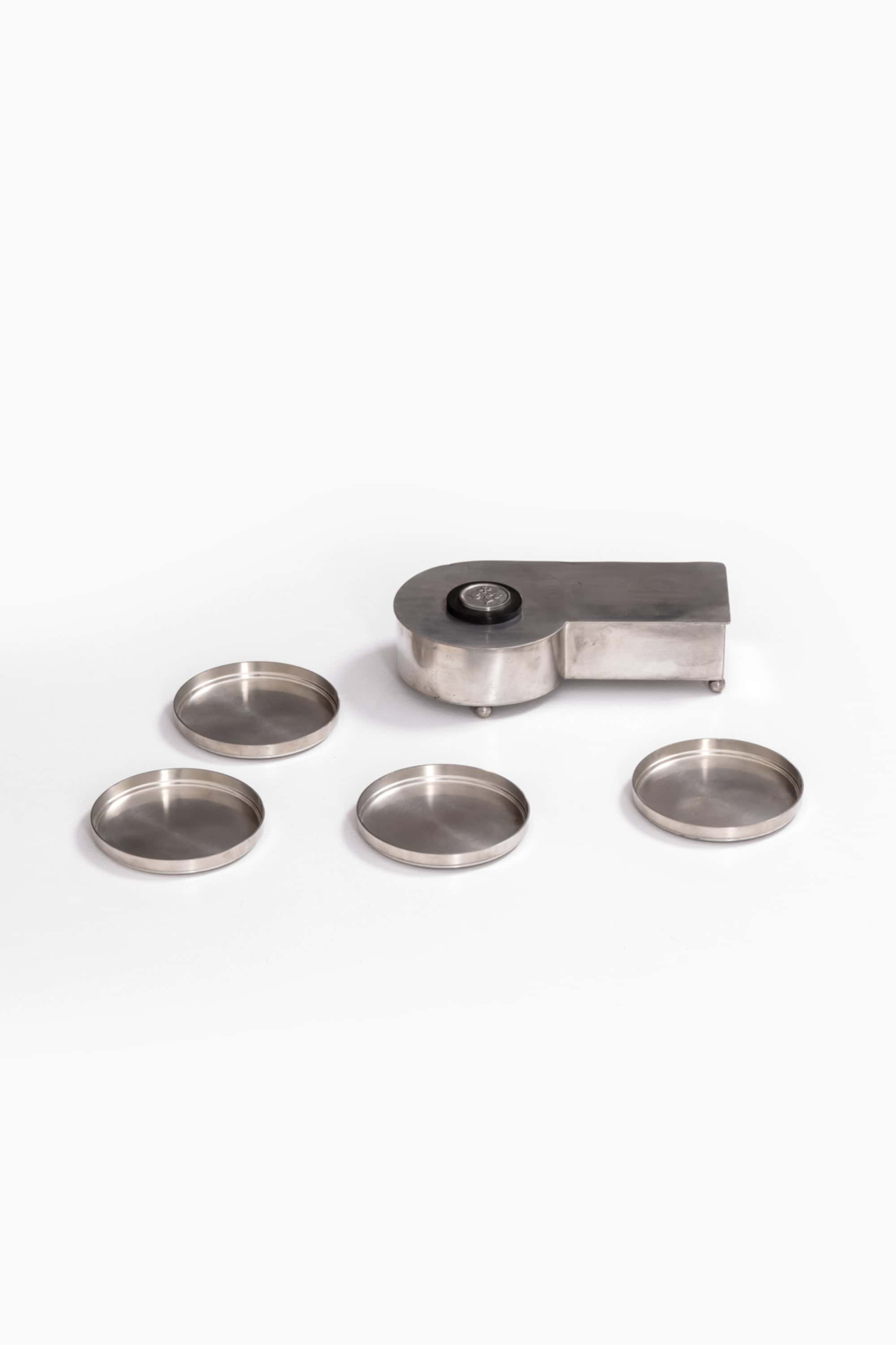 Inside, the box is divided to accommodate the coasters, which are also made of pewter and finished to match the exterior. The coasters are shallow and precisely formed, reinforcing the utilitarian nature of the set while maintaining a consistent visual language. The box stands on small spherical feet, subtly lifting it from the surface and adding to its refined, crafted appearance.