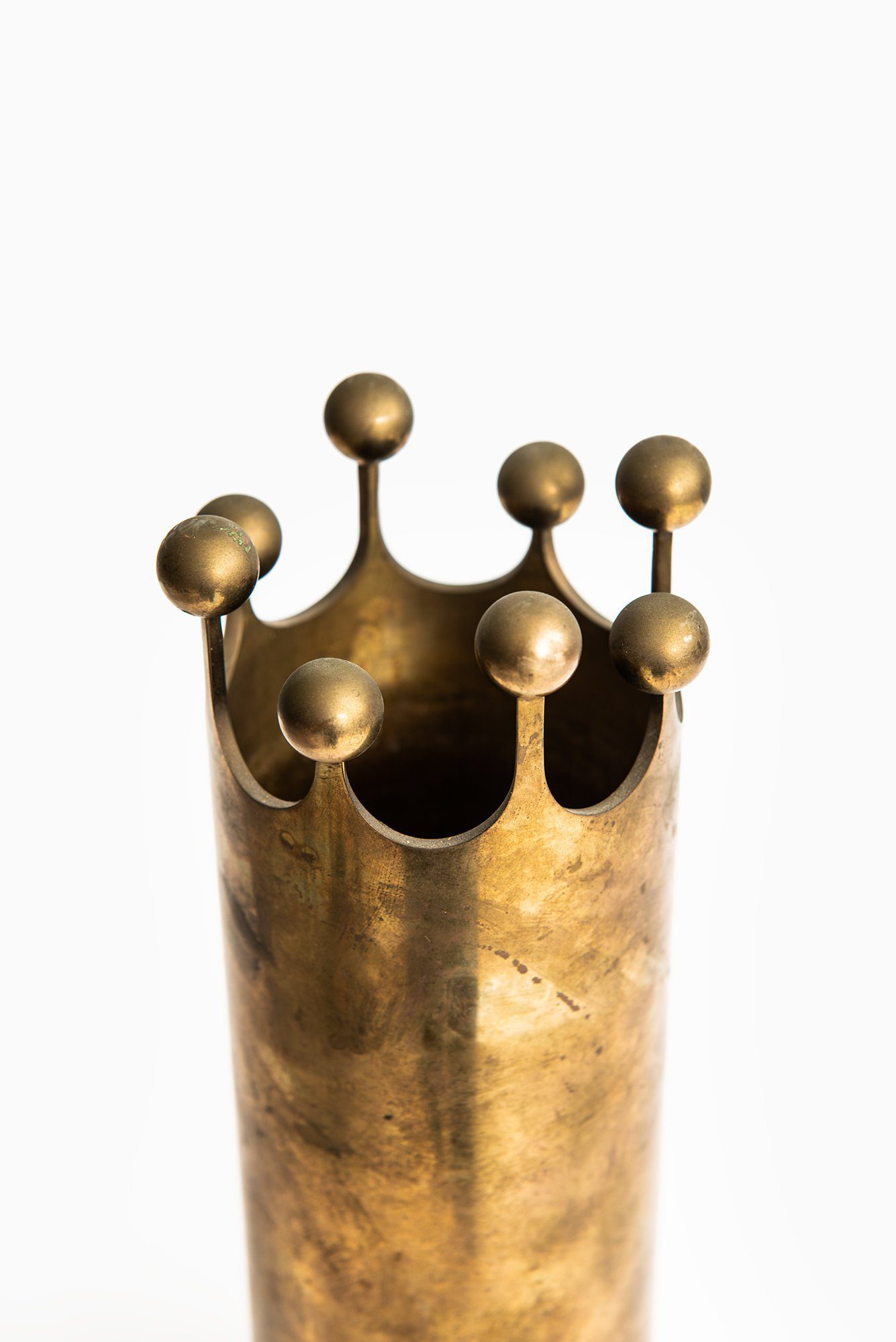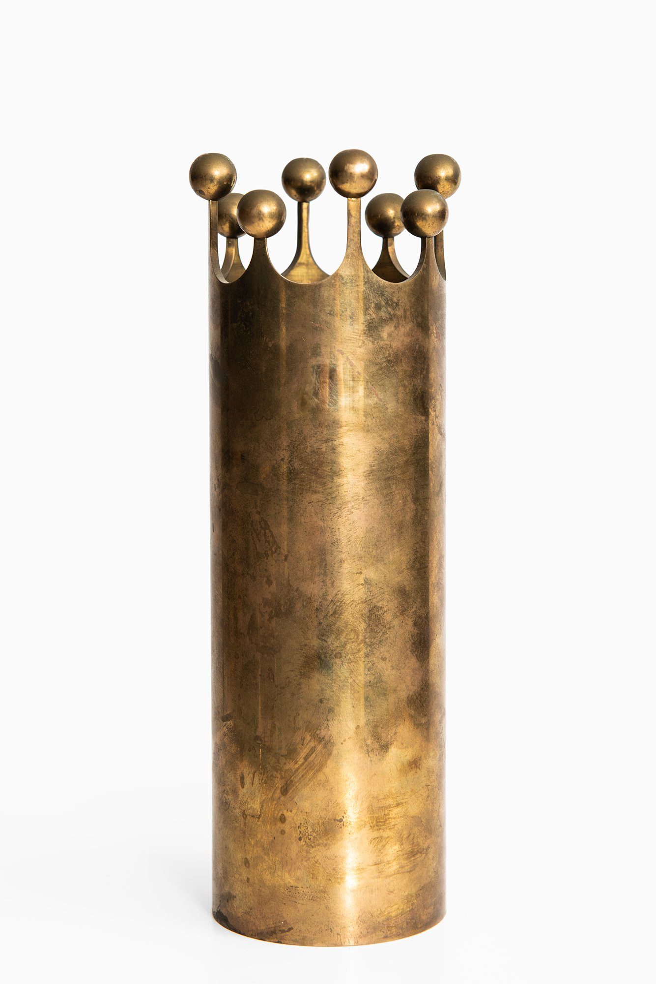 The vase is executed in solid brass, presenting a warm golden tone with areas of darker oxidation and subtle surface variation. The cylindrical body is smooth and vertically oriented, while the upper edge is cut into a rhythmic sequence of rounded peaks, each topped with a spherical brass element. This detail introduces a strong graphic and sculptural quality, contrasting the otherwise restrained form. The interior remains plain and functional, suitable for use as a vase or as a standalone decorative object.