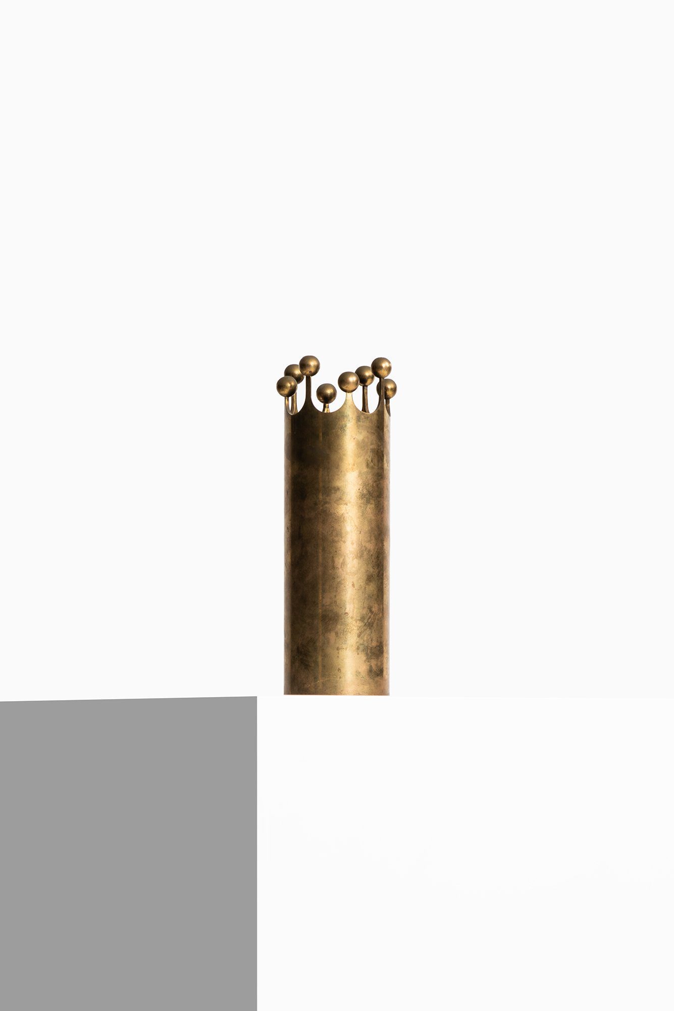 This rare brass vase was designed by Pierre Forssell and produced by Skultuna in Sweden during the 1950s. The piece is a sculptural example of Scandinavian mid-century metalwork, combining a strict cylindrical body with an expressive, crown-like rim that gives the vase a distinctive architectural character.