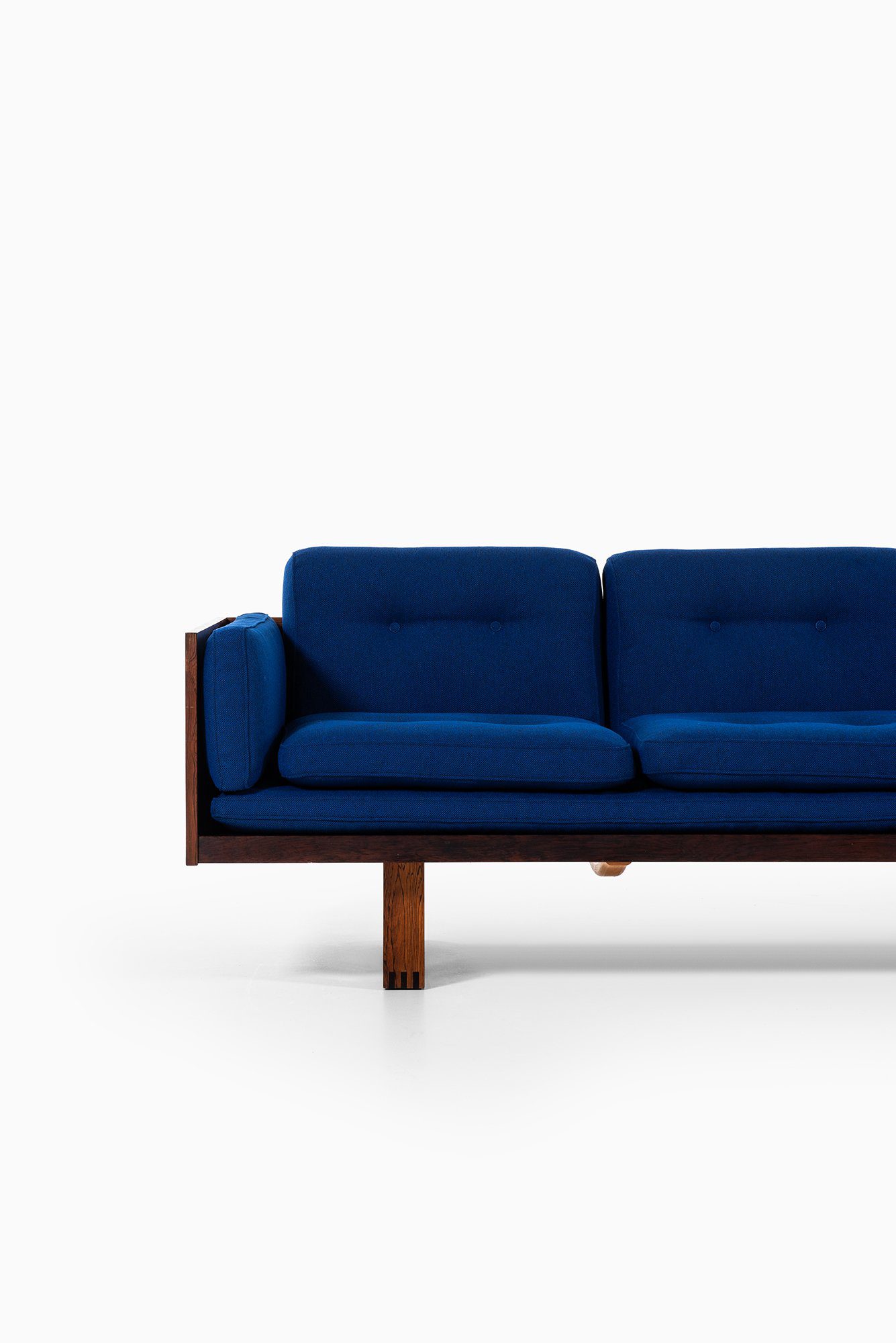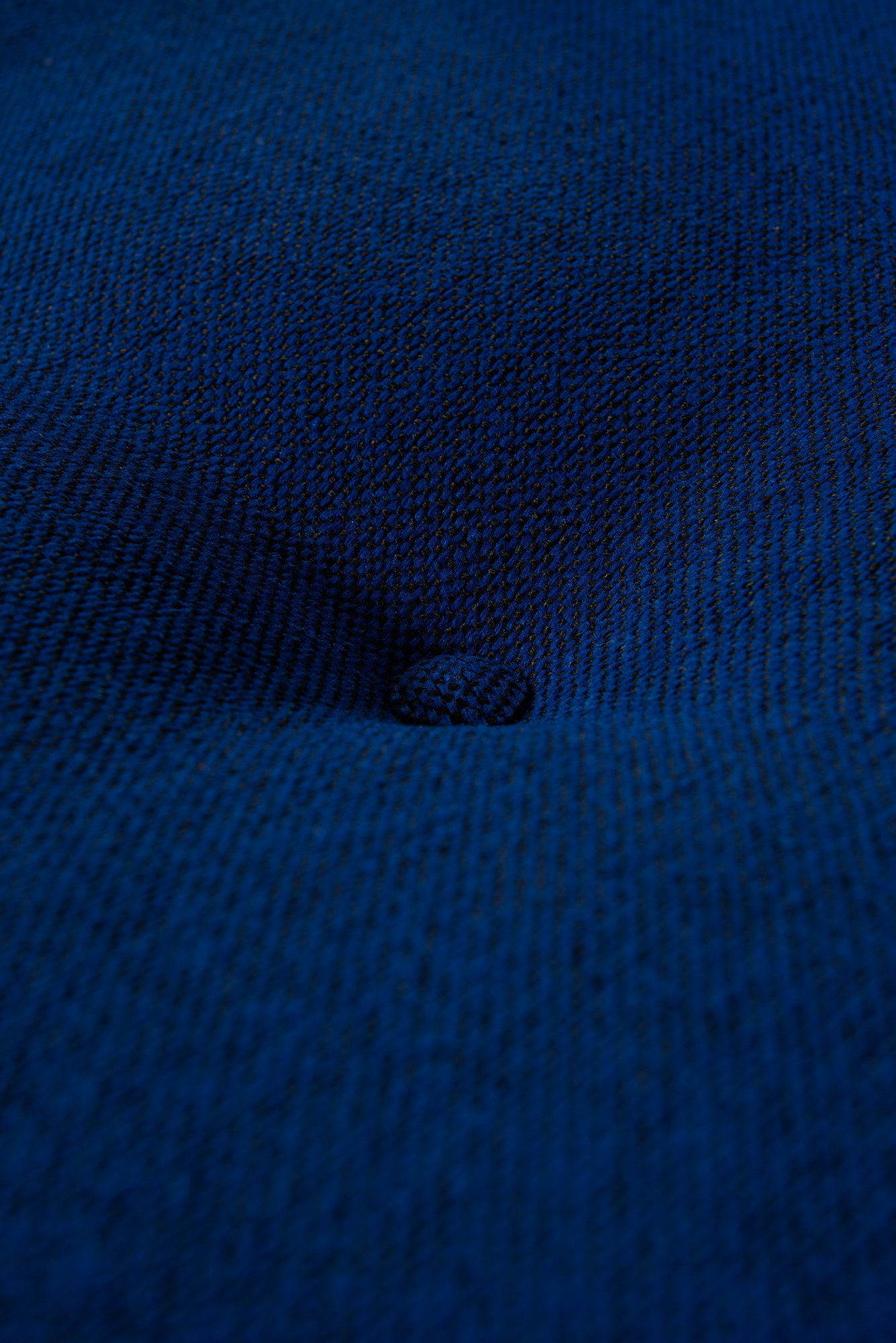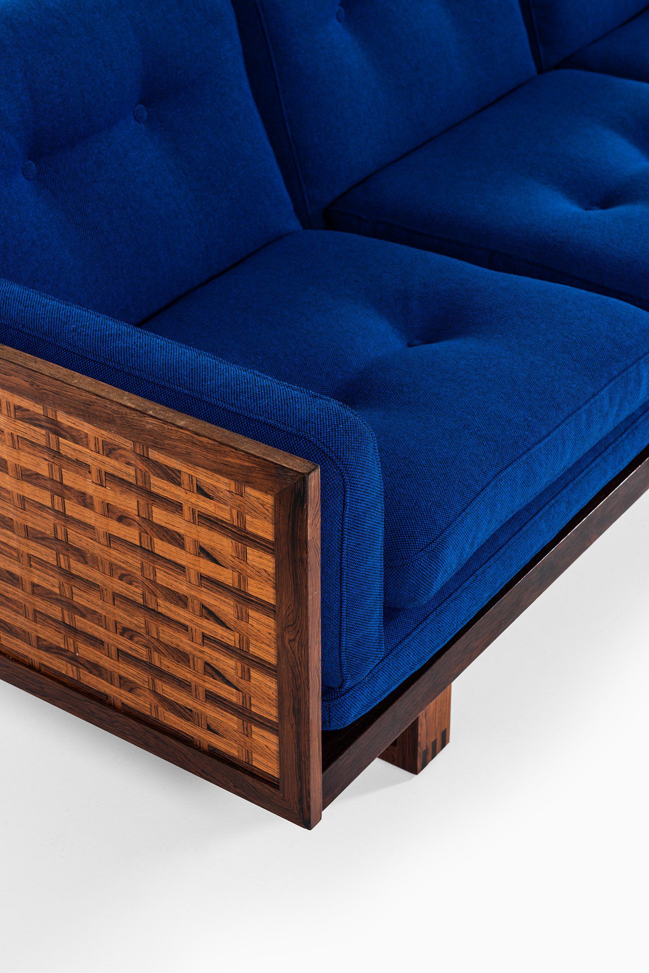 The sofa has been newly reupholstered in a deep blue fabric, echoing the modernist color palette of the period. The cushions are firm yet comfortable, with tufted detailing that offers subtle texture and a sense of depth. The contrast between the saturated textile and the warm rosewood gives the piece a striking yet balanced presence.