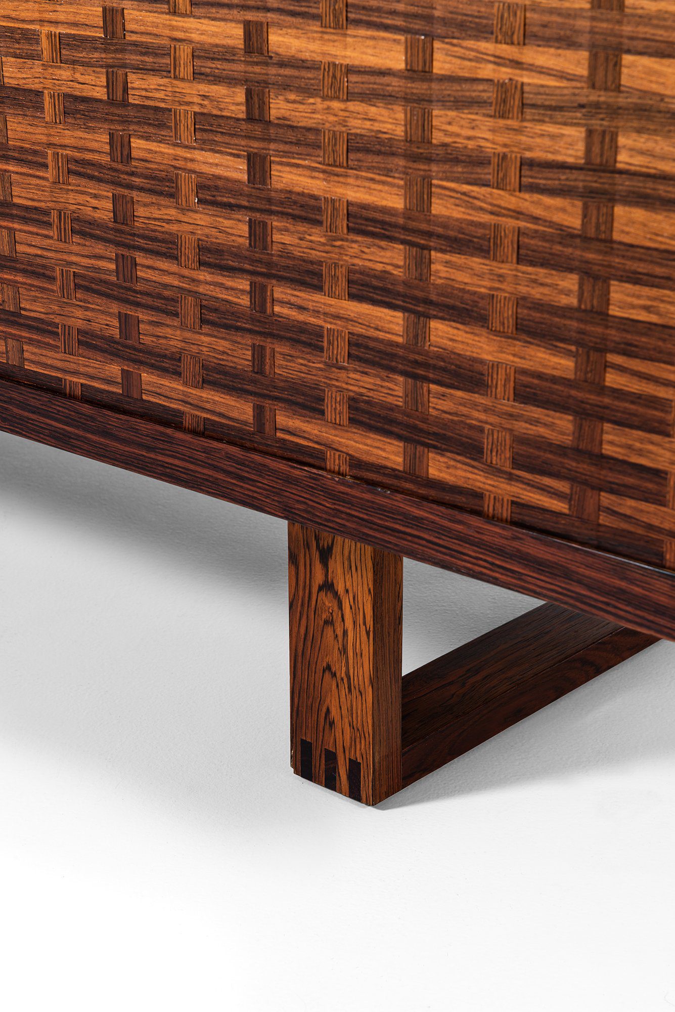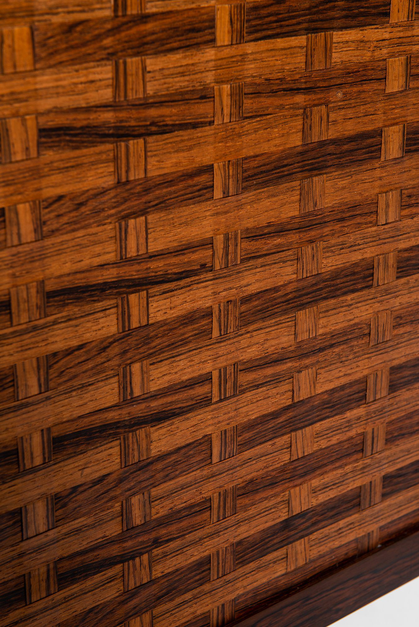 The frame is constructed in rosewood, displaying an exceptional basket-weave pattern along the sides and back. This intricate veneering technique creates a rhythmic surface of interlocking light and dark grain tones, emphasizing both craftsmanship and geometric precision. The wood has been completely restored, revealing its natural depth and luster while maintaining the authenticity of the original joinery and design details. The solid wood legs feature exposed dovetail joints, providing both visual and structural integrity.