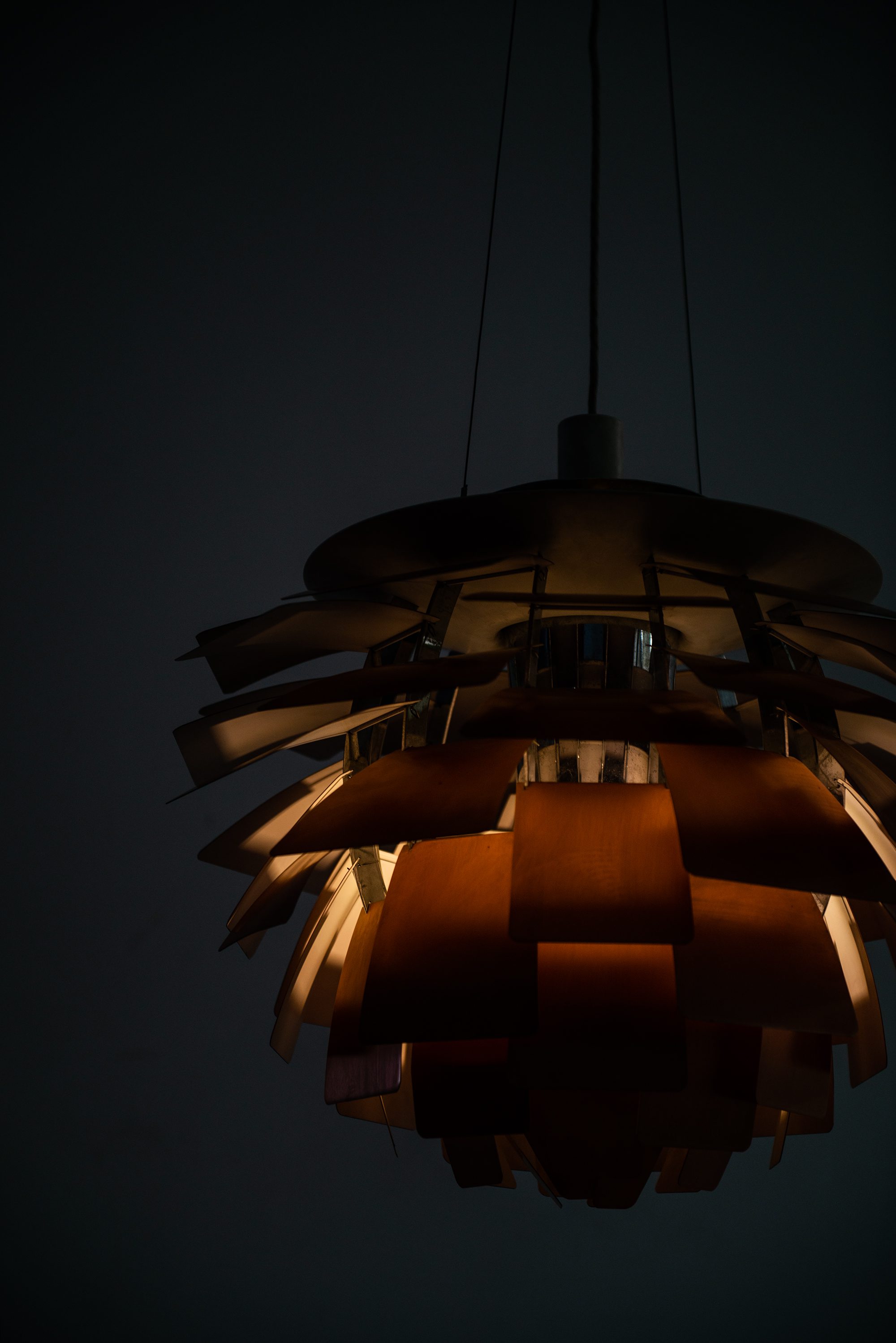 The Artichoke ceiling lamp, designed by Poul Henningsen in 1957 and produced by Louis Poulsen in Denmark, is one of the most iconic pieces of mid-century Scandinavian lighting design. This model, crafted in copper, is renowned for its sculptural complexity and exceptional light diffusion. The lamp consists of multiple overlapping metal leaves arranged in a layered, radial structure that resembles the organic form of an artichoke. Each leaf is precisely positioned to conceal the light source from any viewing angle, resulting in a soft, glare-free illumination that defines Henningsen’s lighting philosophy.