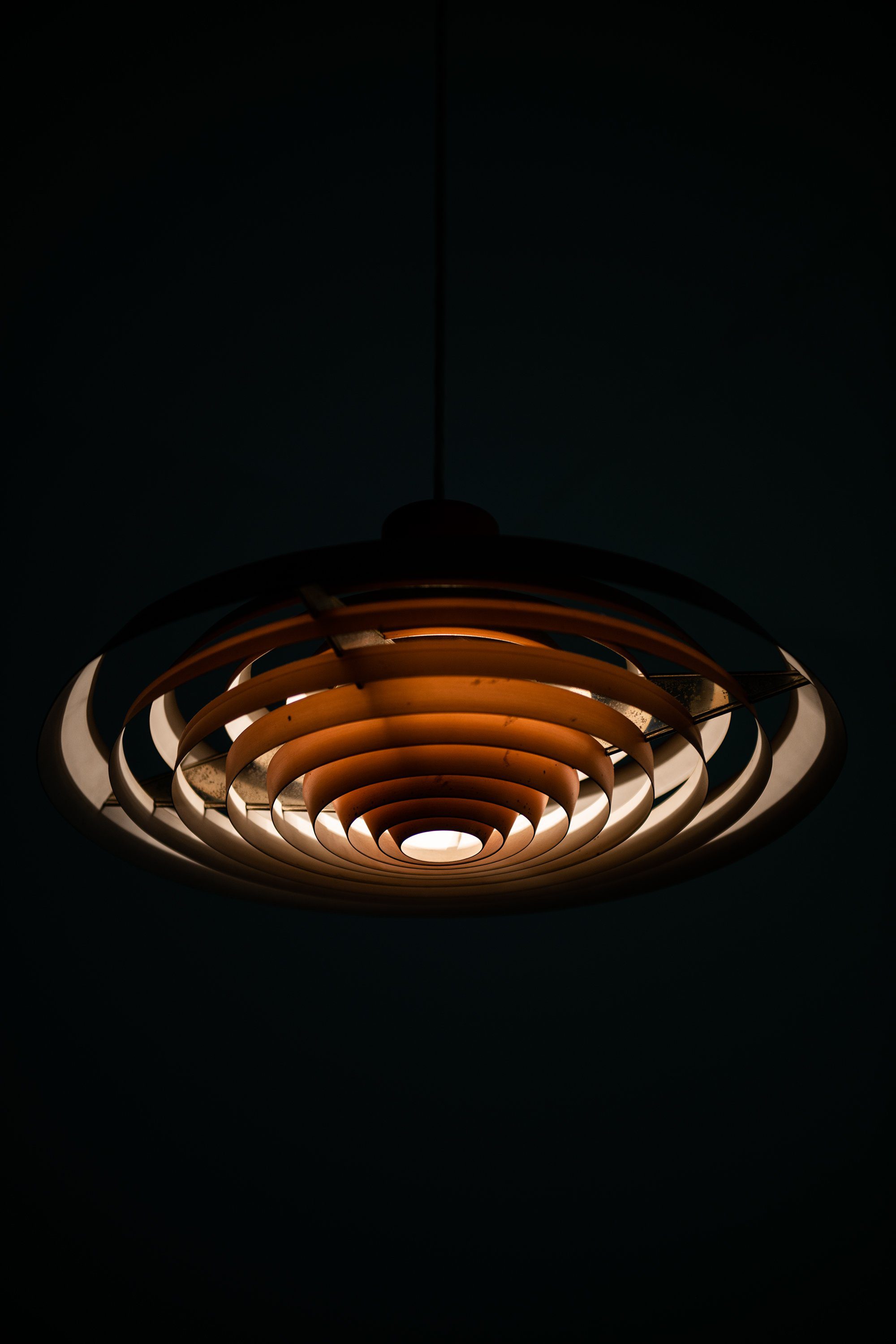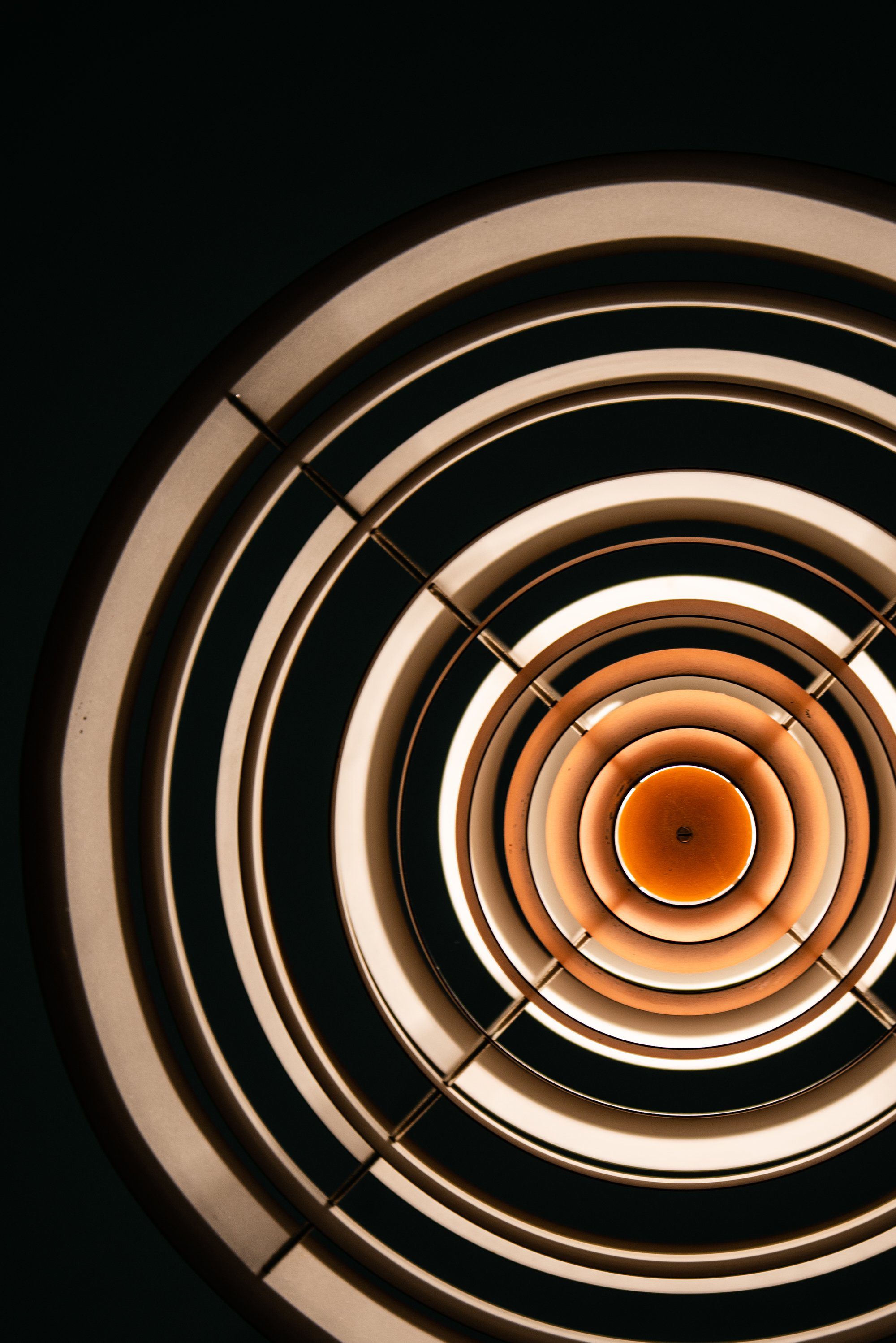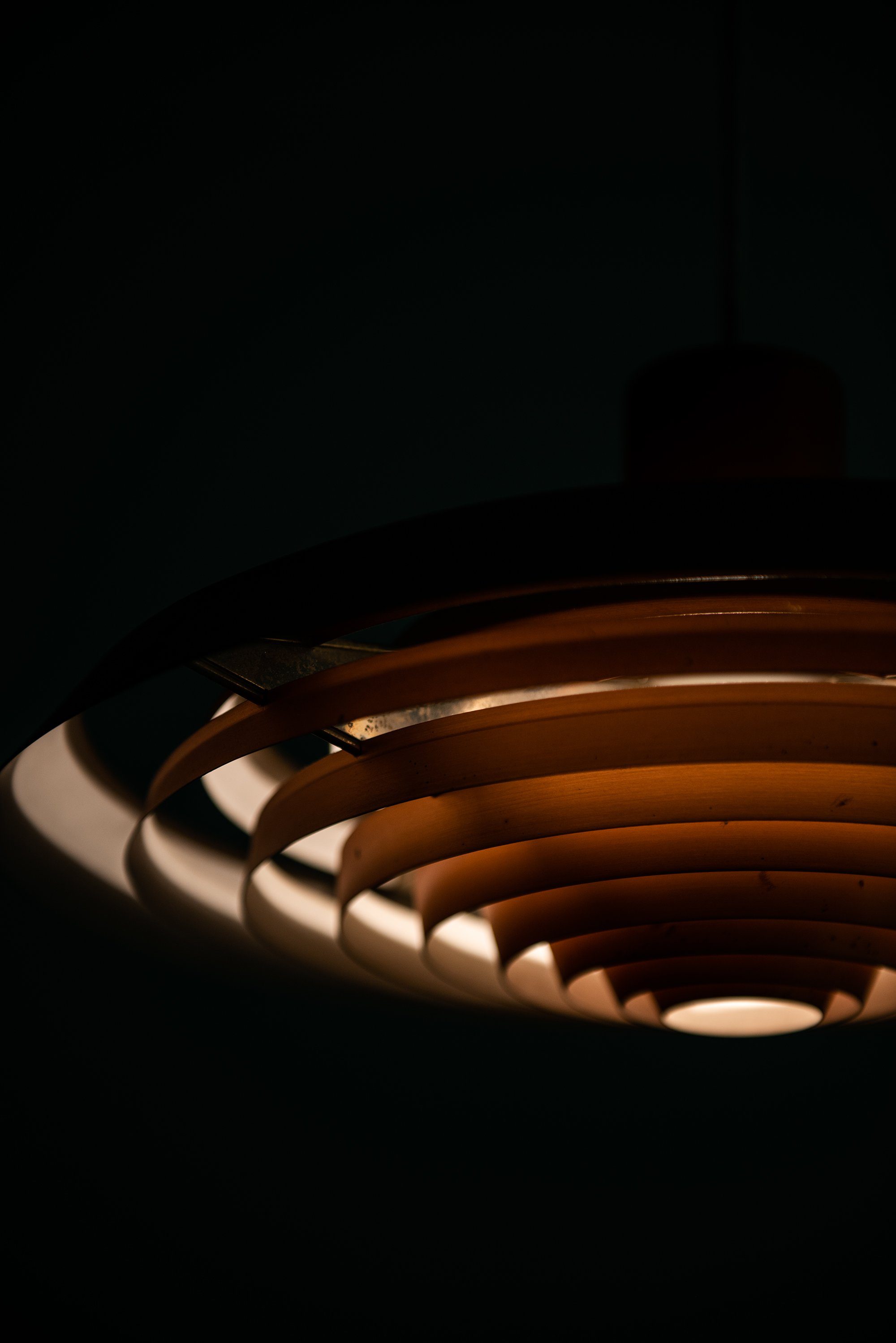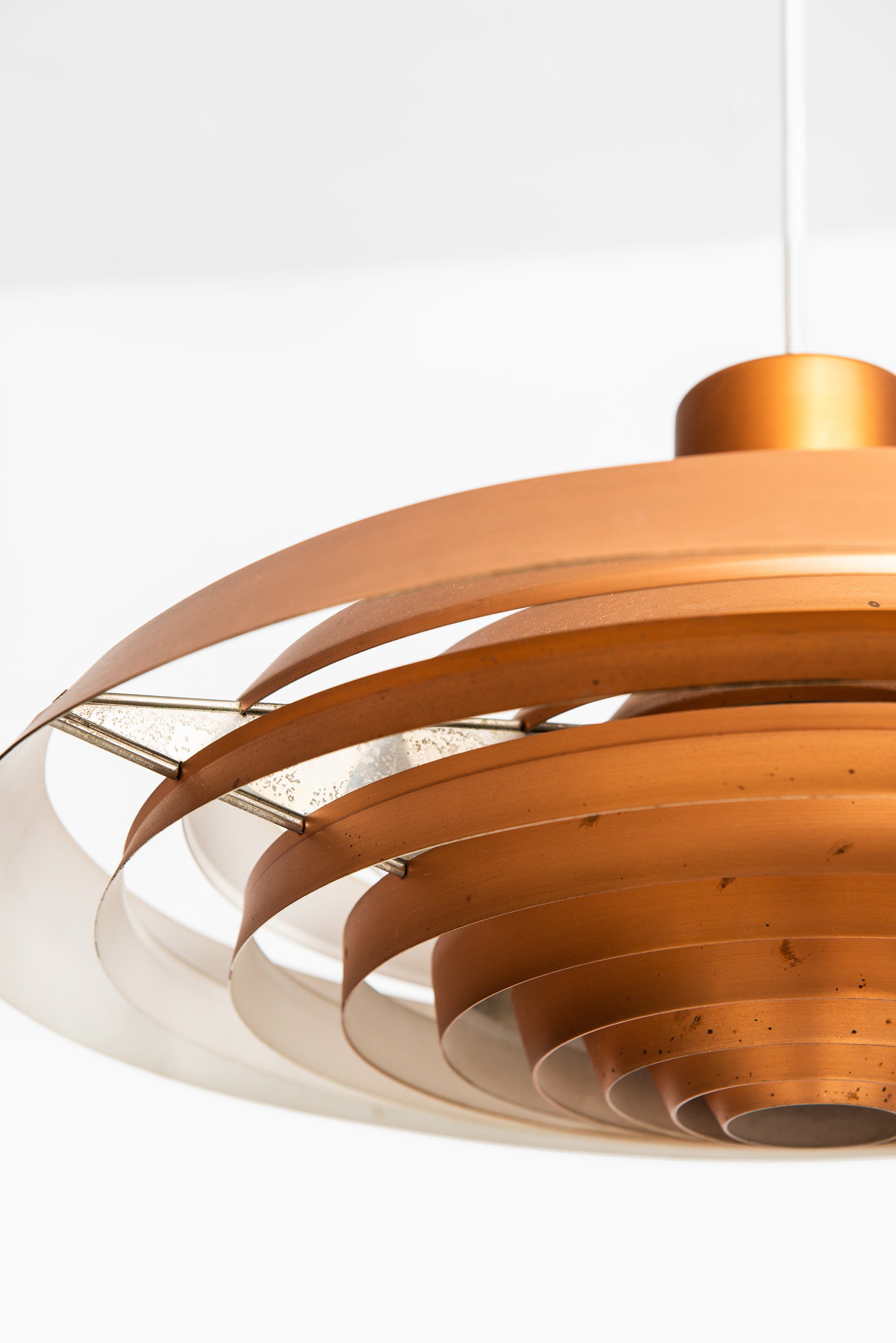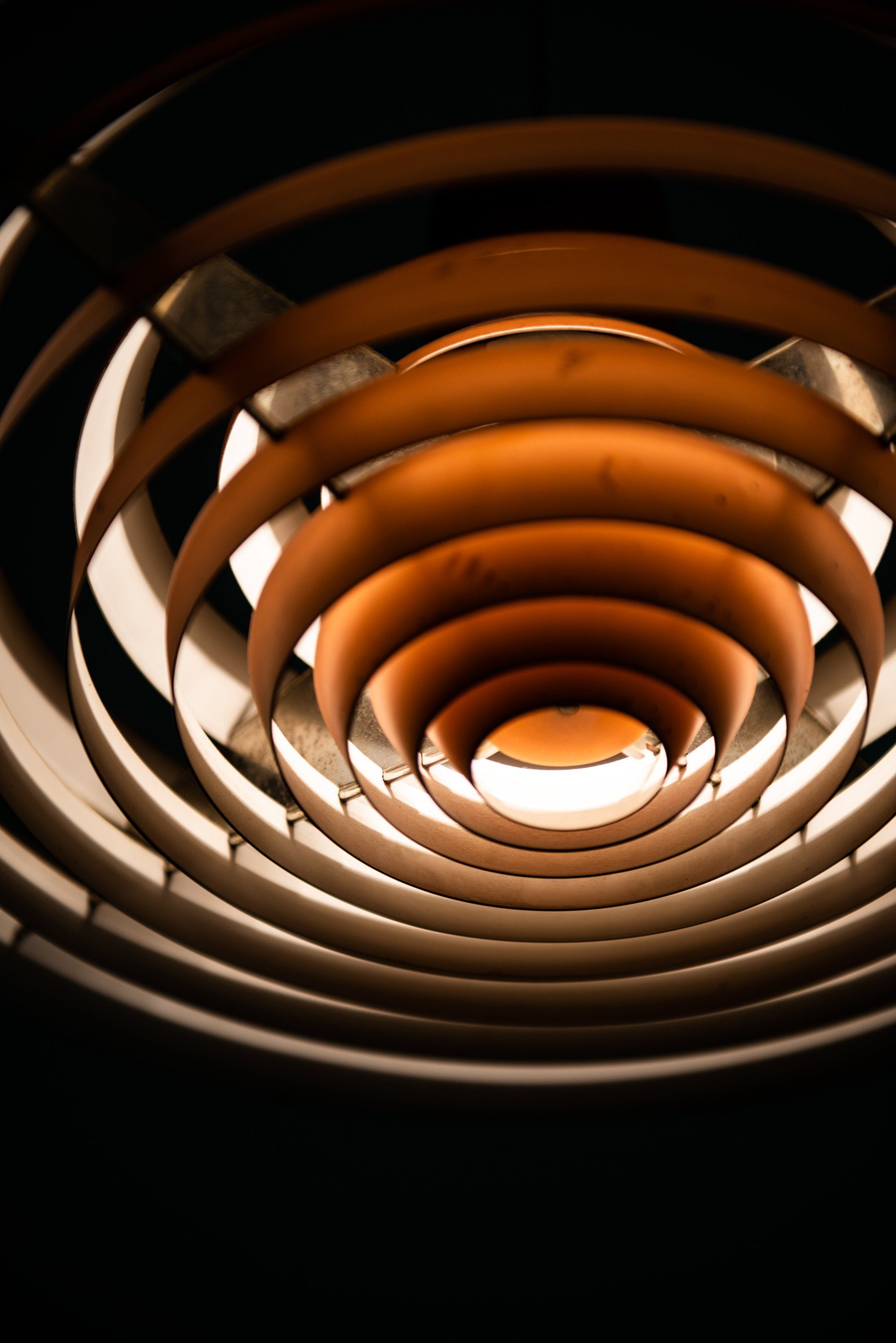 The lamp’s copper surface has developed a soft patina over time, adding depth and character to its warm metallic tone. The precision in the curvature and spacing of each ring demonstrates Louis Poulsen’s technical excellence and commitment to craftsmanship. The Langelinie model, named after the famous Copenhagen promenade, is one of Henningsen’s rarer designs and represents a transitional period in his lighting work, moving from the strictly functional to forms of increased architectural expression.