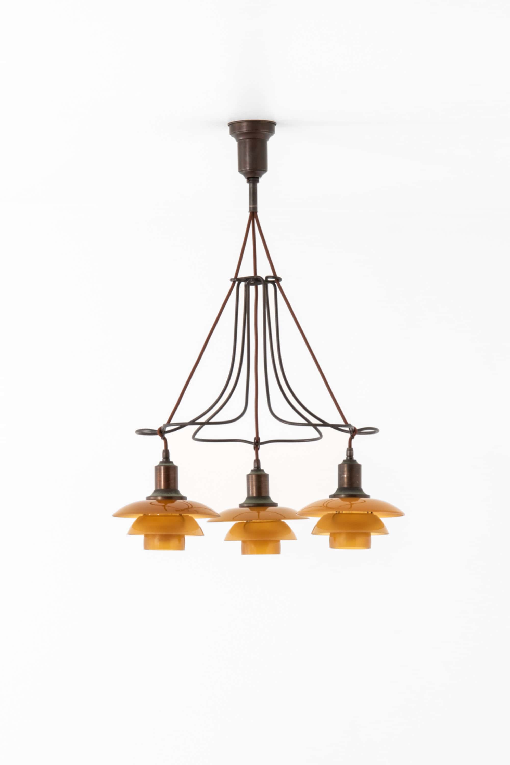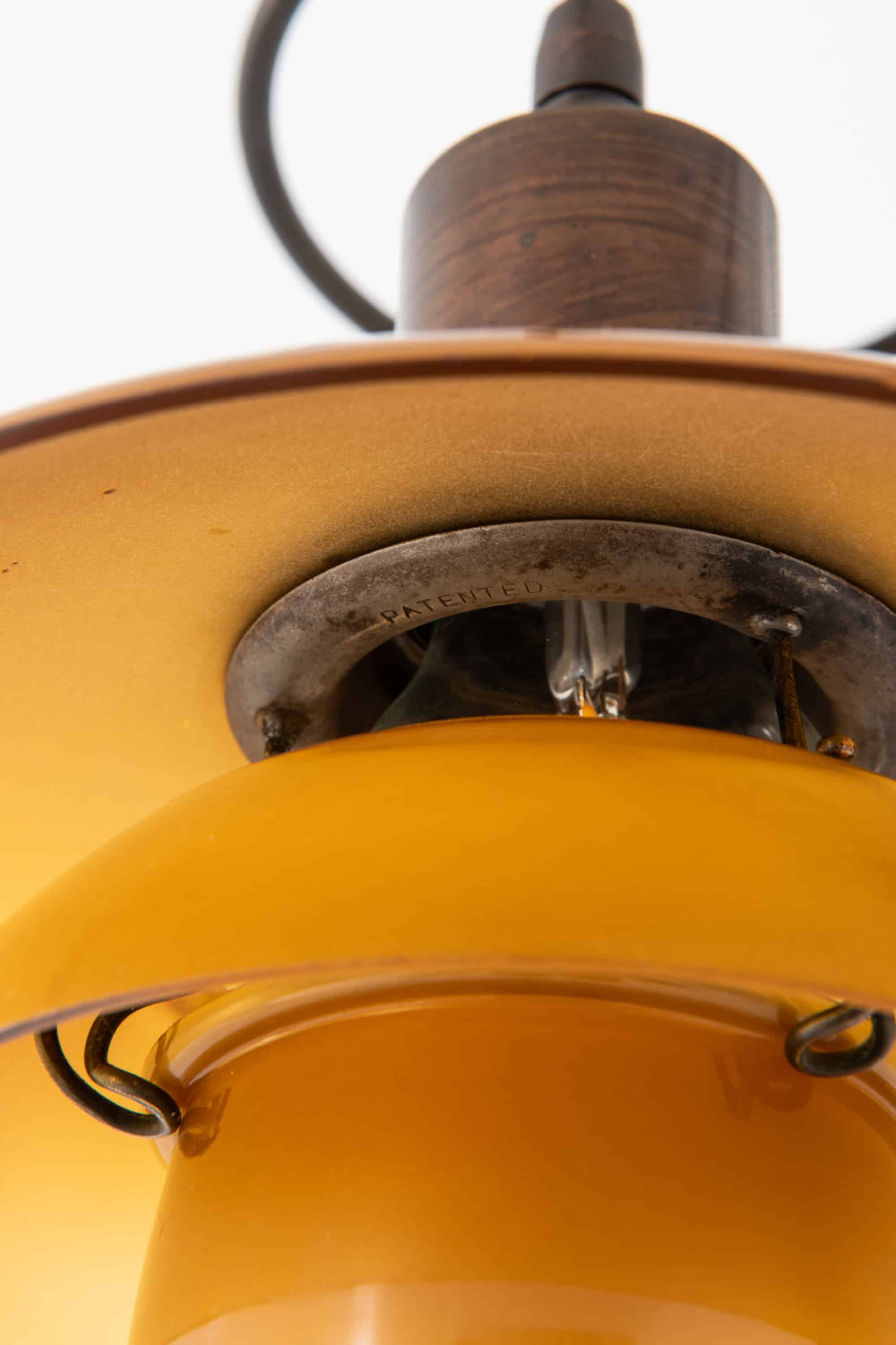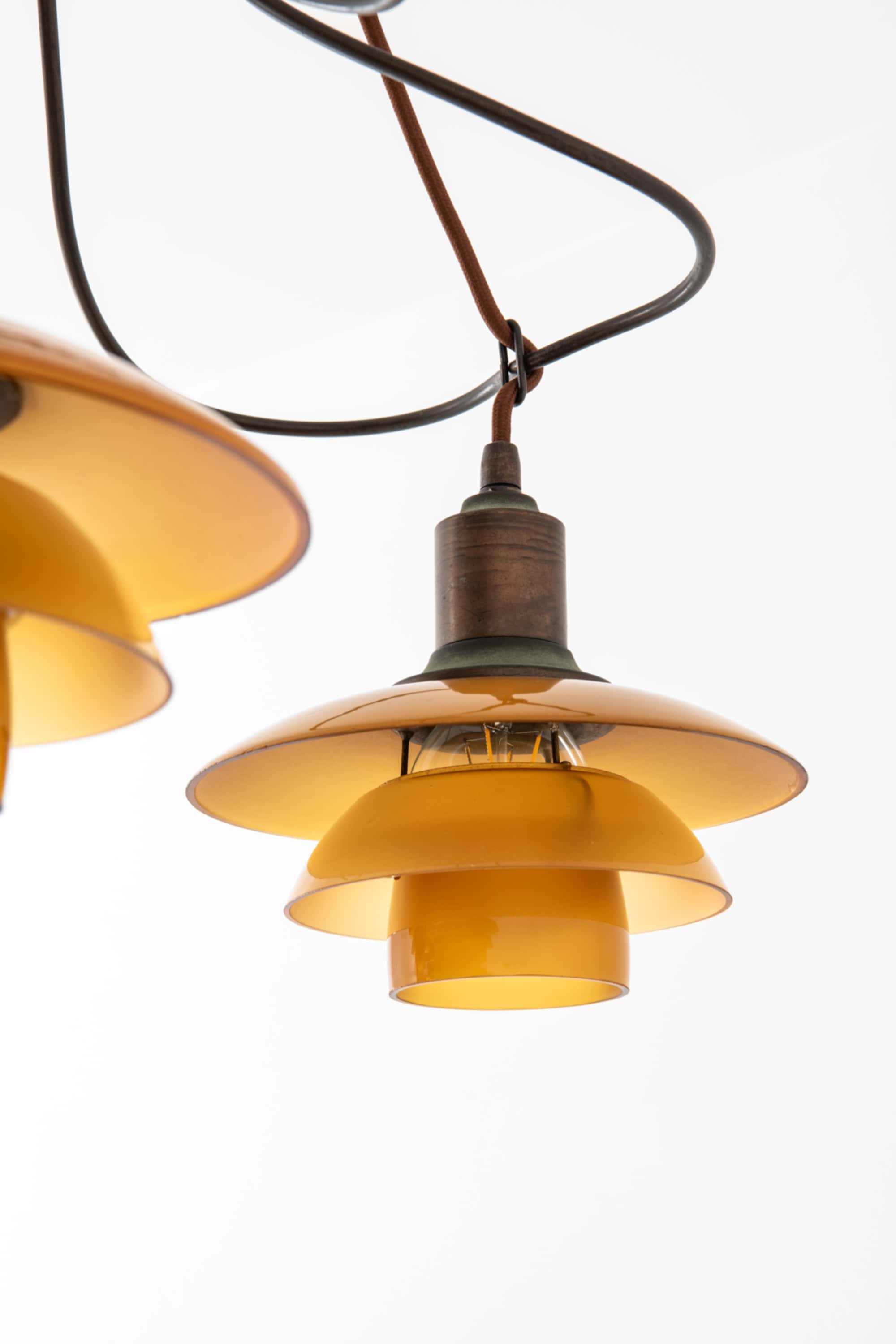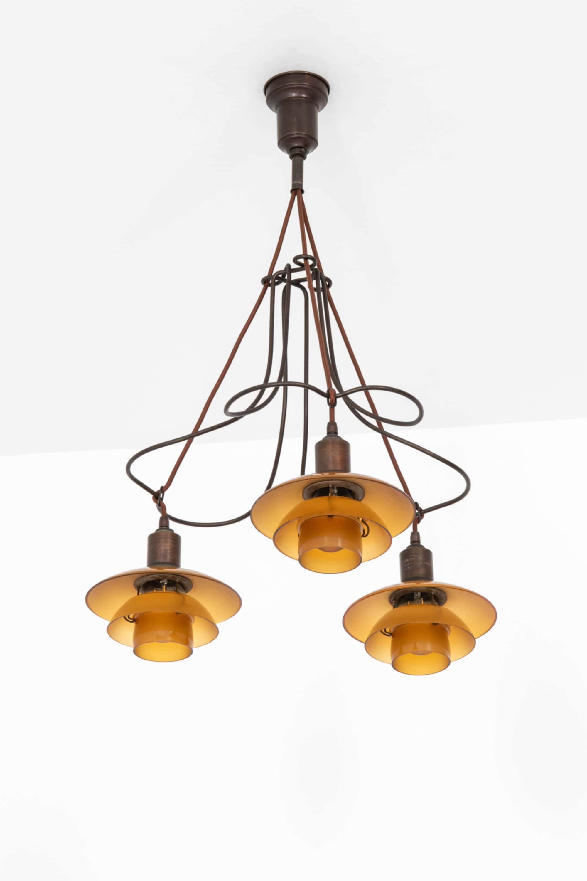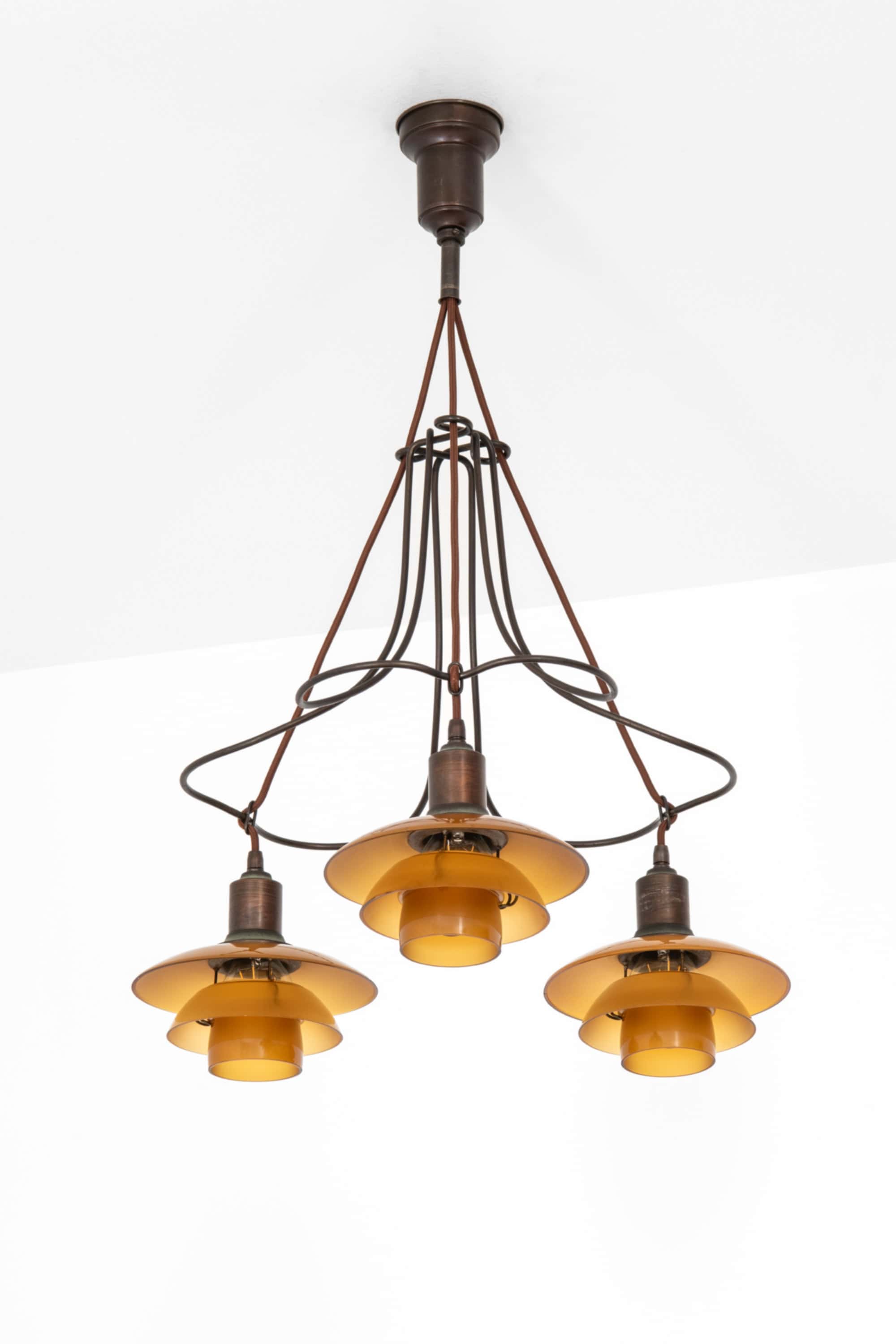The lamp is built around a central ceiling canopy and a suspended structural frame of darkened metal rods, forming an open, almost architectural cage that supports three individual lamp heads. Each light point is fitted with a multi-part shade system in amber-colored glass, consisting of a wide upper disc combined with inner elements that shield the light source and guide illumination downward and outward. The lower bowls are executed in matte glass, working as diffusers to soften the light output and reduce glare. The shade fittings are stamped “Patented” and marked “PH-2”, confirming the early production details and the original PH system components.