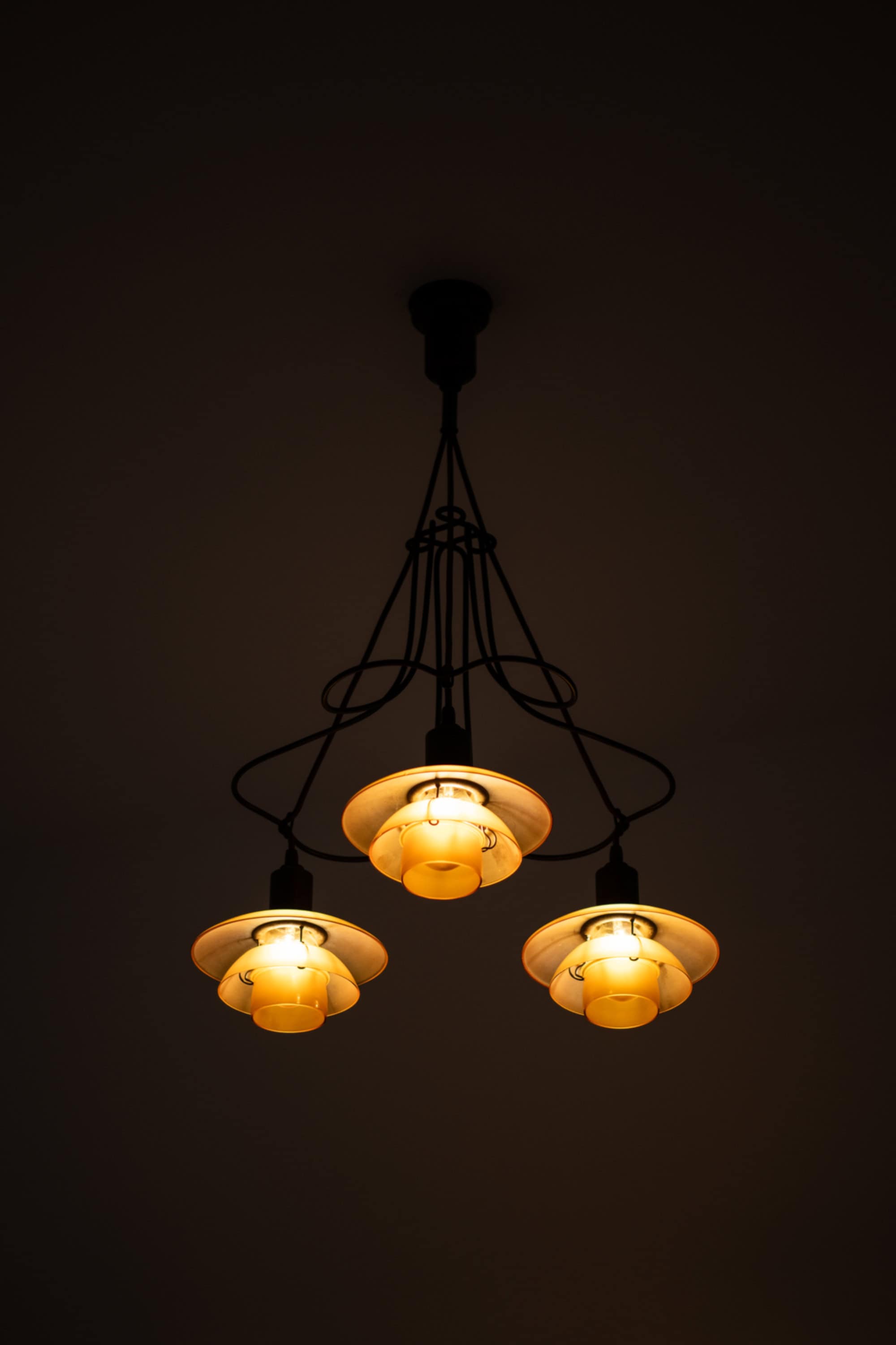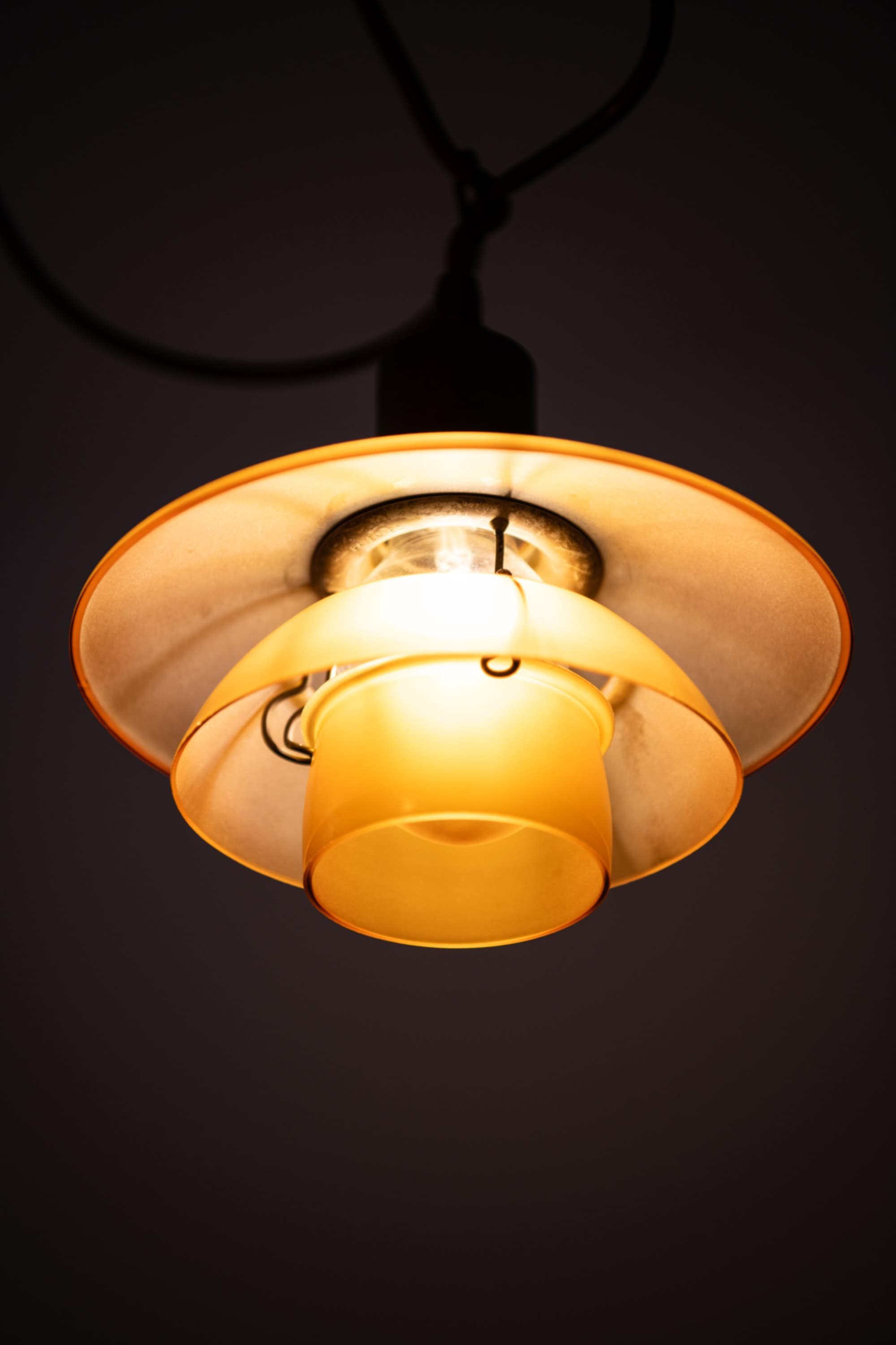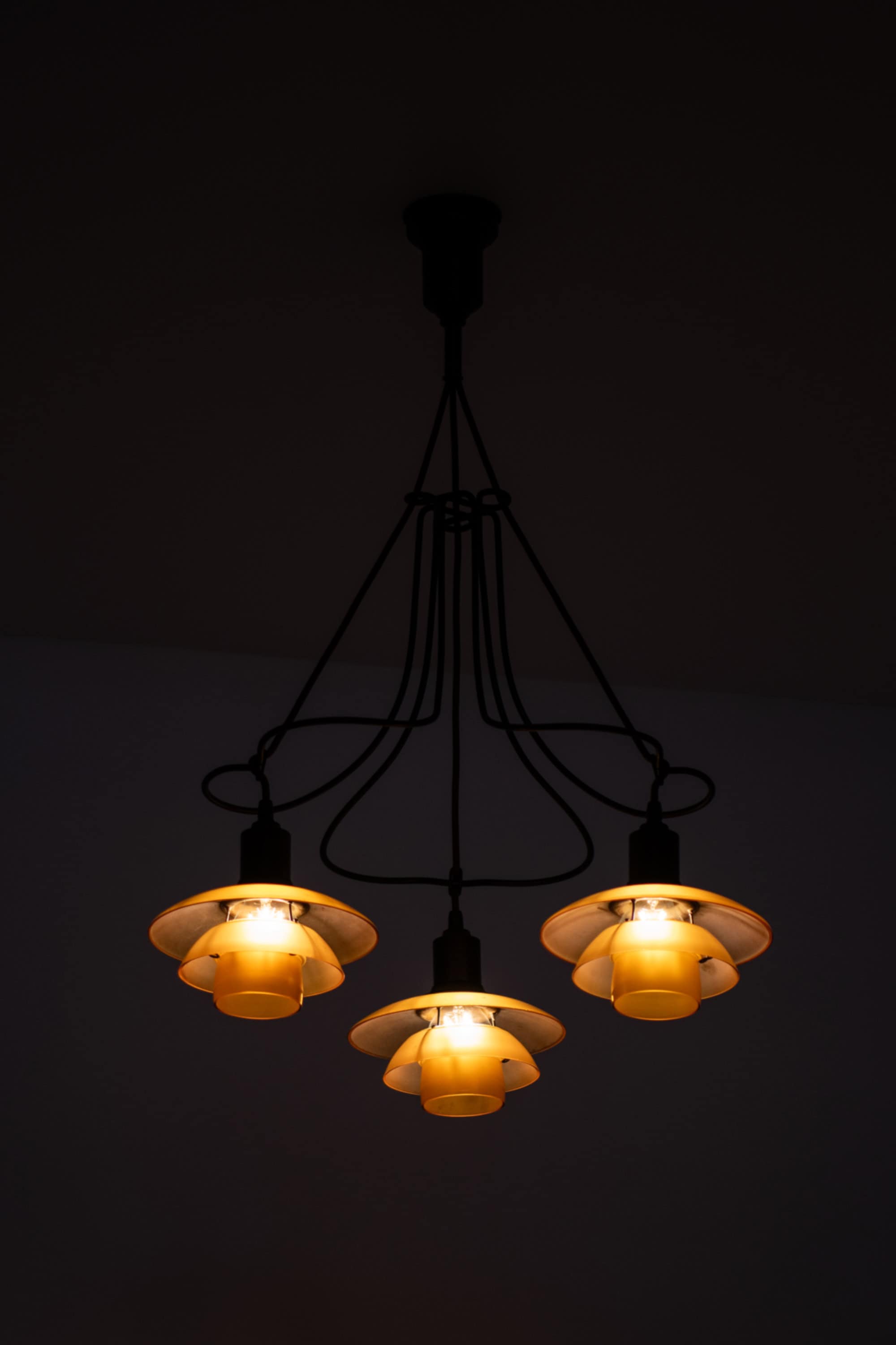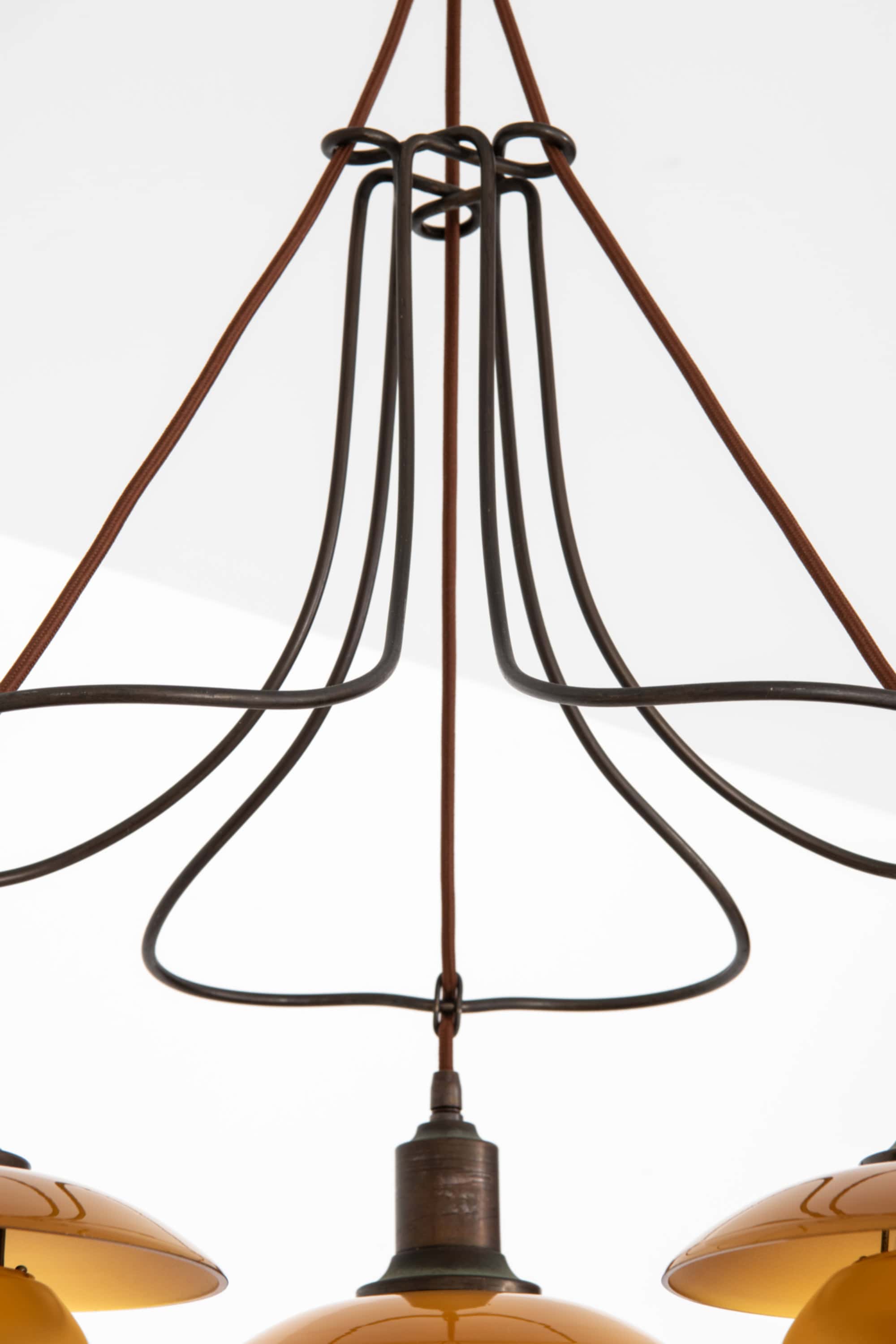 The lamp is built around a central ceiling canopy and a suspended structural frame of darkened metal rods, forming an open, almost architectural cage that supports three individual lamp heads. Each light point is fitted with a multi-part shade system in amber-colored glass, consisting of a wide upper disc combined with inner elements that shield the light source and guide illumination downward and outward. The lower bowls are executed in matte glass, working as diffusers to soften the light output and reduce glare. The shade fittings are stamped “Patented” and marked “PH-2”, confirming the early production details and the original PH system components.