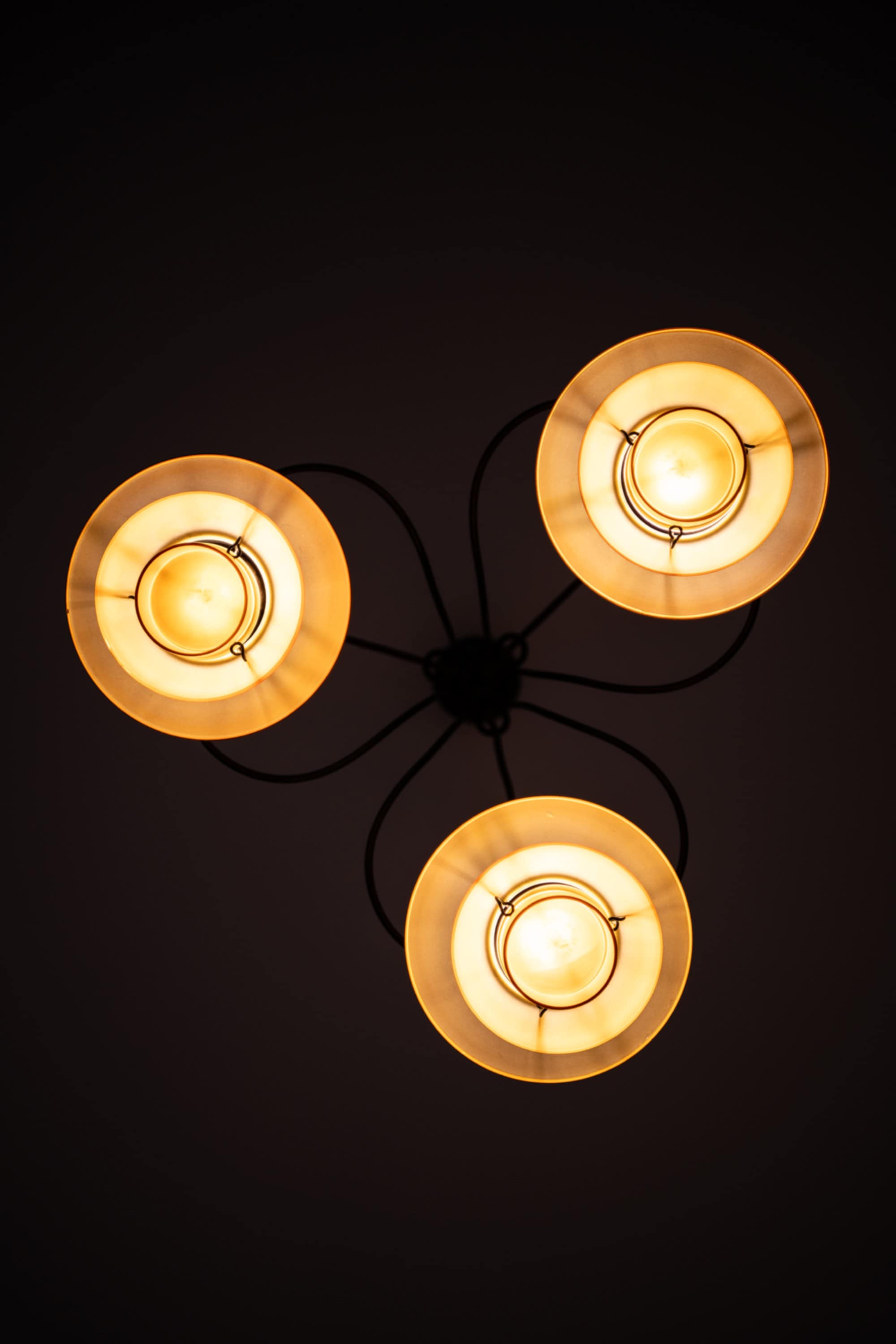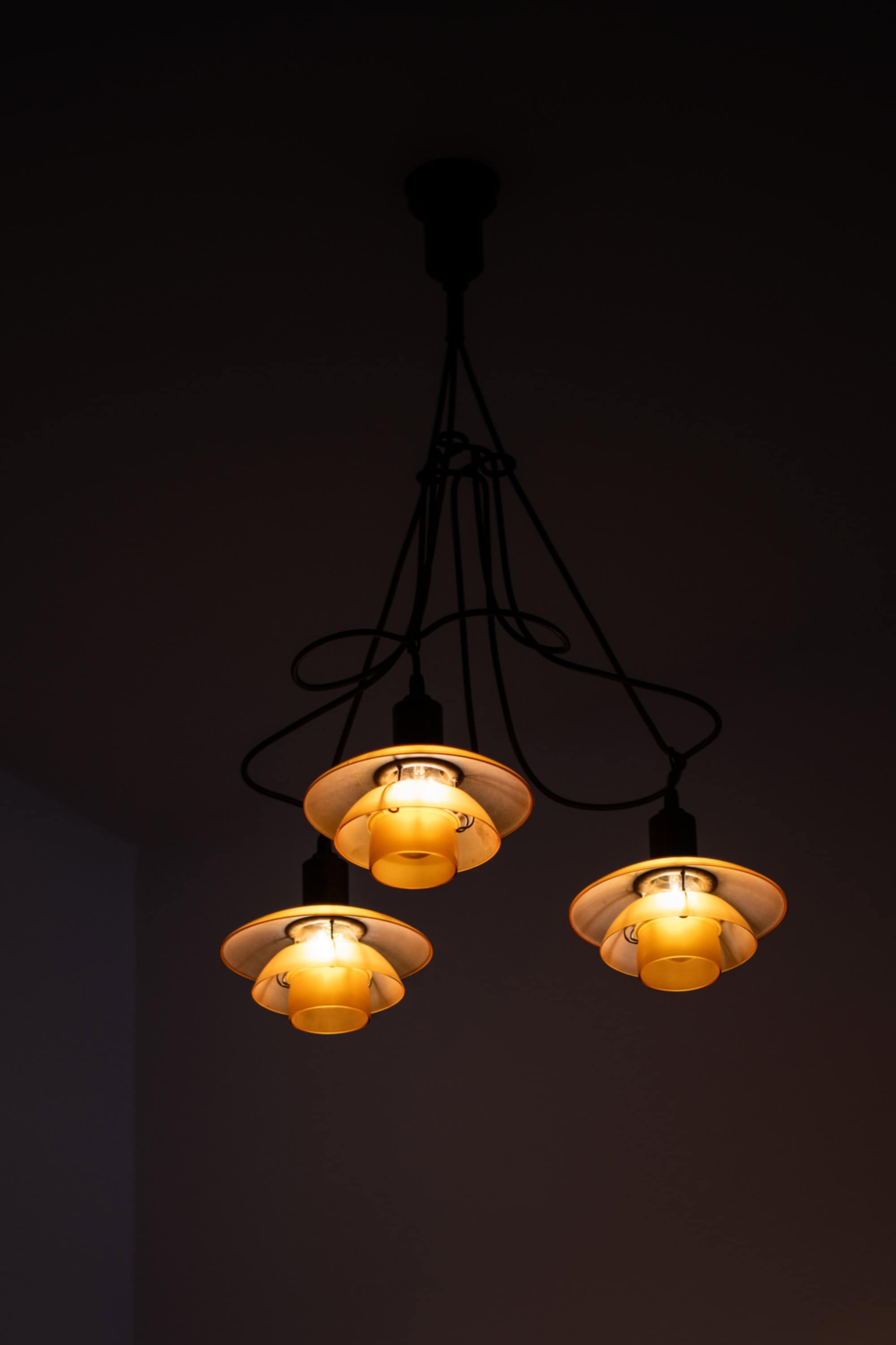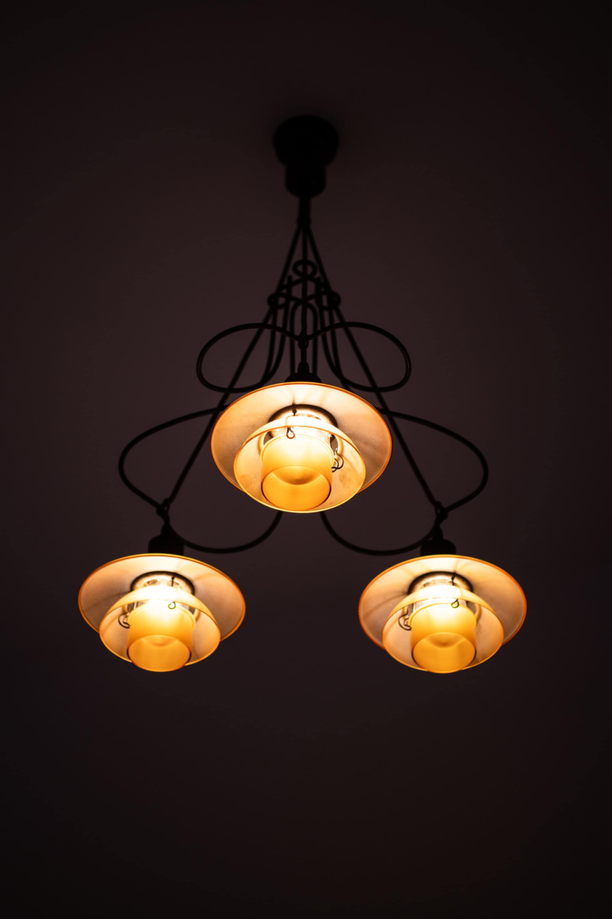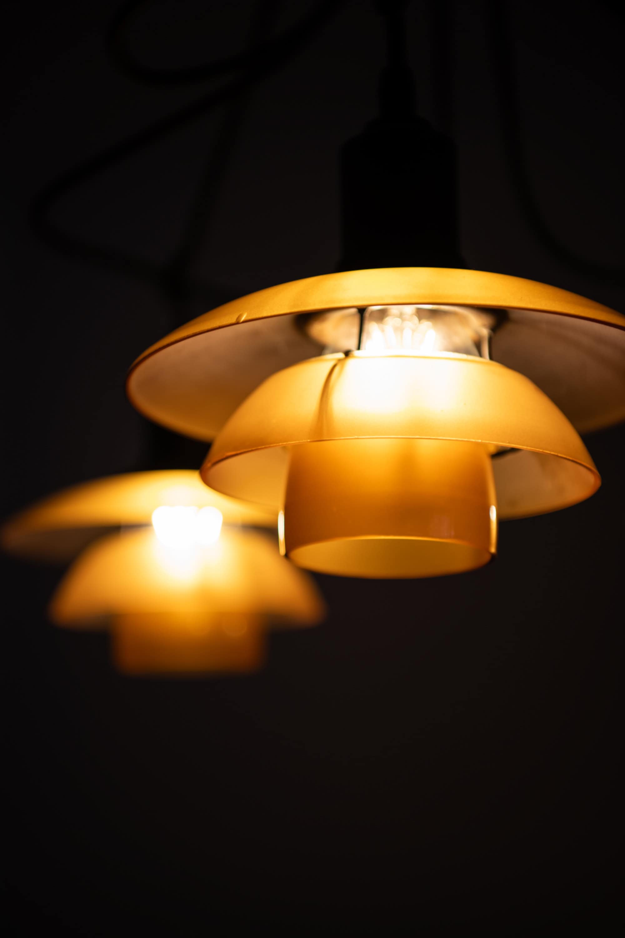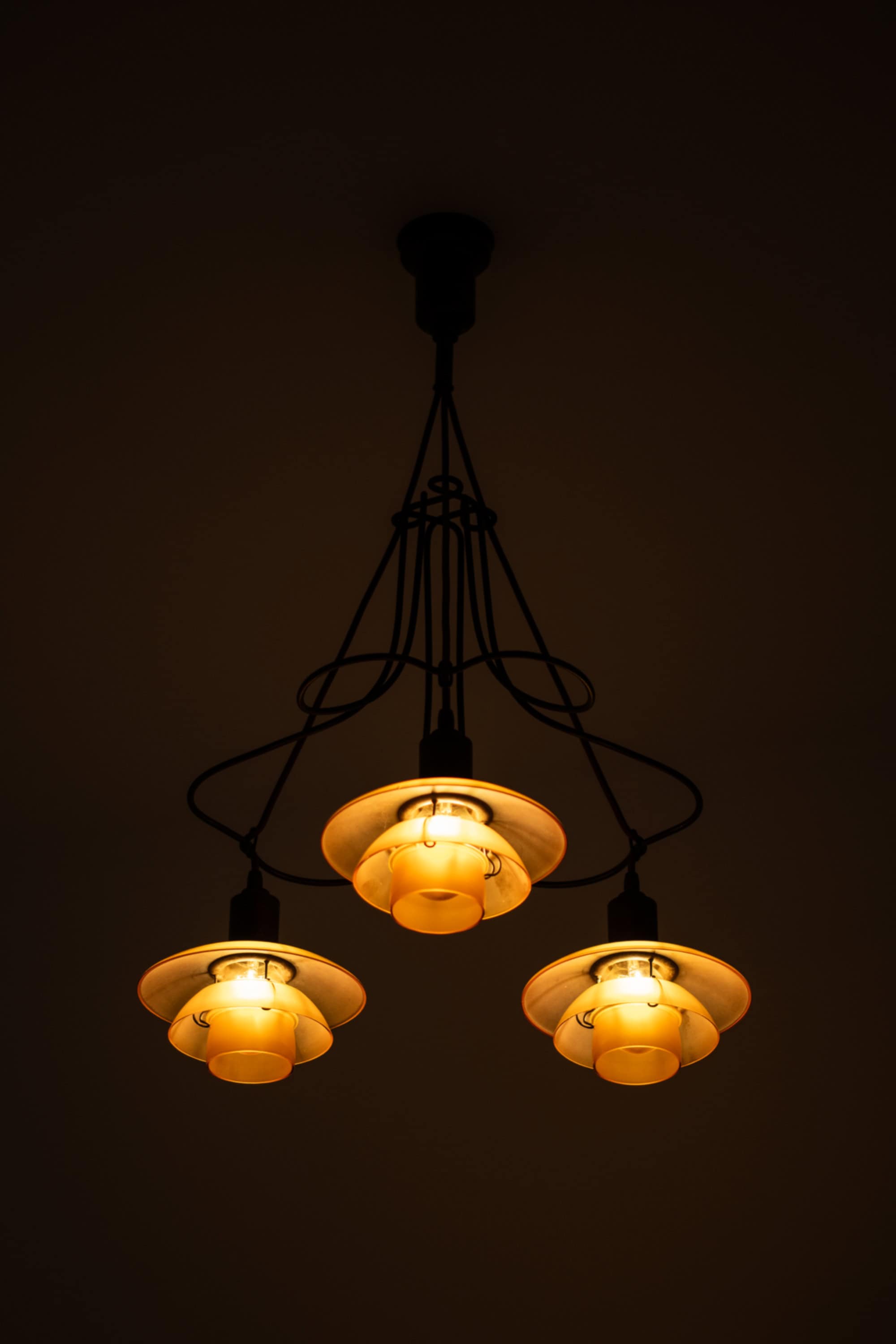 The lamp is built around a central ceiling canopy and a suspended structural frame of darkened metal rods, forming an open, almost architectural cage that supports three individual lamp heads. Each light point is fitted with a multi-part shade system in amber-colored glass, consisting of a wide upper disc combined with inner elements that shield the light source and guide illumination downward and outward. The lower bowls are executed in matte glass, working as diffusers to soften the light output and reduce glare. The shade fittings are stamped “Patented” and marked “PH-2”, confirming the early production details and the original PH system components.