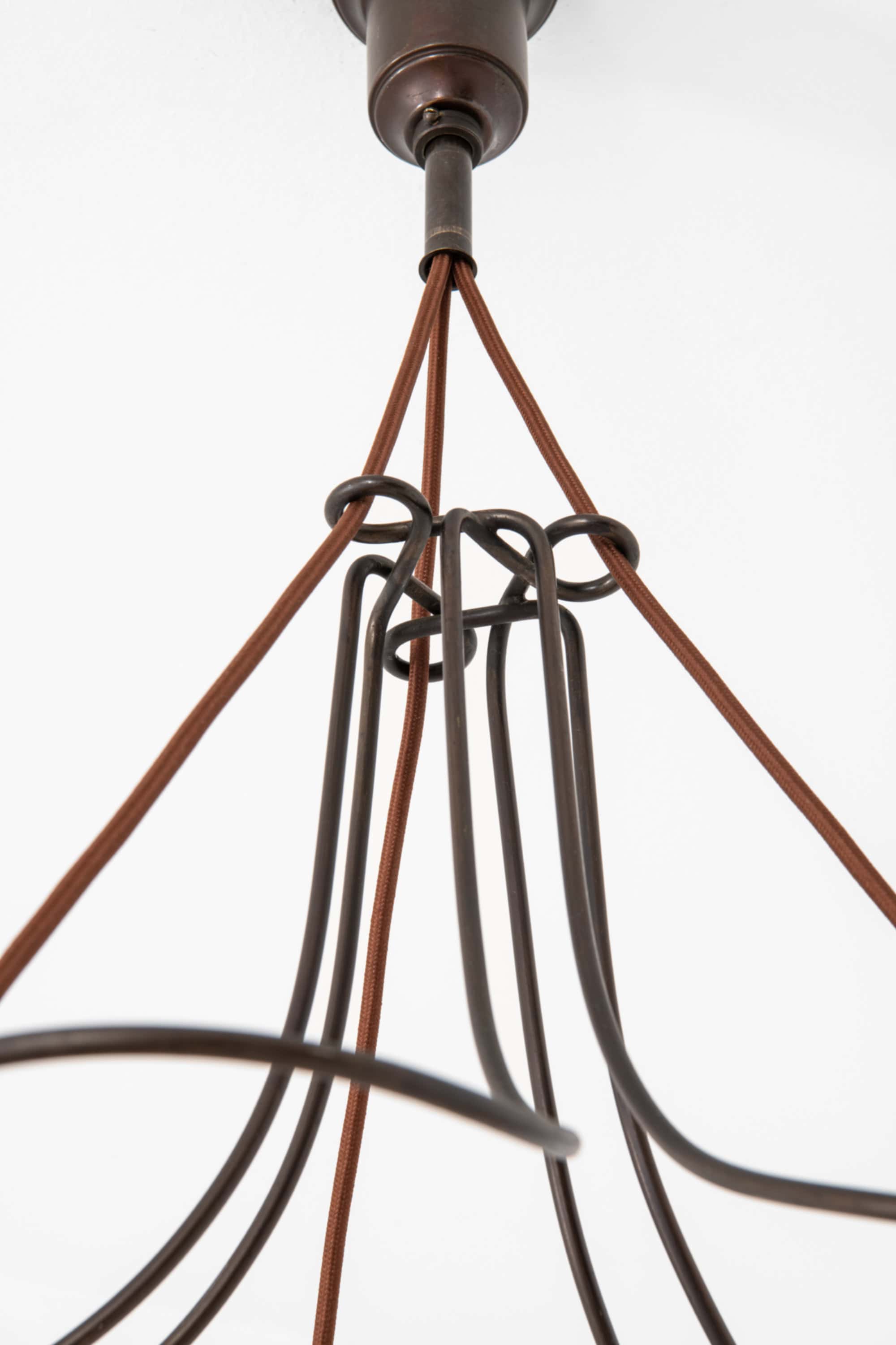 This very rare PH-2/2 “Butterfly” ceiling lamp was designed by Poul Henningsen and produced by Louis Poulsen in Denmark. The present example dates to the early production period, manufactured circa 1931–1934, and features the characteristic three-light arrangement suspended within a sculptural wire framework. The construction combines patinated brass components with layered glass shades, resulting in a warm and technically controlled light distribution typical of Henningsen’s pioneering lighting philosophy.