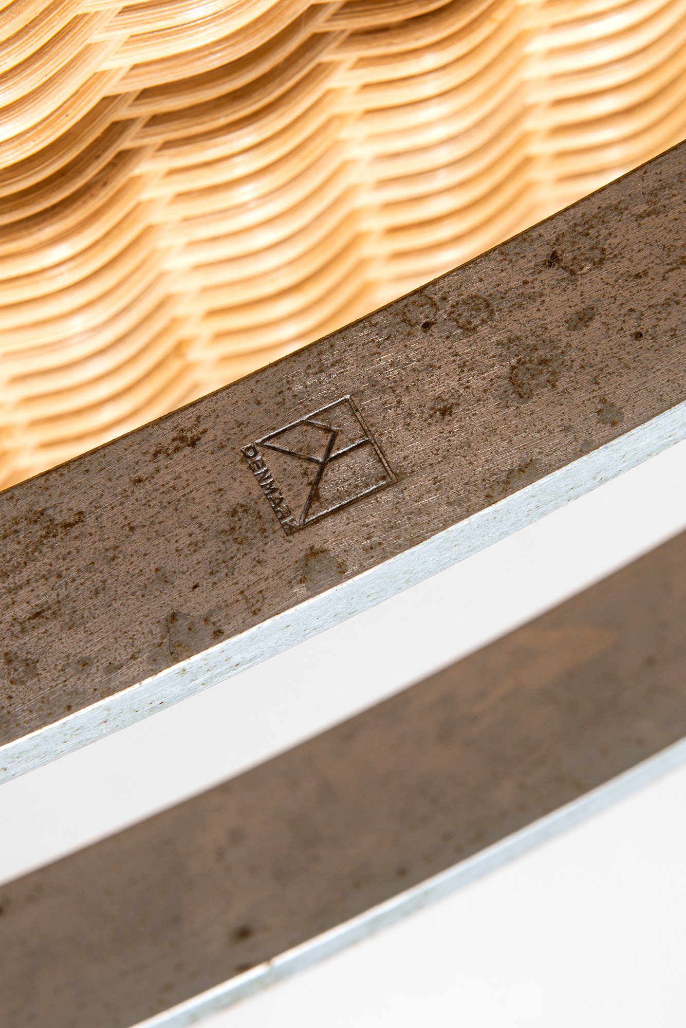 The frame is executed in flat steel, bent into a continuous, lightly sprung structure that forms both the base and the supporting elements. The steel displays an even patina with visible oxidation and surface marks consistent with age and use, contributing to the character of the piece. The seat and backrest are woven in natural rattan, tightly executed and well preserved, with a warm tone that contrasts subtly with the cooler steel frame.