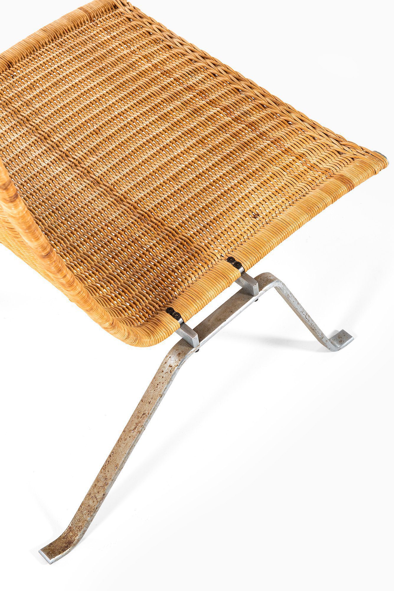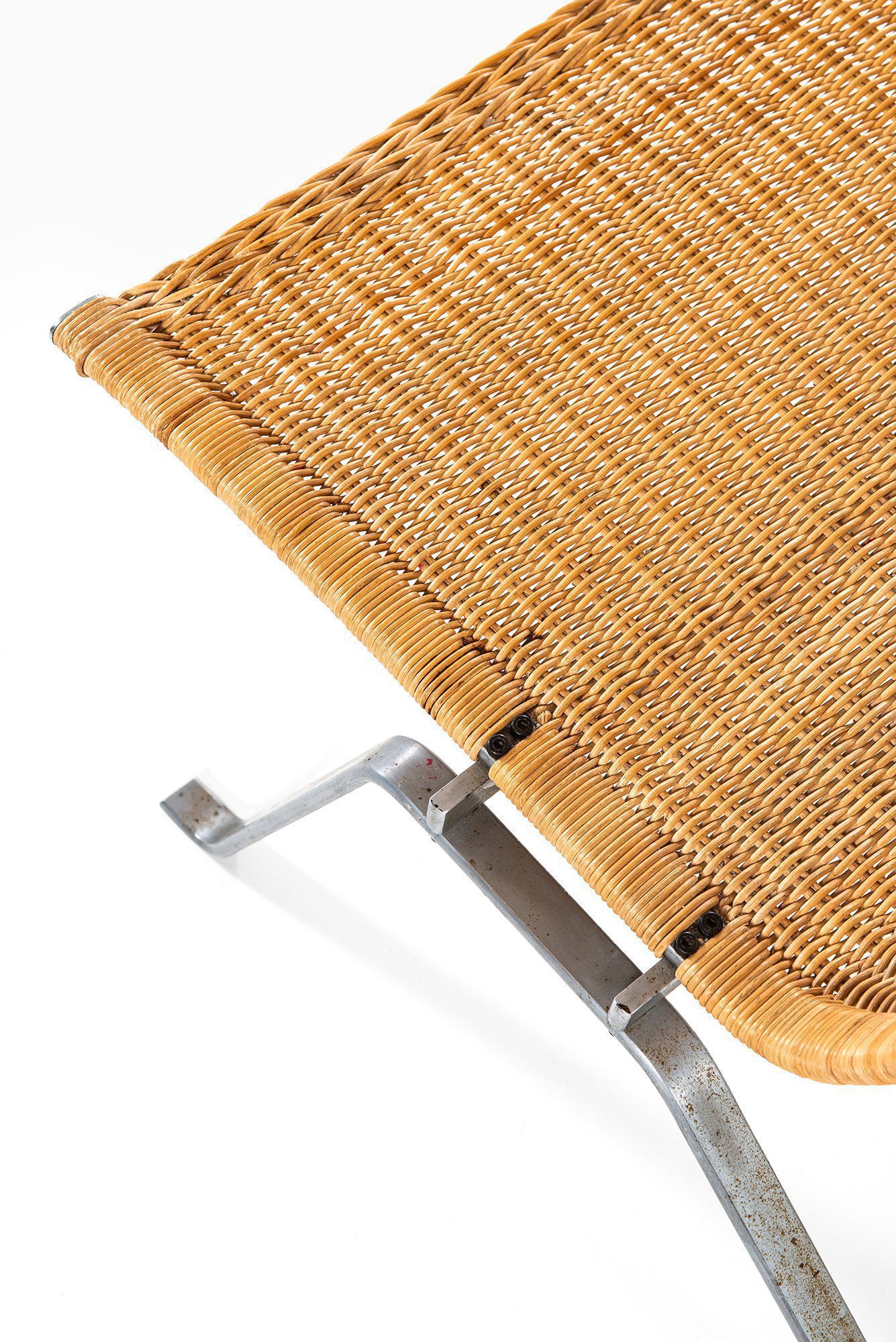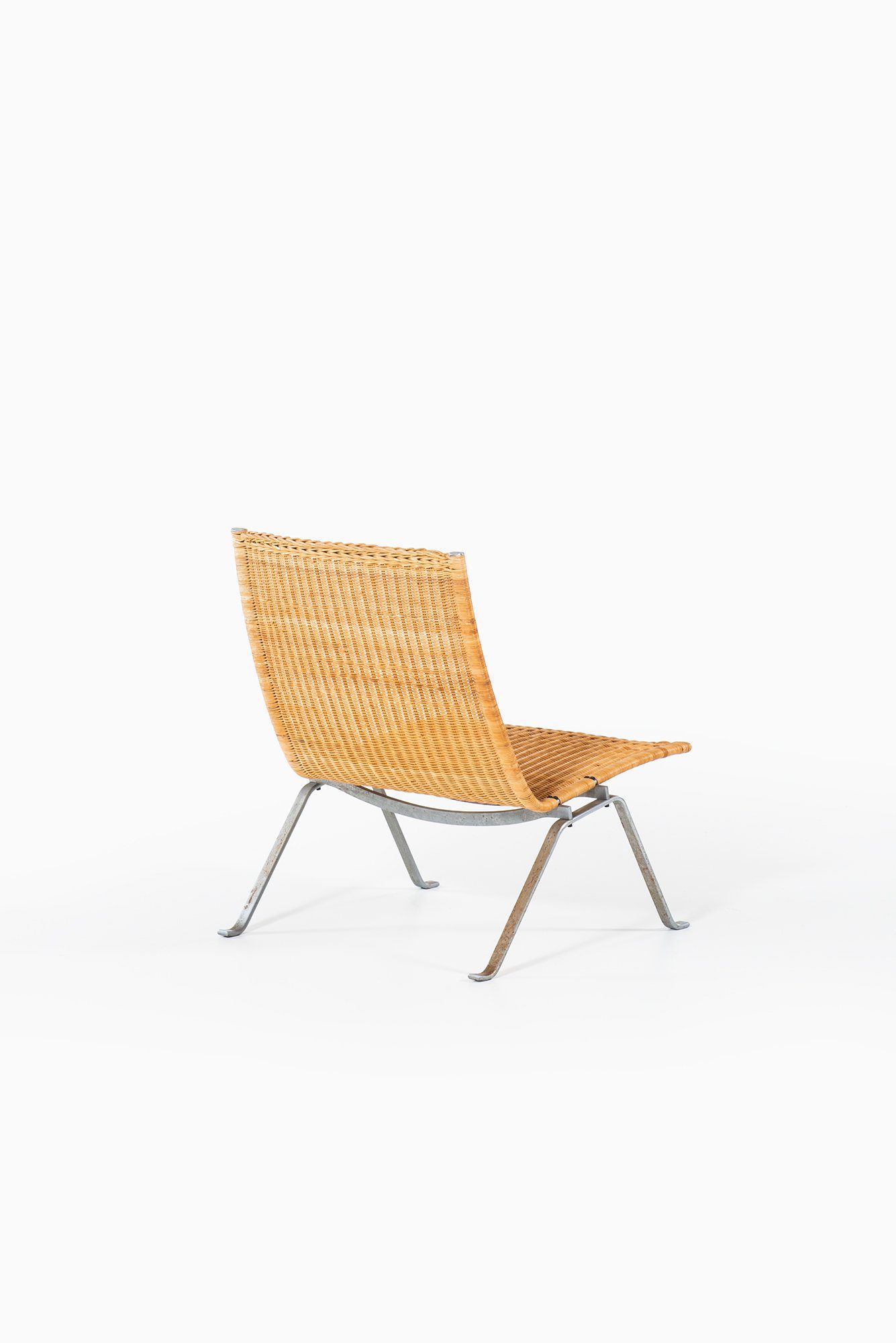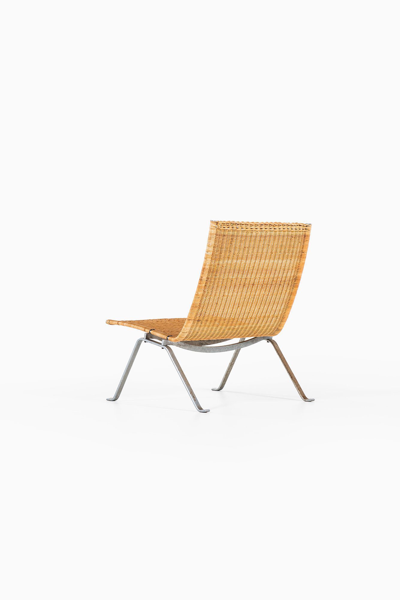 The profile is low and sculptural, with a gently reclined backrest and a shallow seat that emphasize relaxation while maintaining a clear architectural presence. Kjærholm’s intention was to create a chair that reads as a continuous line in space, where the woven surface appears suspended within the steel structure. This balance between lightness and structural clarity is a defining characteristic of the model.