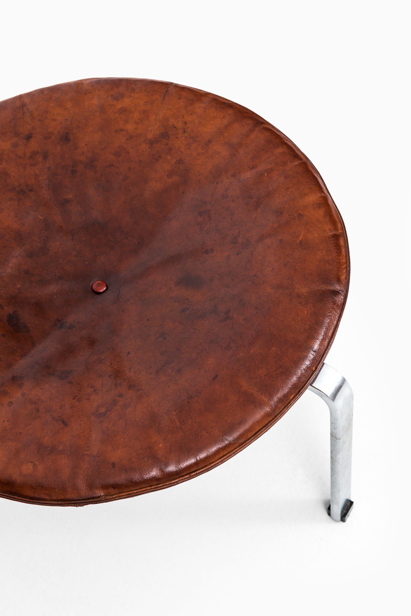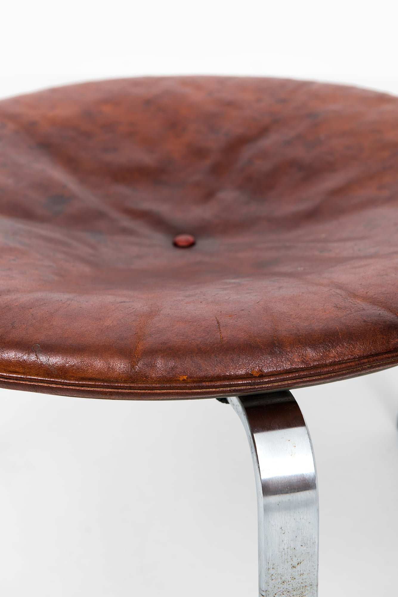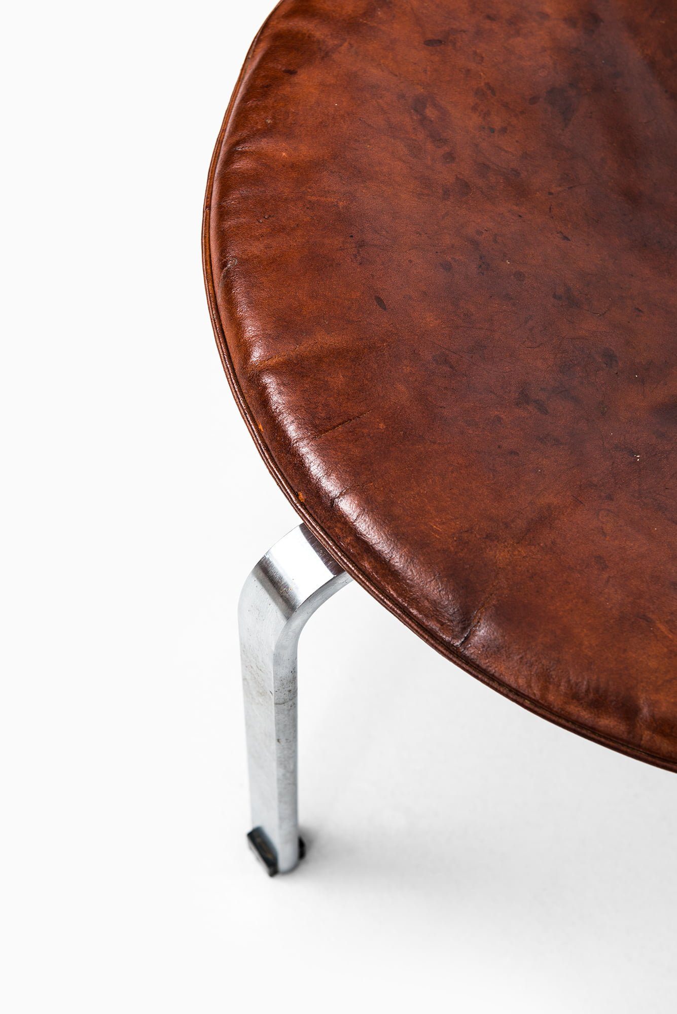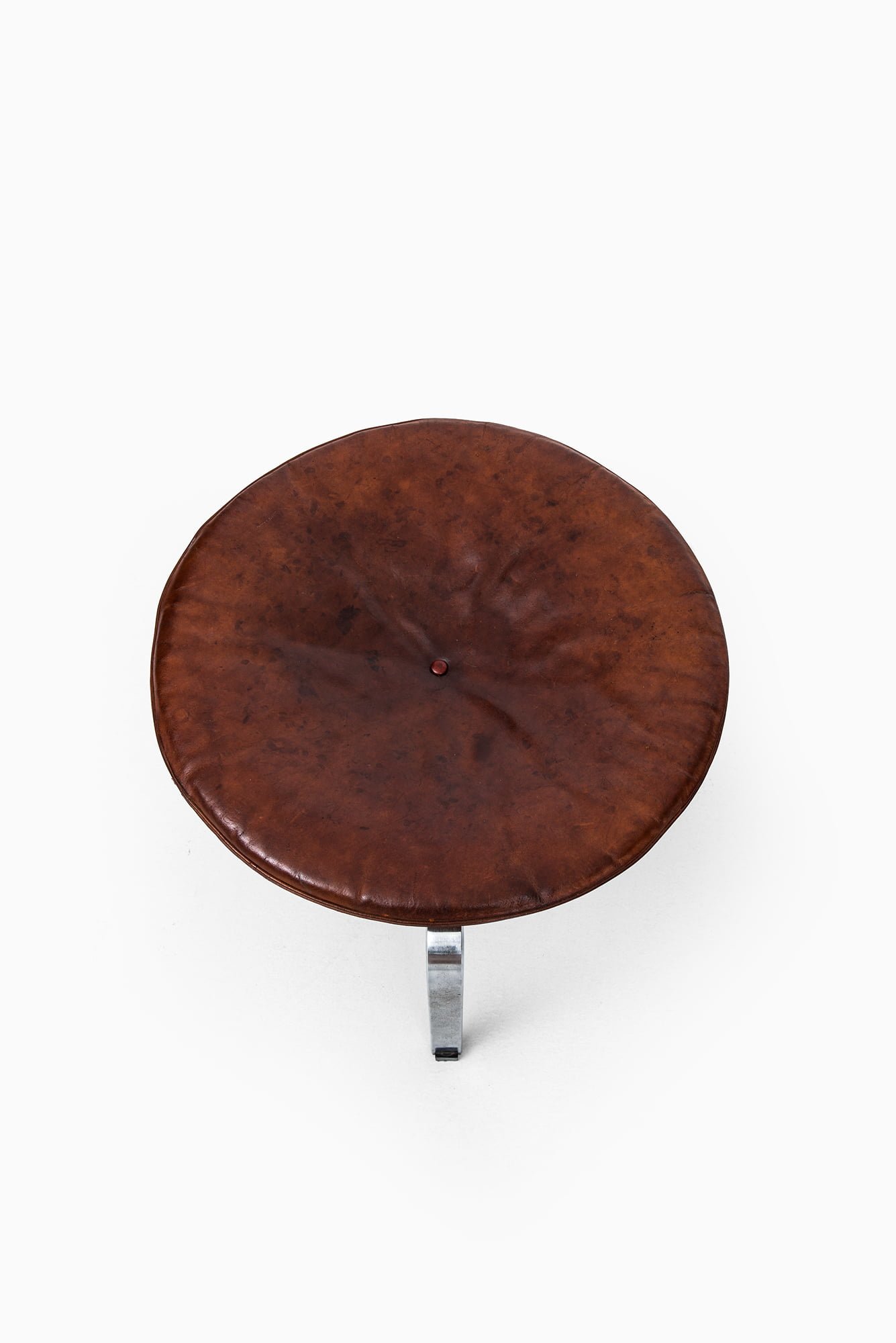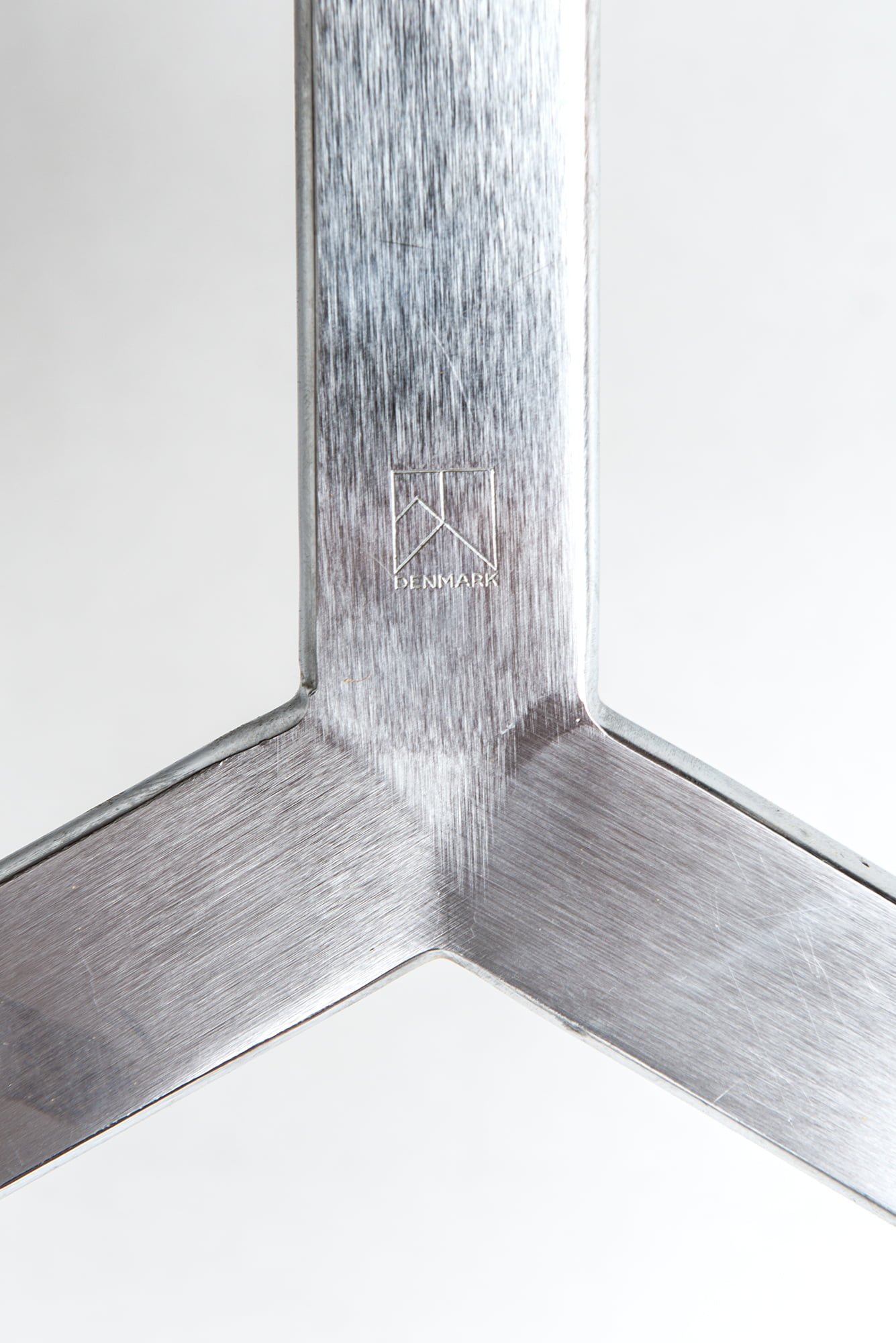 Supporting the seat is a chromed steel frame composed of three bent legs, a design signature of Kjærholm’s work that emphasizes lightness and strength. The steel structure is precise and functional, with the legs subtly angled to ensure stability while keeping the overall form visually delicate. The underside bears the manufacturer’s stamp, confirming its production by E. Kold Christensen, the exclusive producer of Kjærholm’s early furniture before Fritz Hansen took over in later decades.