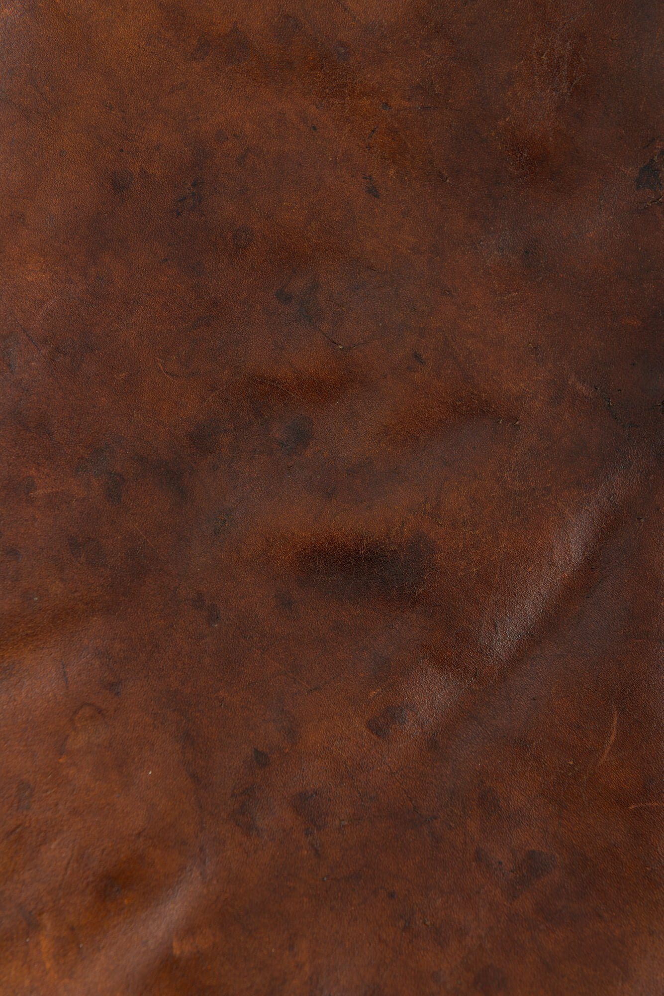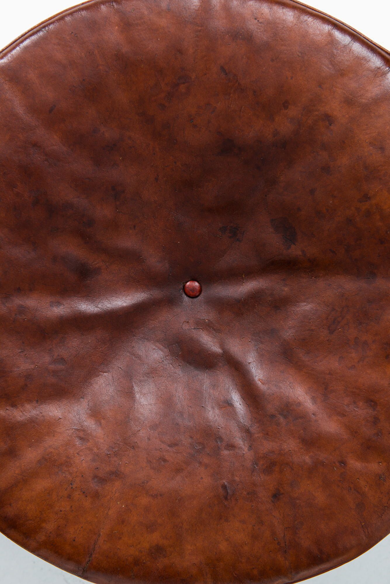 The stool features a circular seat upholstered in original brown leather, which has developed a deep patina and visible signs of age, giving it character and authenticity. The surface shows natural creasing and wear consistent with its vintage nature, yet remains structurally sound. The leather is fixed with a central button detail, enhancing the sculptural quality of the seat.