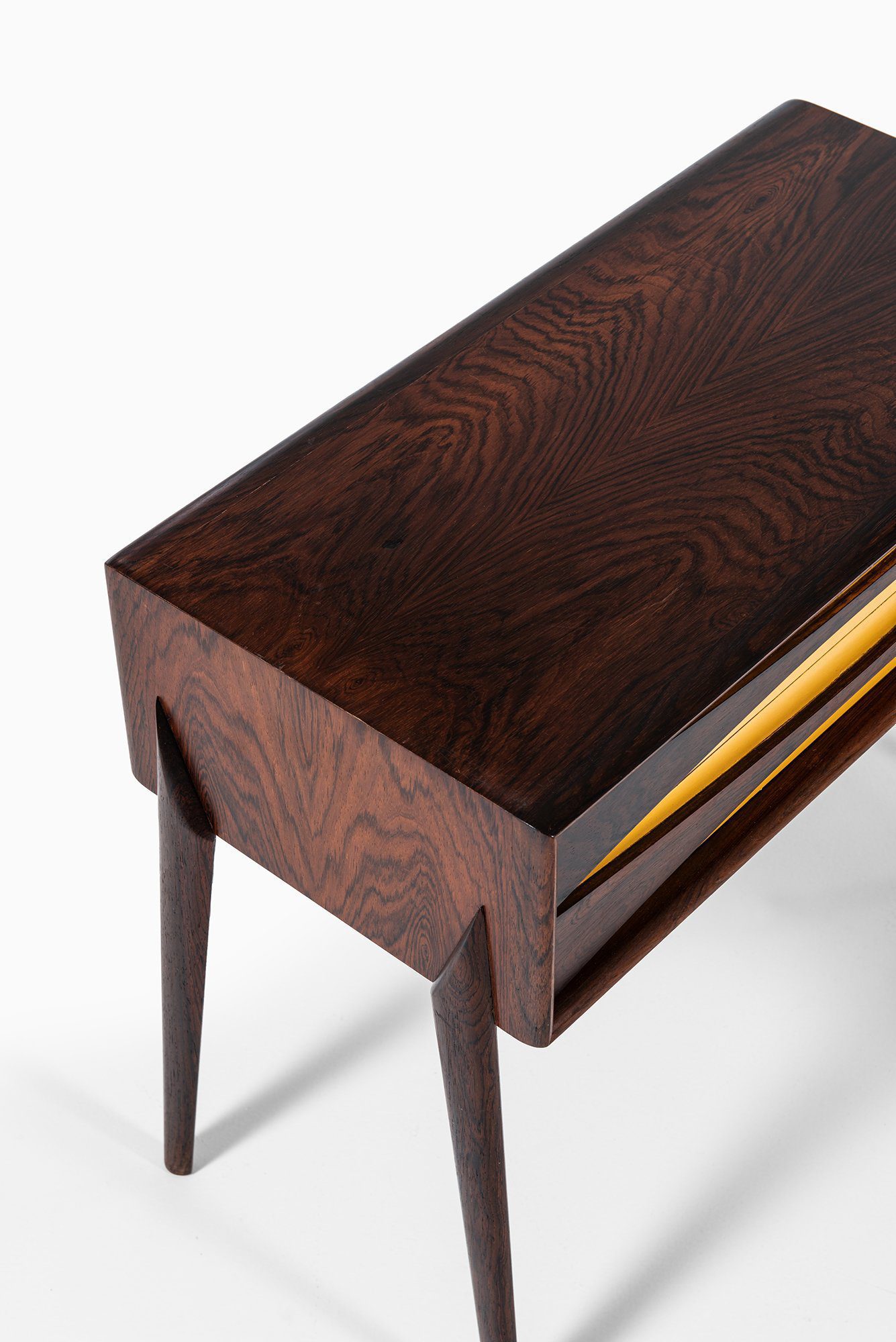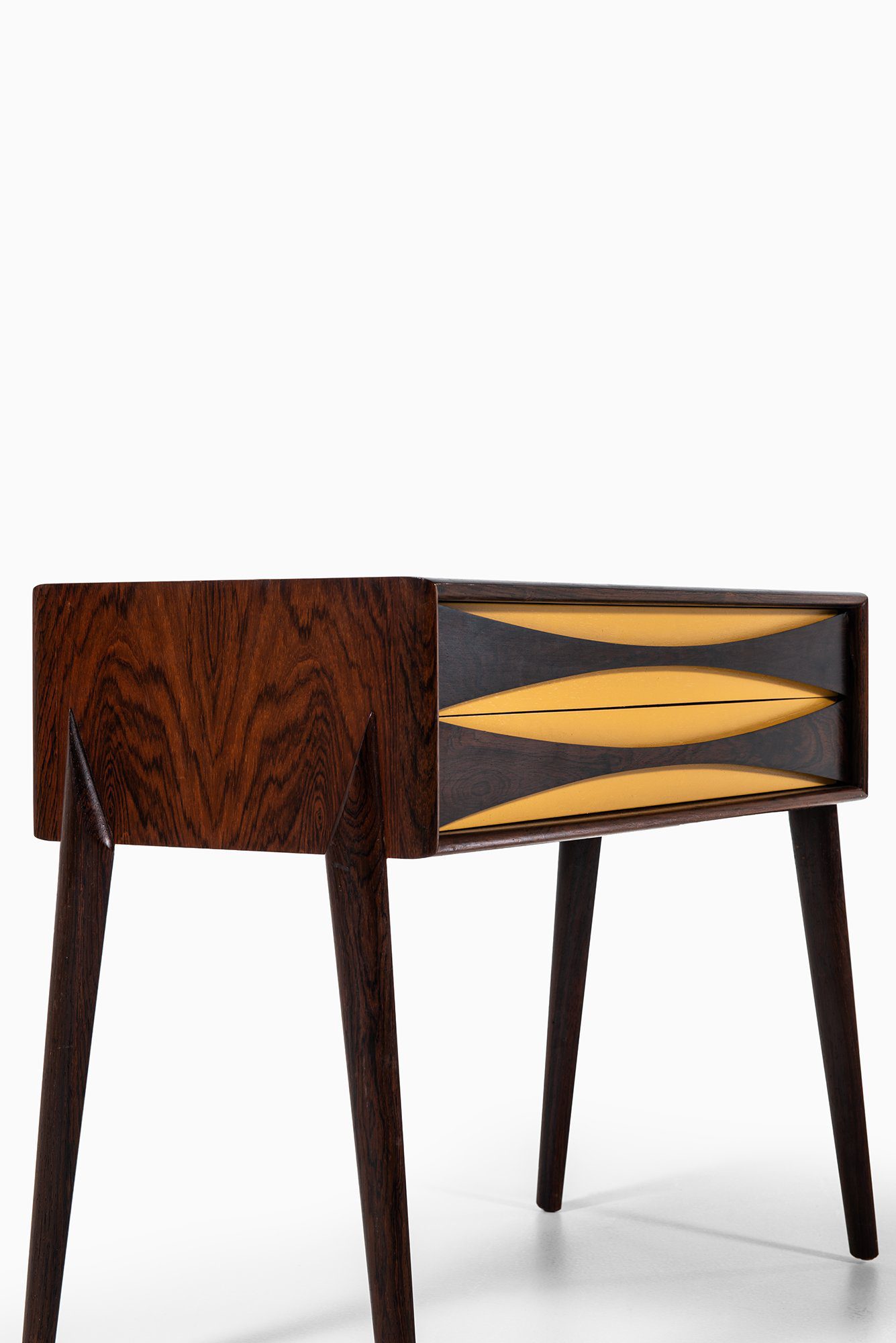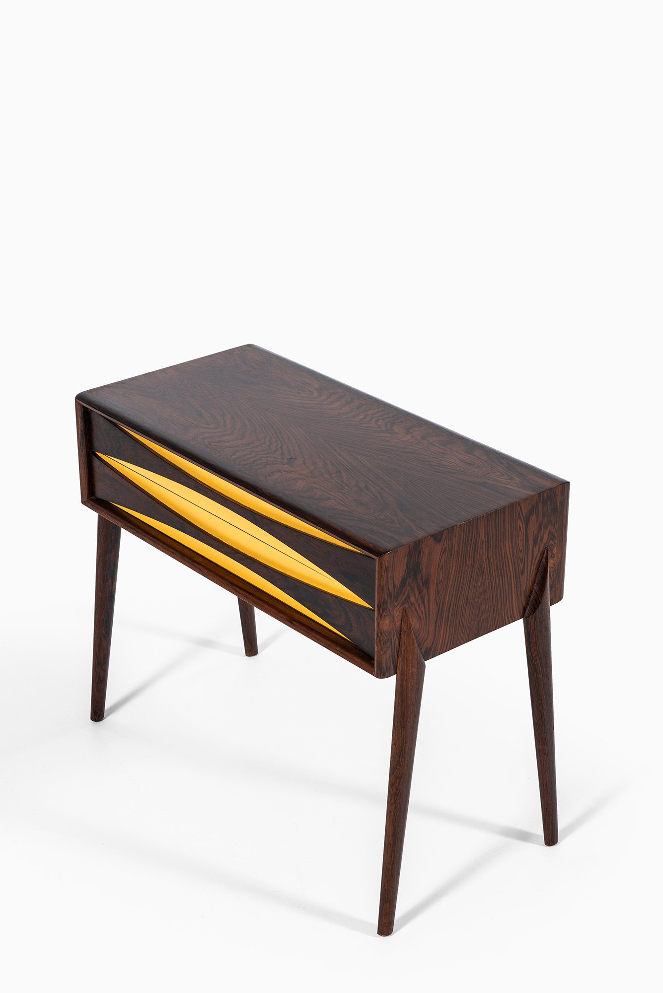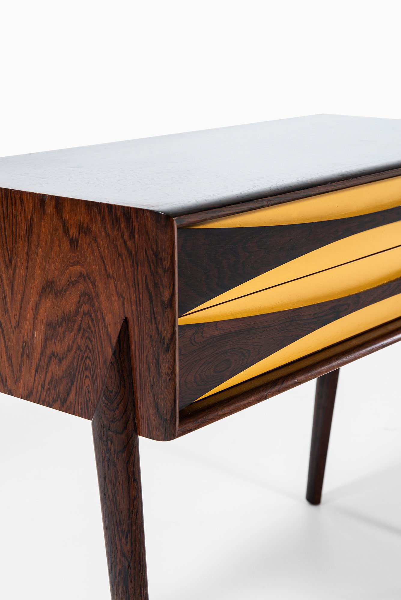 Rare pair of side tables or bedside tables designed by Rimbert Sandholt, produced by AB Glas & Trä (Ateljé Glas & Trä) in Hovmantorp, Sweden, during the 1960s. Executed in rosewood with lacquered drawer fronts, these tables demonstrate the refined craftsmanship and aesthetic play typical of Scandinavian mid-century design.