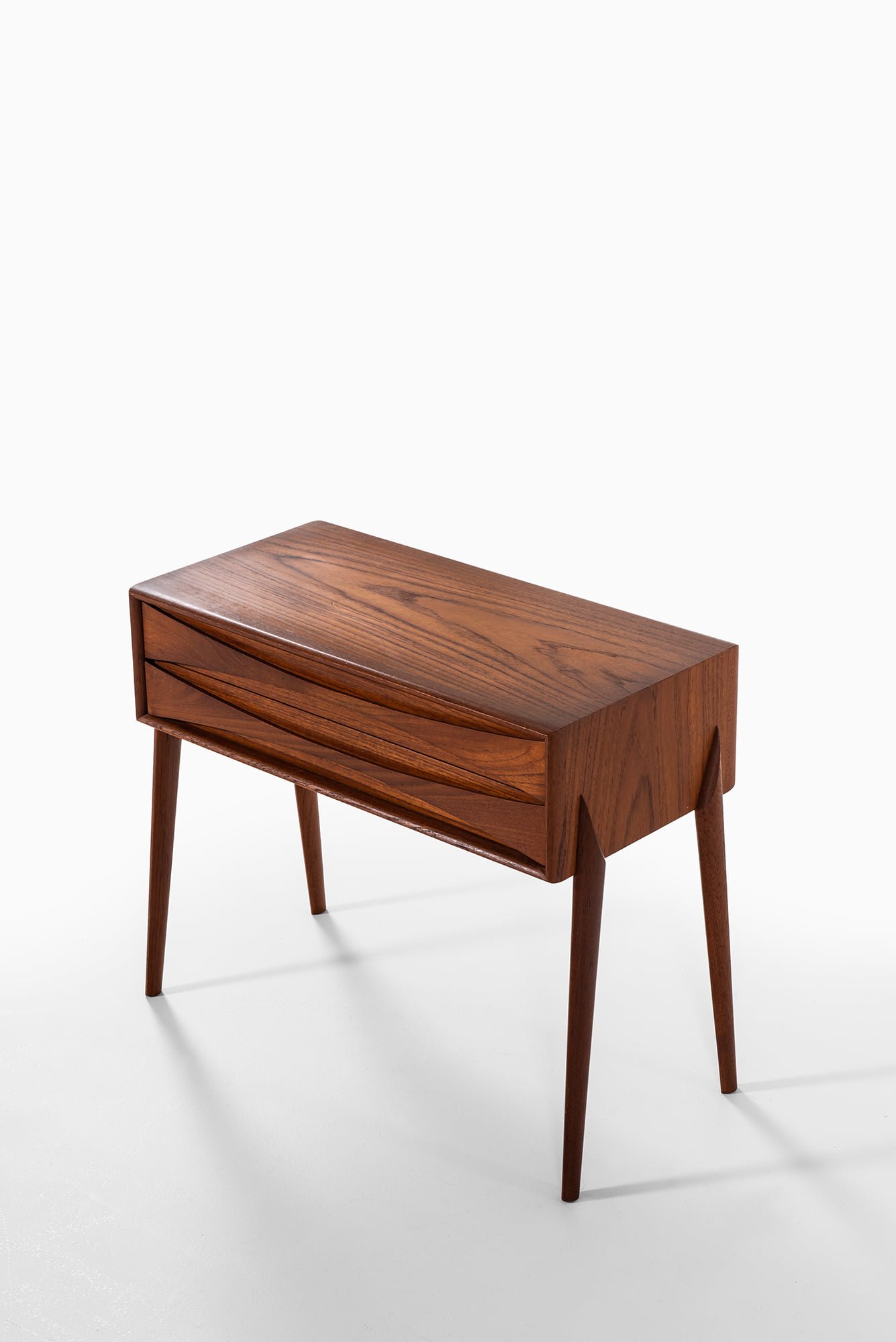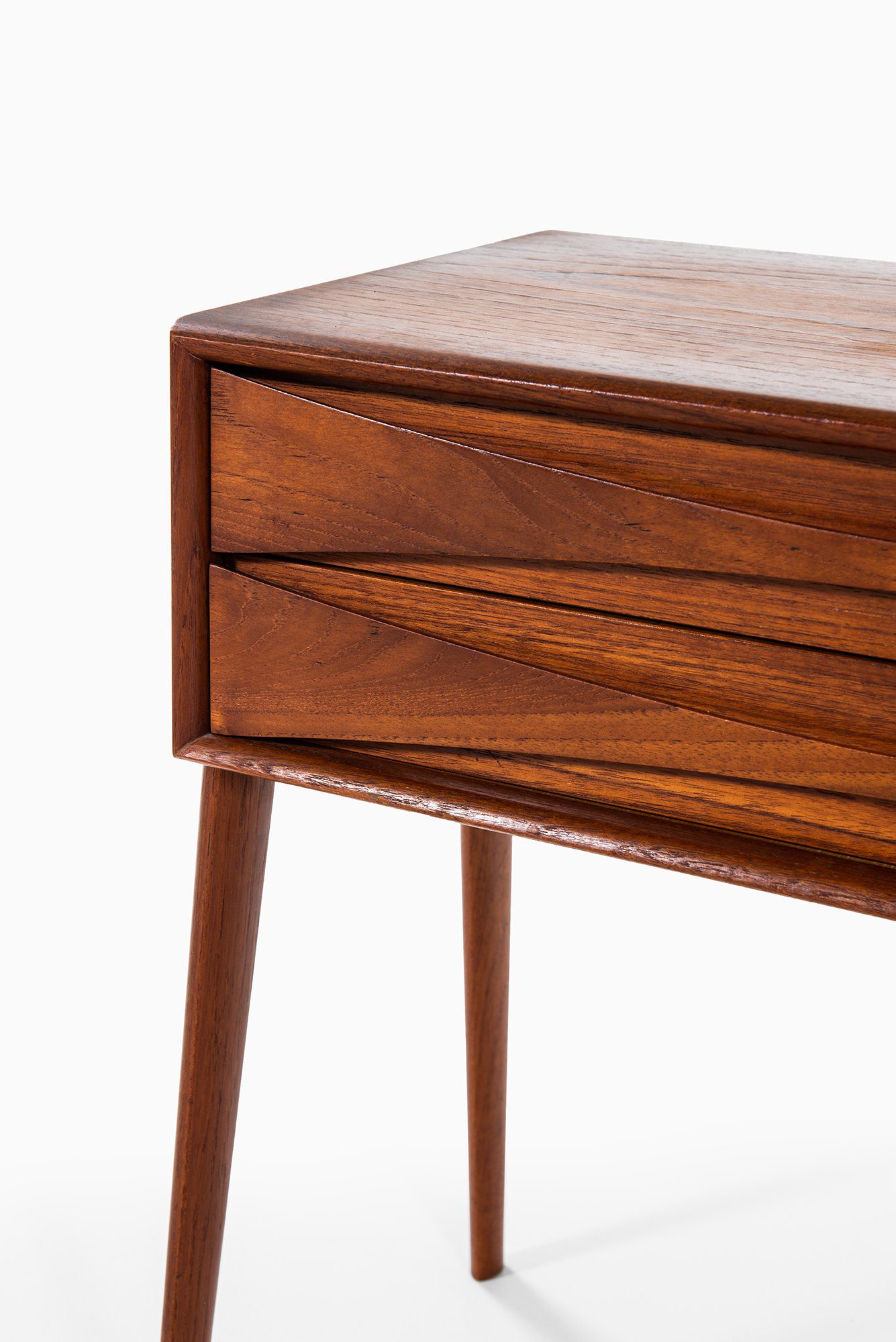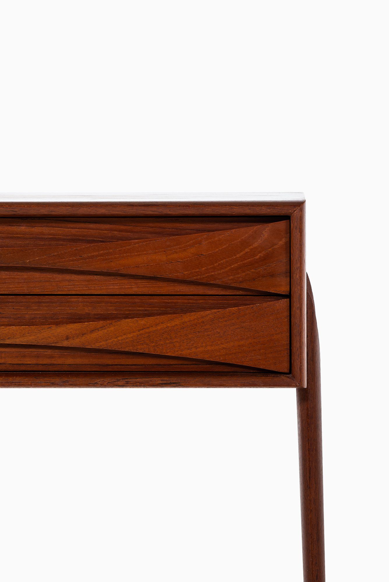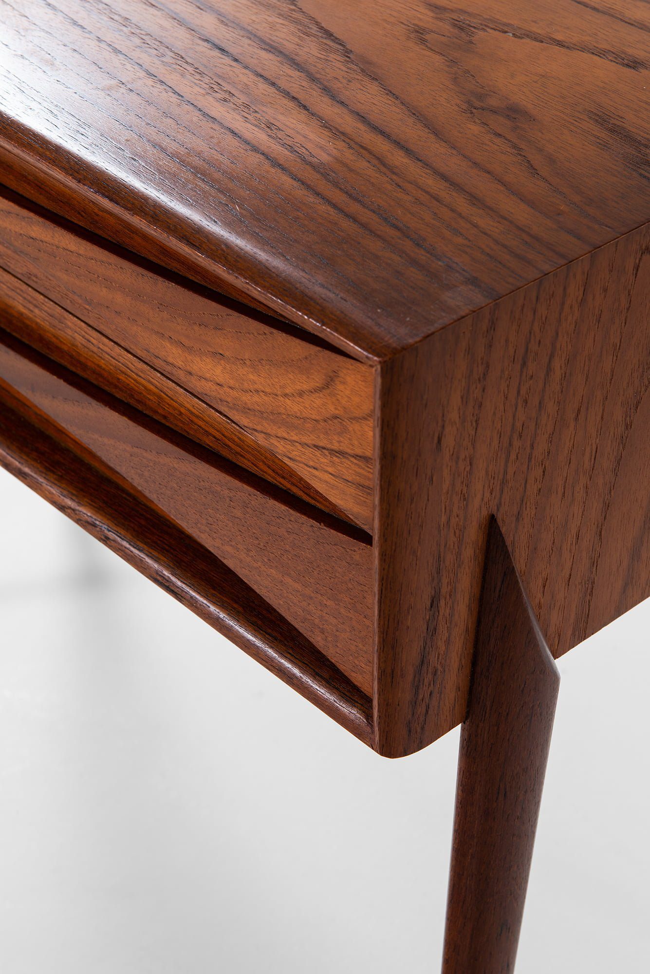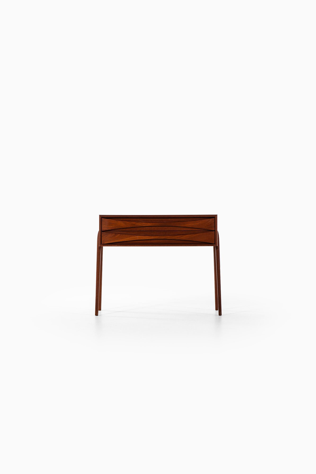 Rare side table or bedside table designed by Rimbert Sandholt, produced by Glas & Trä in Hovmantorp, Sweden, during the 1960s. The table is made of teak with a finely executed surface that highlights the grain pattern and warmth of the wood. The design features two drawers with sculptural, angled fronts that form a distinctive geometric profile, characteristic of Scandinavian modernism’s attention to both function and visual rhythm.